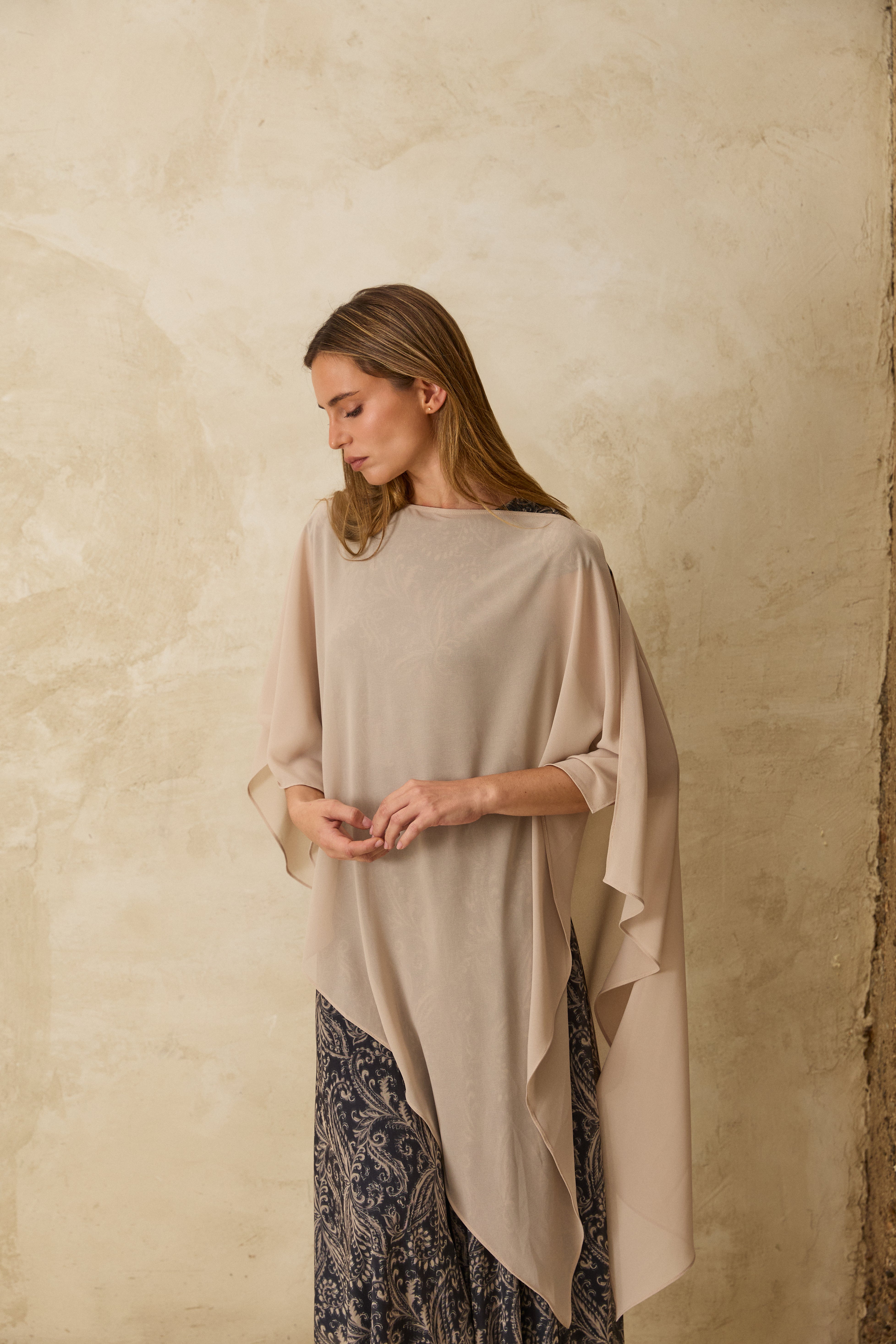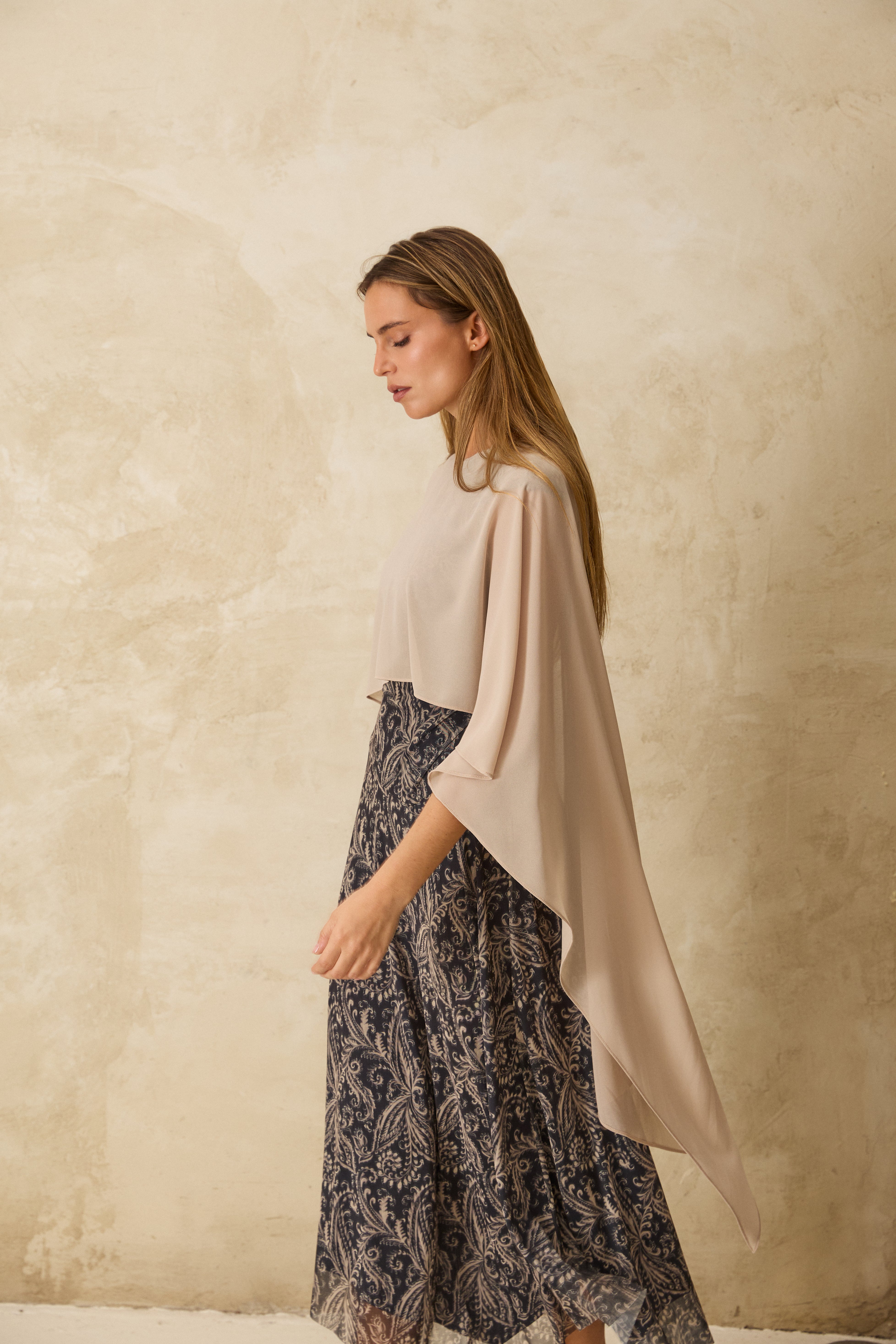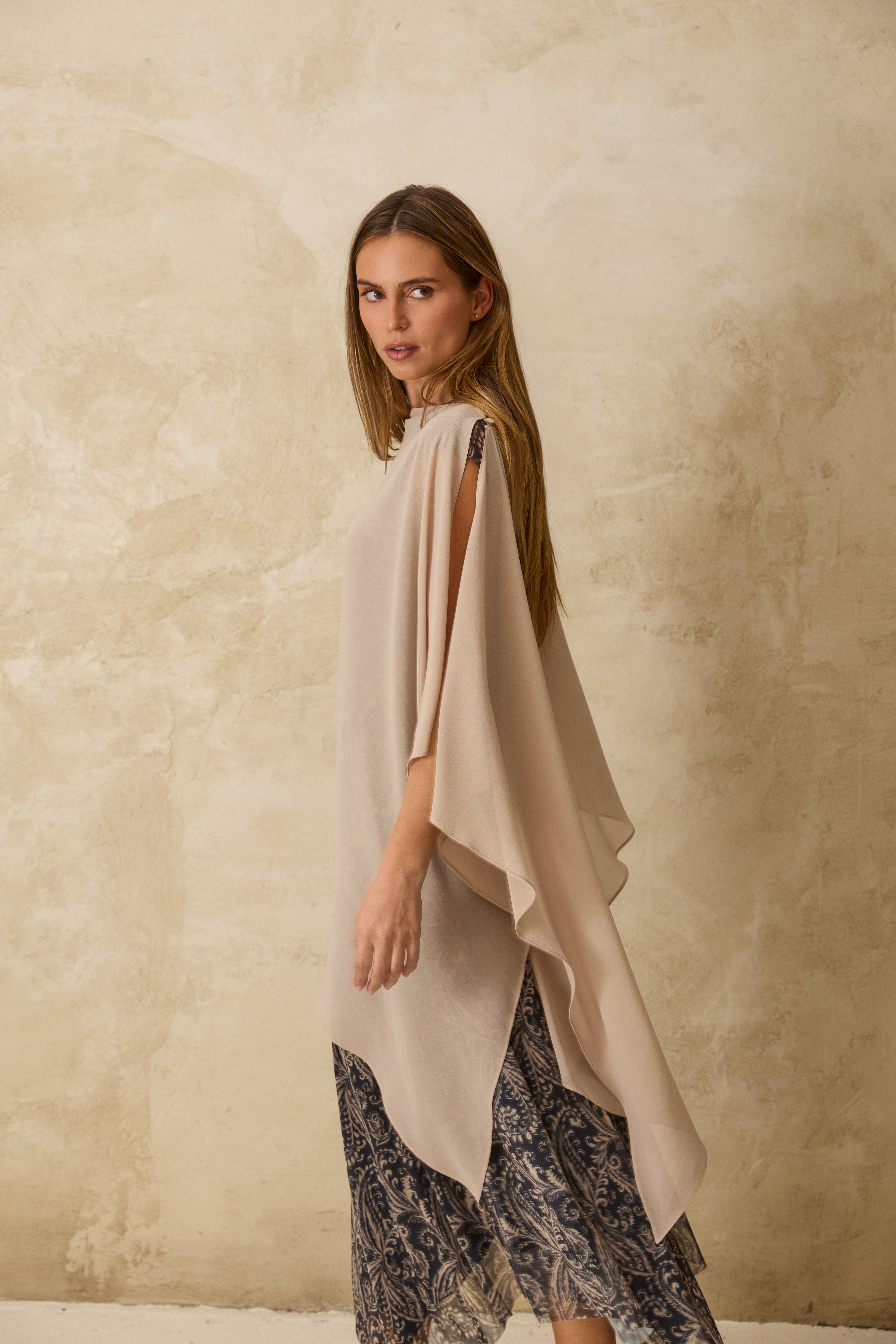 Capa de gasa multiposición con corte asimétrico en topo. Posible ajuste con botón entelado.