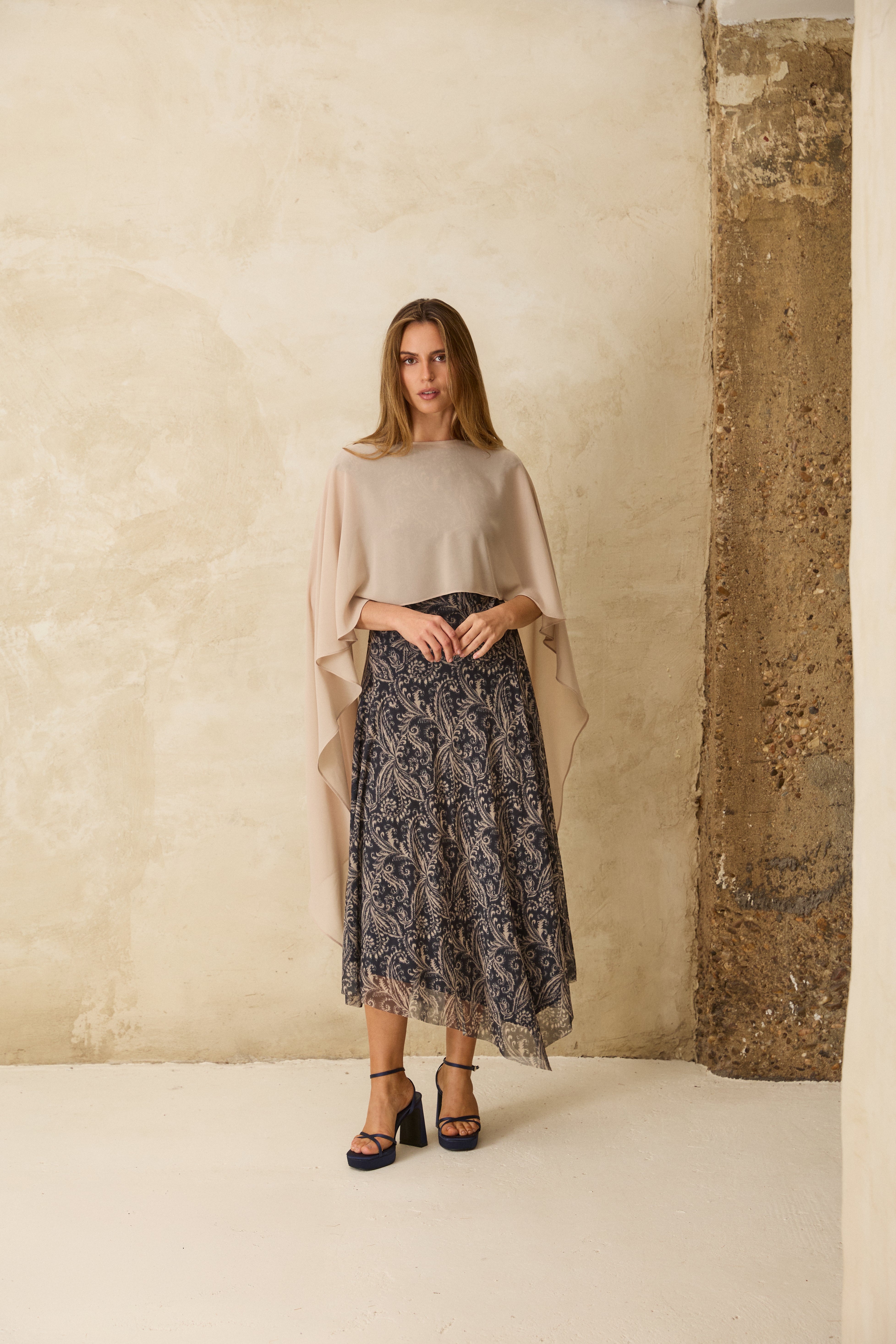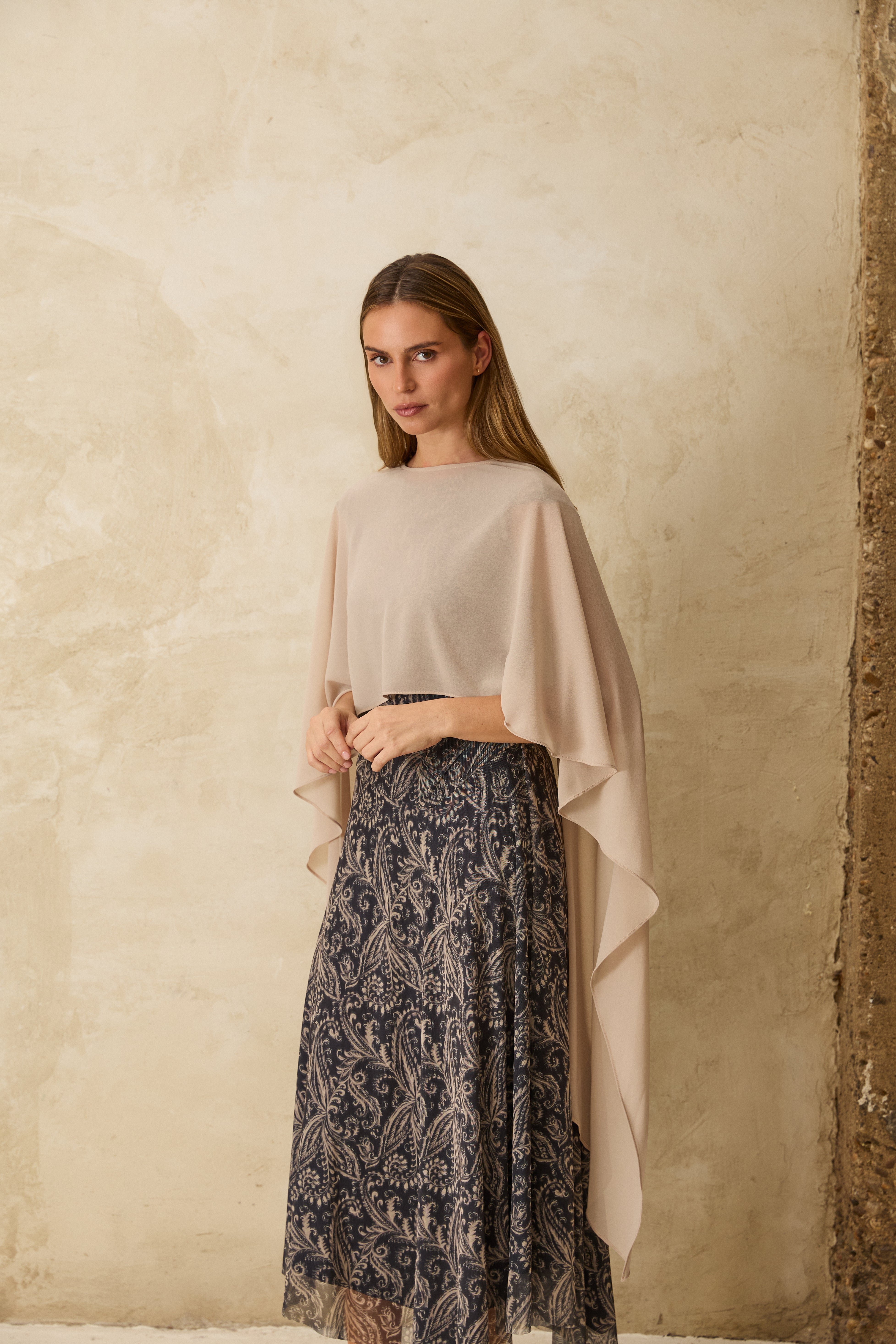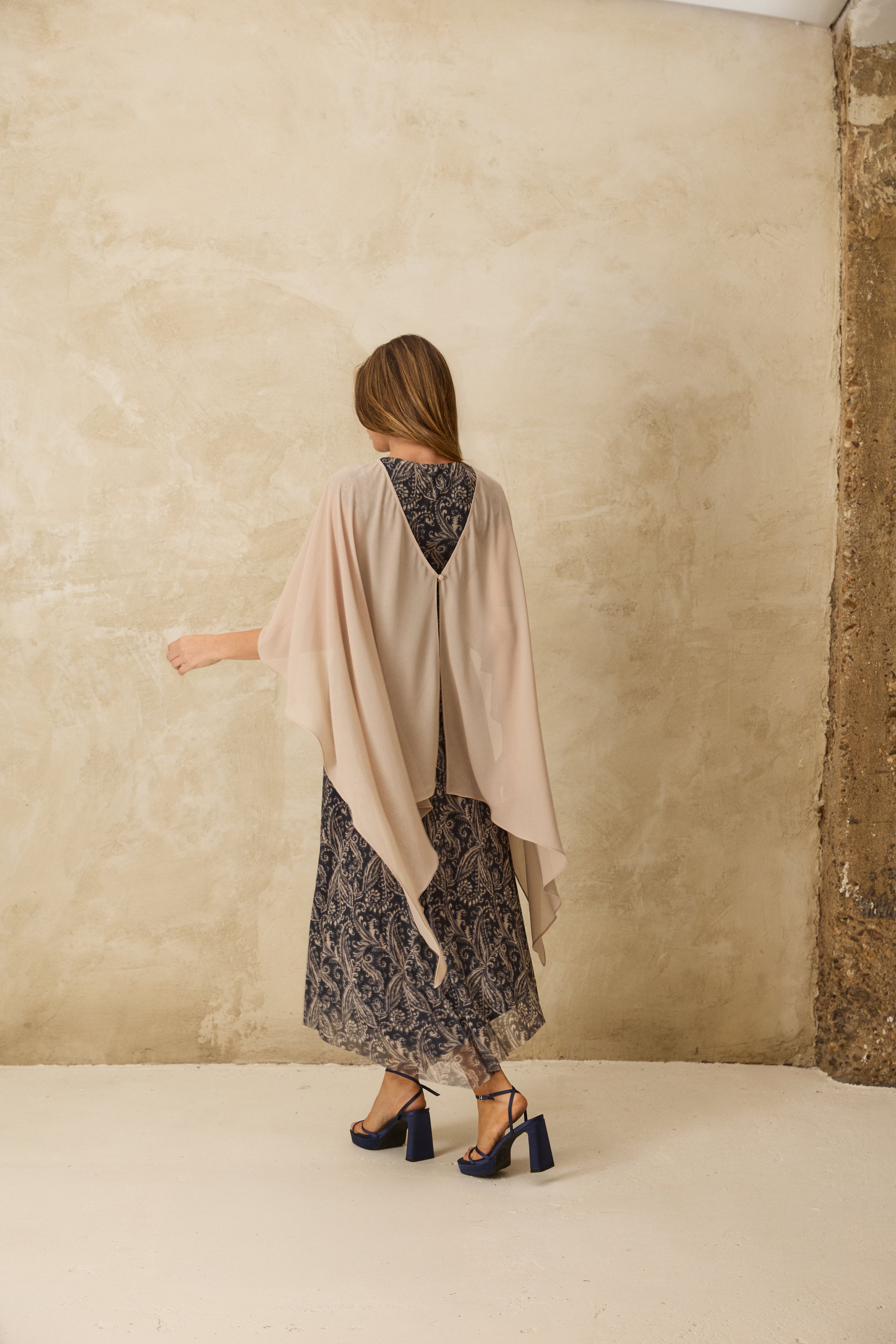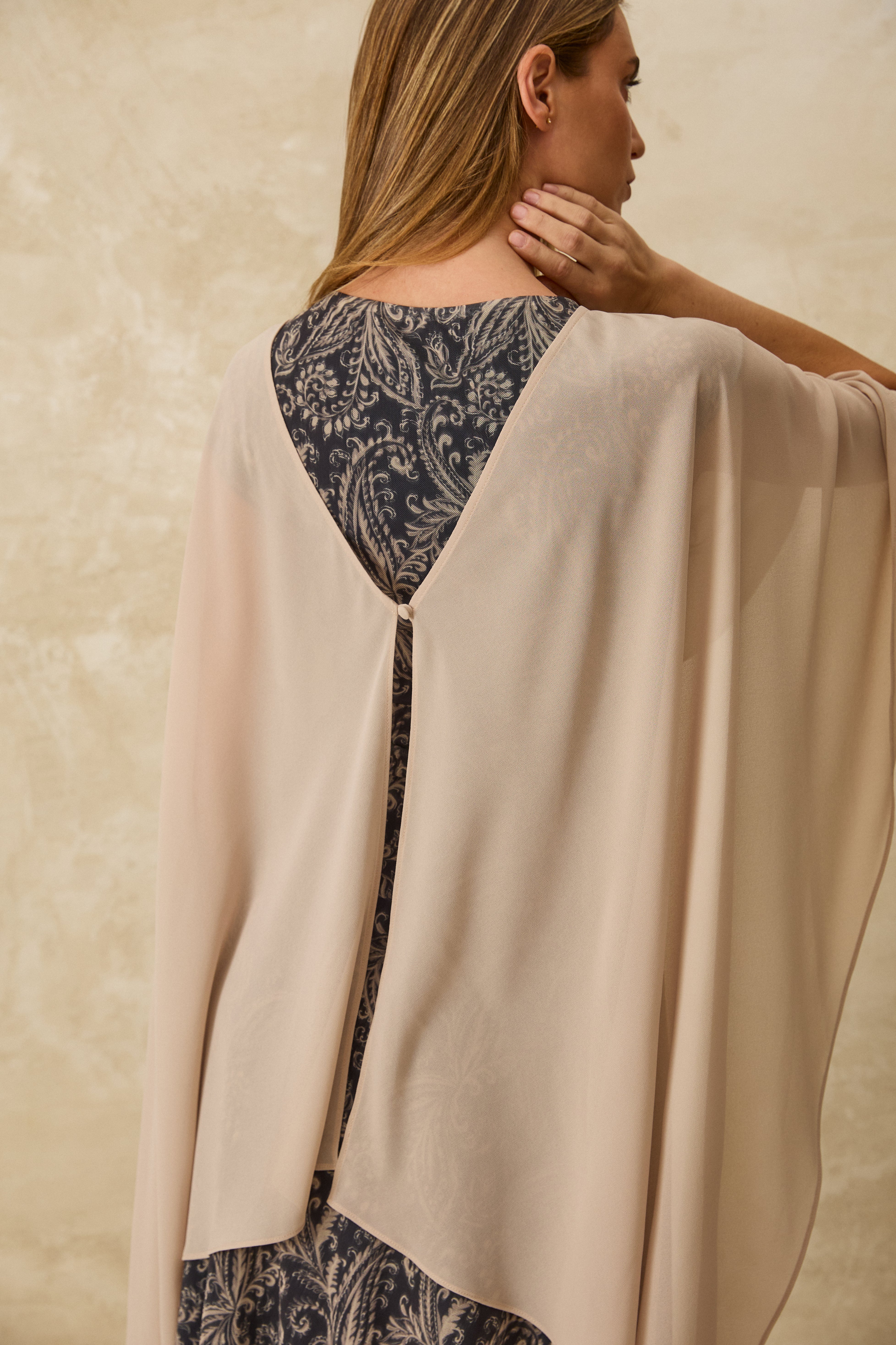 Capa de gasa multiposición con corte asimétrico en topo. Posible ajuste con botón entelado.