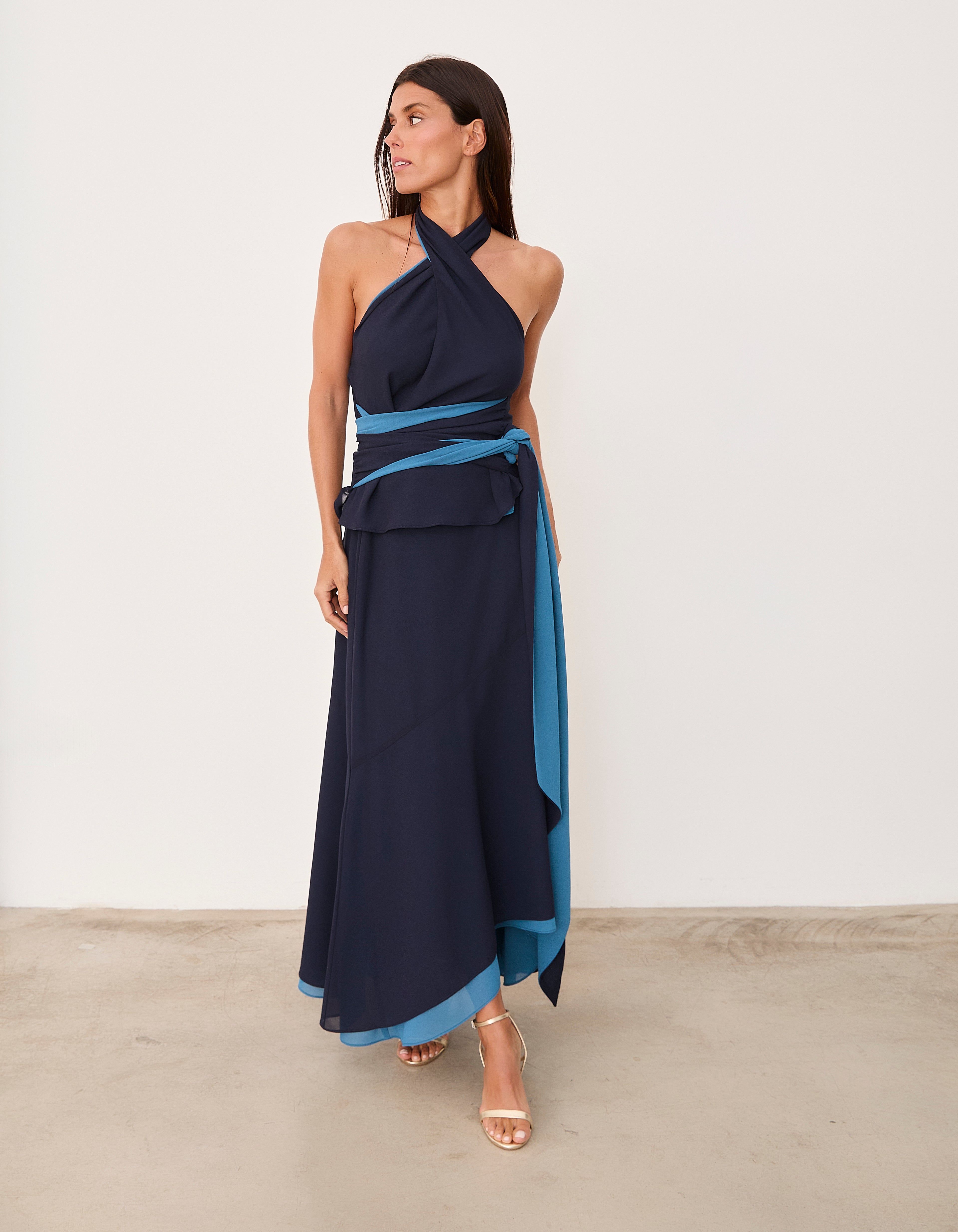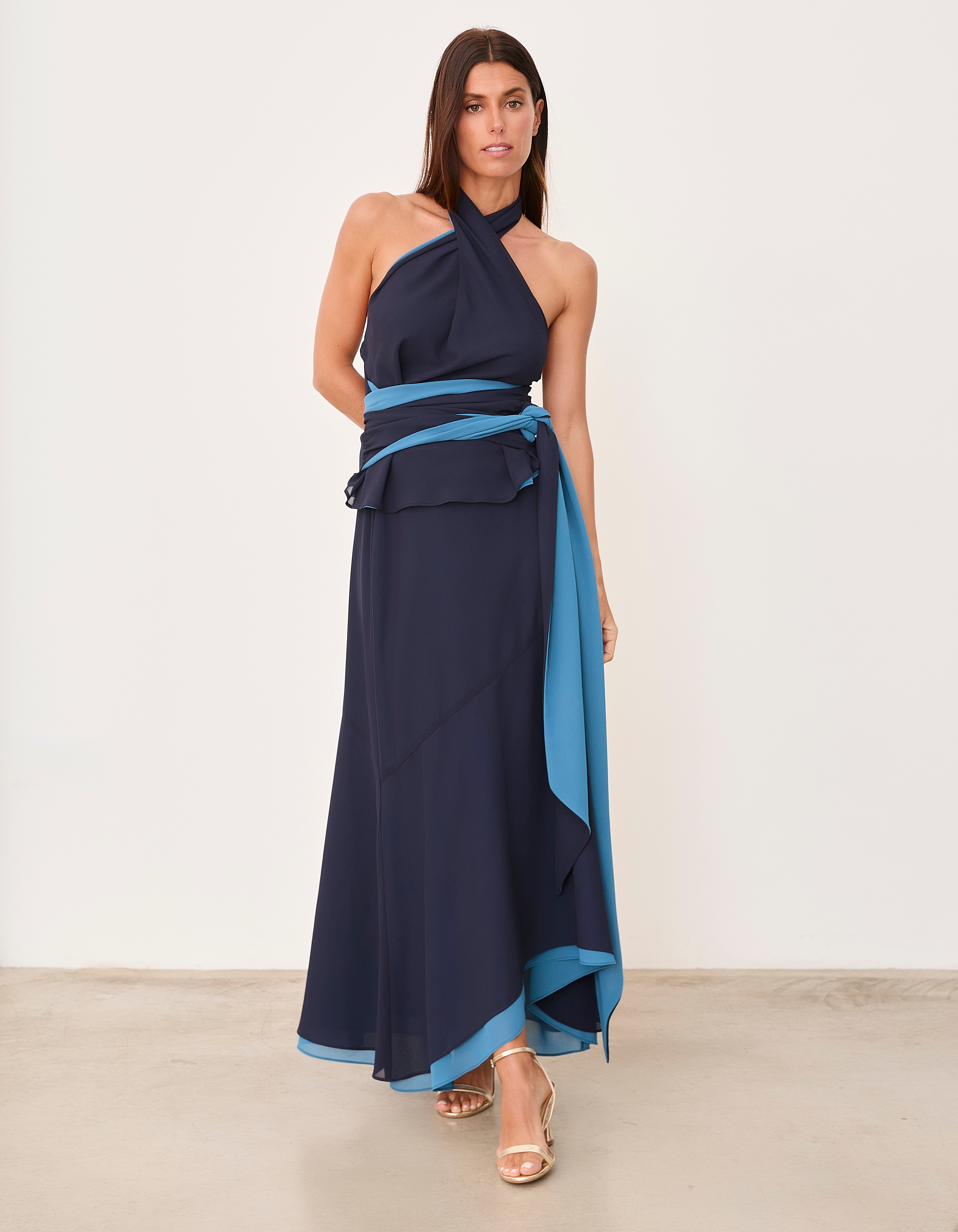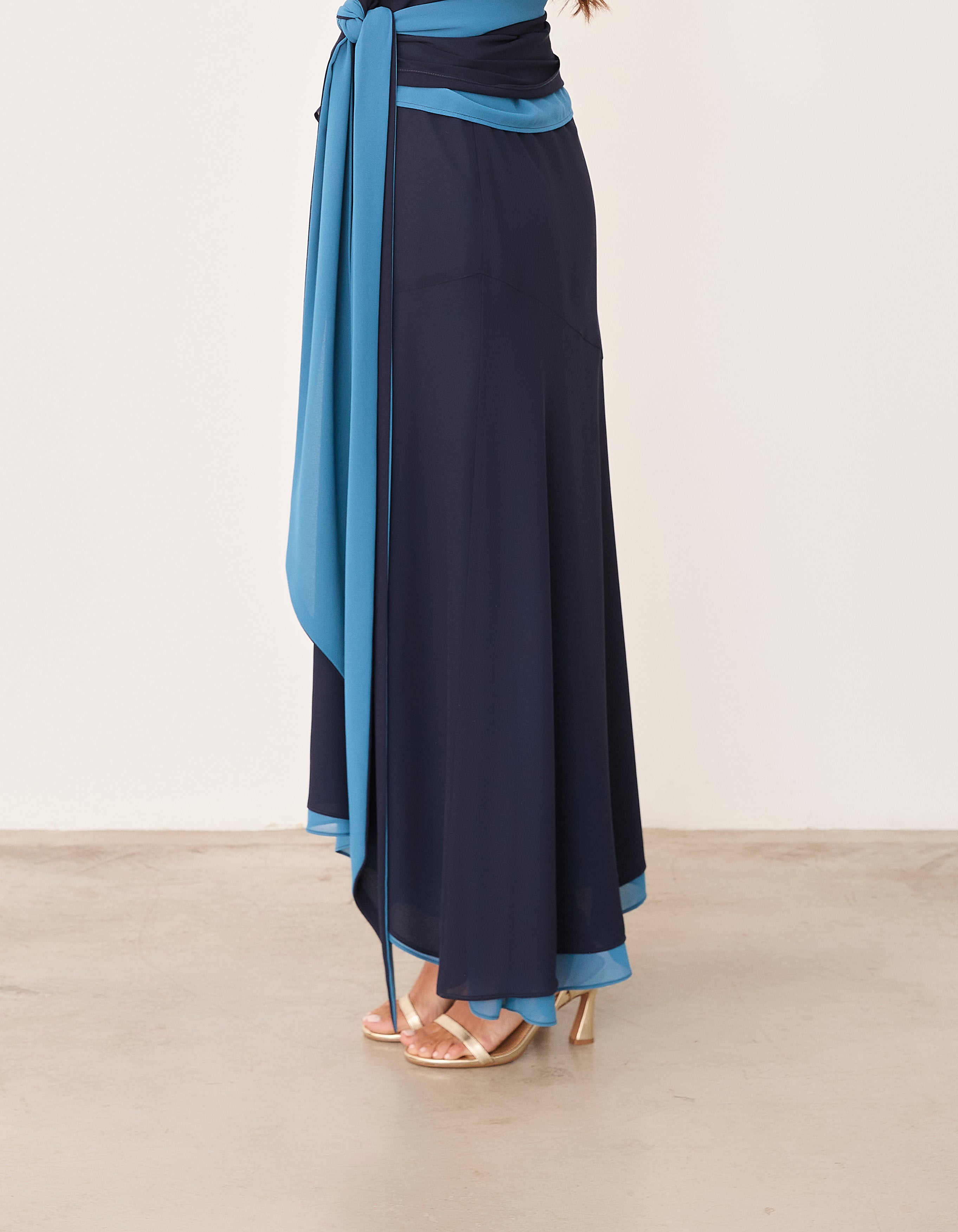 Falda de corte evasé con doble gasa a contraste en tonos azules. Cremallera invisible lateral.