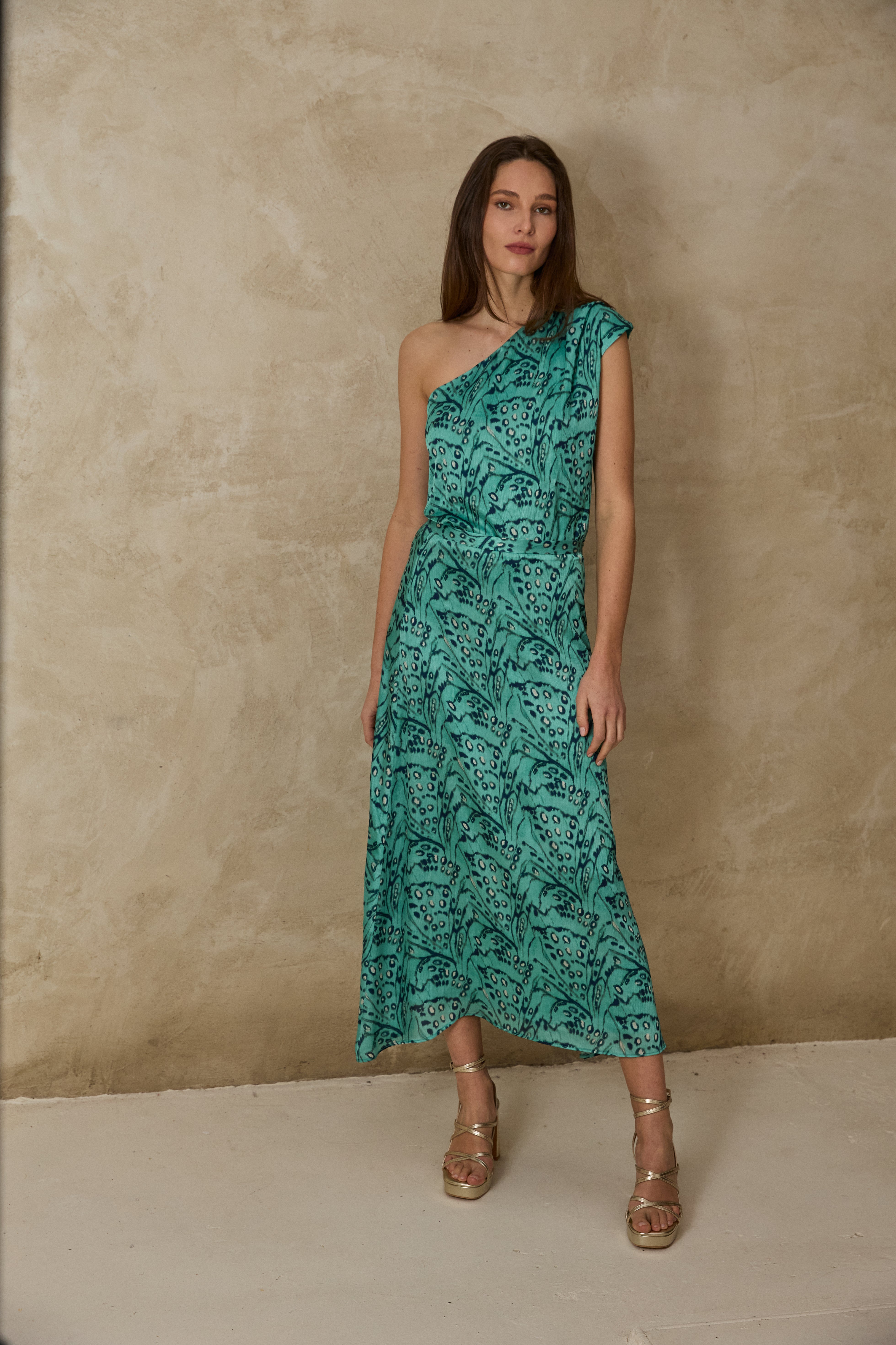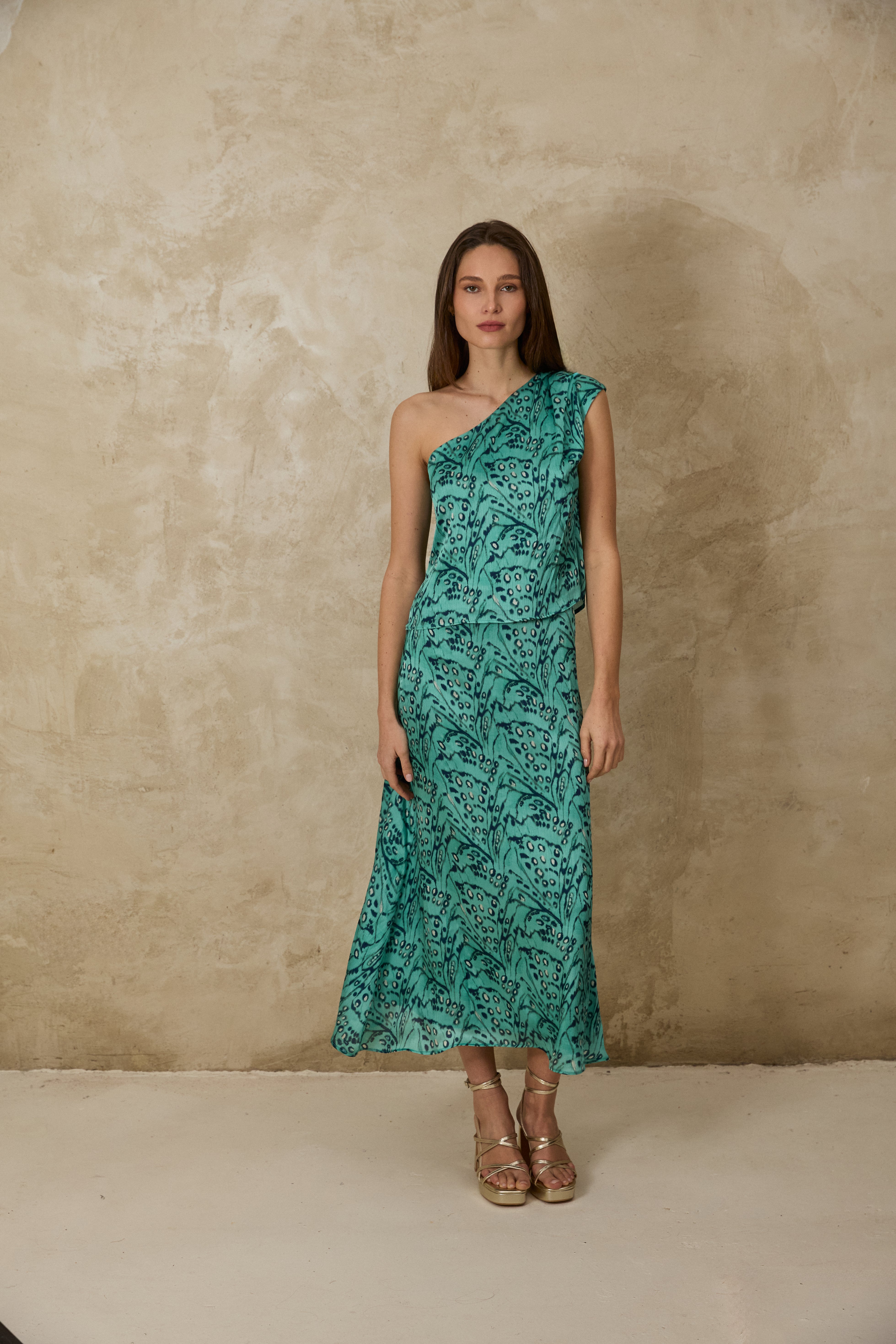 Falda midi fluida con corte evasé en tonos turquesa. Tiro medio con cremallera lateral. Print abstracto. Forro interior combinado.