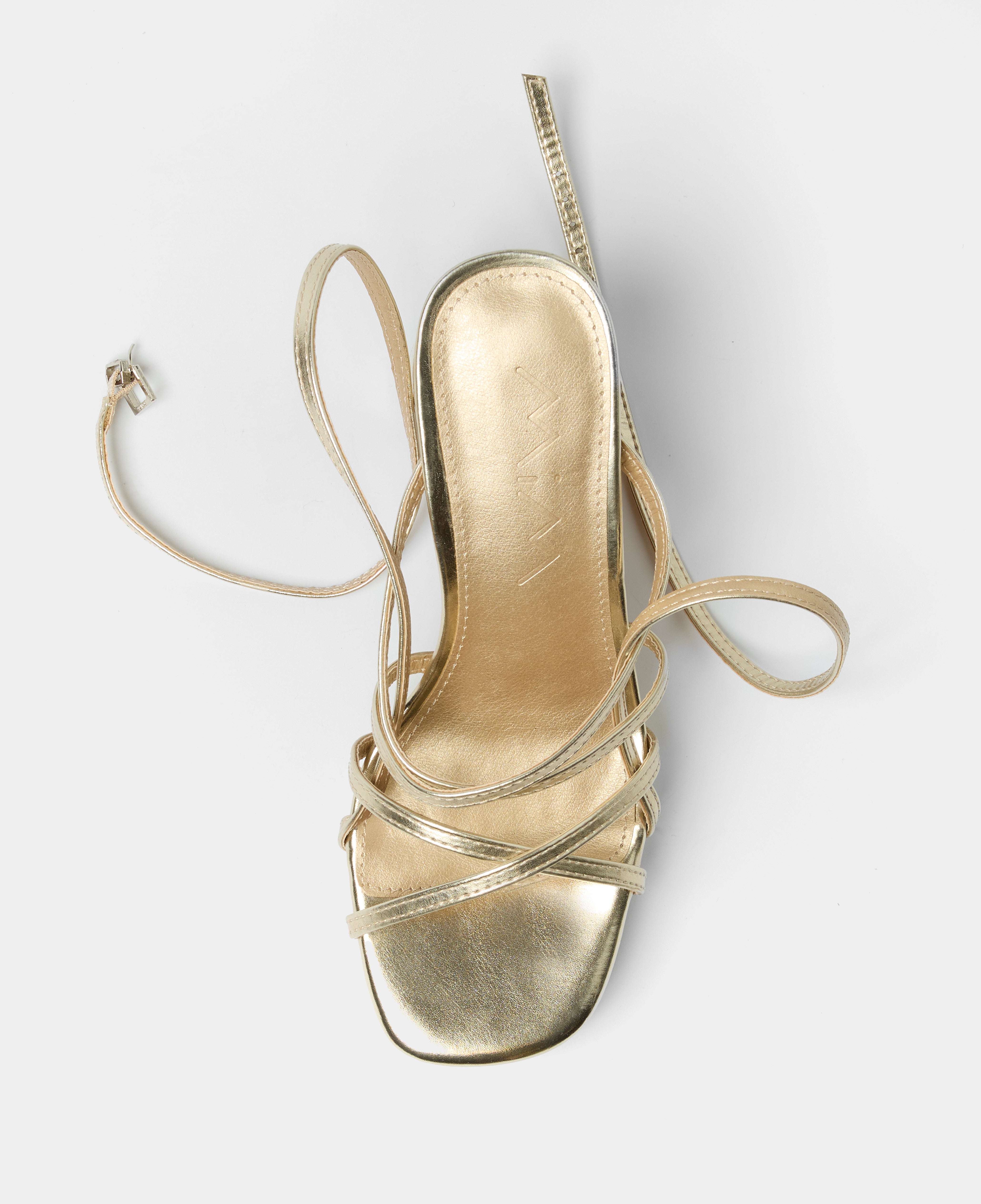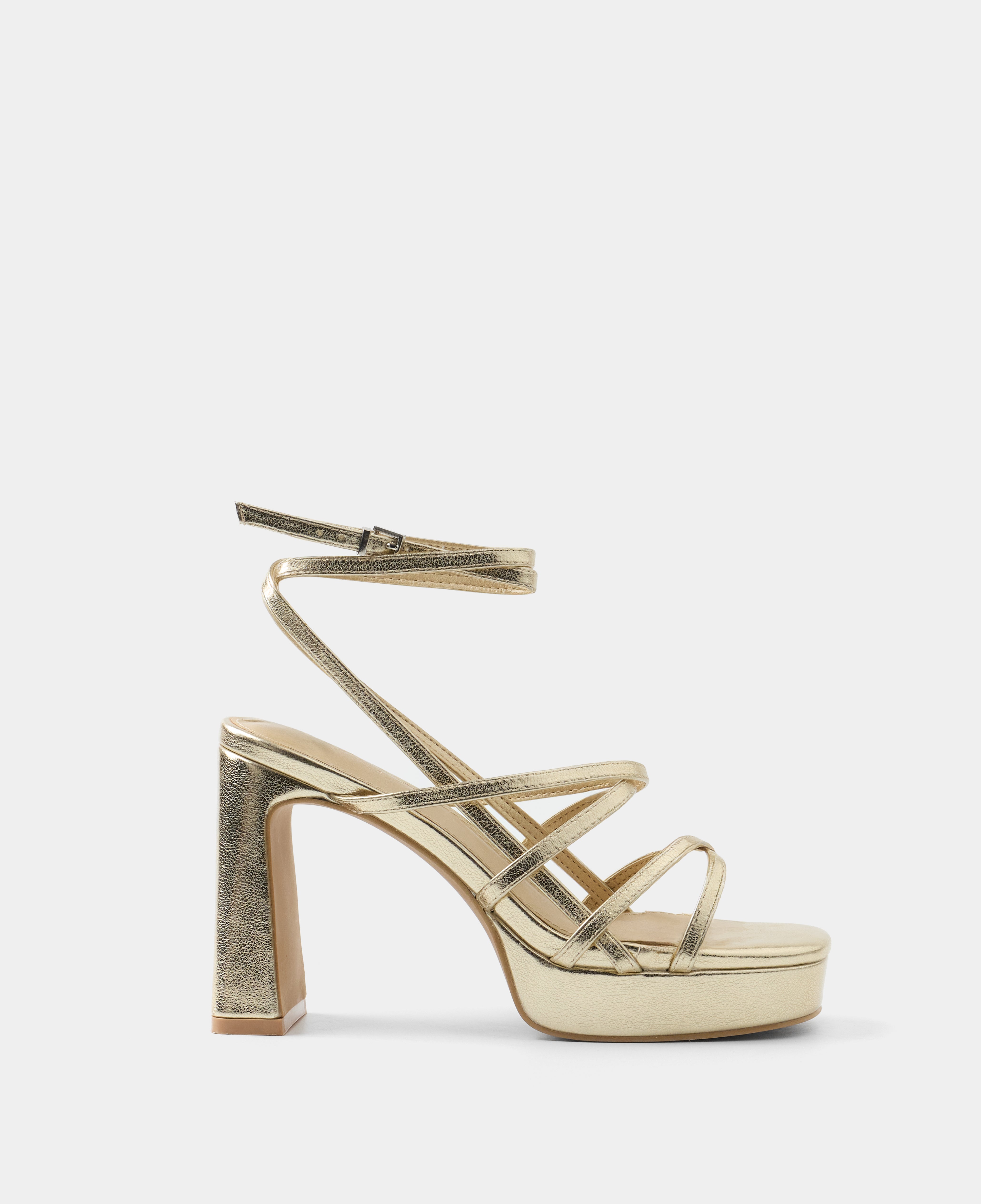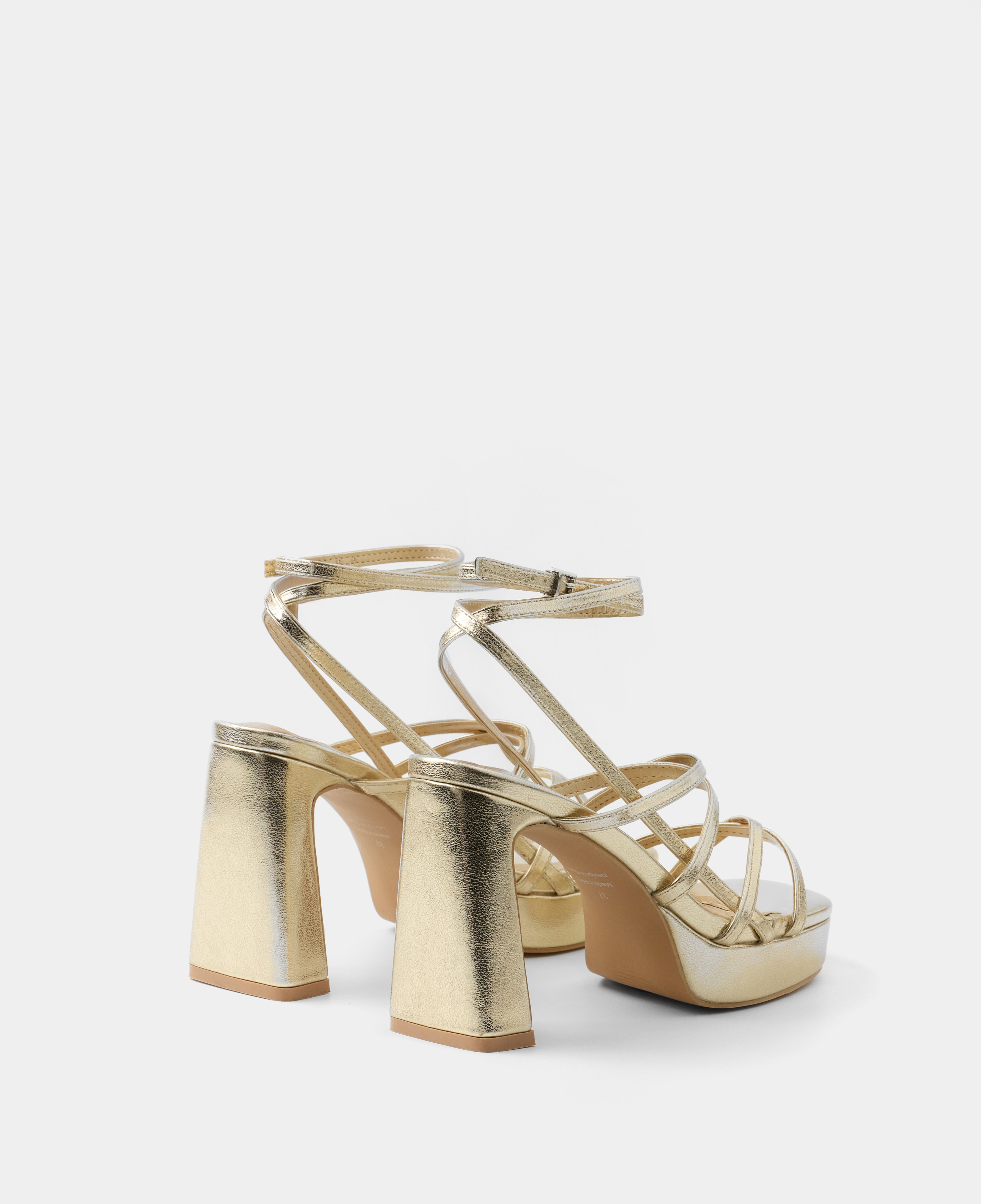 Plateau-Sandale mit glänzendem, goldenem Absatz. Offene Vorderseite mit mehreren asymmetrischen Riemchen und rechteckigem Absatz. Knöchelriemenverschluss mit Metallschnalle.