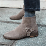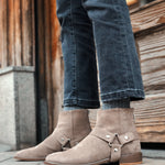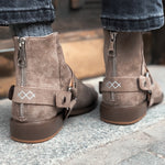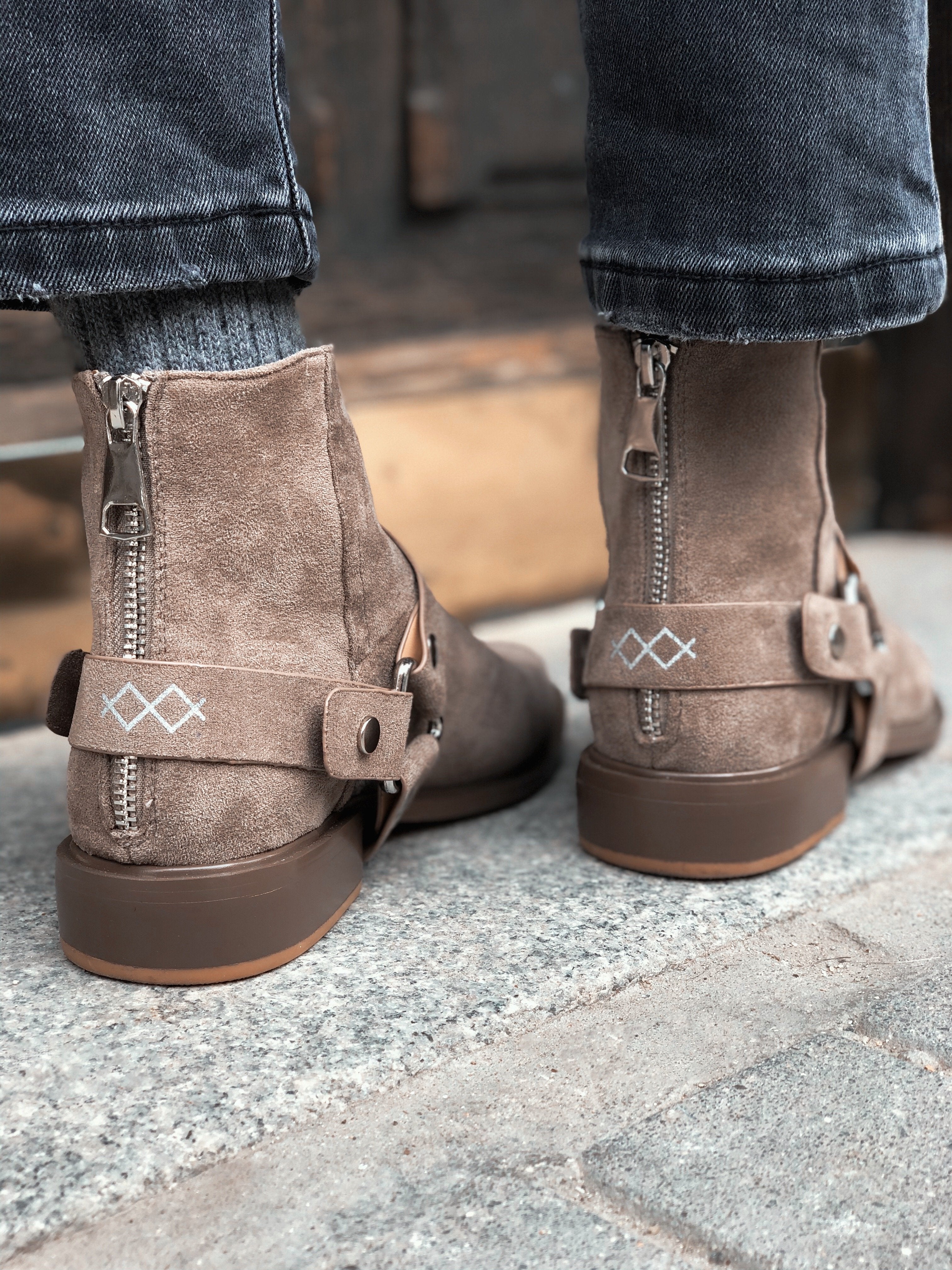 Niedrige Stiefelette aus veganem Wildleder in Taupe. Drei Riemen, zwei um den Knöchel und einer unter der Sohle, die an den Seiten zu einem metallischen Dreieck mit silbernen Details verbunden sind. Reißverschluss hinten zum Verschließen.