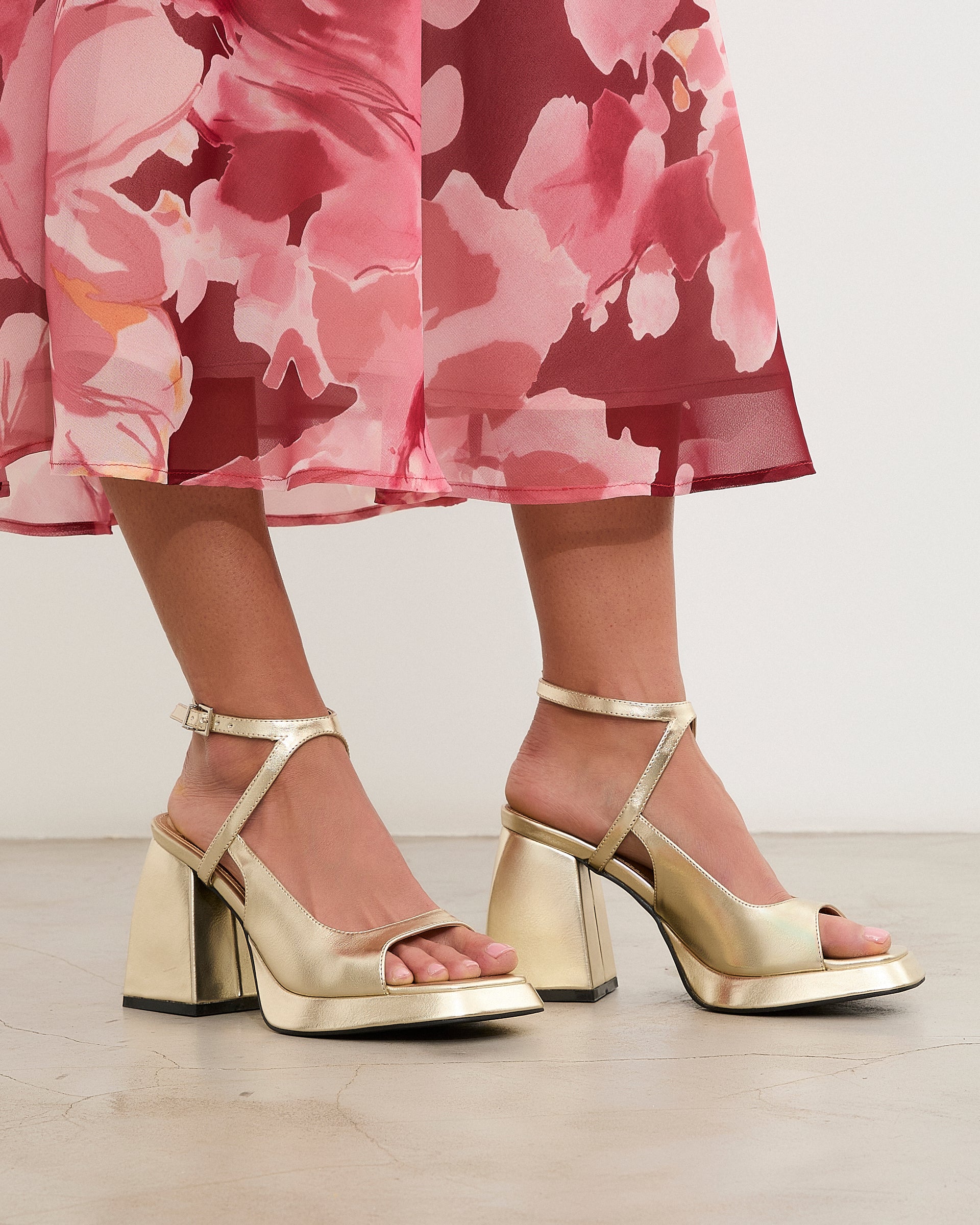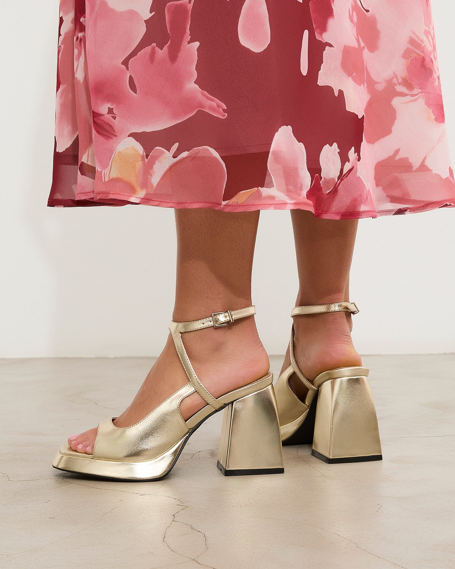 Goldfarbene Sandale mit geometrischem Plateau-Absatz und Zehenpartie. Umlaufender Riemen an den Seiten, verbunden mit einem hinteren Riemen mit Knöchelriemen und Schnalle. Breiter, hoher Absatz.