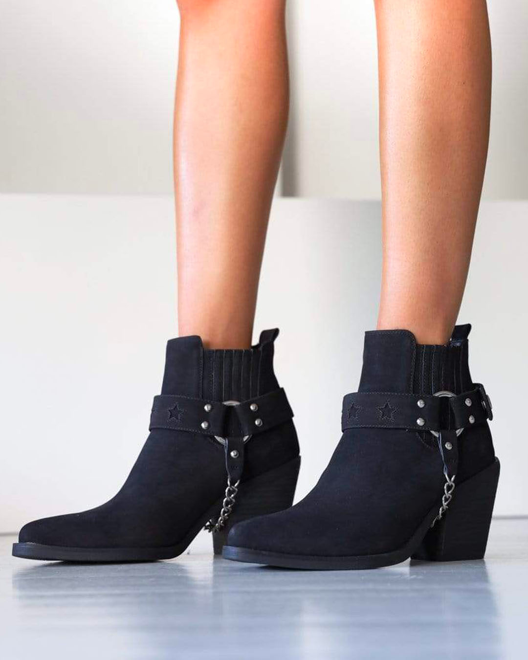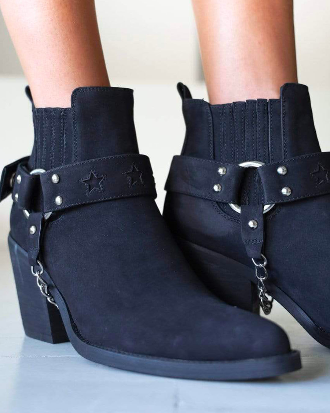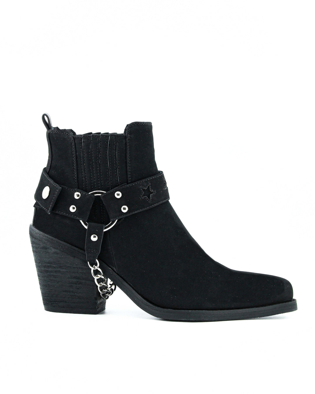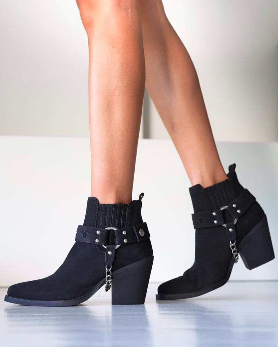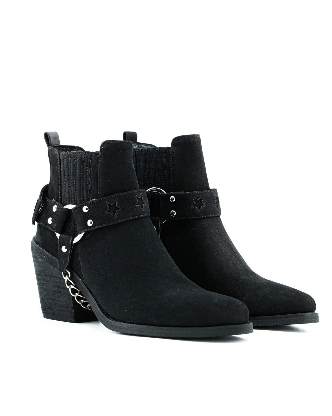 Schwarze Stiefelette aus veganem Wildleder mit Riemendetail um den Knöchel mit silbernen Nieten und Sternsilhouetten.