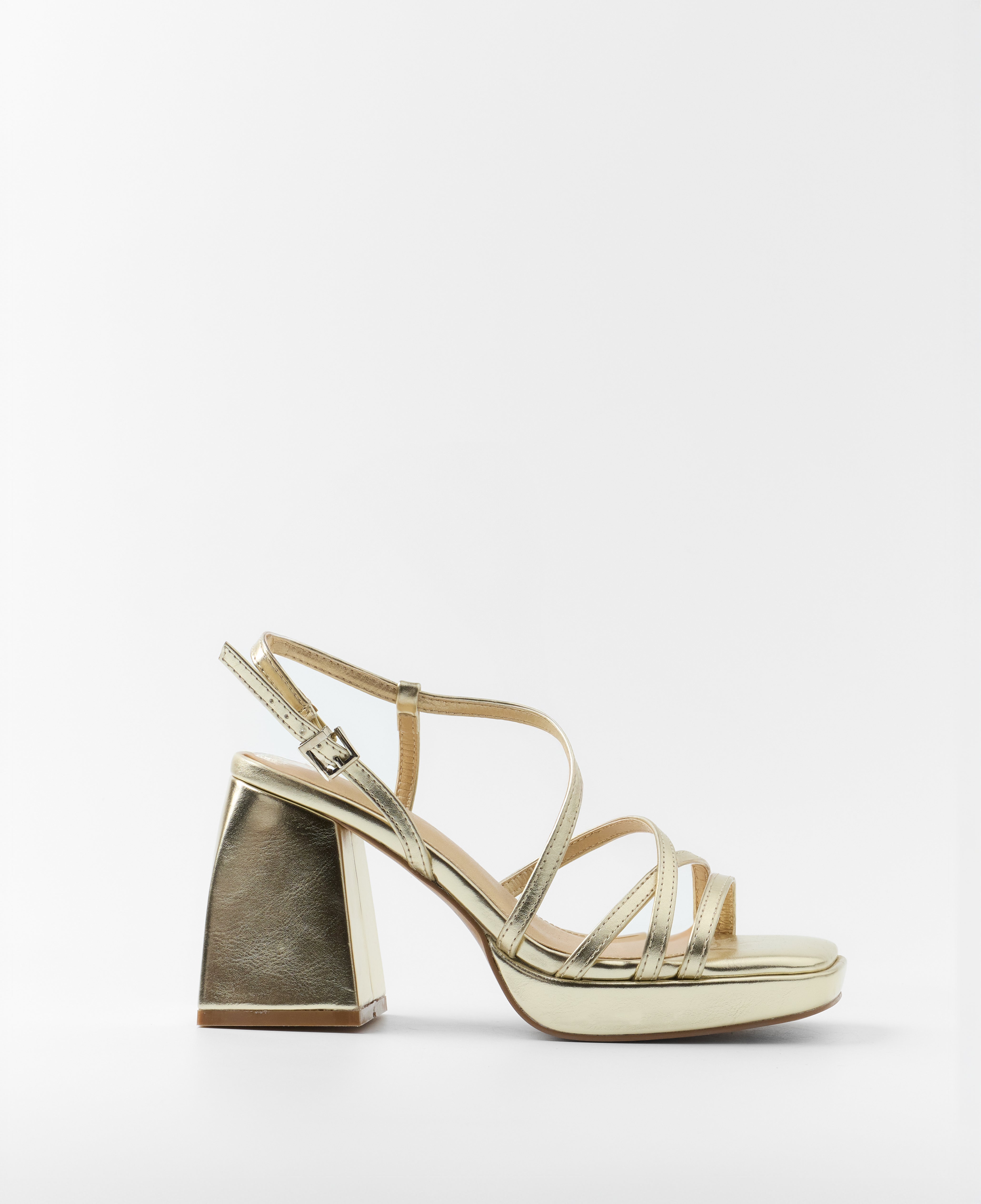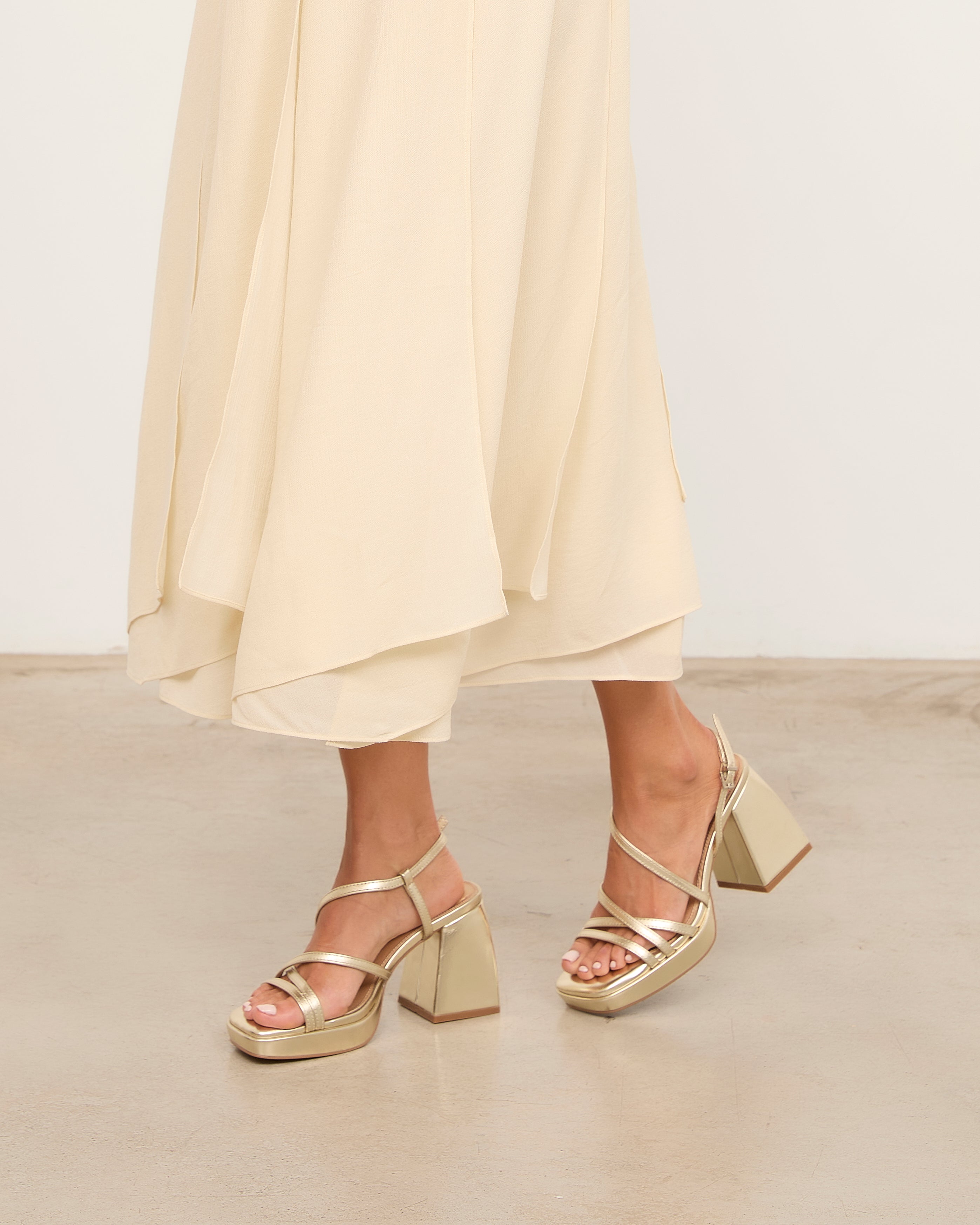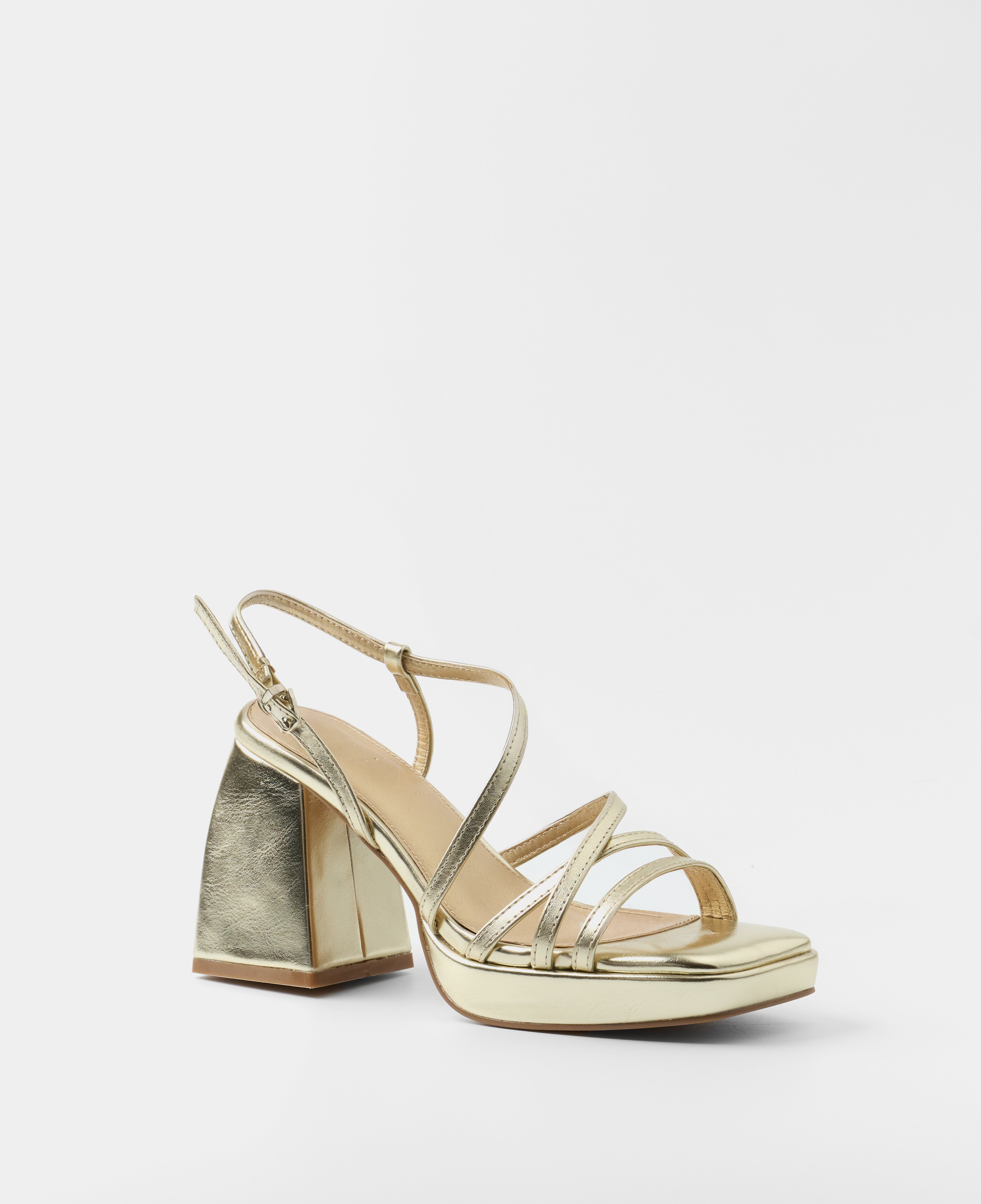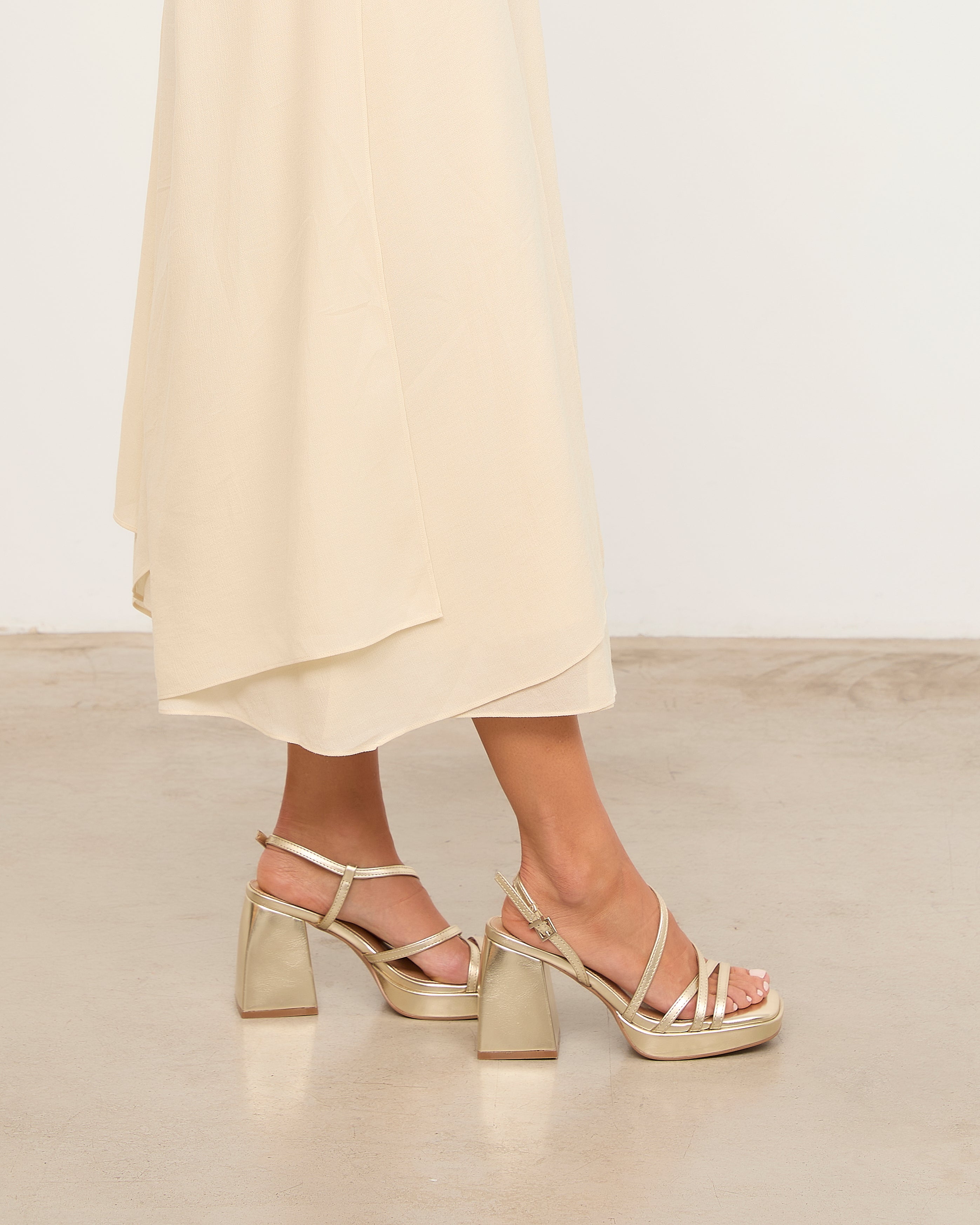 Shiny gold heeled sandal. Open front with several tubular straps. Square heel. Ankle bracelet closure with metal buckle.