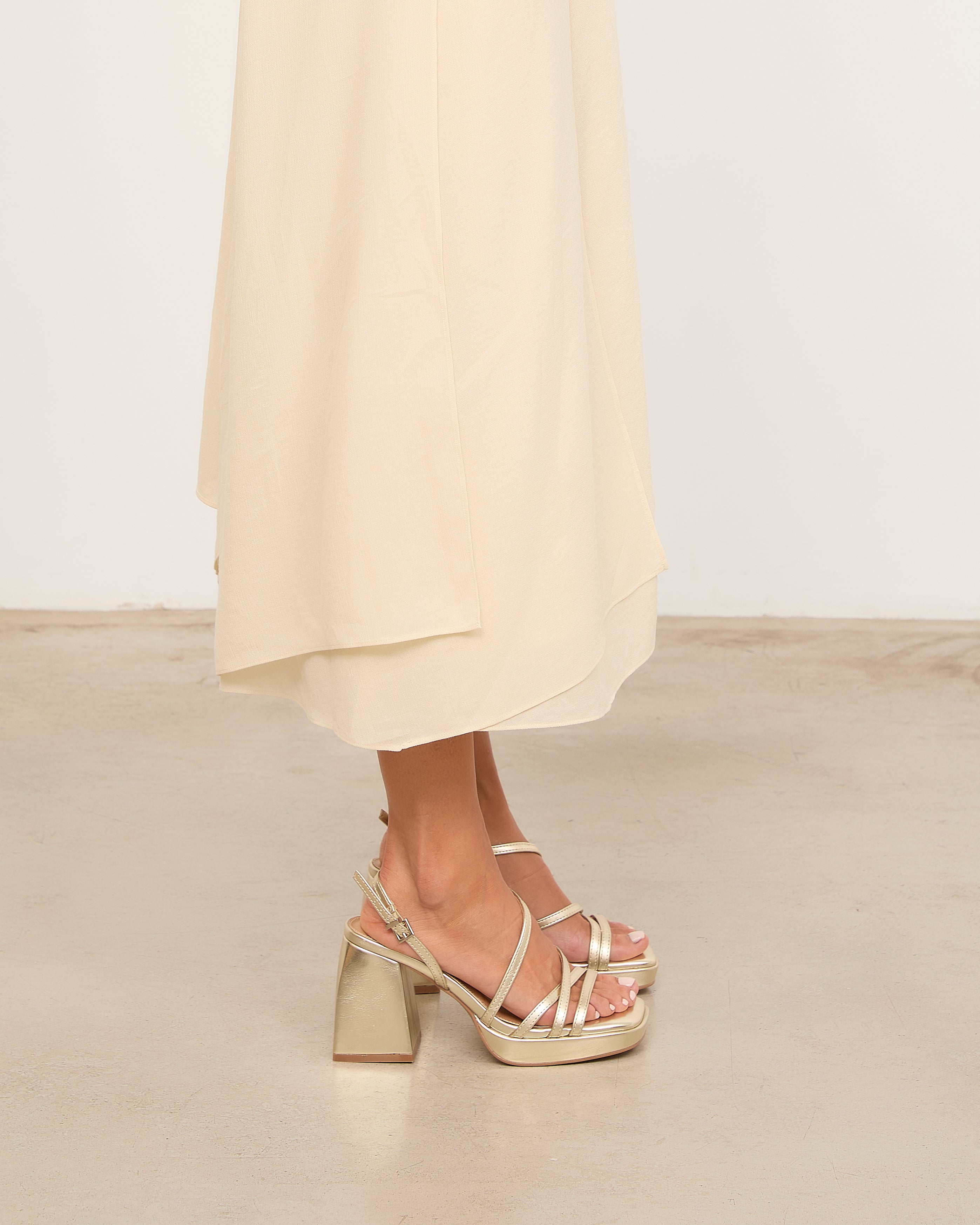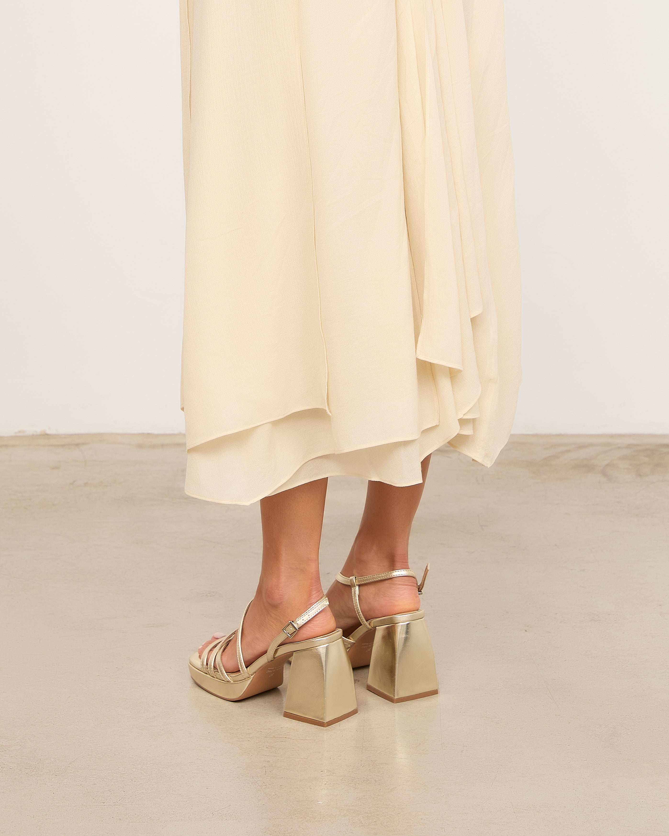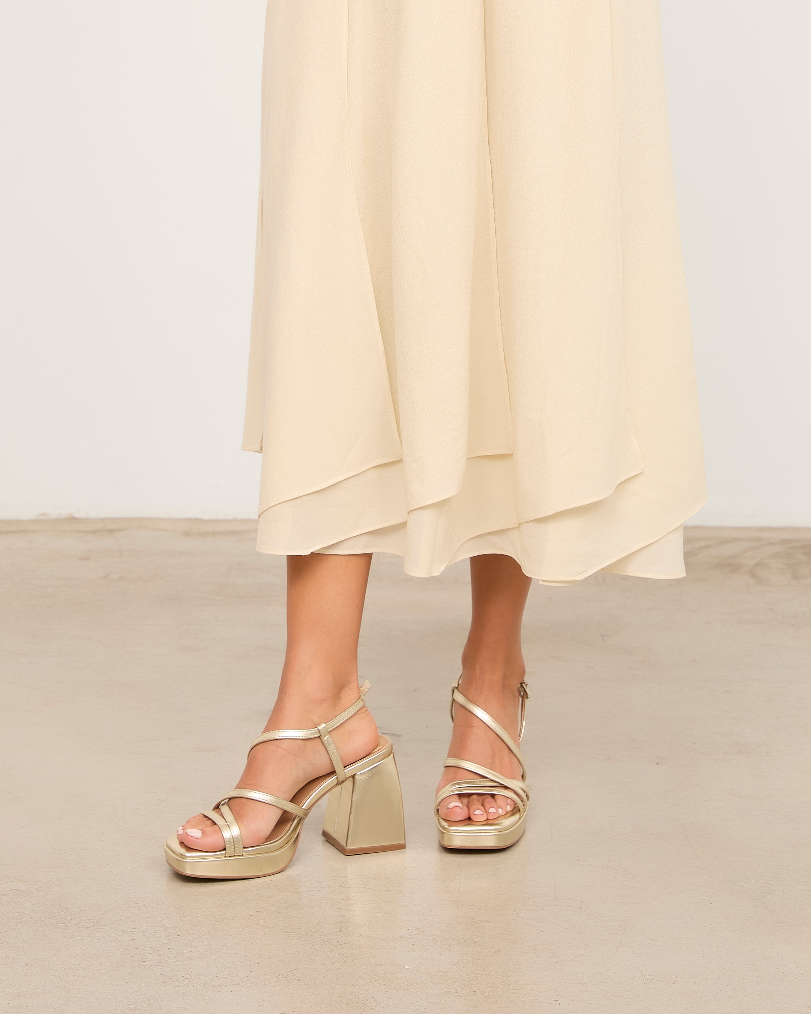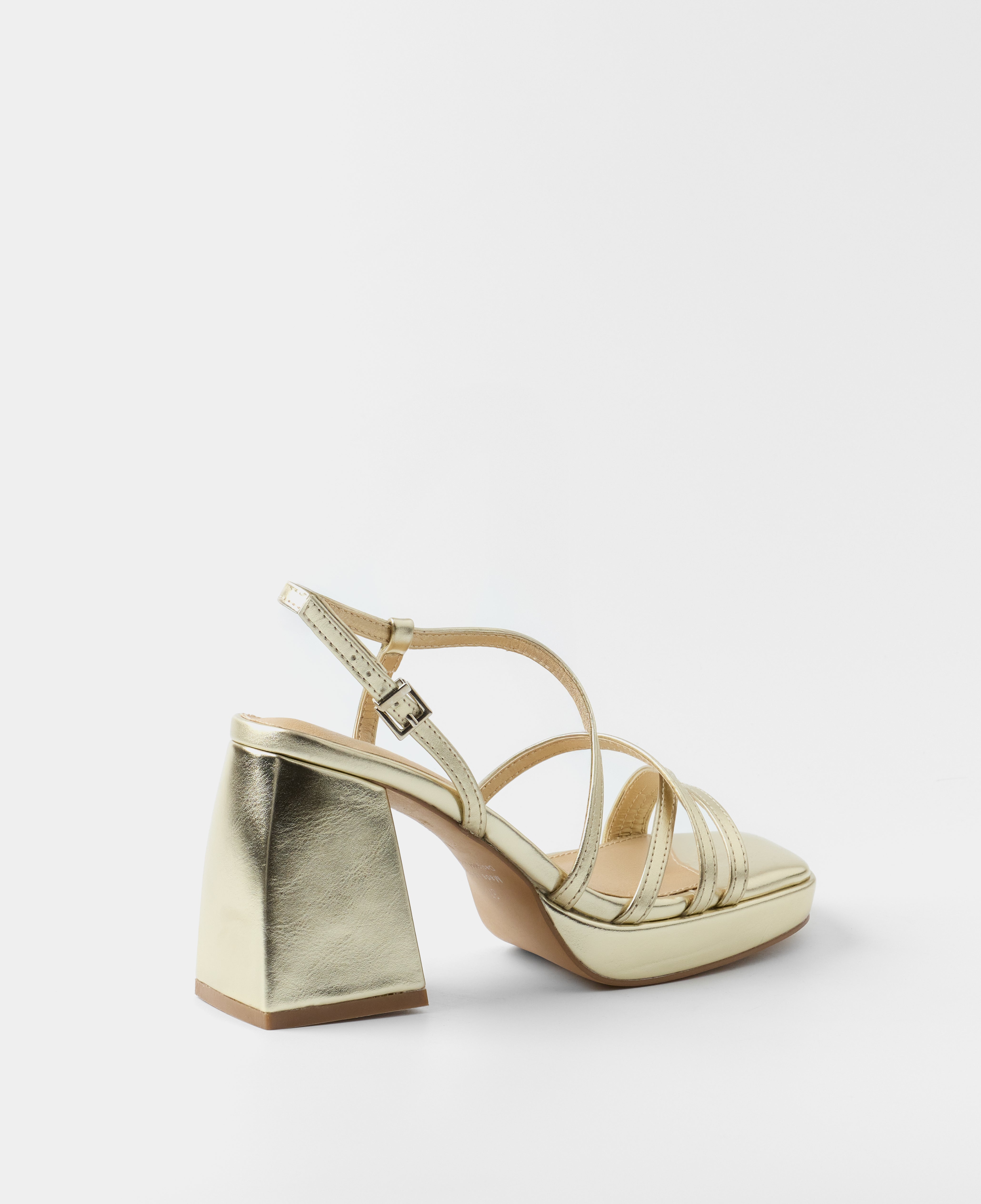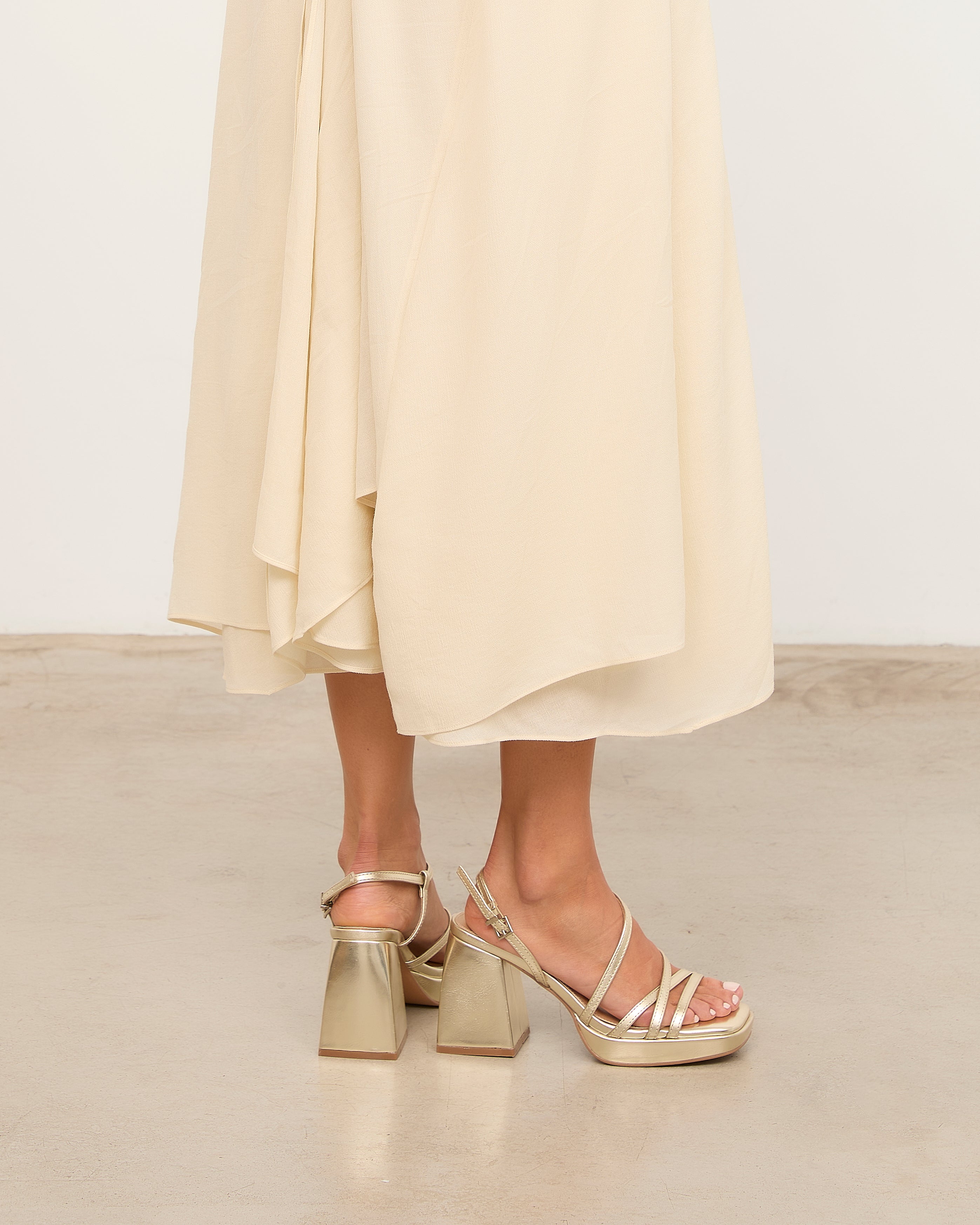 Shiny gold heeled sandal. Open front with several tubular straps. Square heel. Ankle bracelet closure with metal buckle.