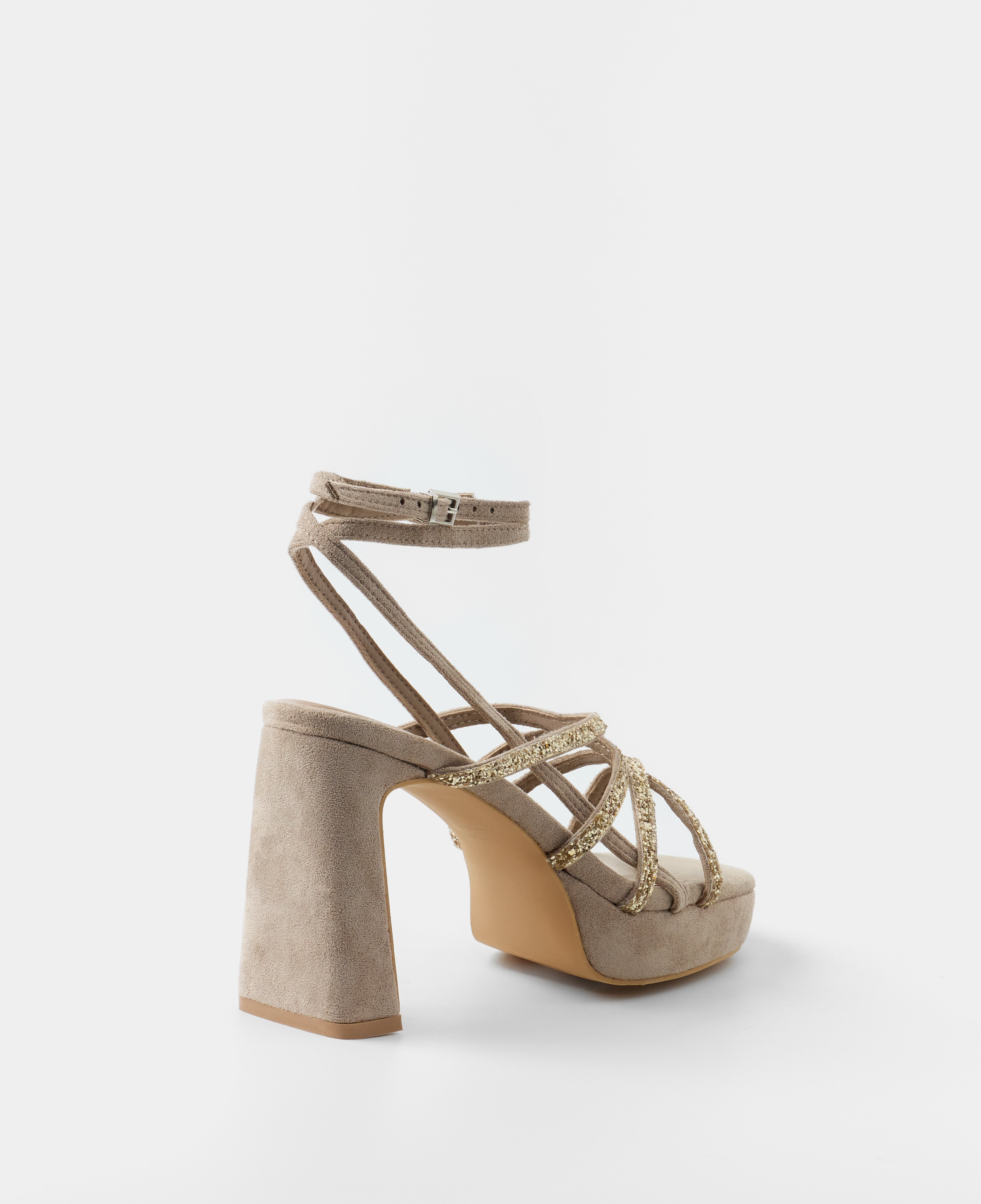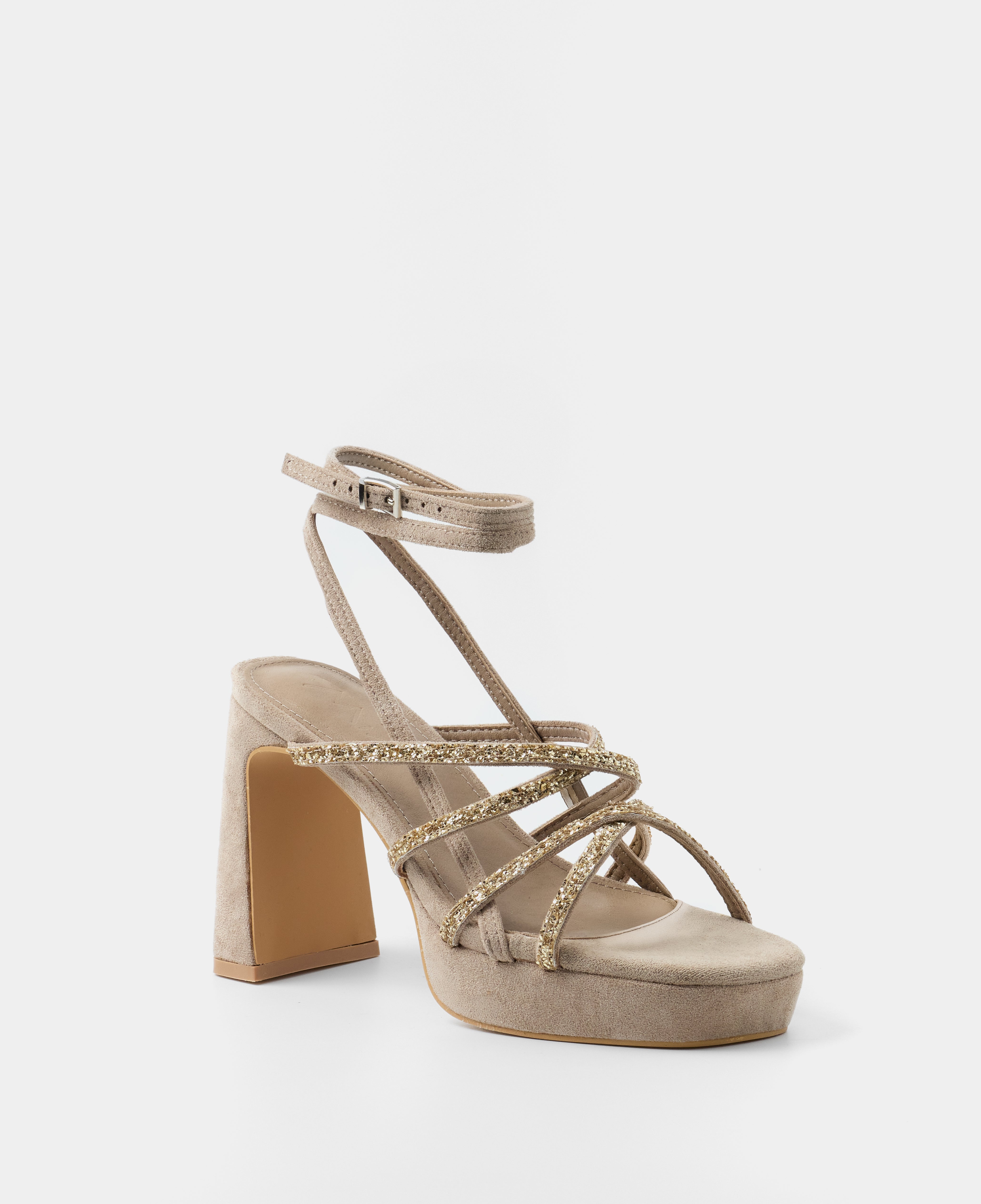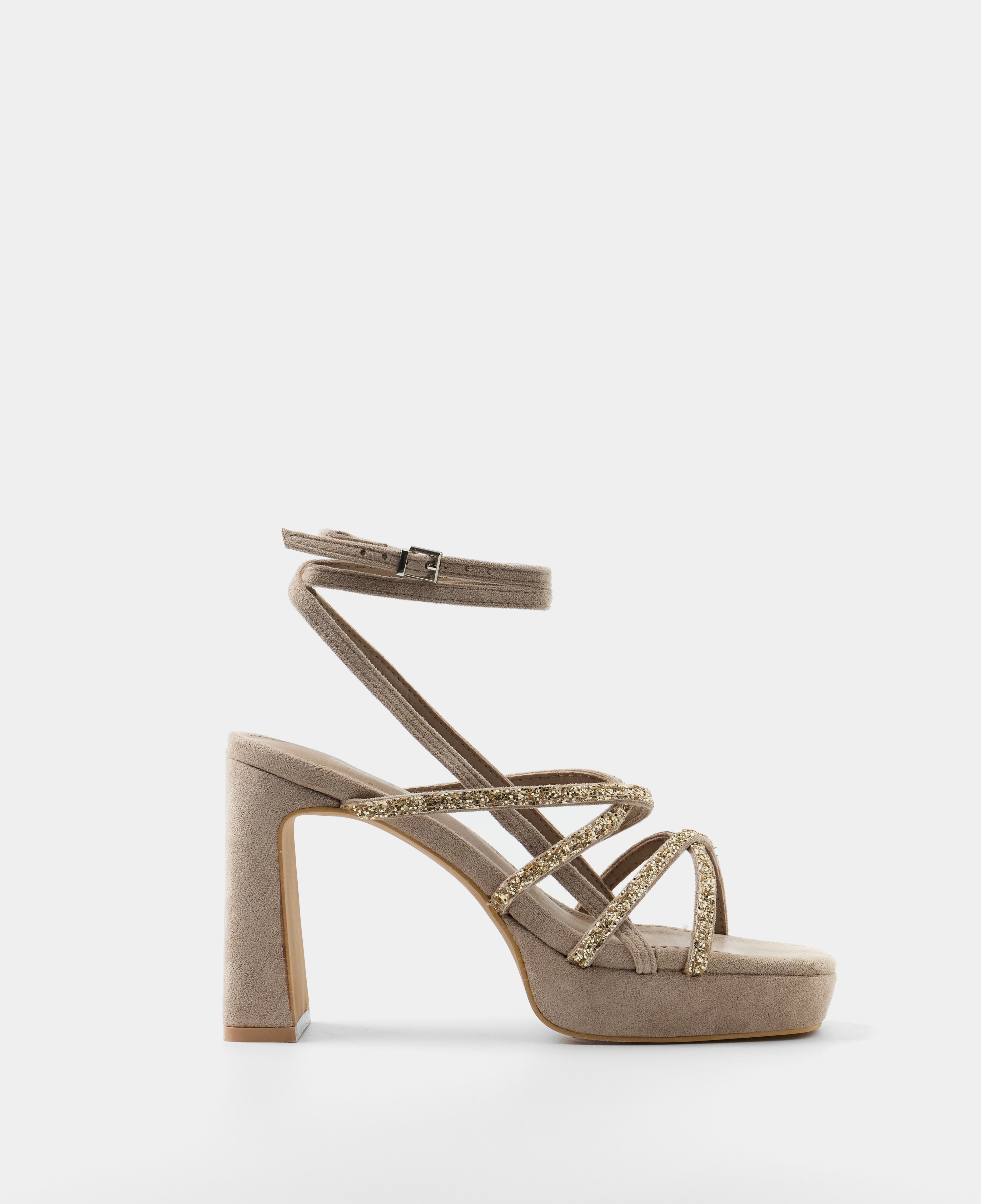 Platform heel sandal in taupe vegan suede. Composed of several straps with matching glitter and two long straps to tie around the ankle. Buckle closure.