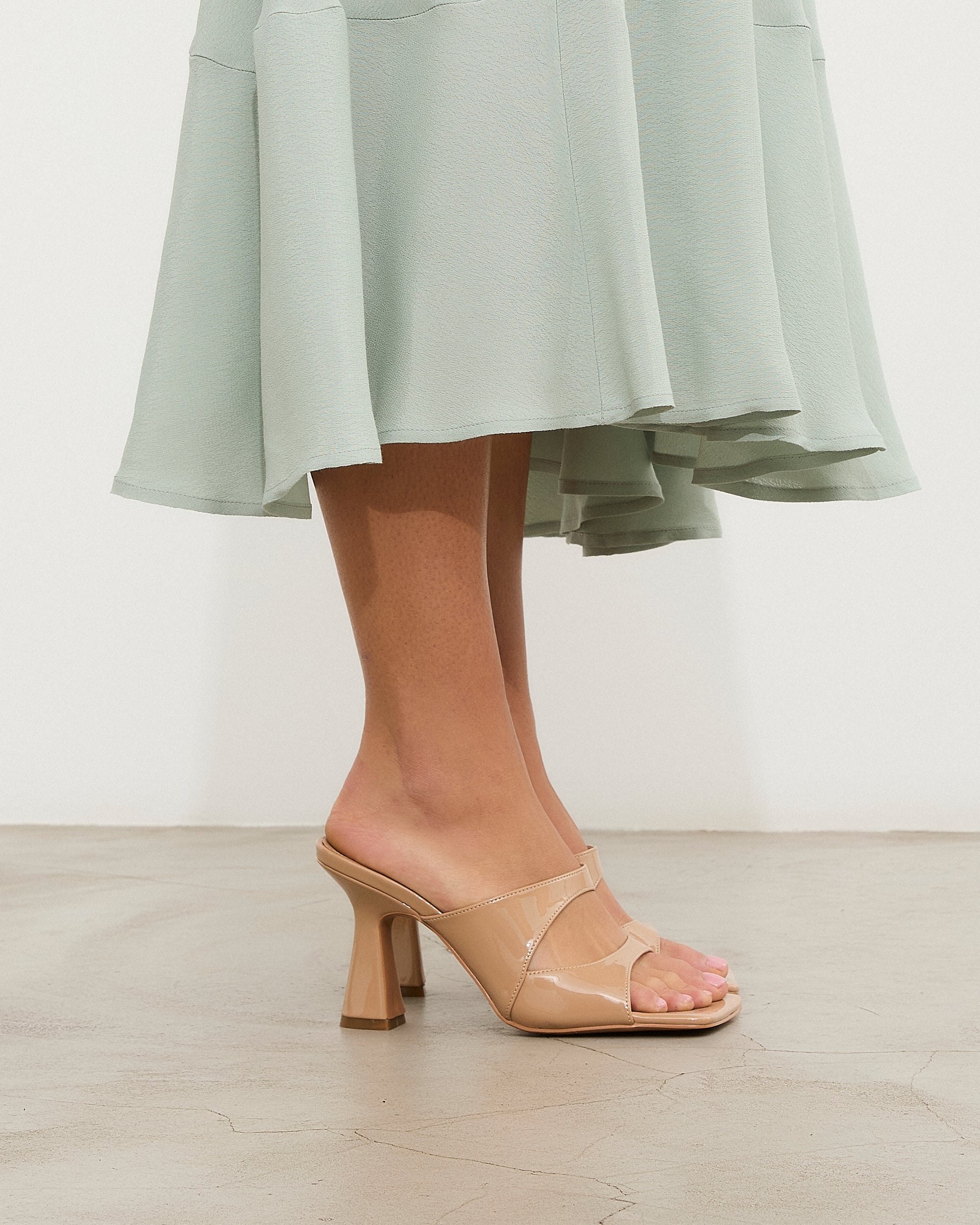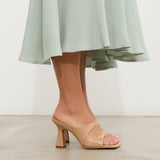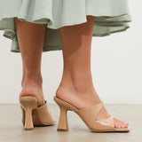 Nude-colored mule-style heeled sandal with a square toe. Two overlapping front straps on the side. Needle heel with a wide base.