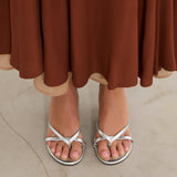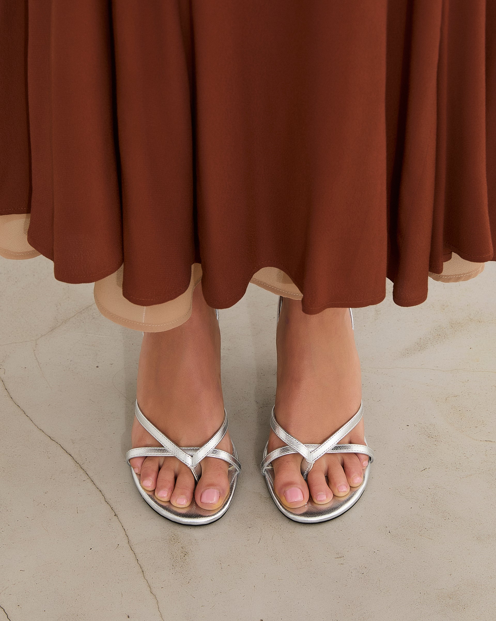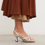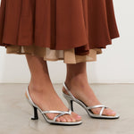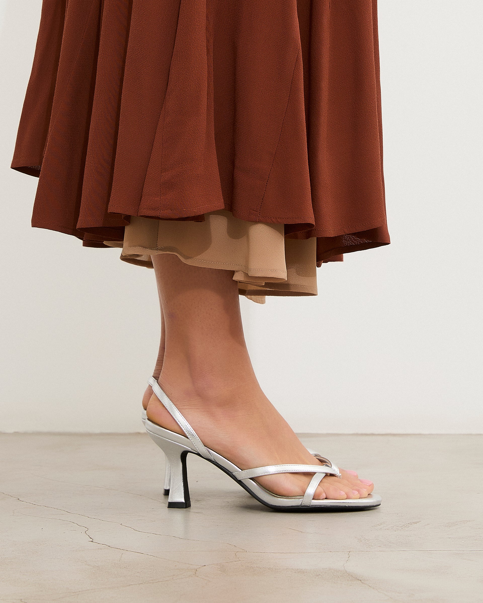 Heeled sandal with rounded toe in silver color. Thin crossed straps at the front. Back strap with elastic for heel adjustment. Wide-based stiletto heel.