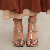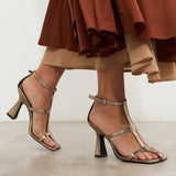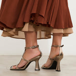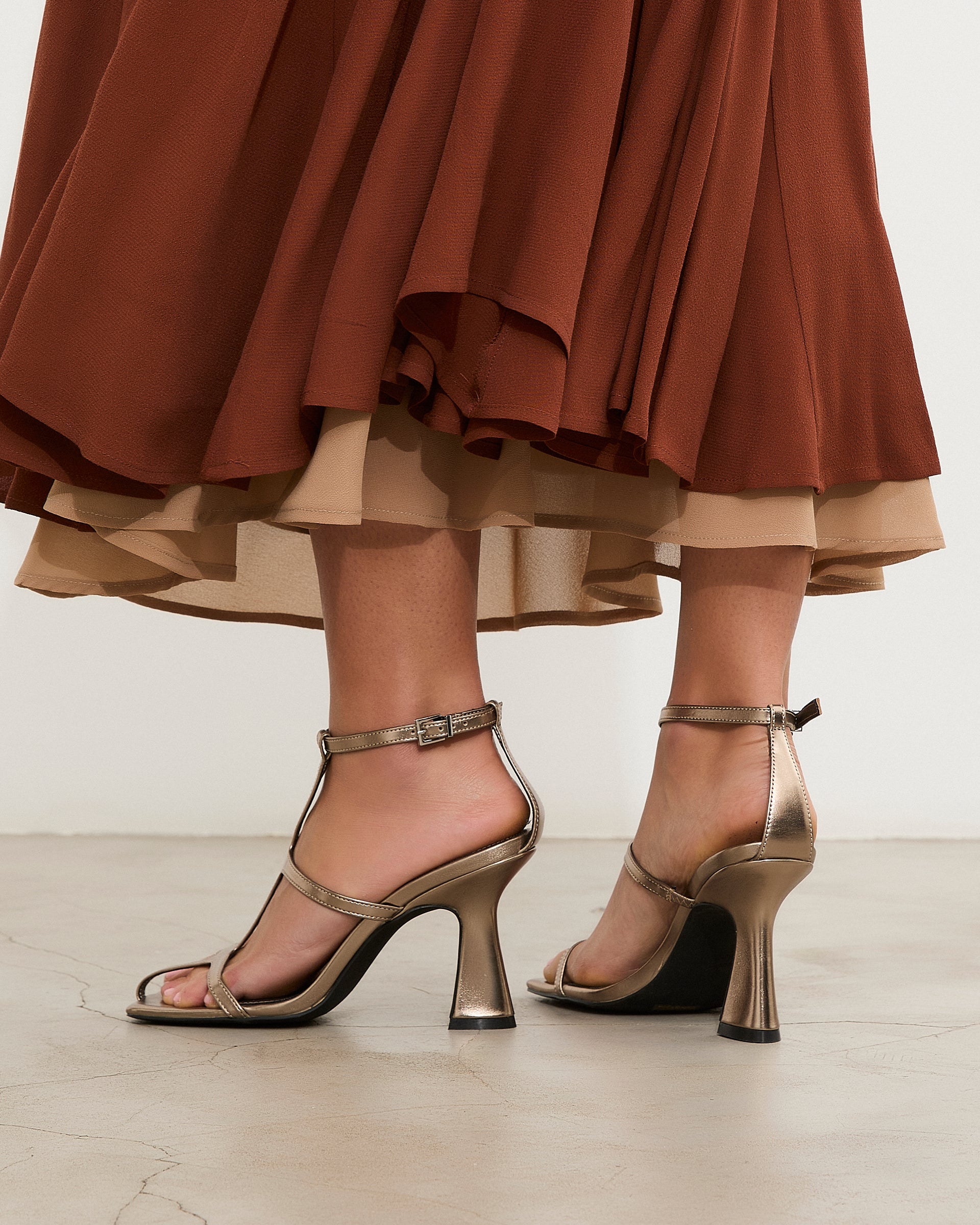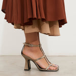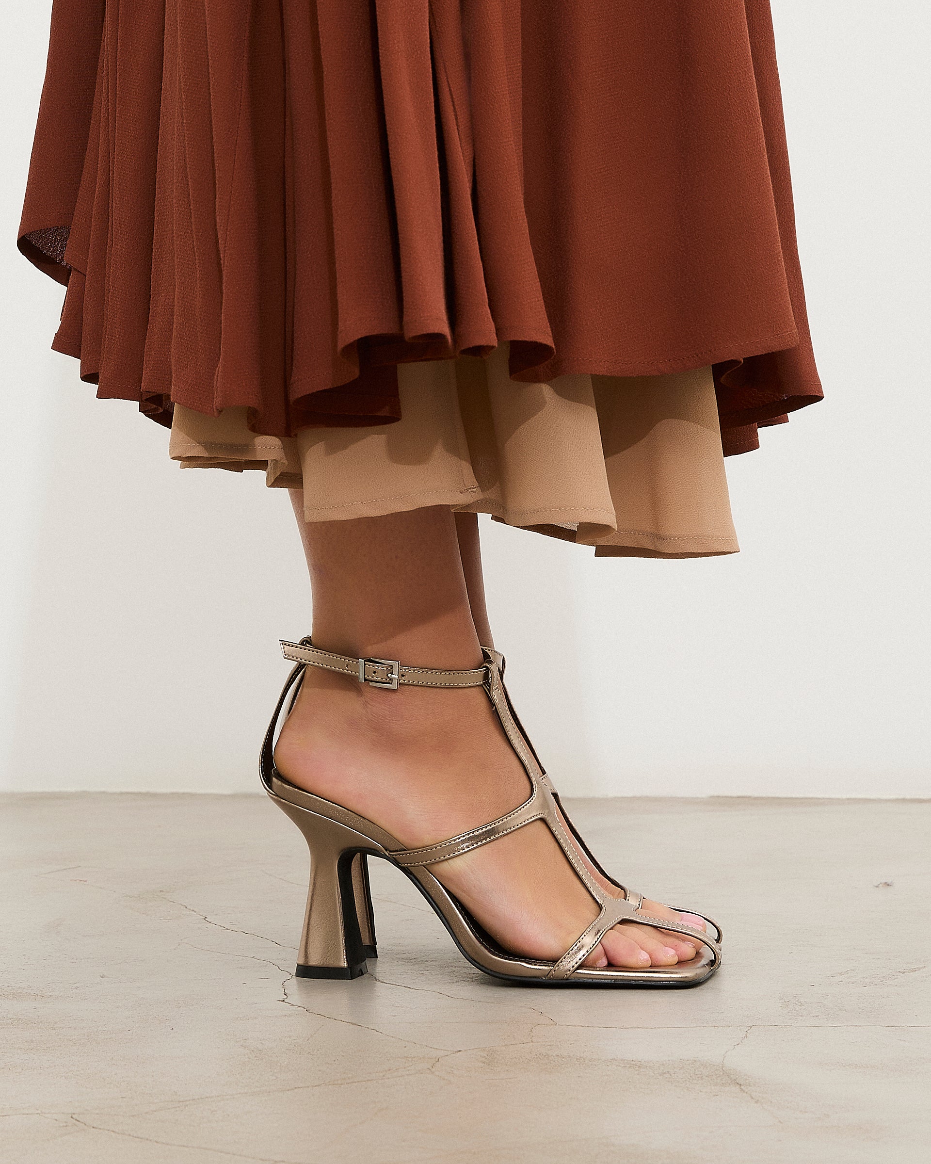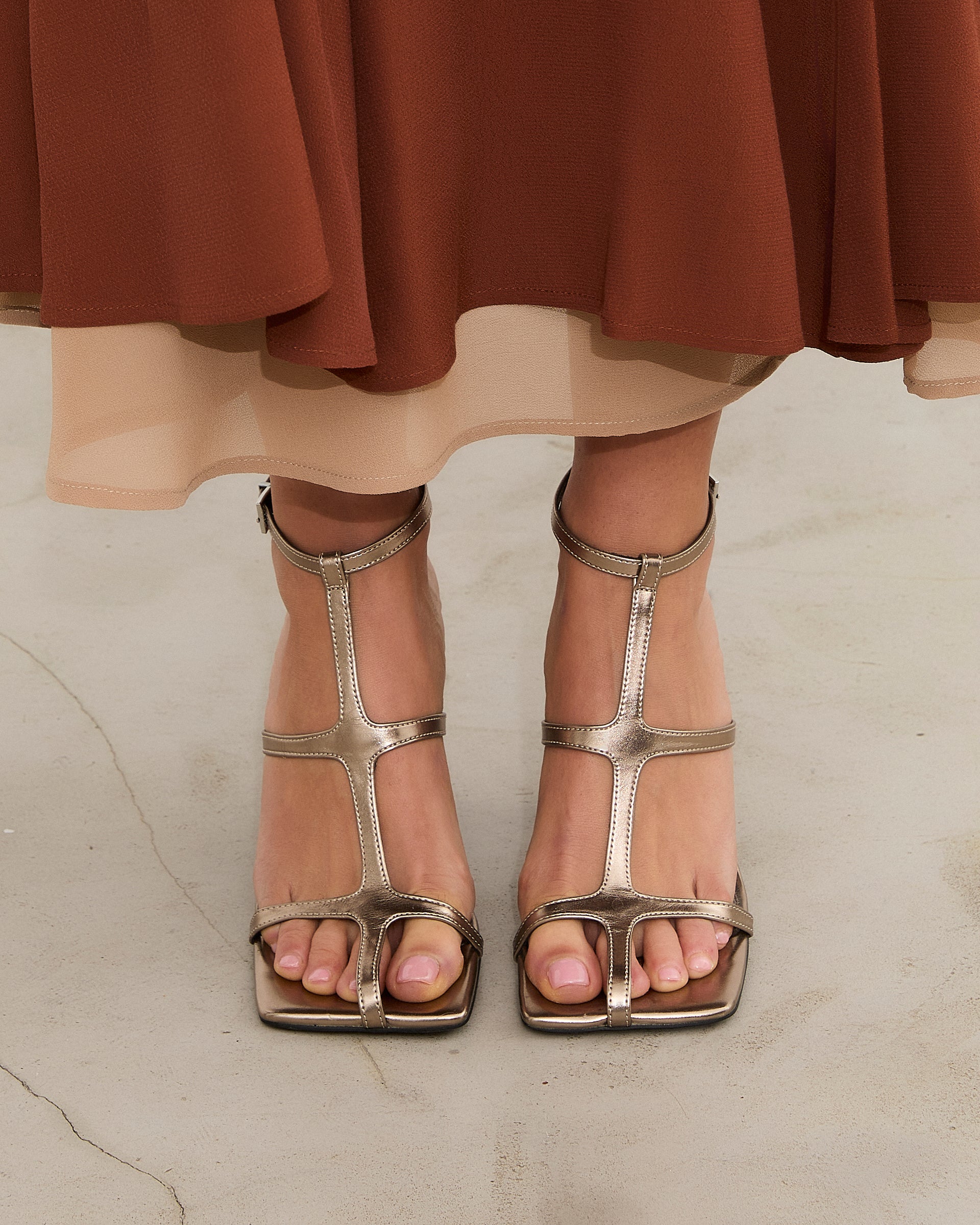 Metallic color heeled sandal with square toe. Composition of Roman-style straps with ankle buckle closure. Needle heel with wide base.