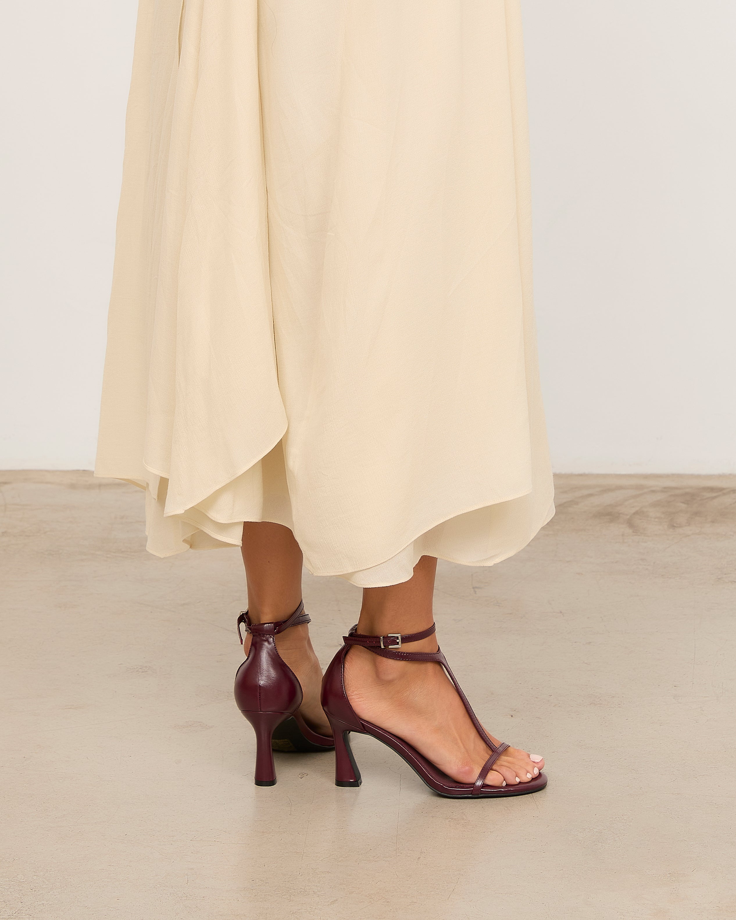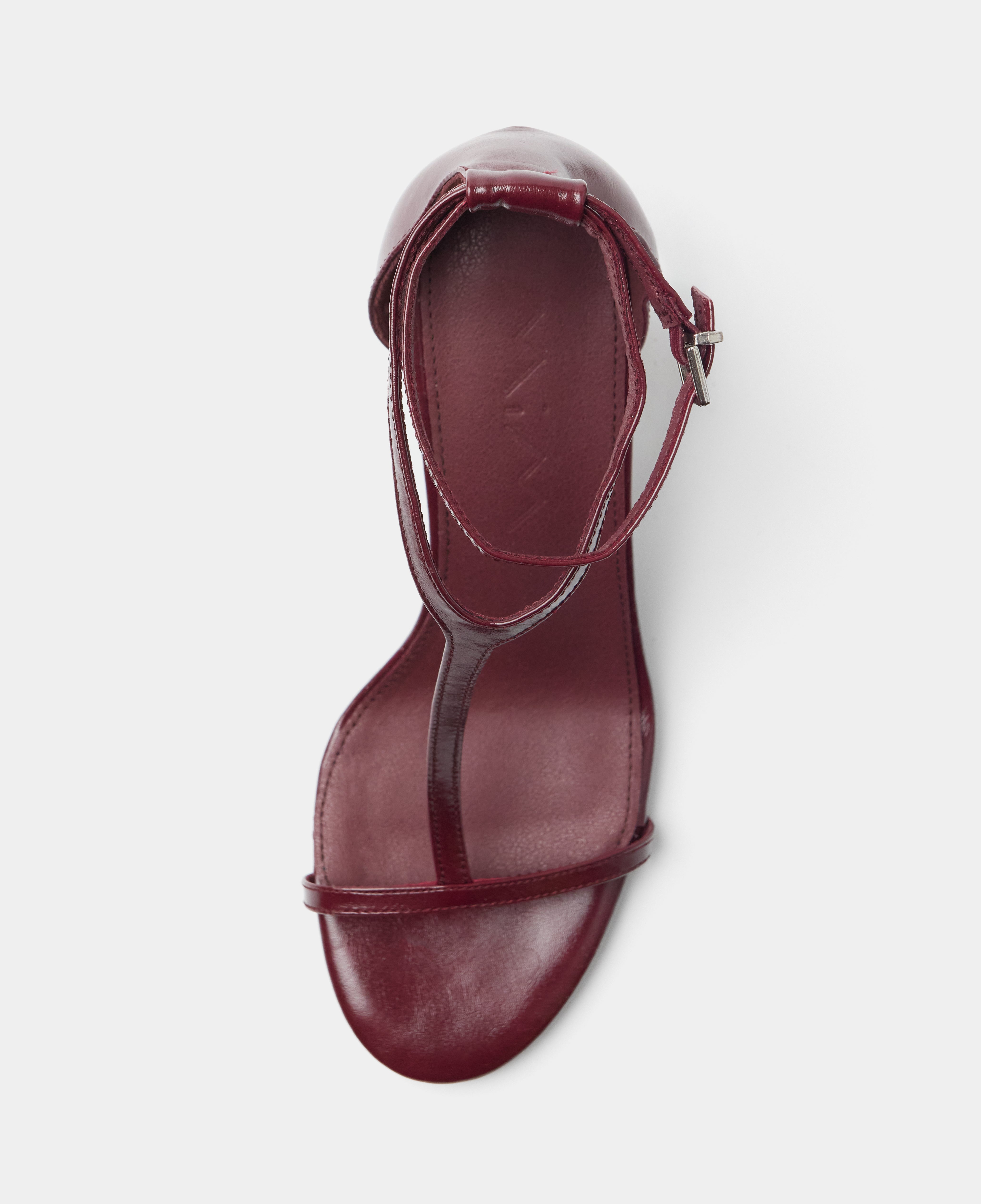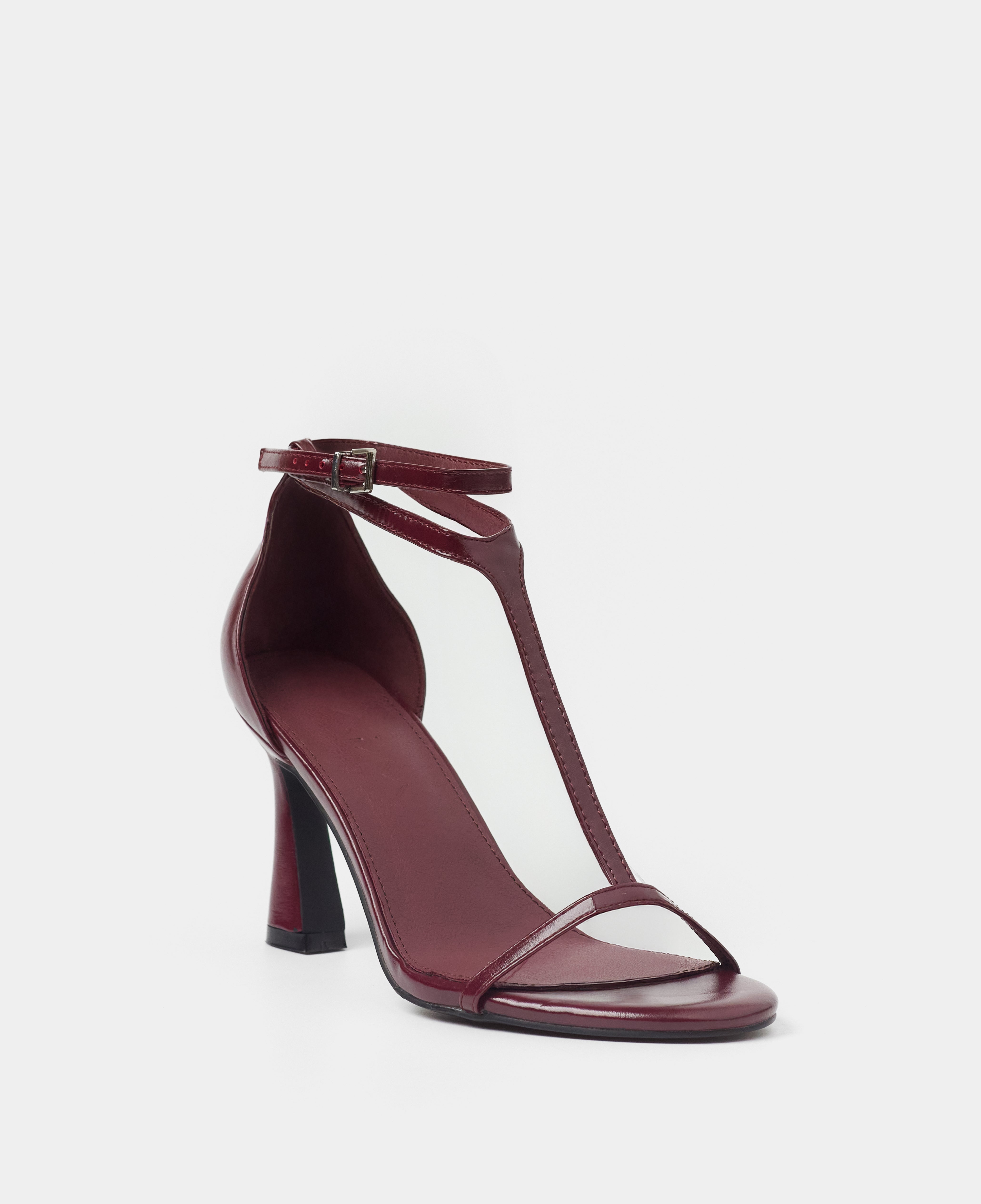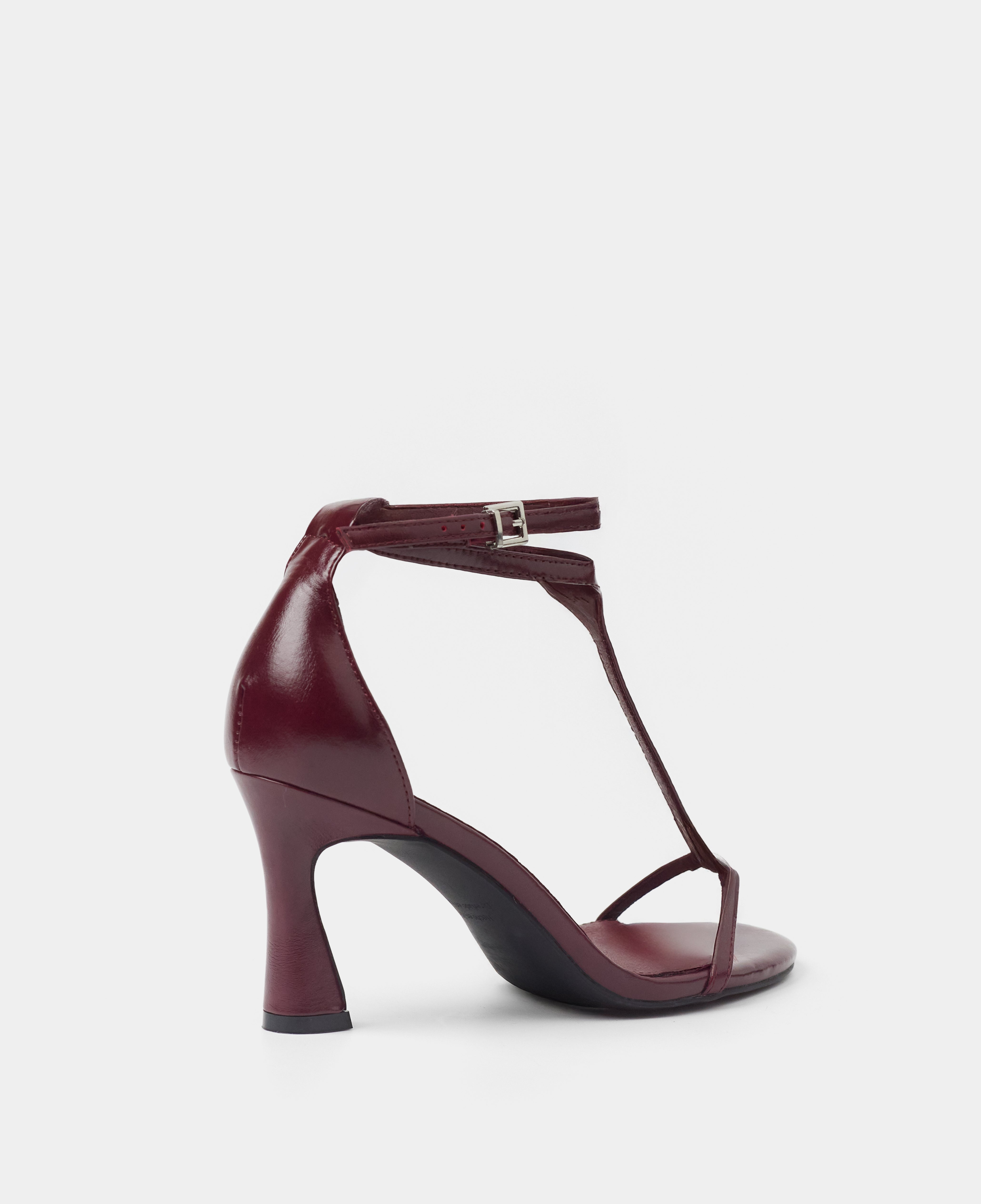 Heeled sandal with a rounded toe in burgundy color. Front with a T-strap design. Back strap with an ankle buckle closure and heel counter. Thin stiletto heel with a wide base.