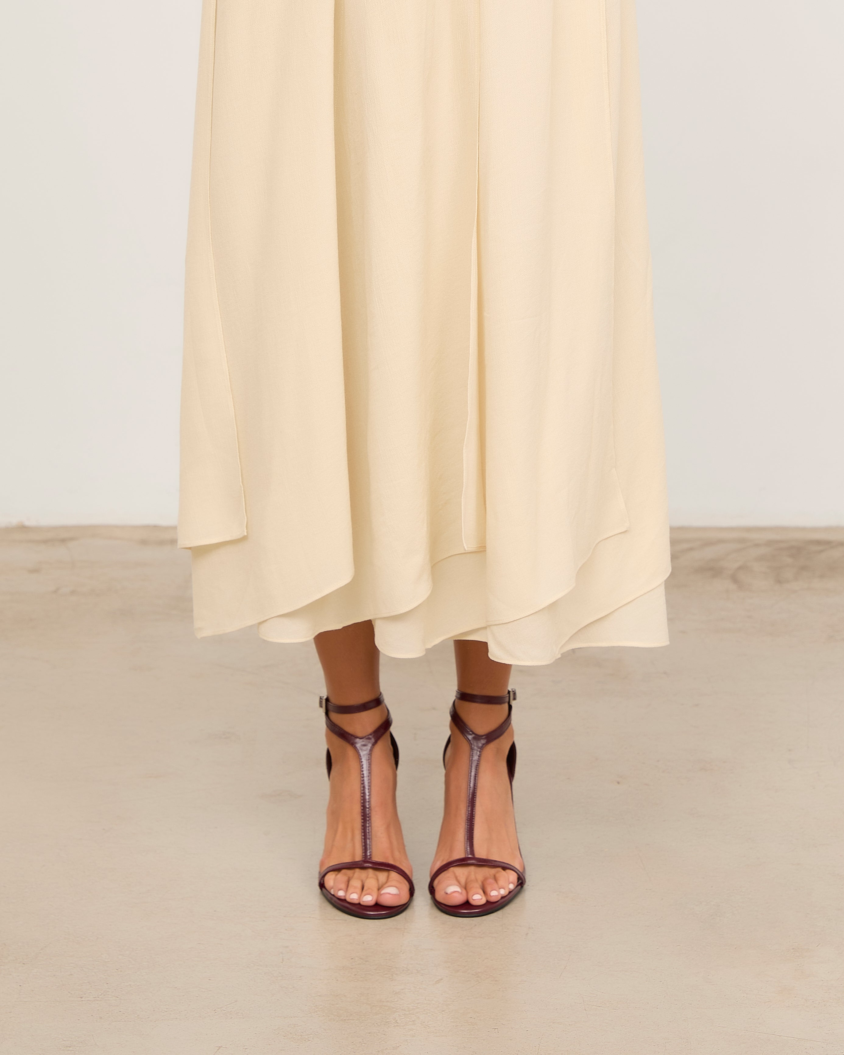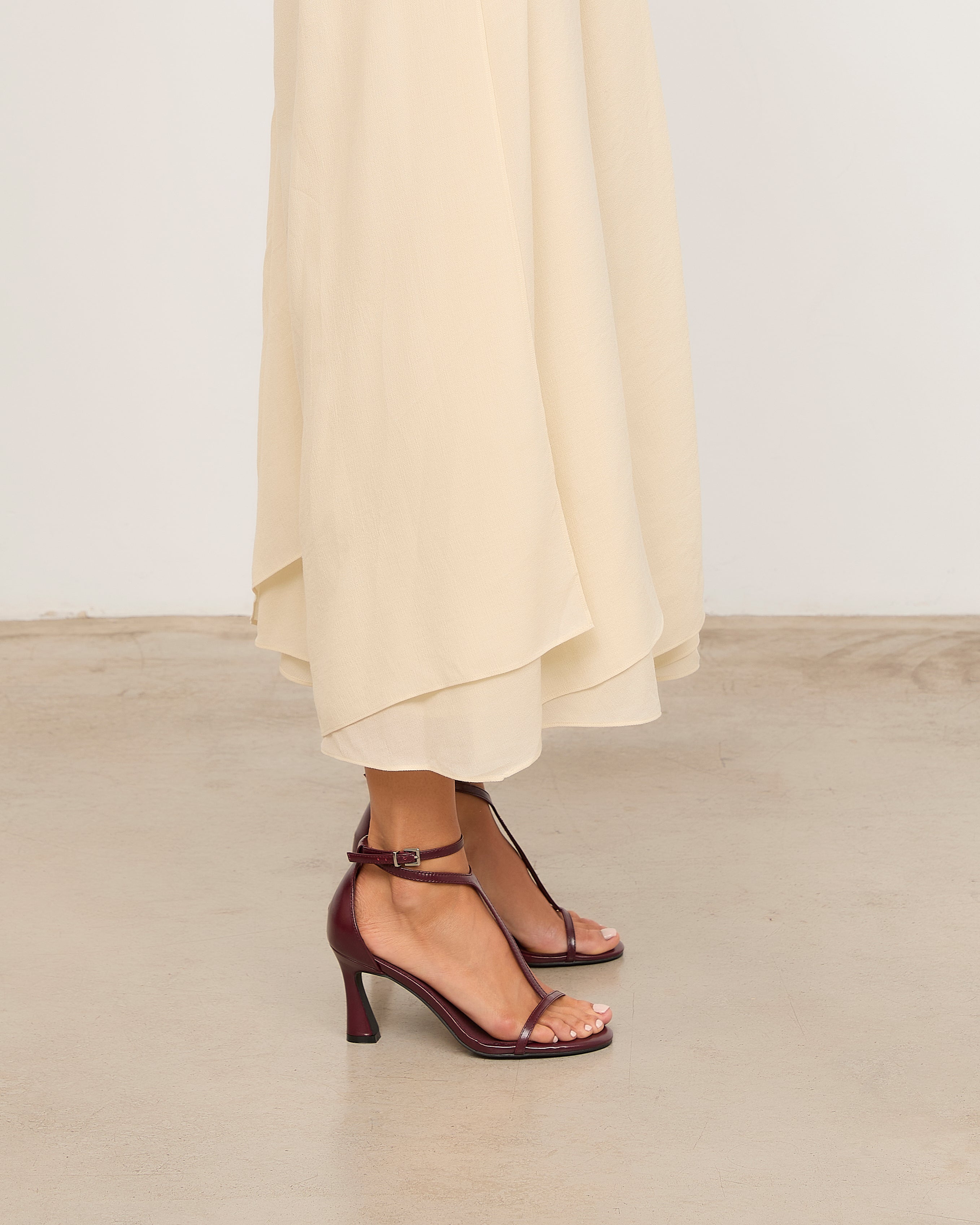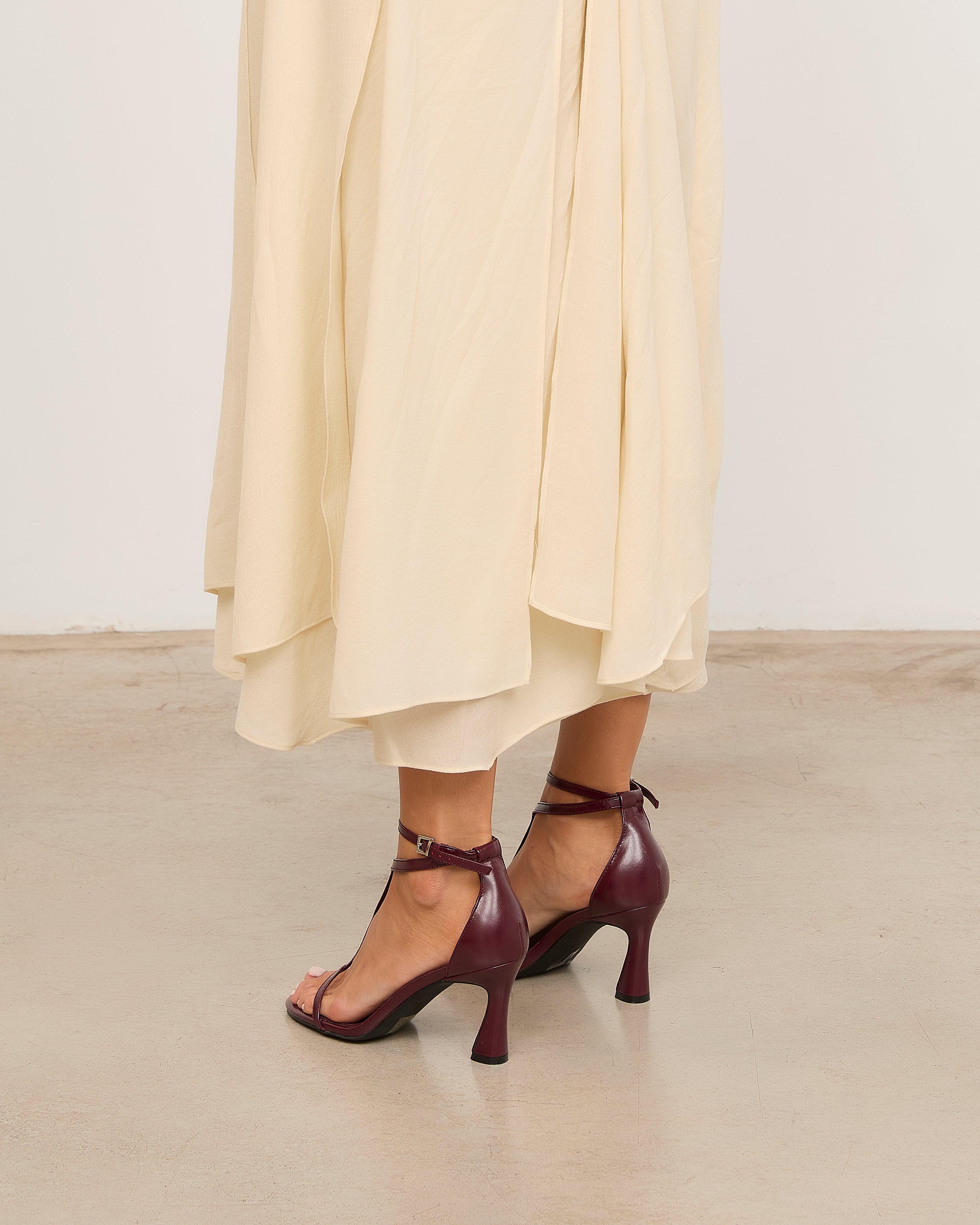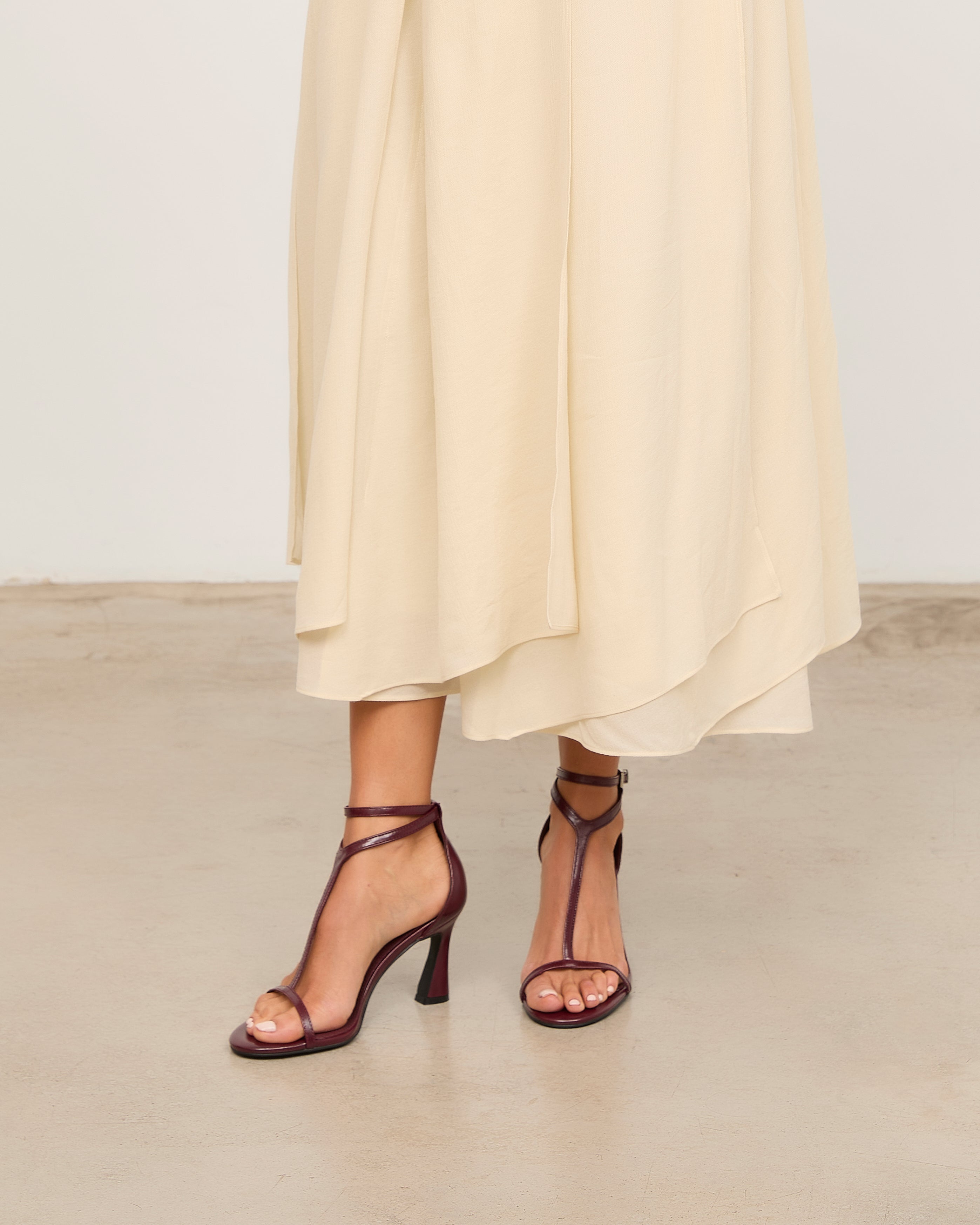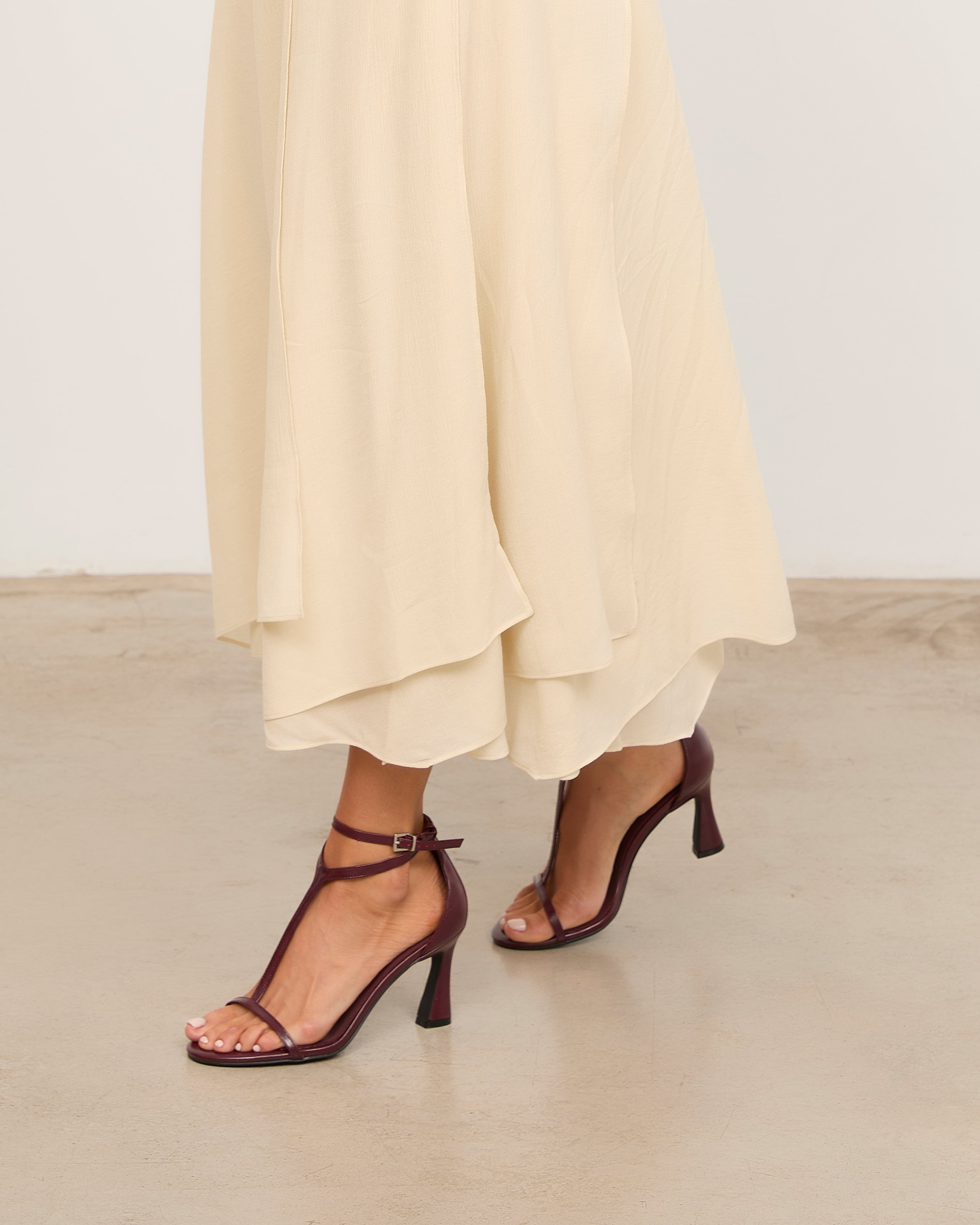 Heeled sandal with a rounded toe in burgundy color. Front with a T-strap design. Back strap with an ankle buckle closure and heel counter. Thin stiletto heel with a wide base.