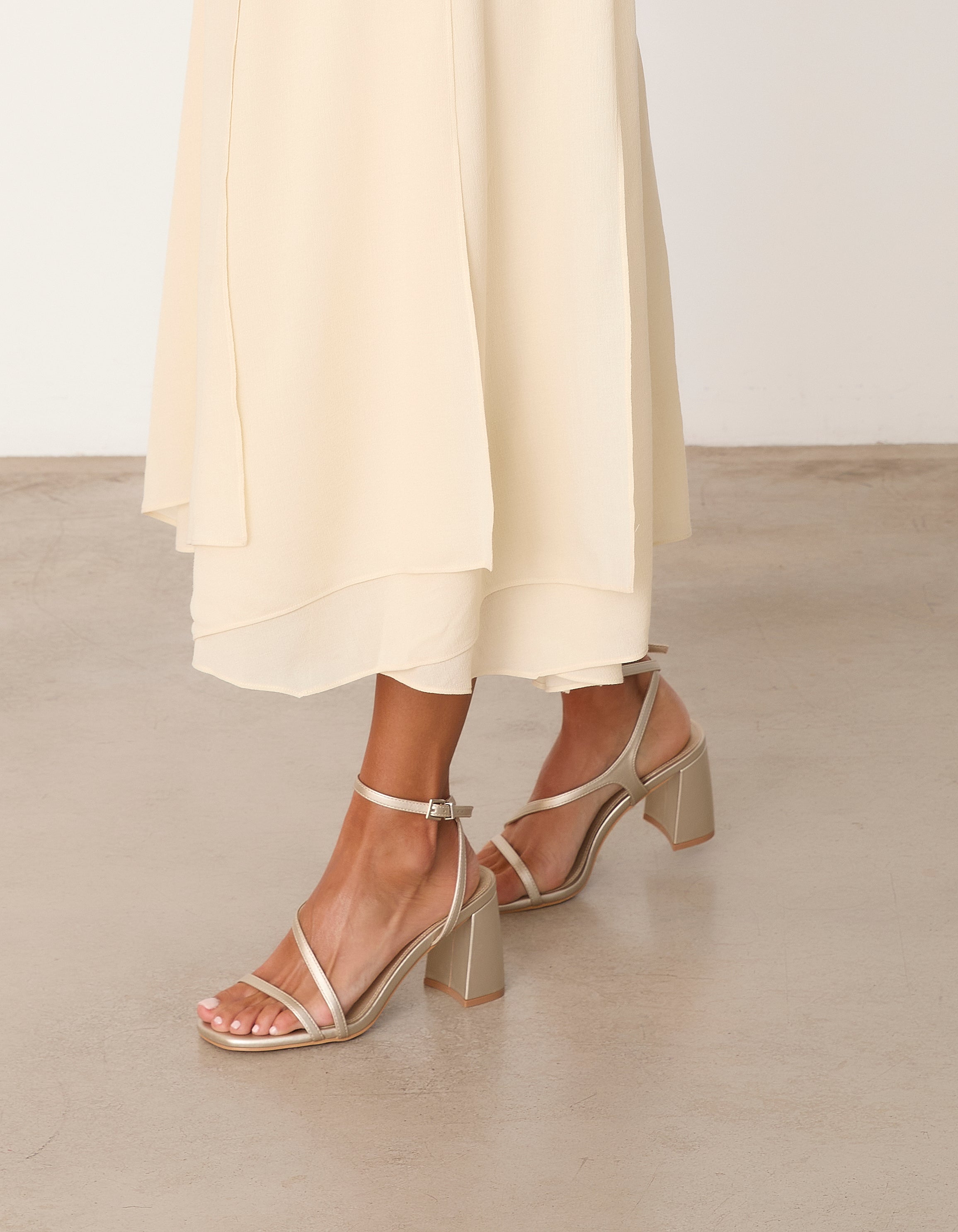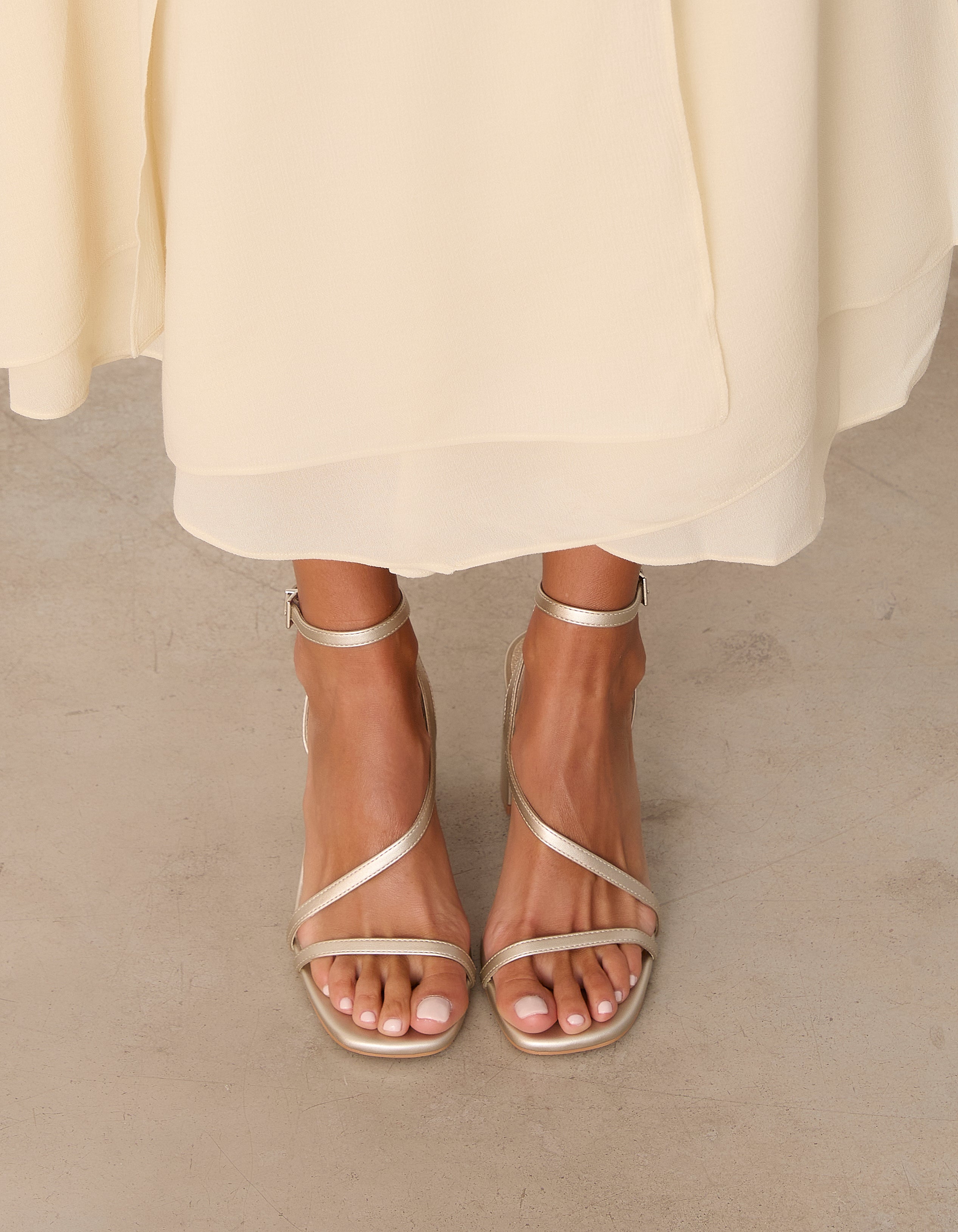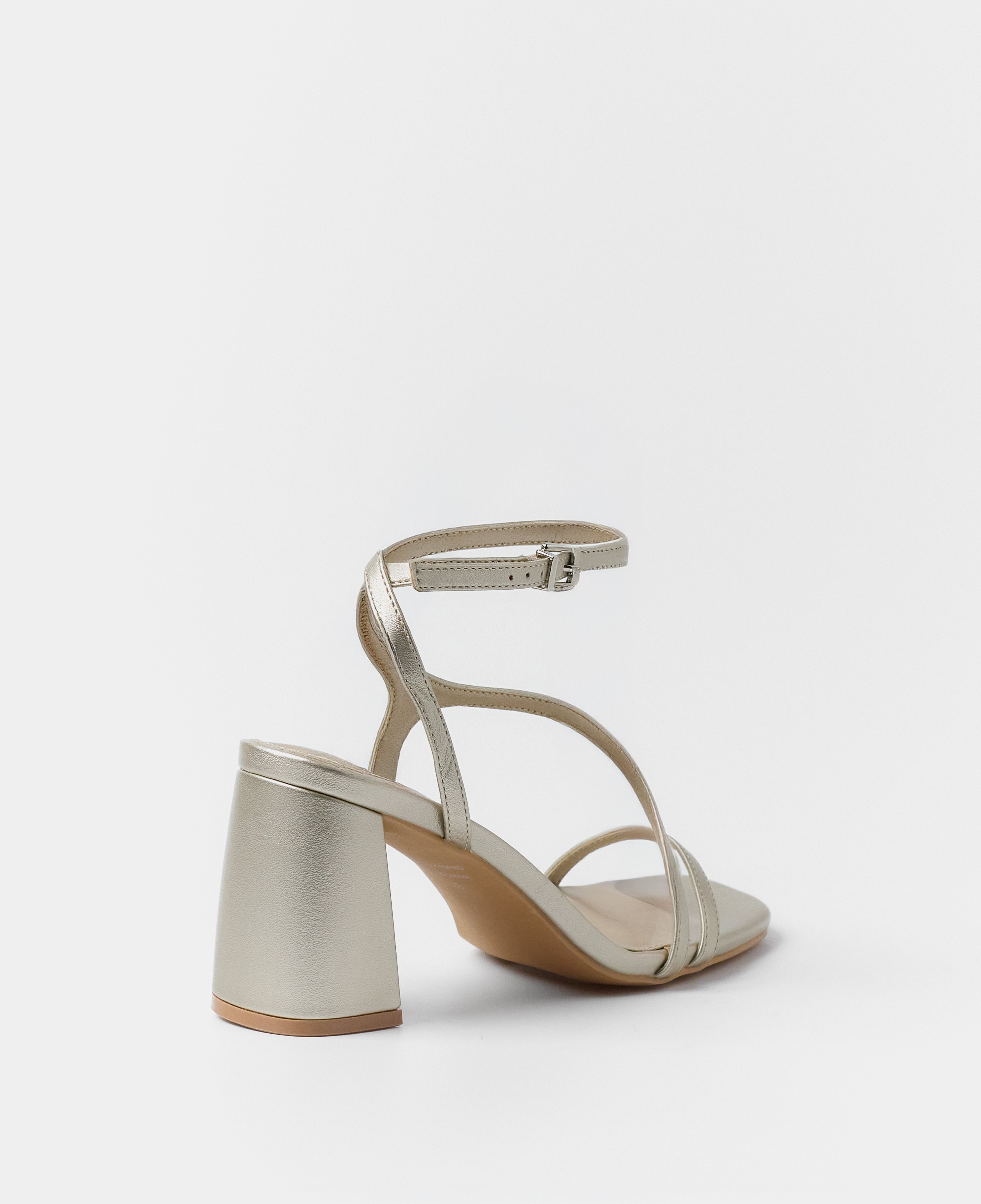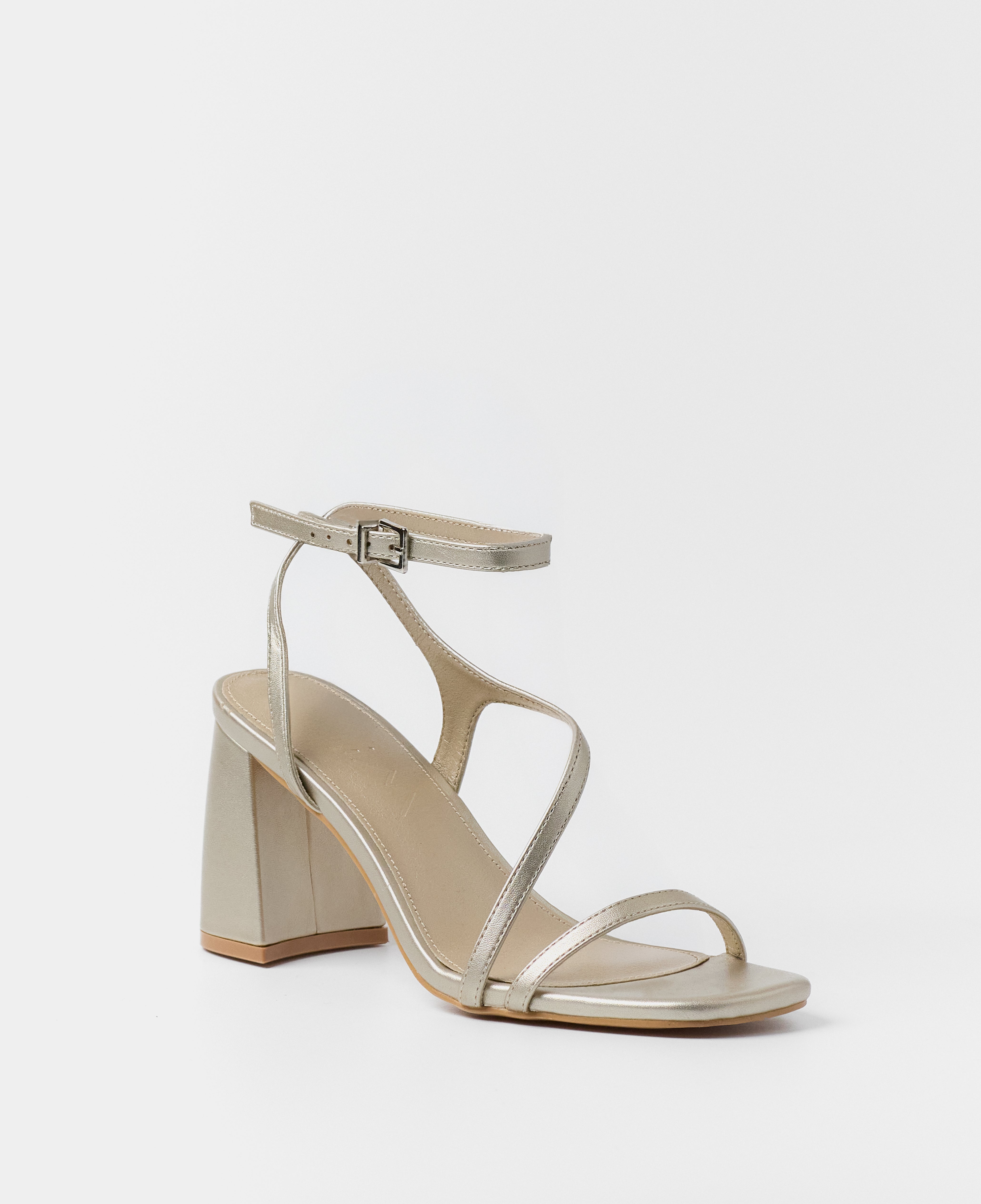 Heeled sandal with a geometric toe in champagne color. Double front strap crossing from instep to ankle. Ankle strap with closure. Geometric heel.