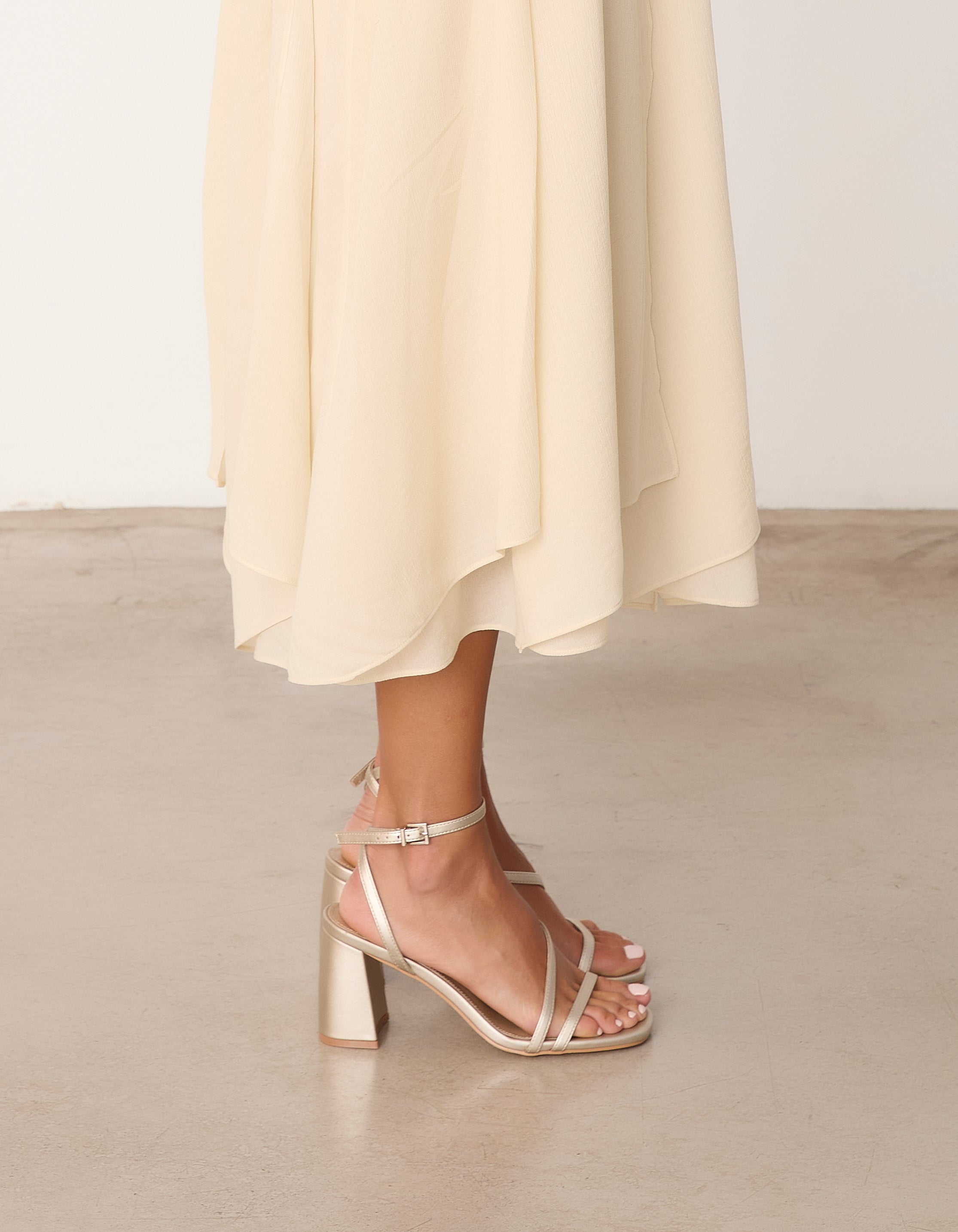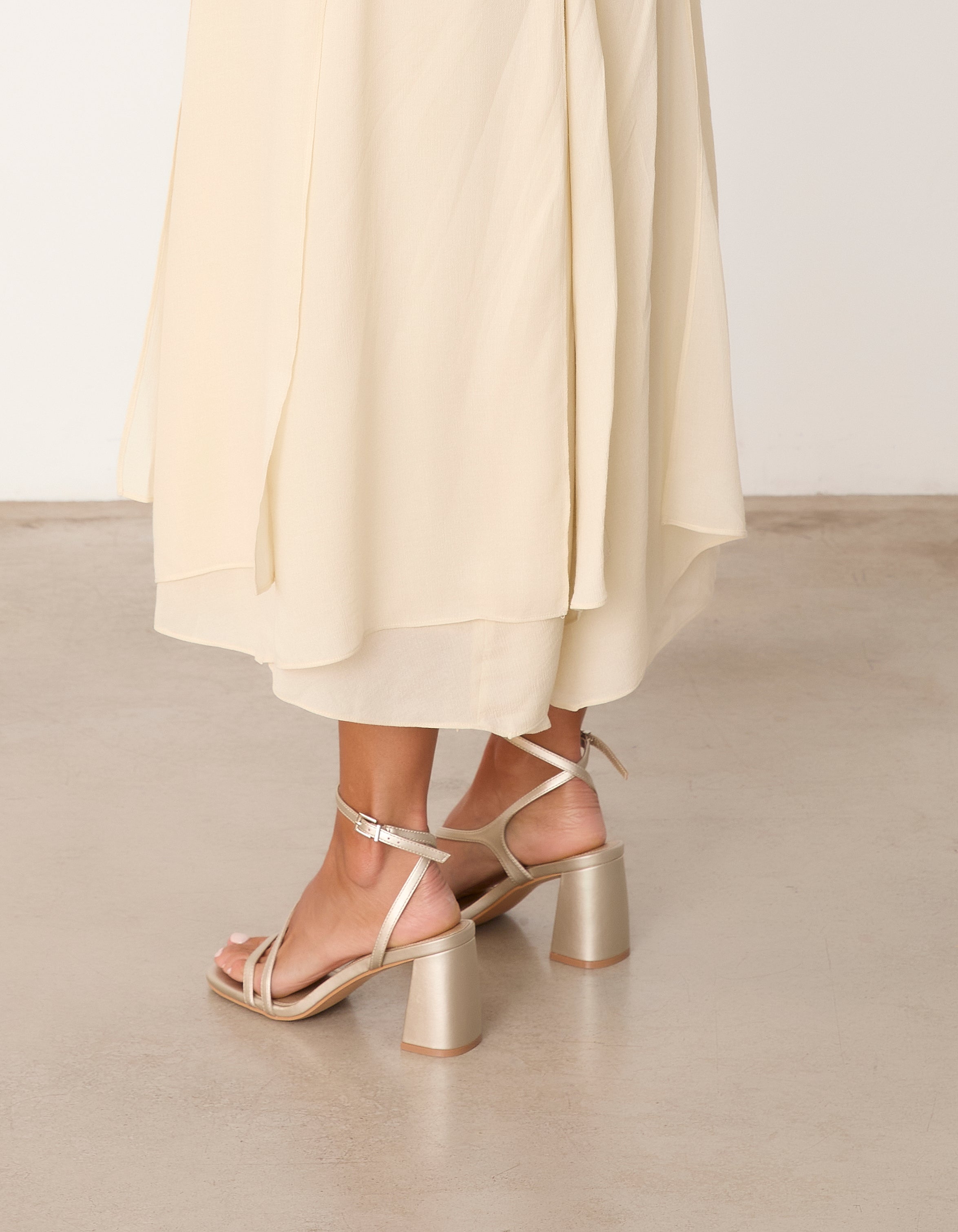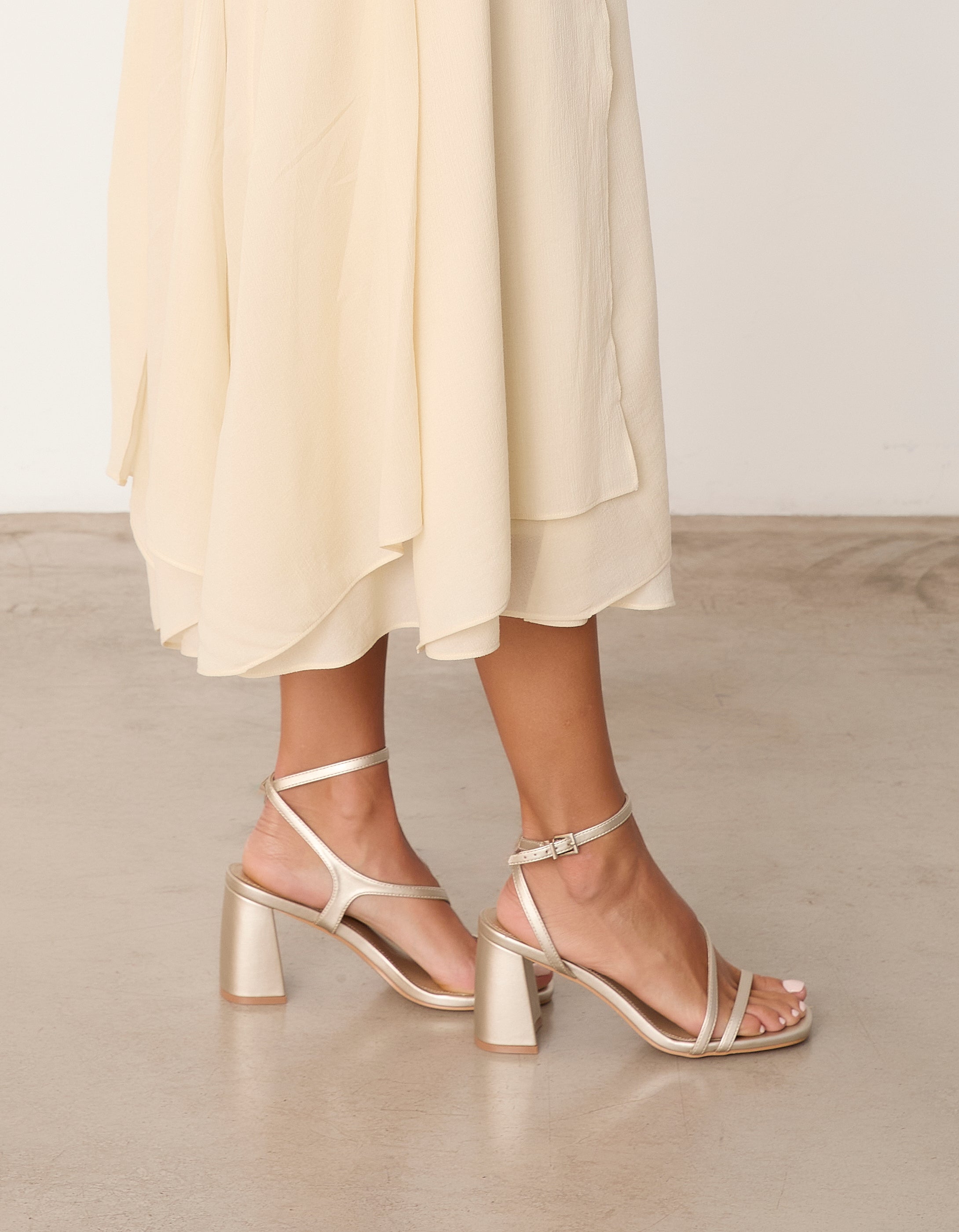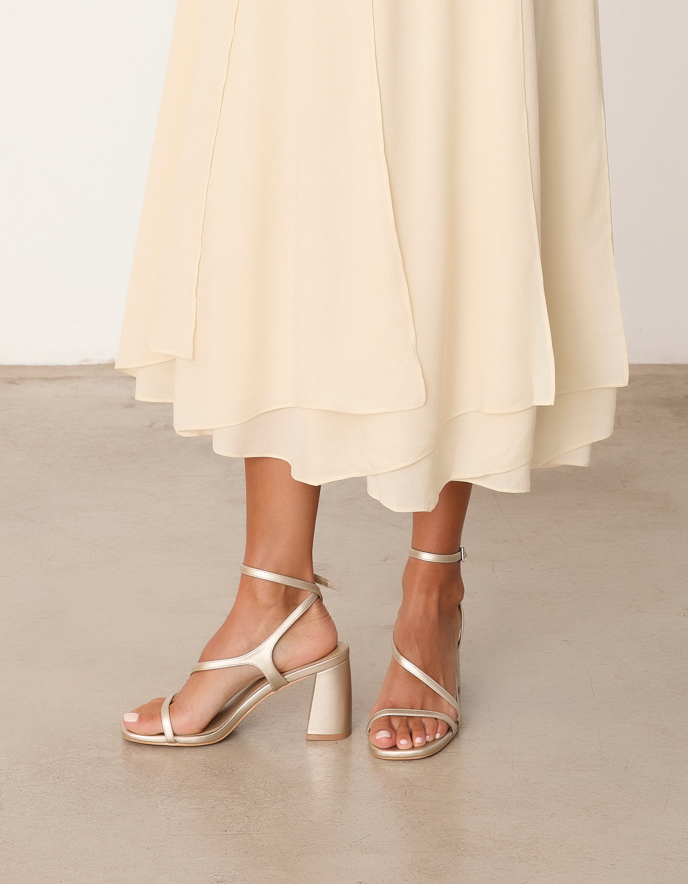Heeled sandal with a geometric toe in champagne color. Double front strap crossing from instep to ankle. Ankle strap with closure. Geometric heel.