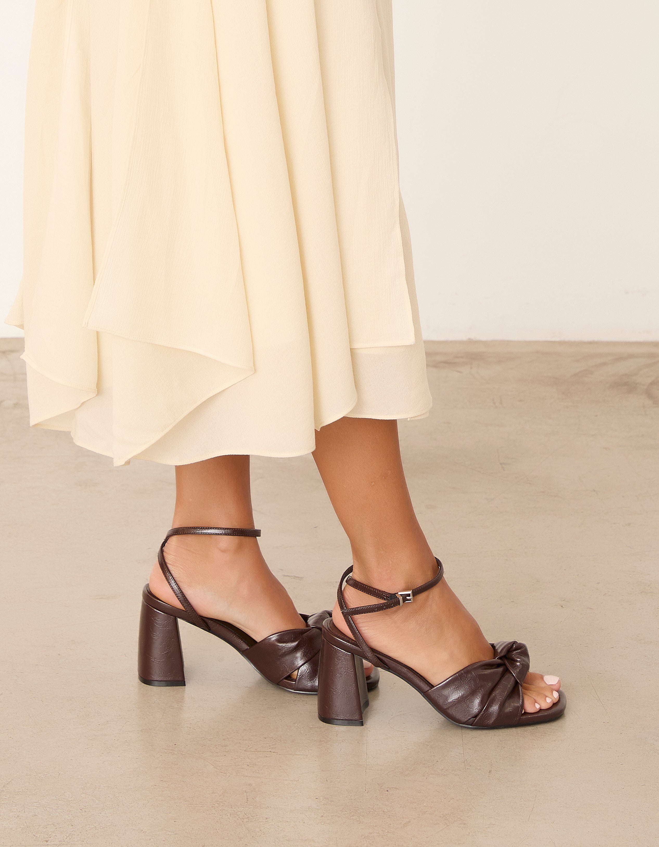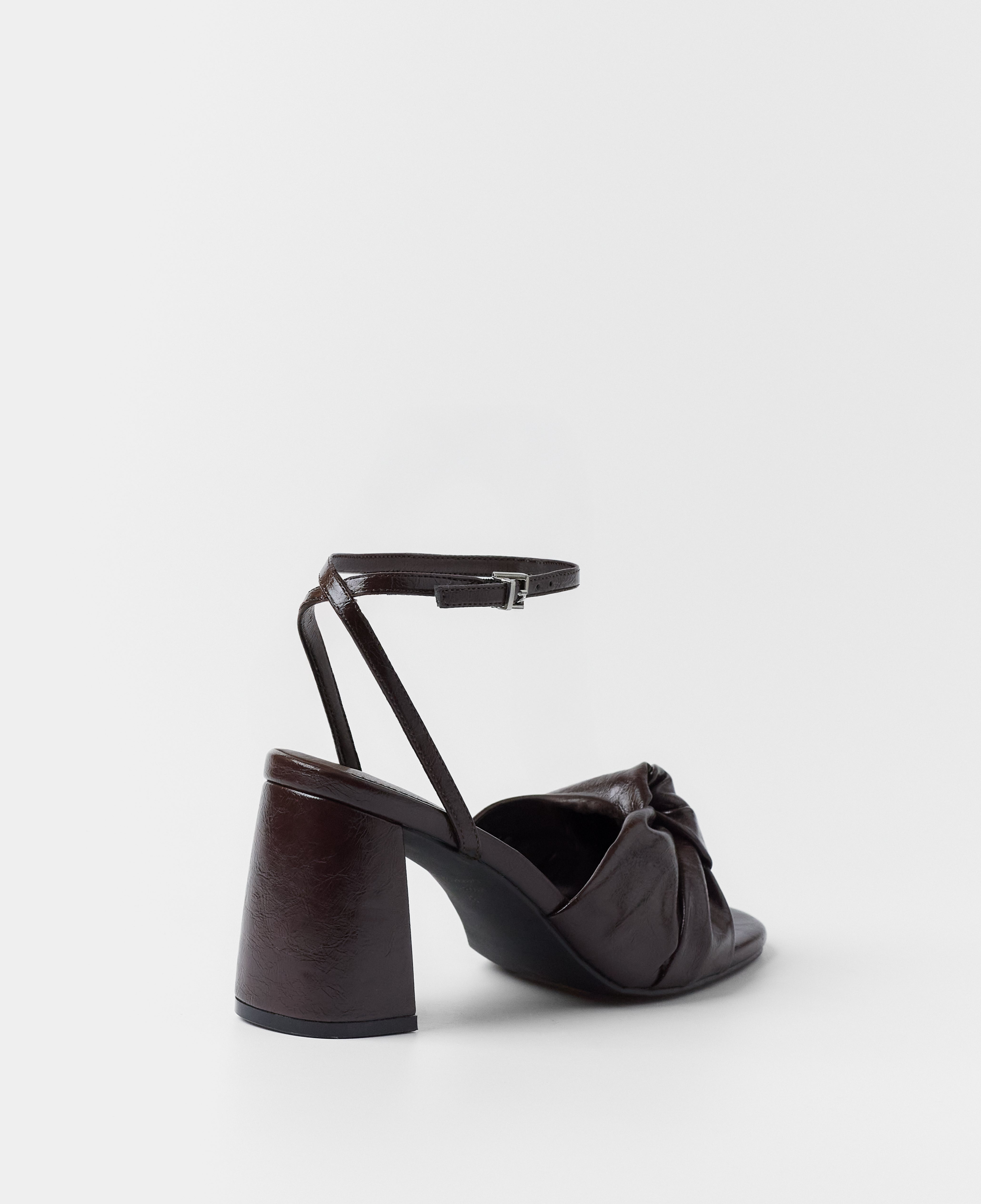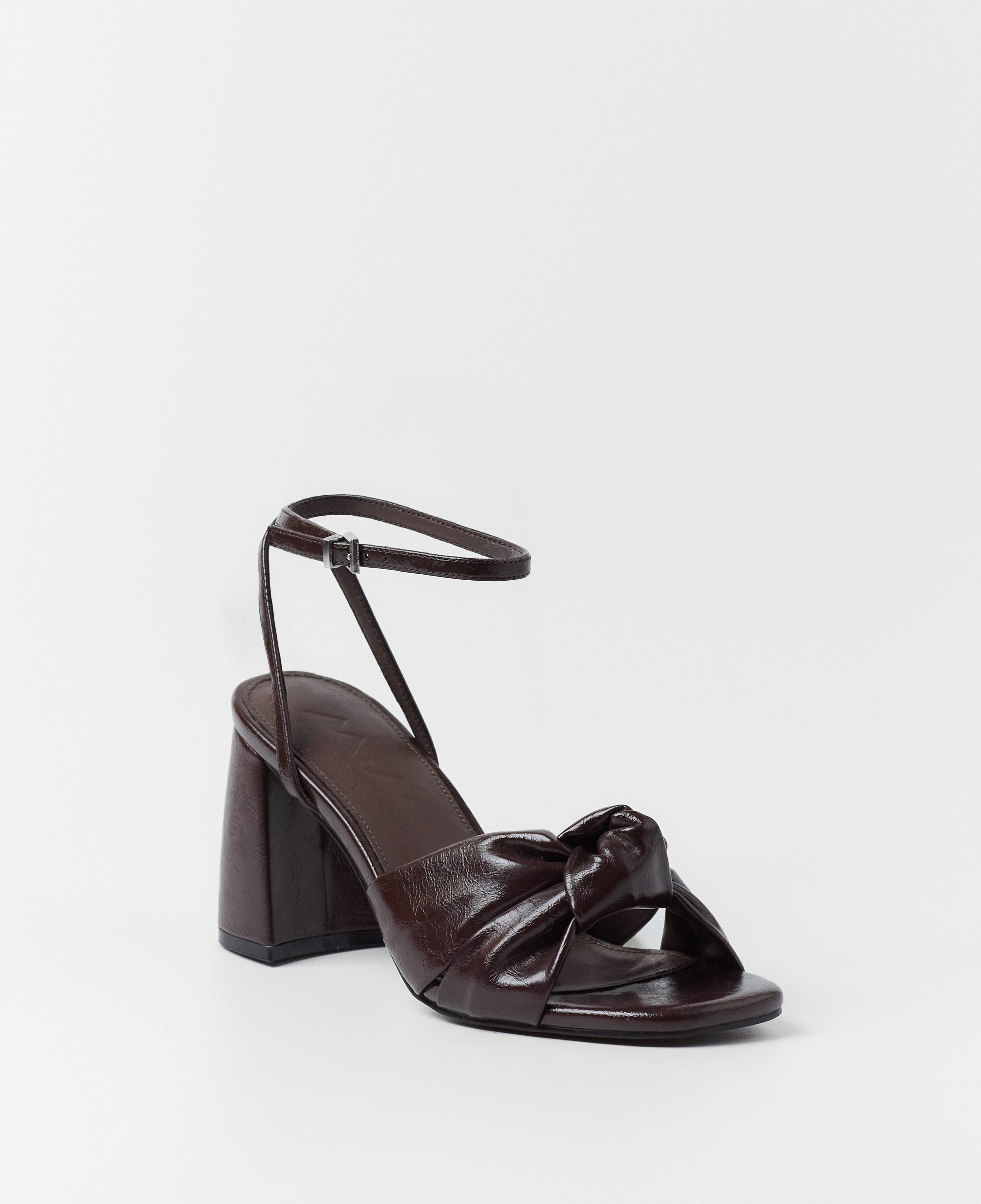 Heeled sandal with a geometric toe in chocolate color. Front with knot detail. Ankle strap closure. Geometric heel.