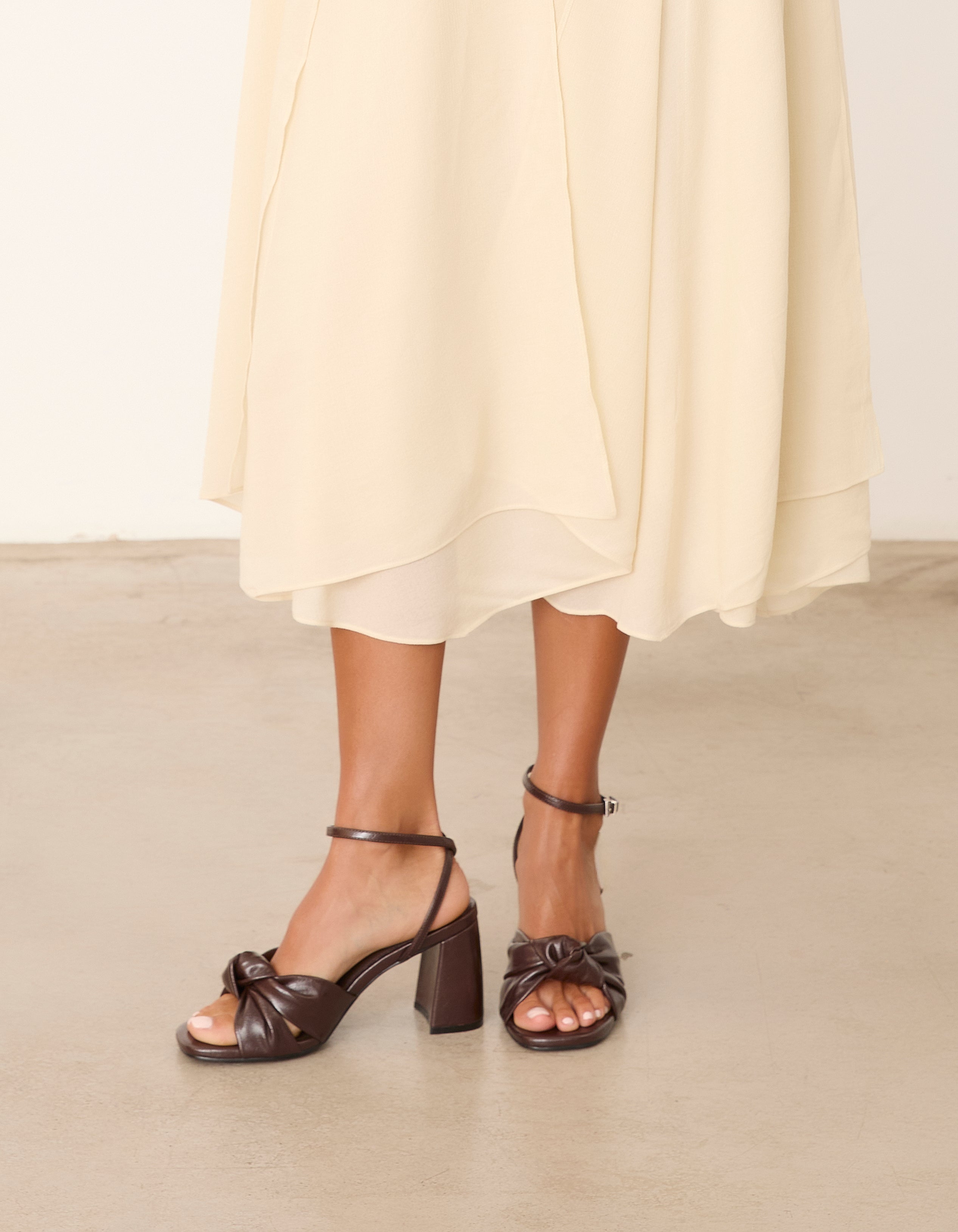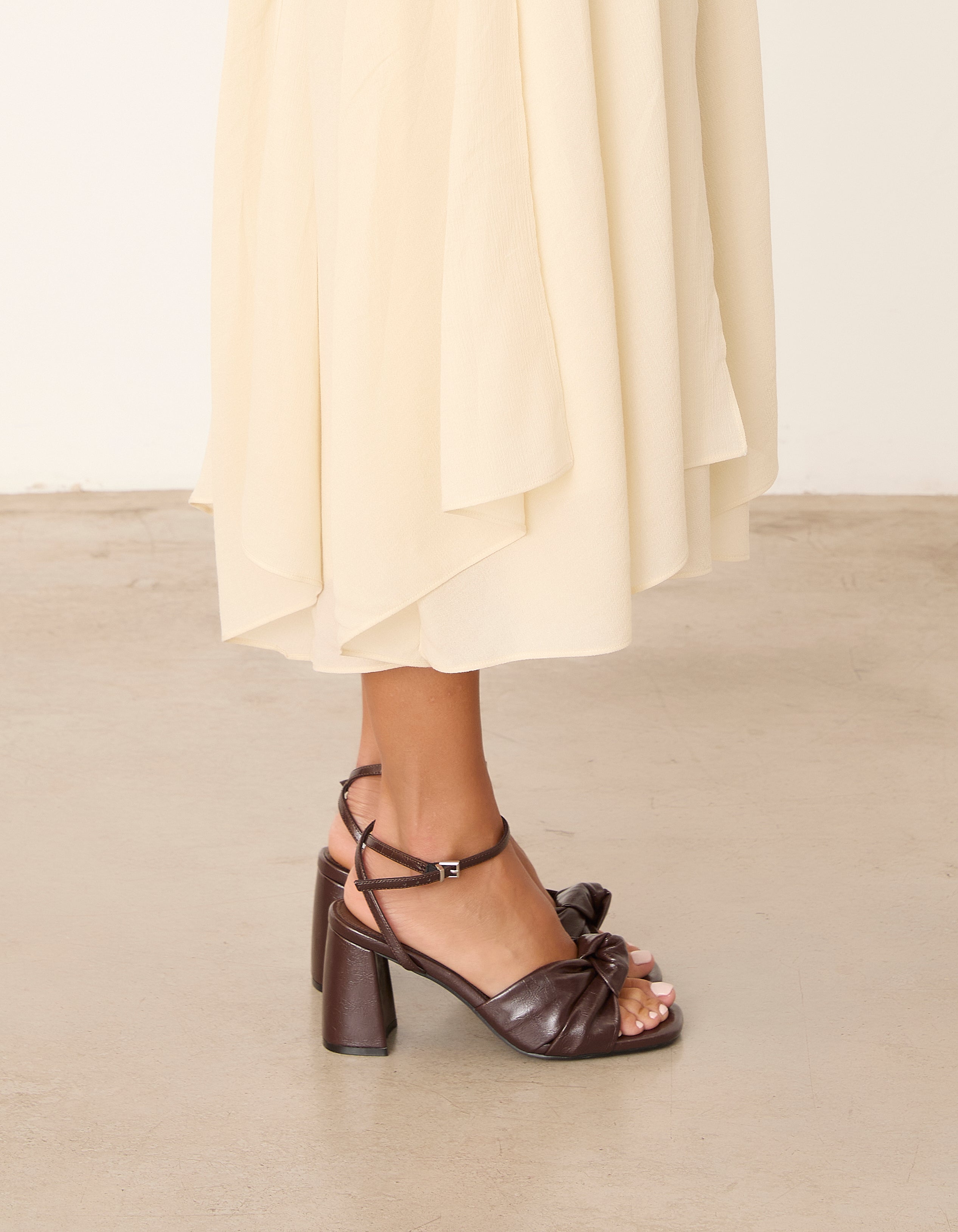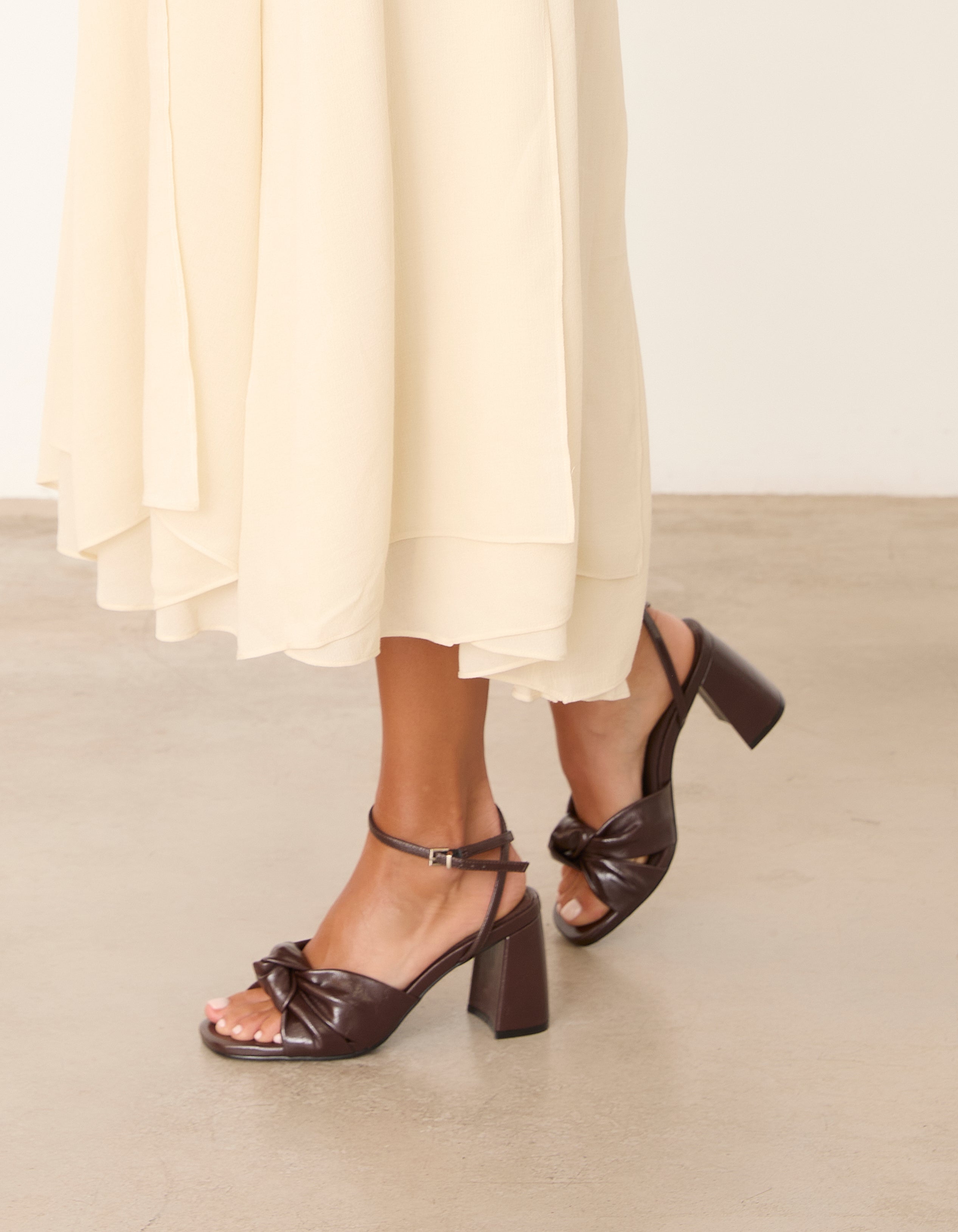 Heeled sandal with a geometric toe in chocolate color. Front with knot detail. Ankle strap closure. Geometric heel.