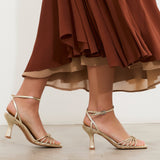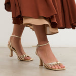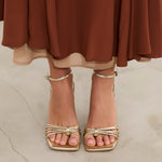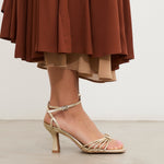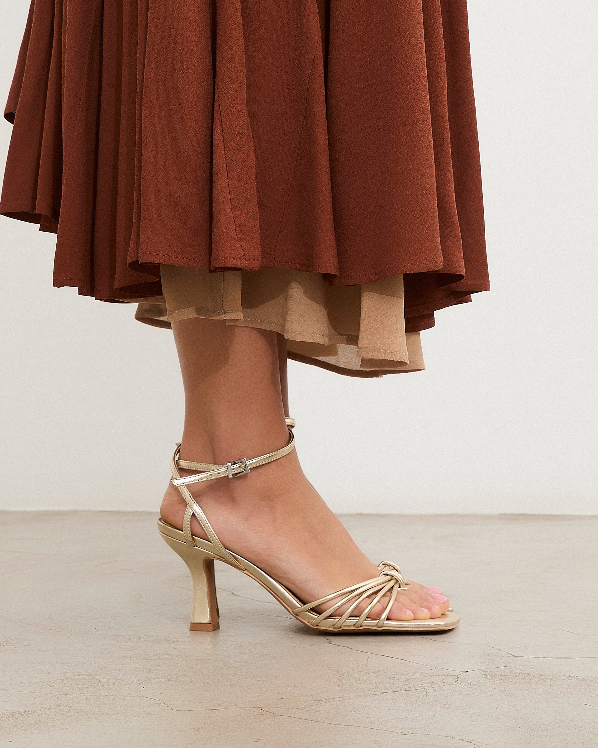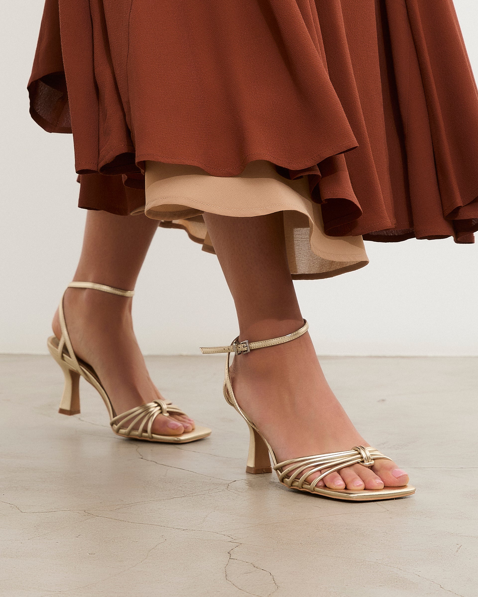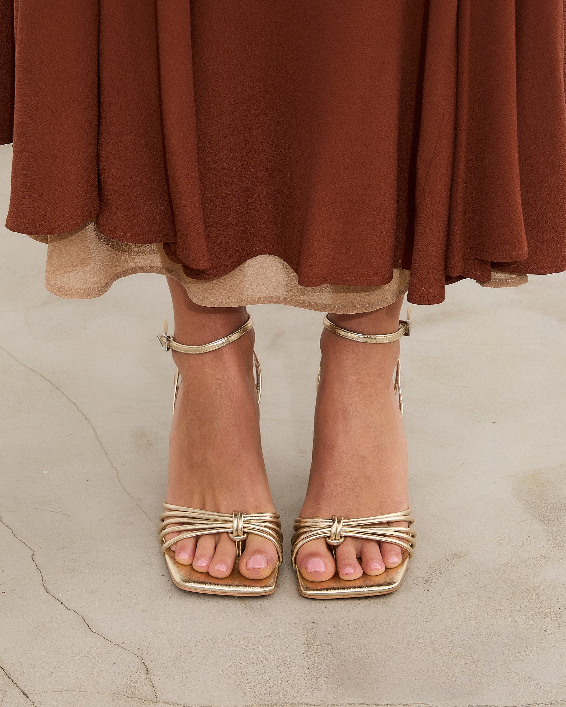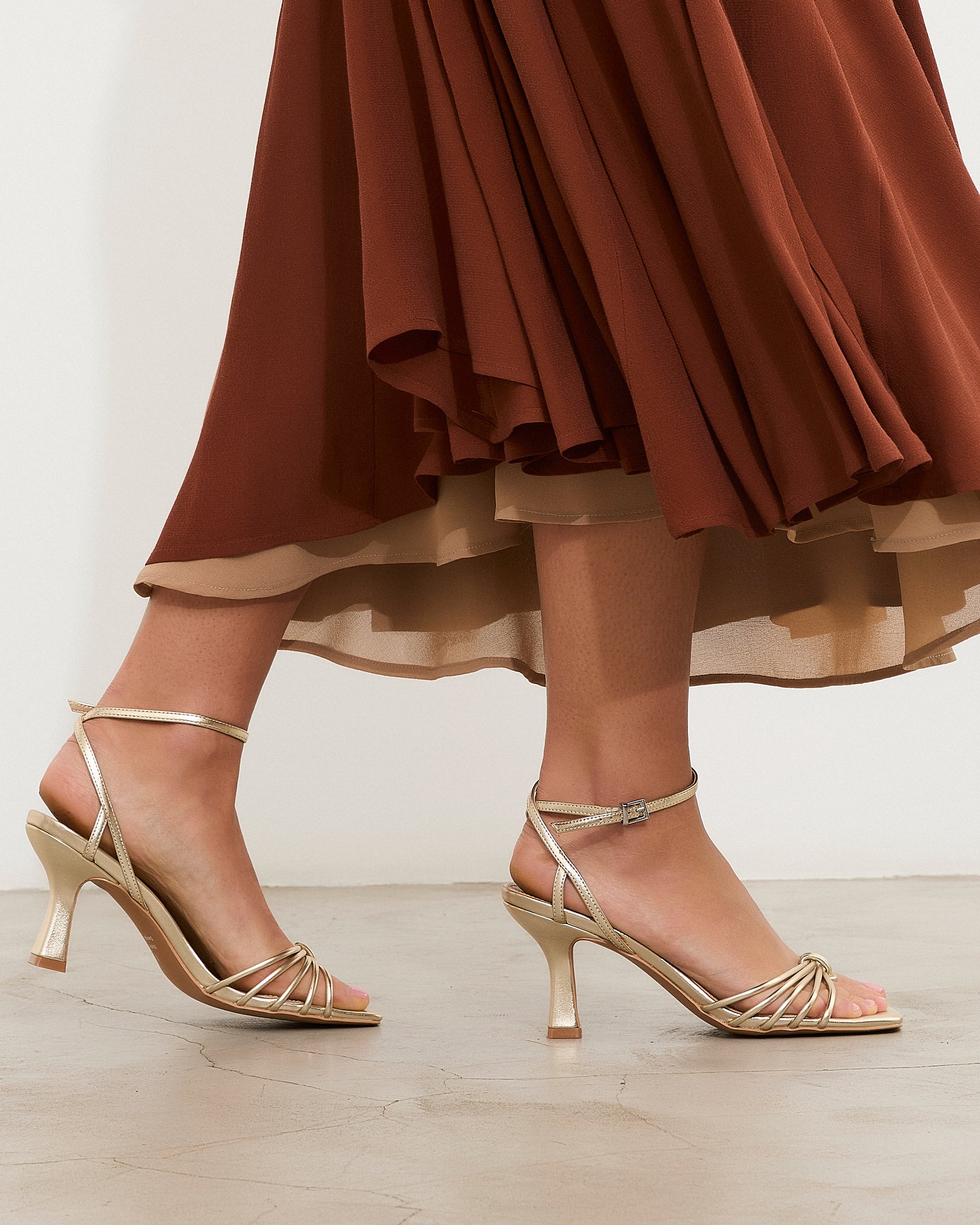 High-heeled sandal with a square toe in gold color. Multiple straps on the front joined with toe support. Back strap for heel support with buckle. Needle-type heel with a wide base.