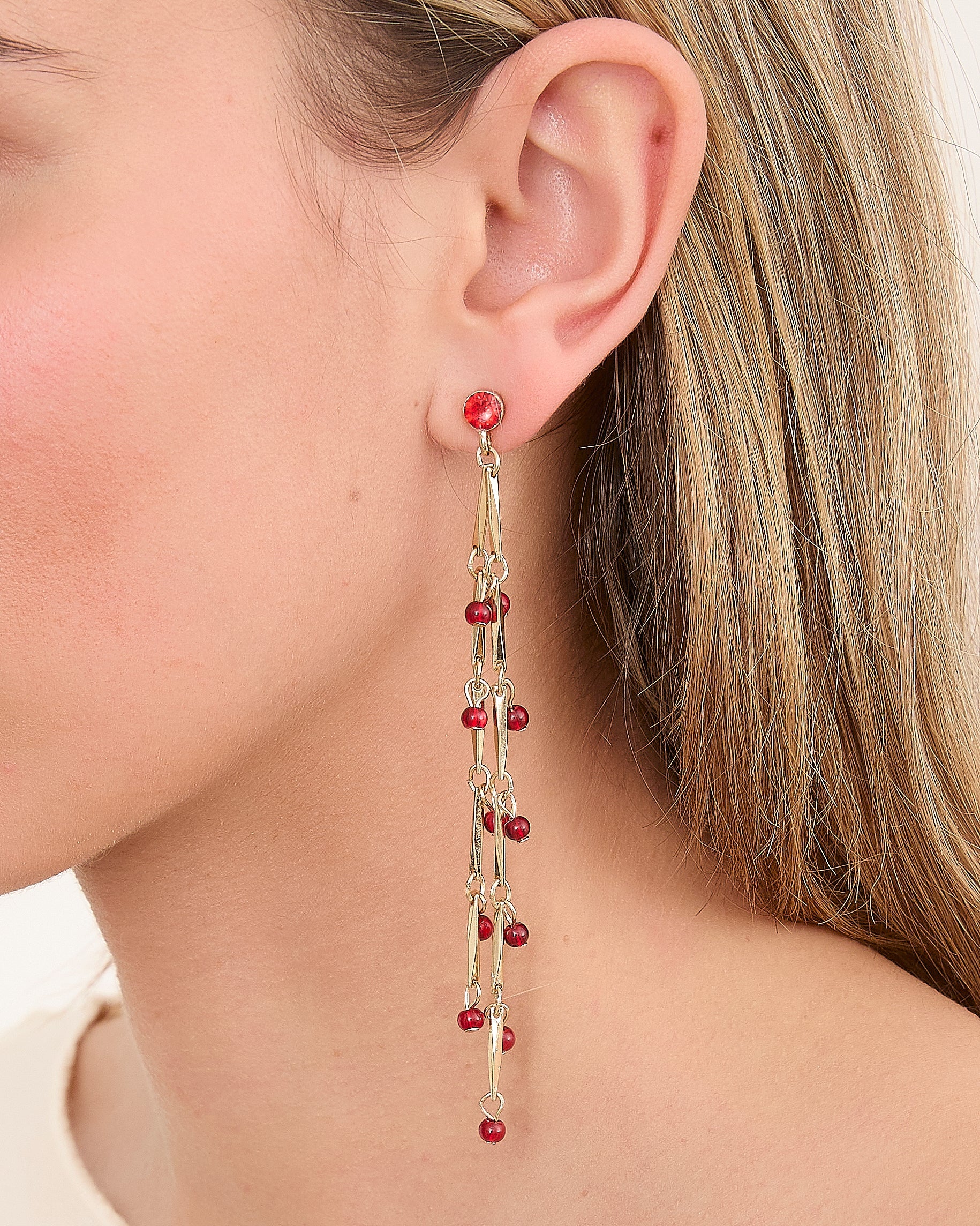 Long teardrop earrings with a gold chain and small burgundy beads.