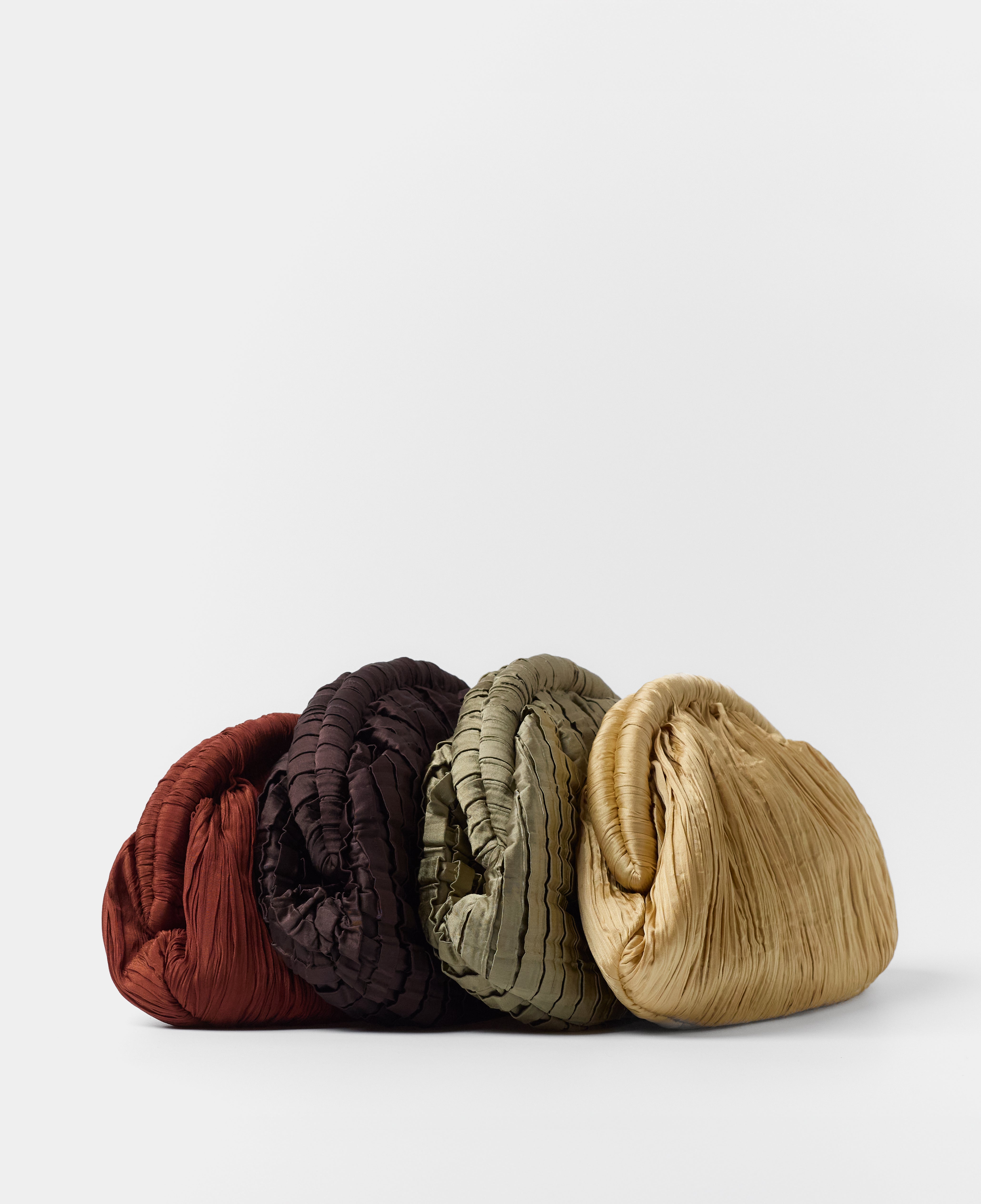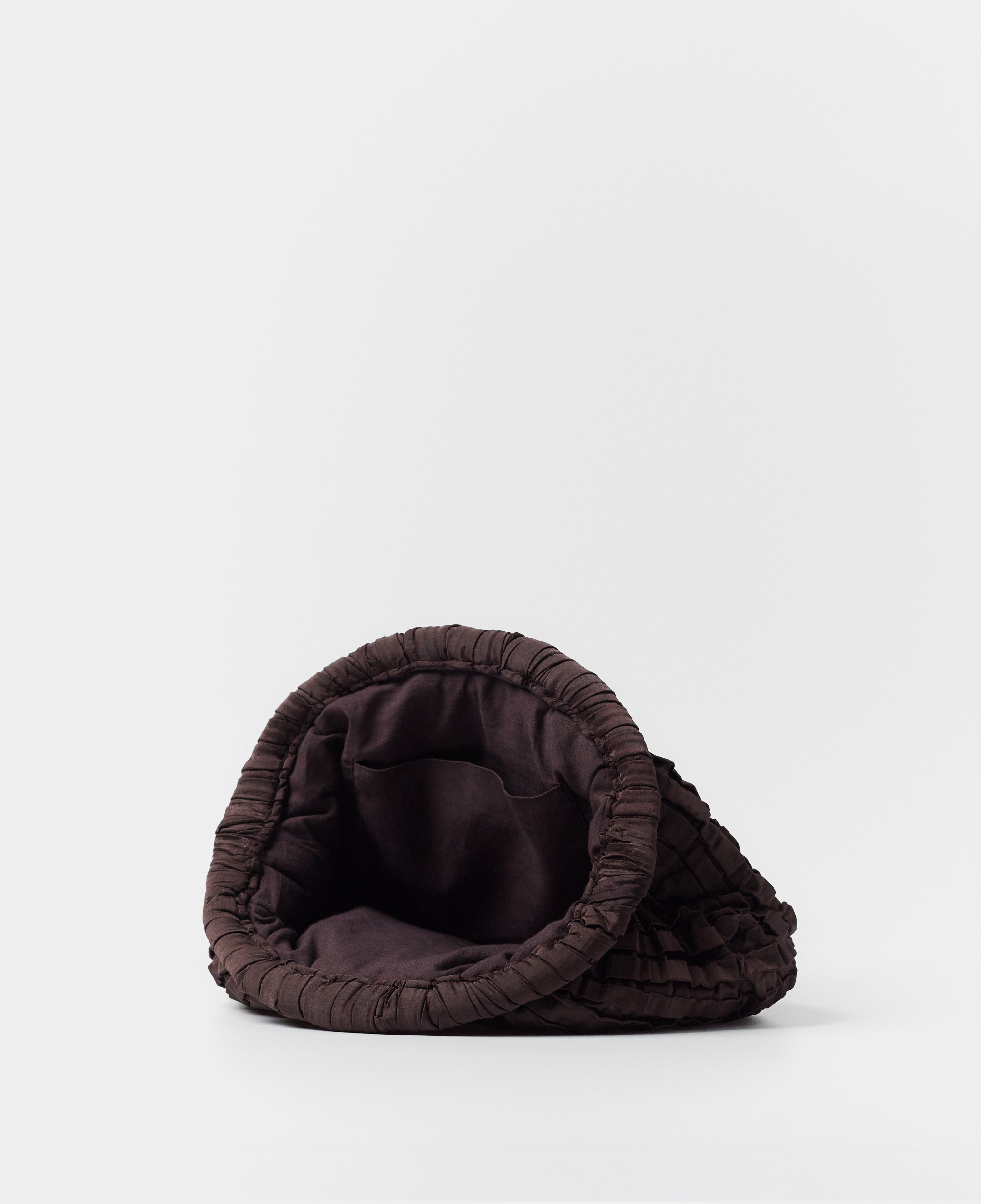 Chocolate-colored satin and textured fabric clutch handbag.