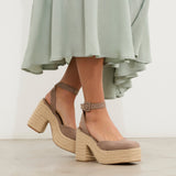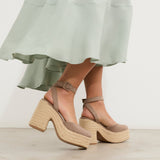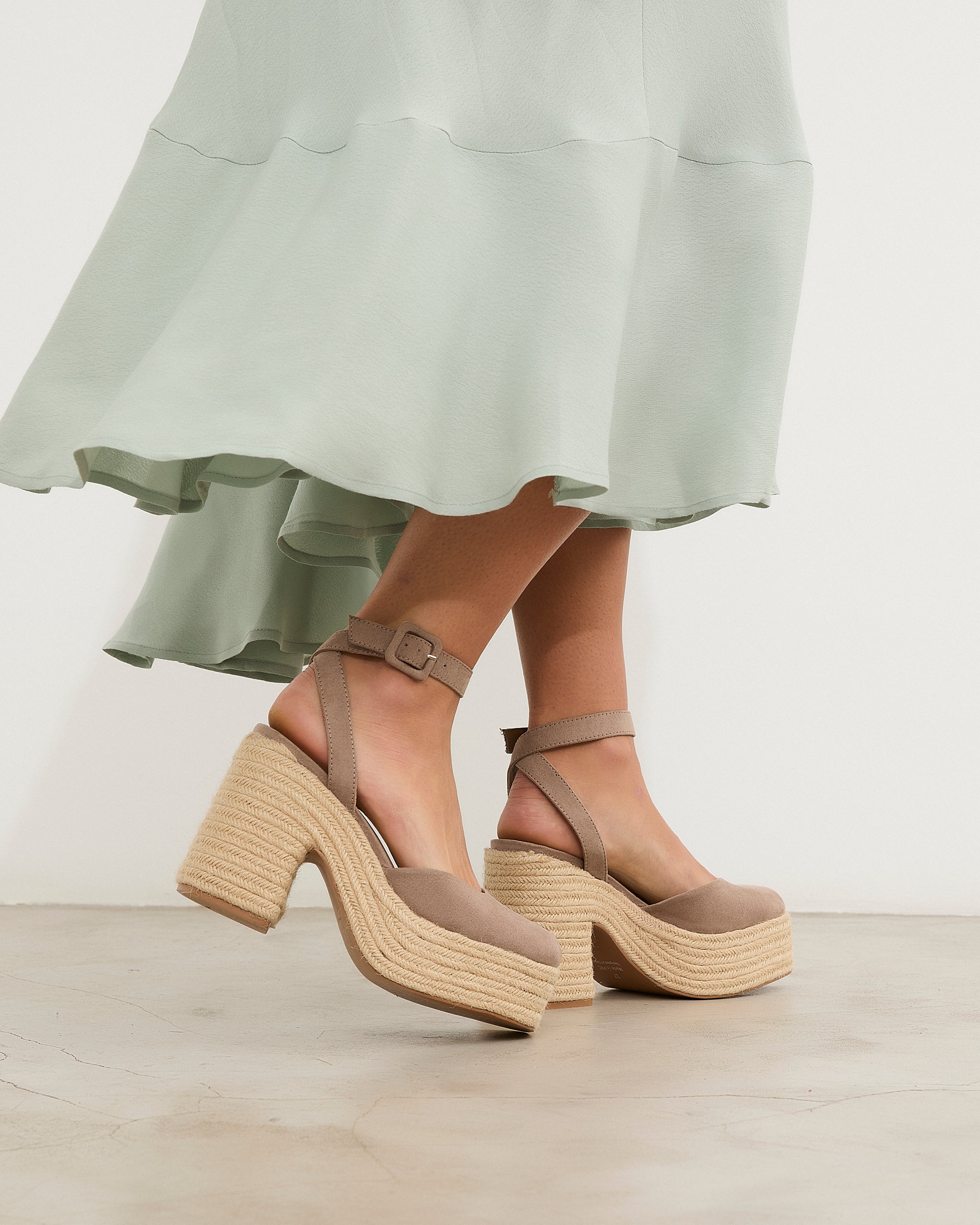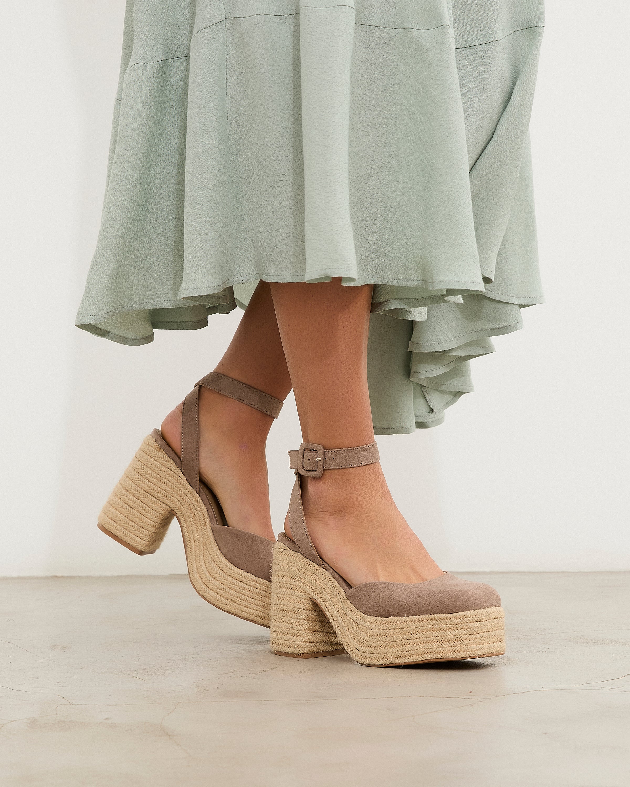 Taupe-colored heel with XL platform in esparto and rounded toe. Closed front and back straps with buckle for ankle adjustment. Square heel.