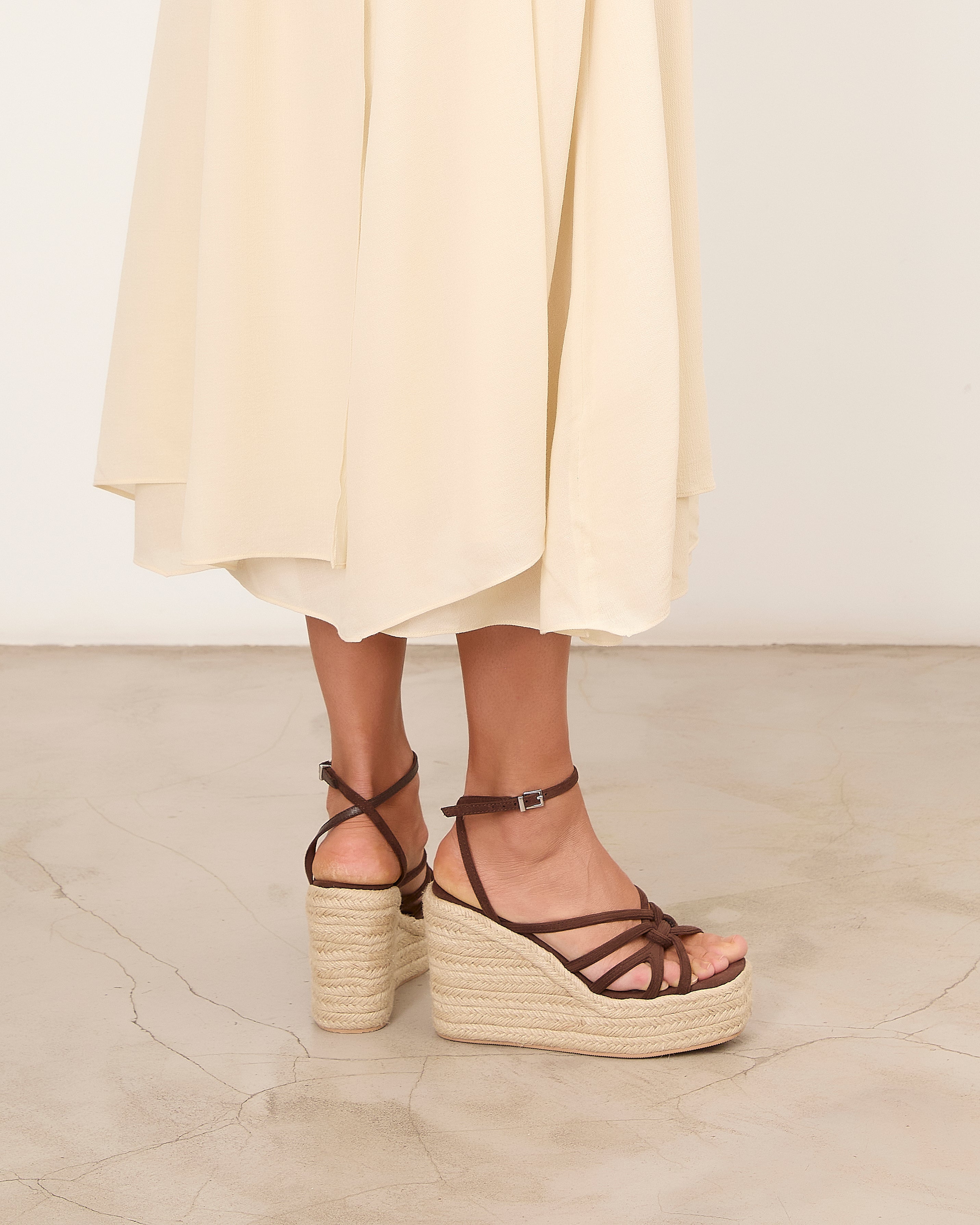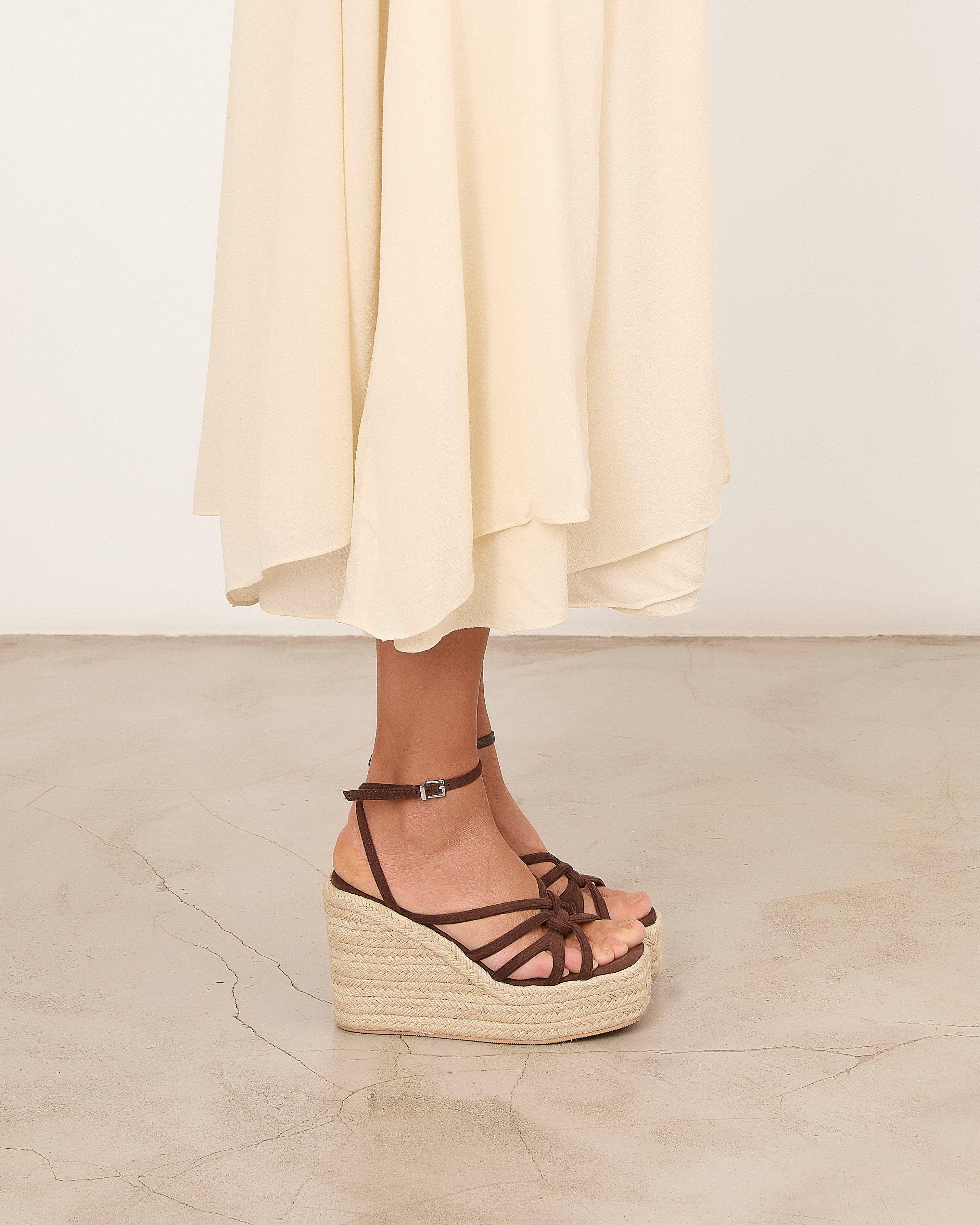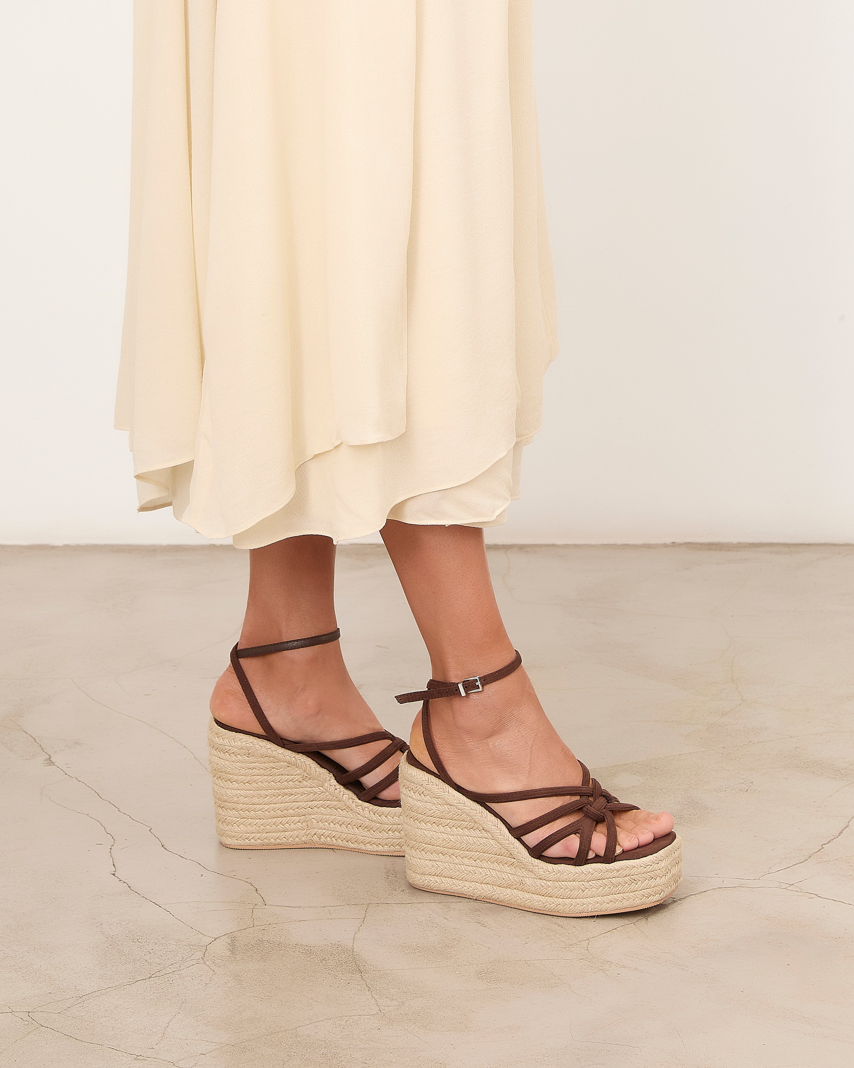 Espadrille platform sandal with a chocolate-colored heel. Front straps and ankle closure with a metal buckle.