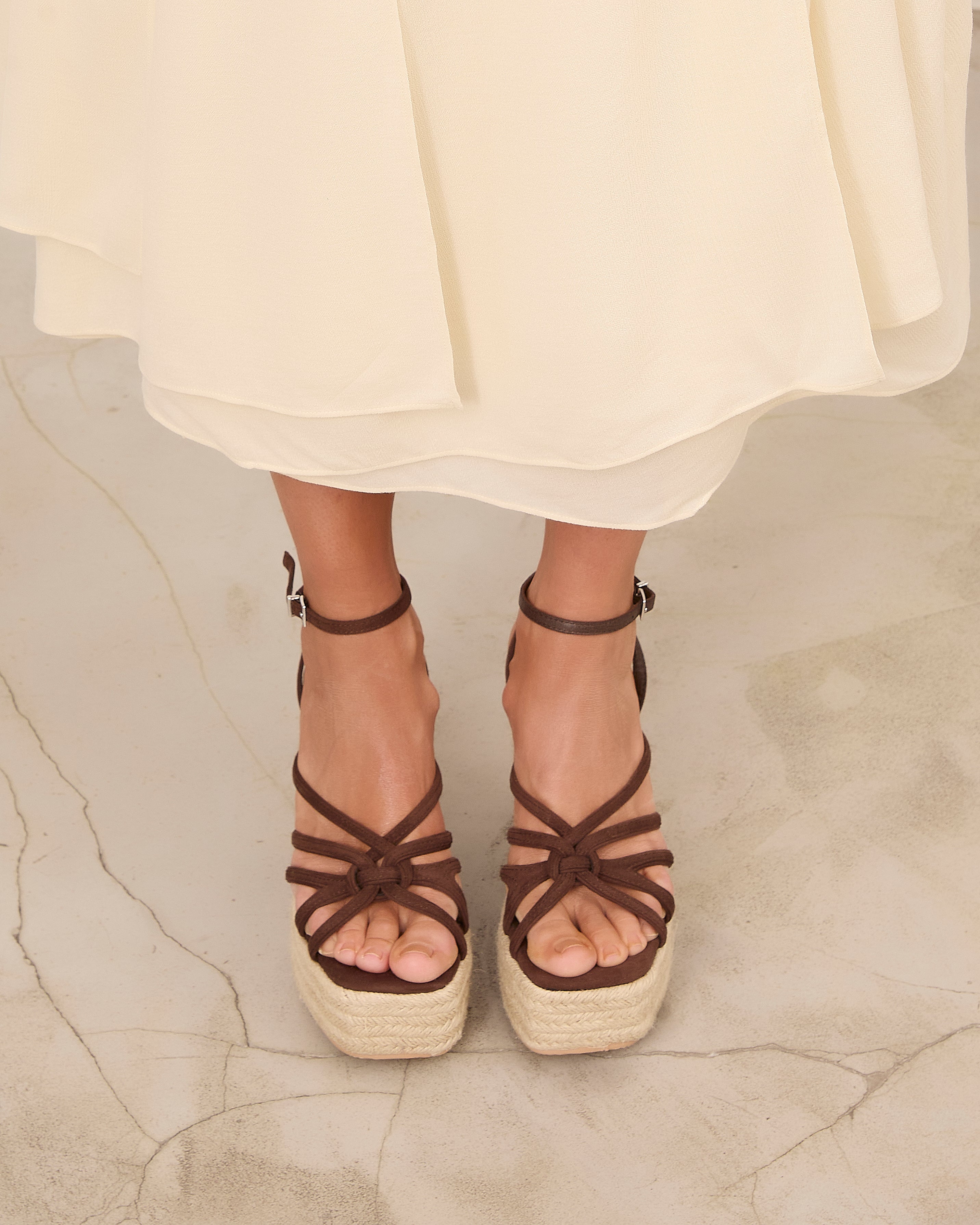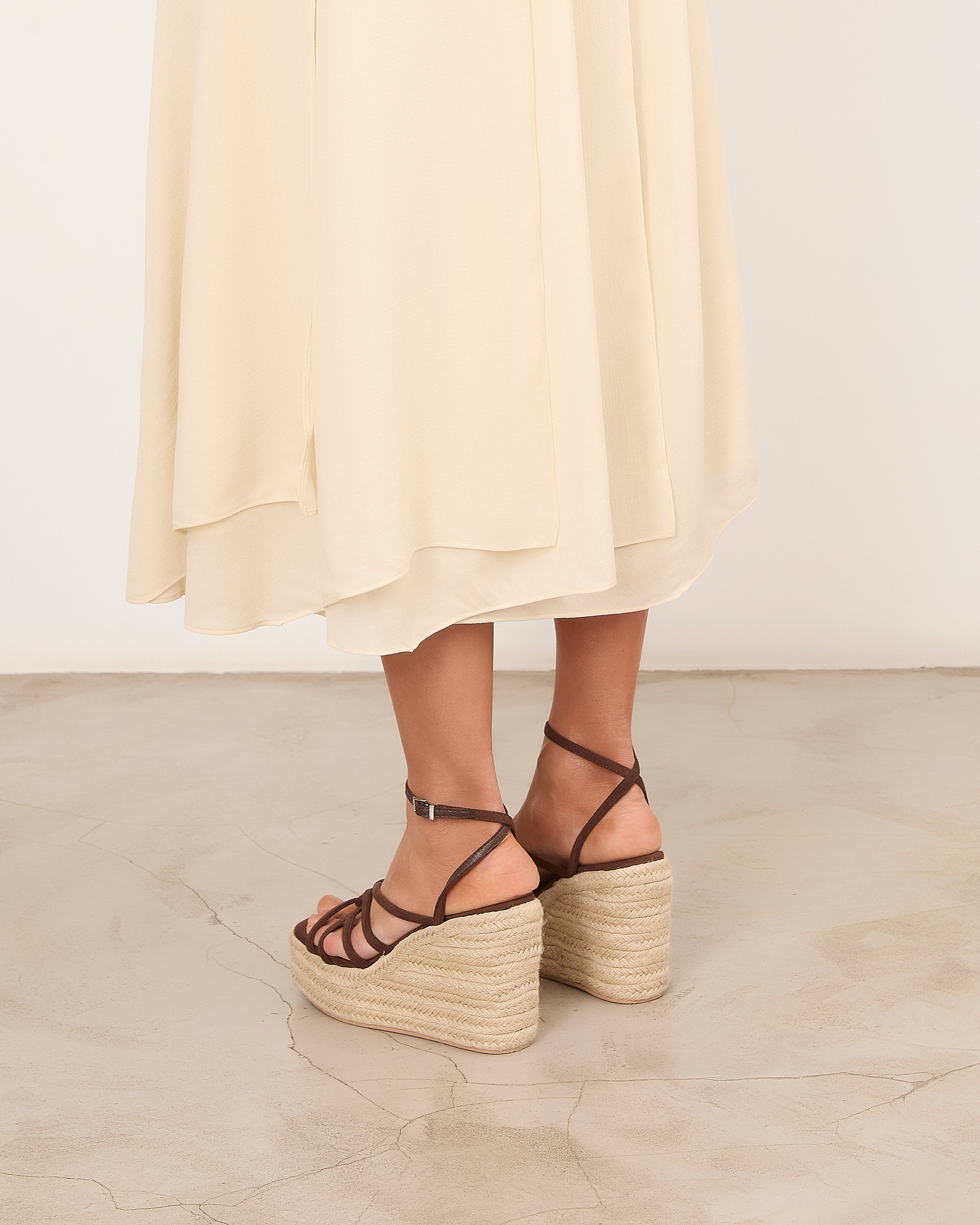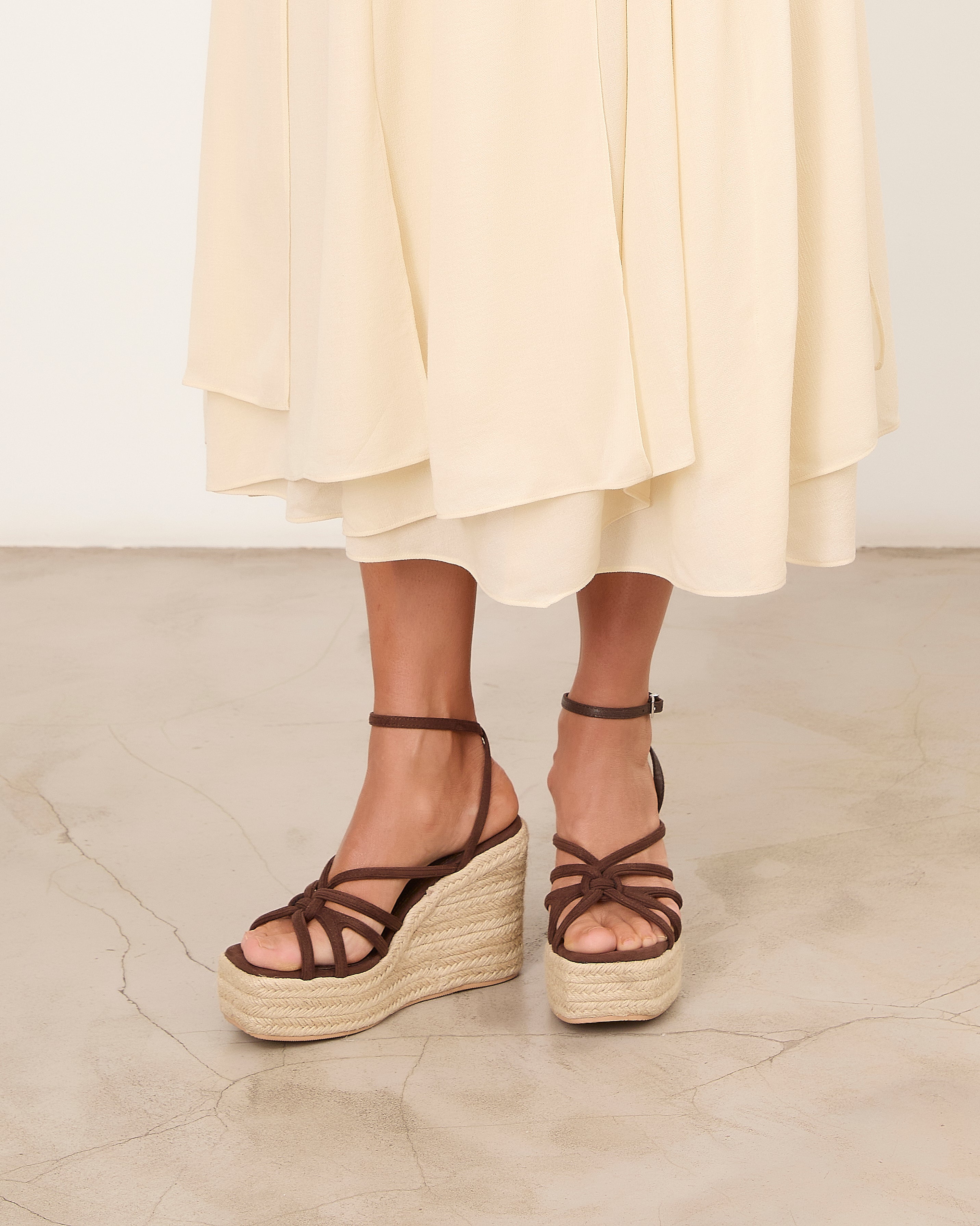 Espadrille platform sandal with a chocolate-colored heel. Front straps and ankle closure with a metal buckle.