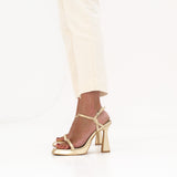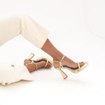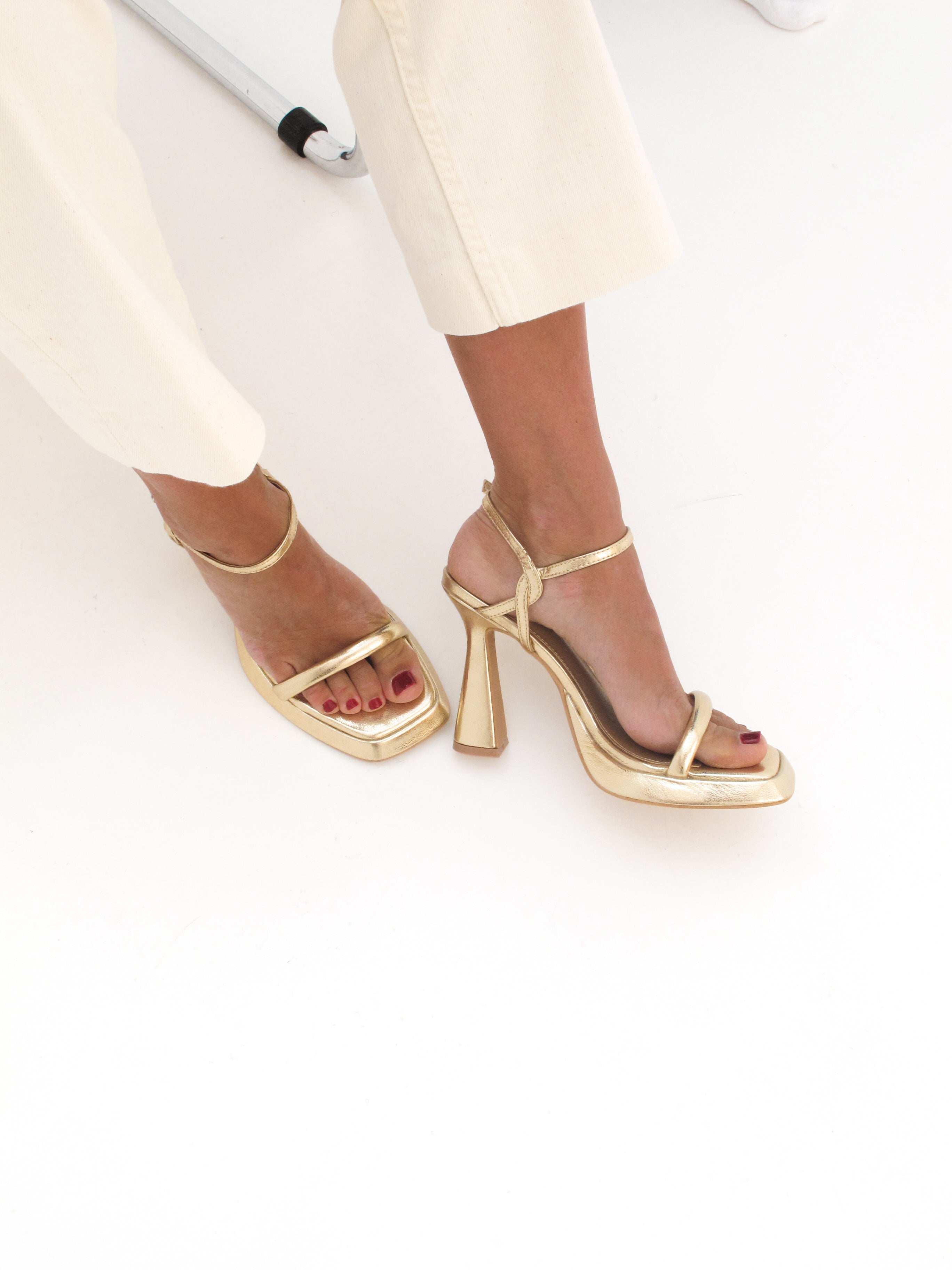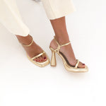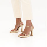 Heeled sandal with platform in gold color. Open front with a single strap and a thin heel with a square platform. Ankle strap closure with buckle.