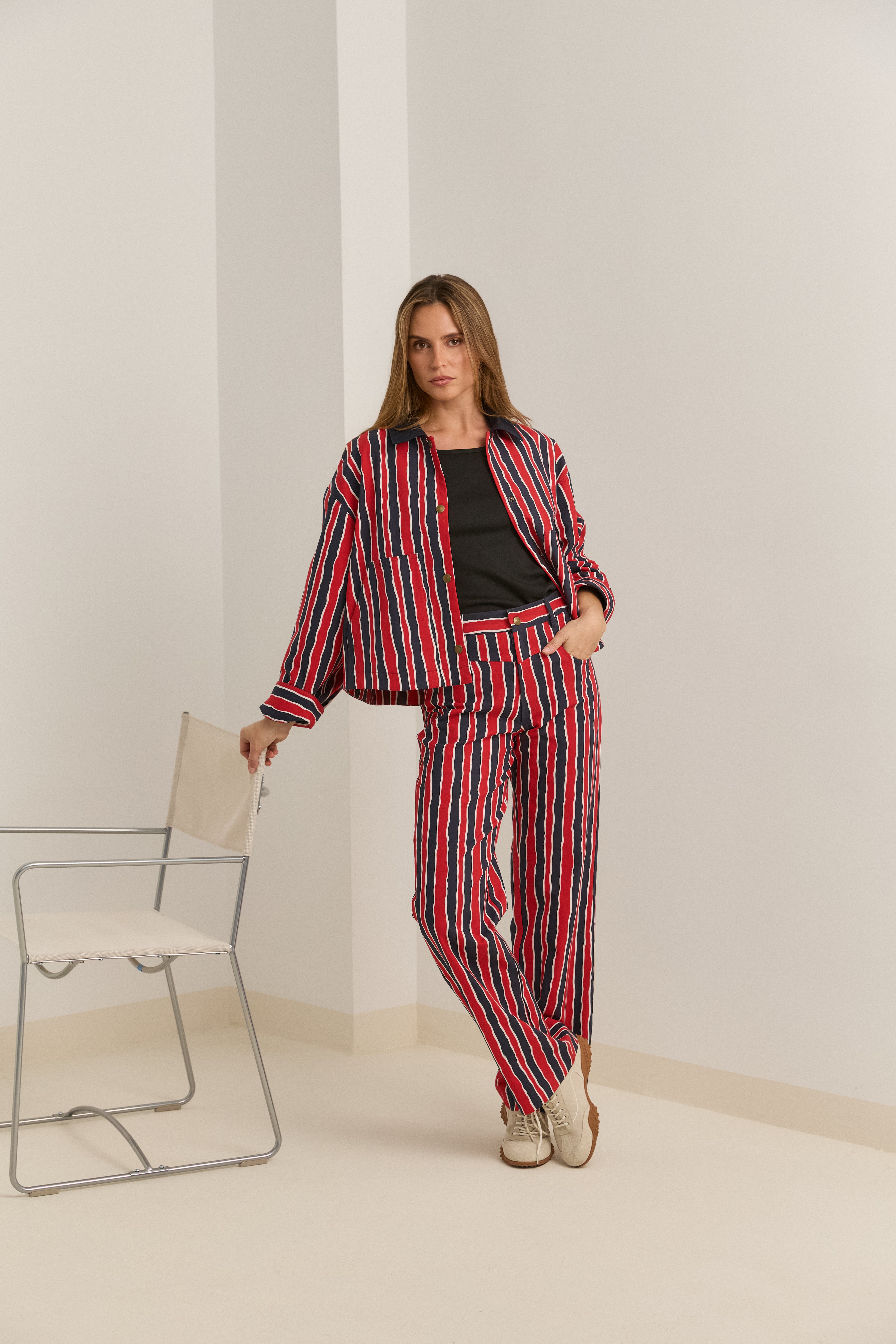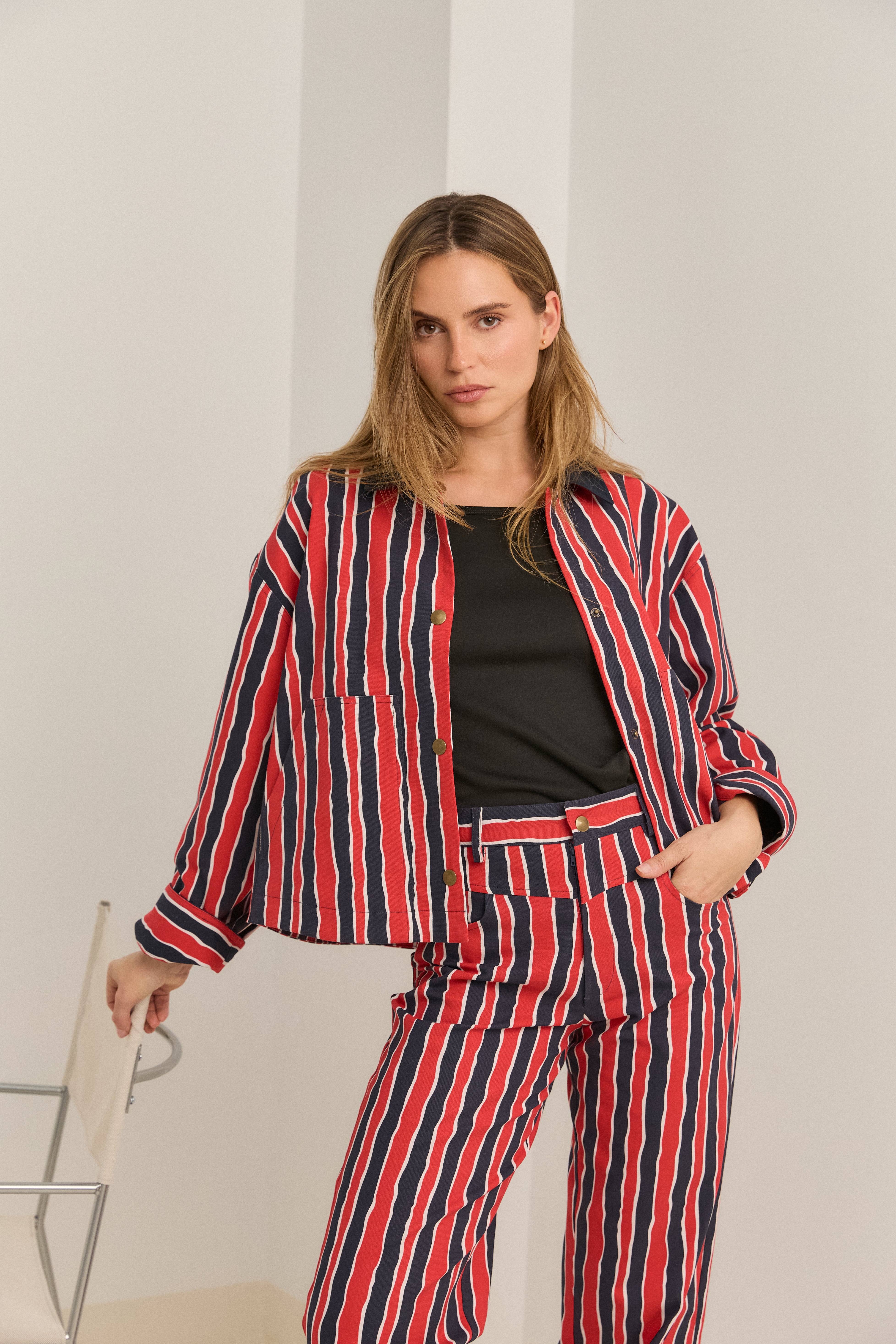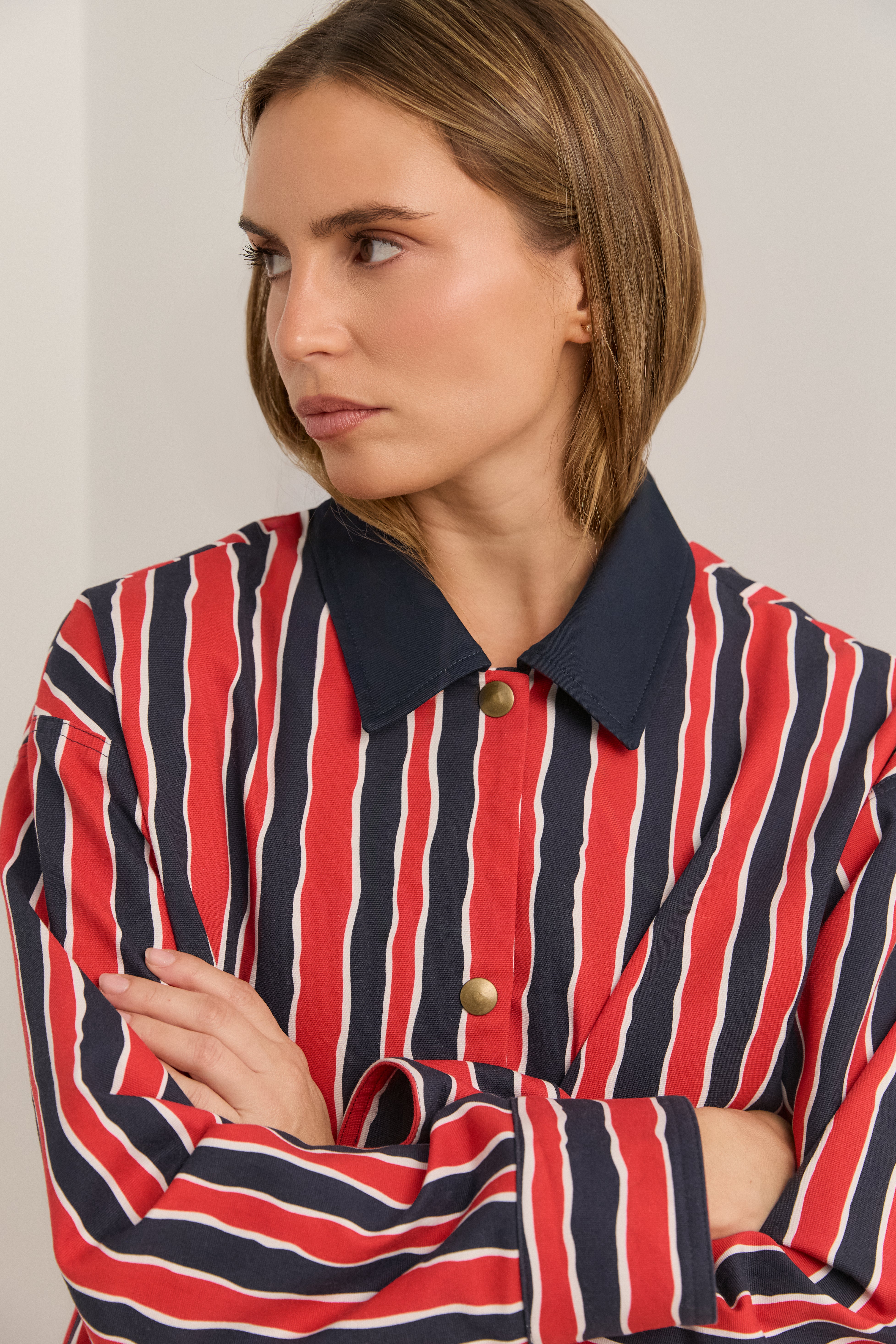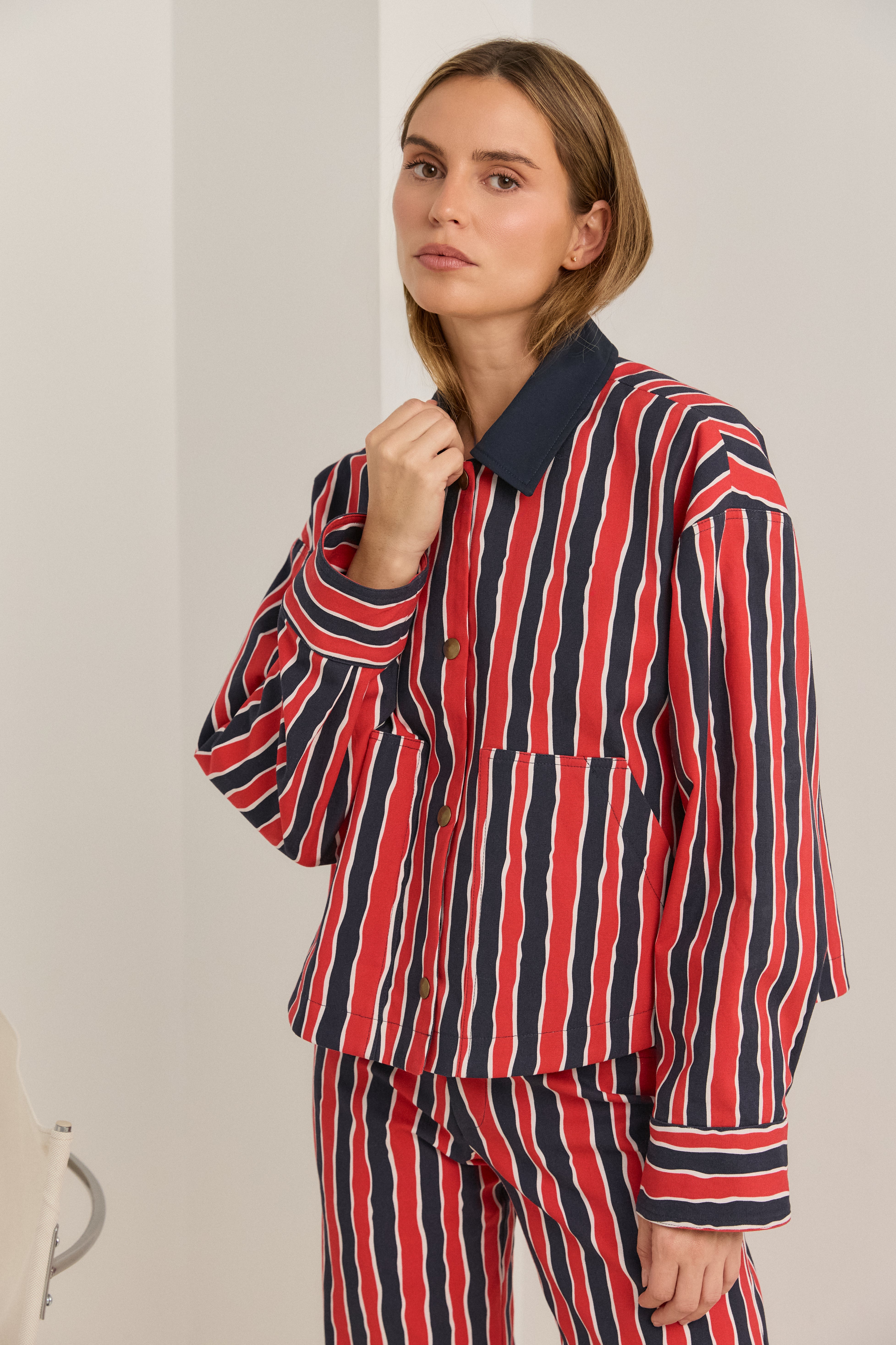 Short jacket with two-tone stripes in red and navy blue and a contrasting shirt collar. Front buttons with snap fasteners.