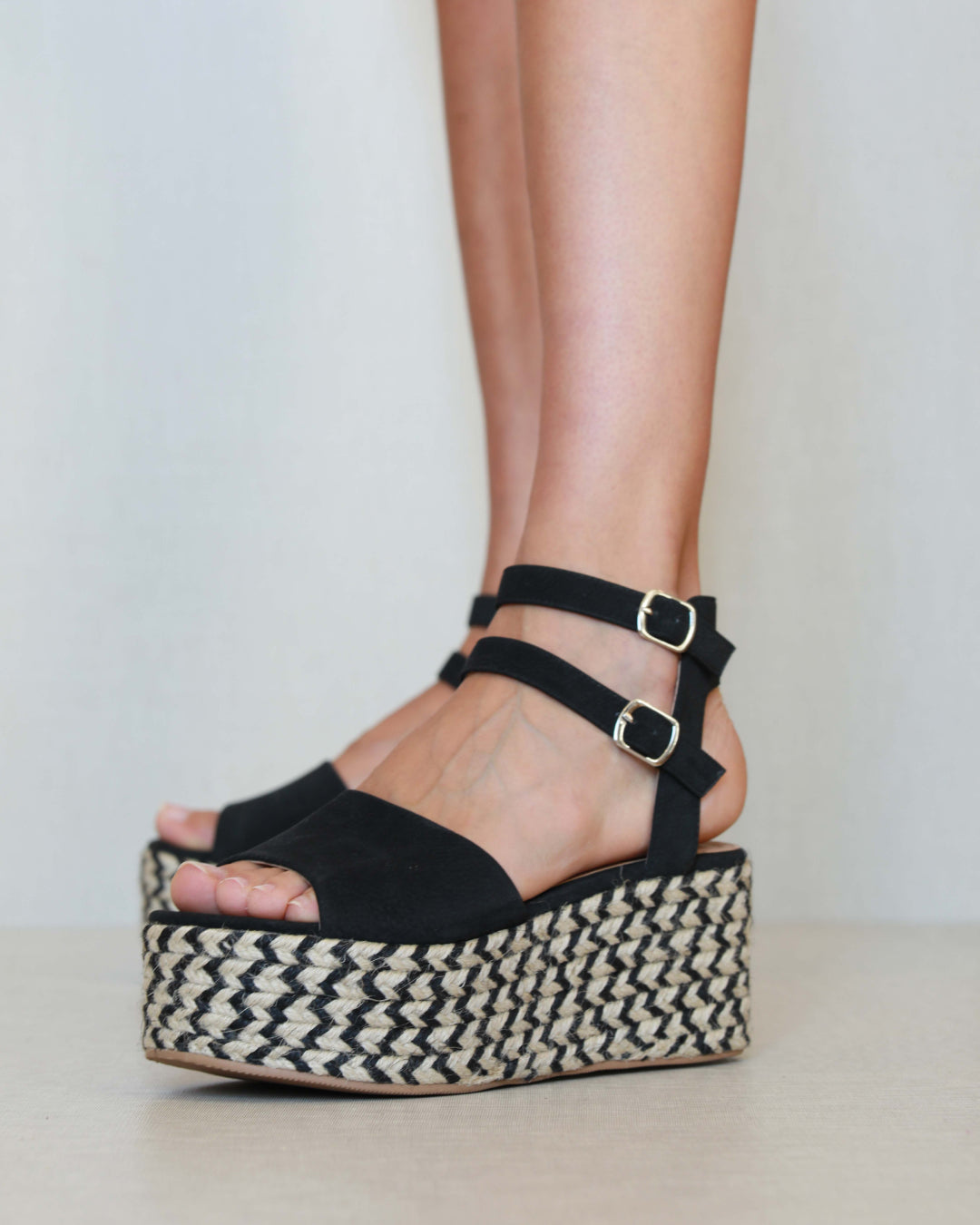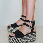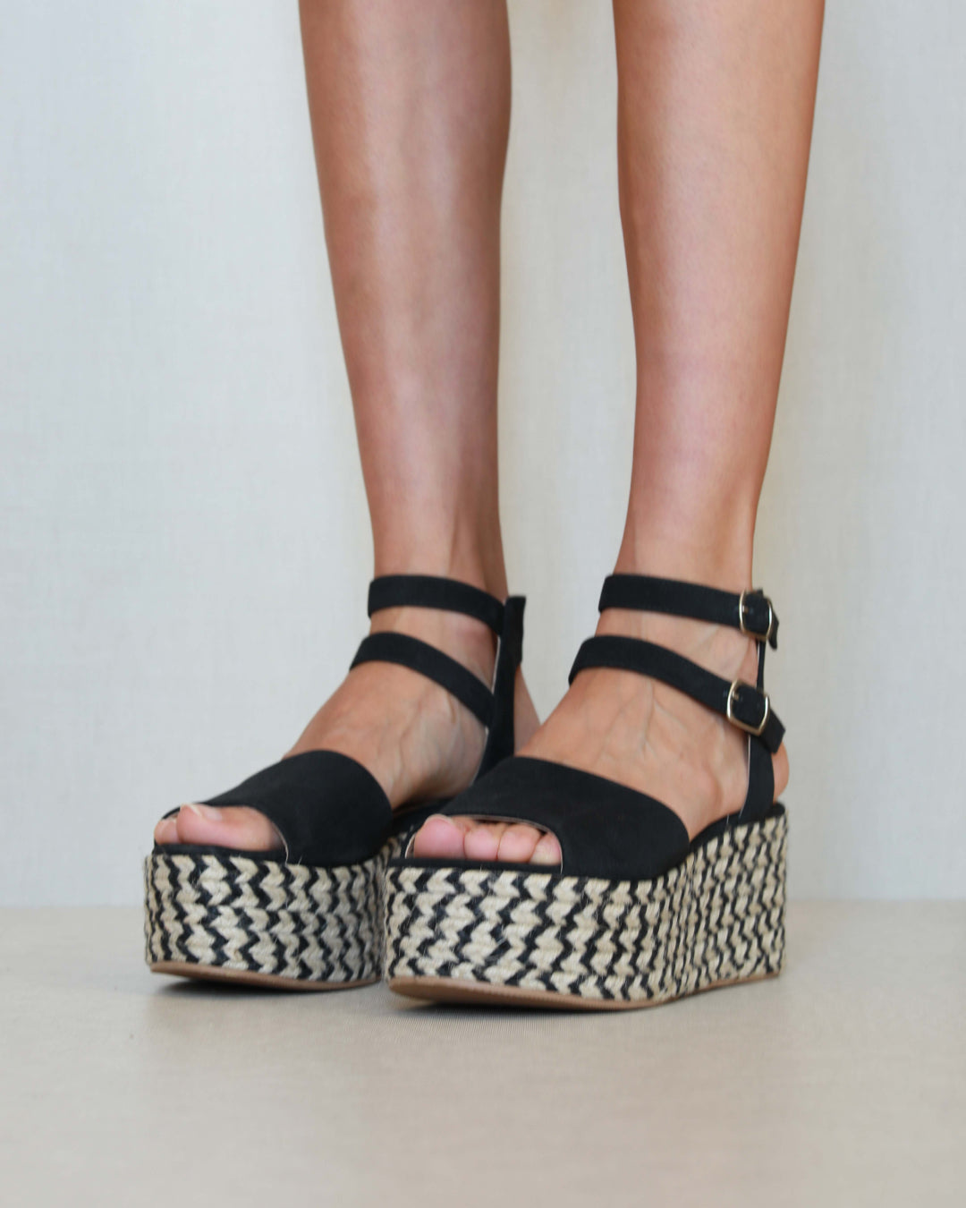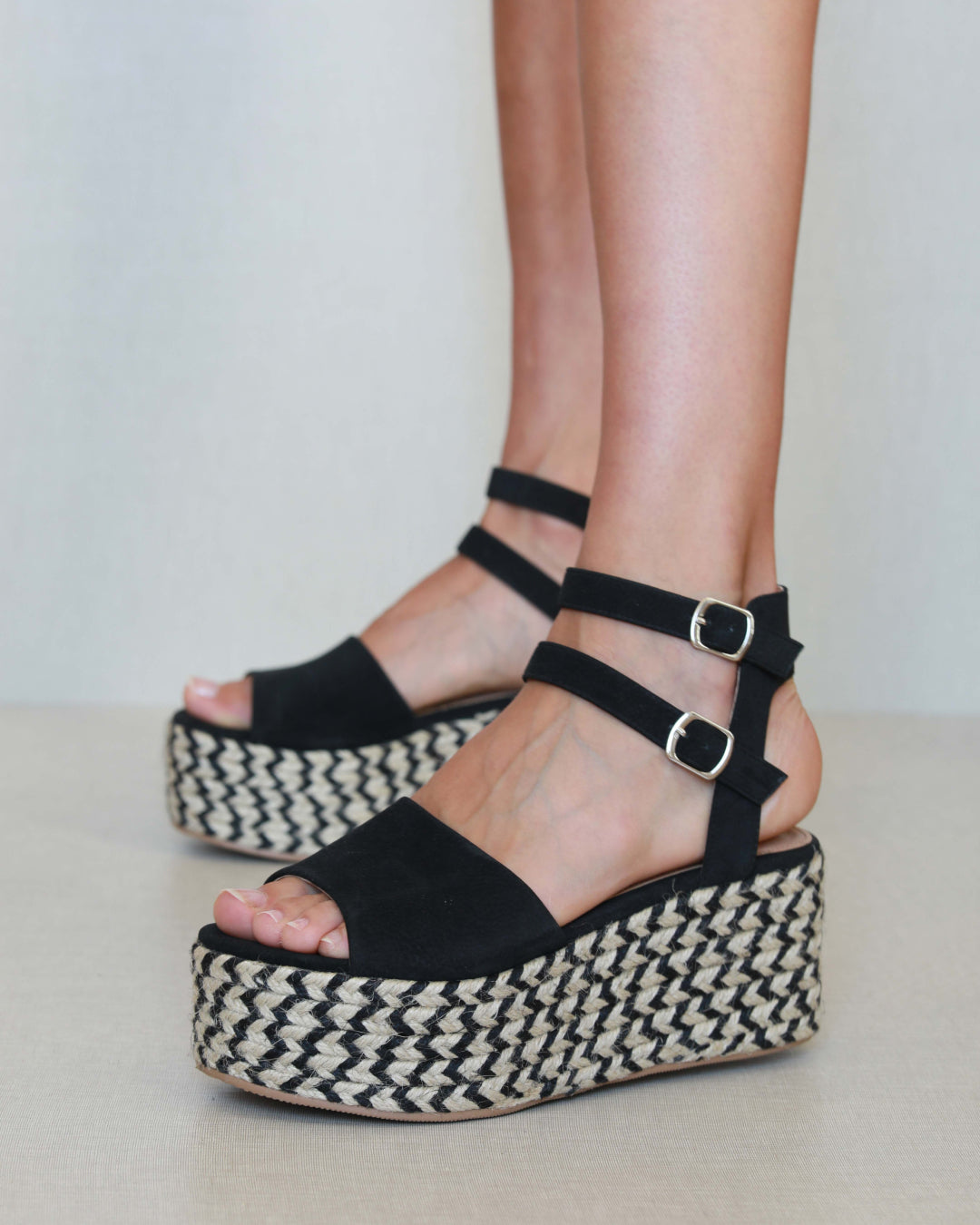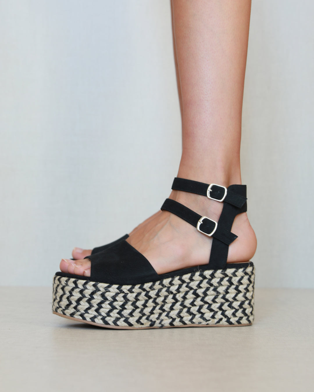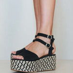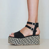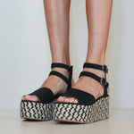 Platform sandal in two-tone esparto grass. Wide front strap and double ankle bracelet in black vegan leather. Closure with two buckles.