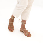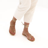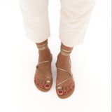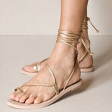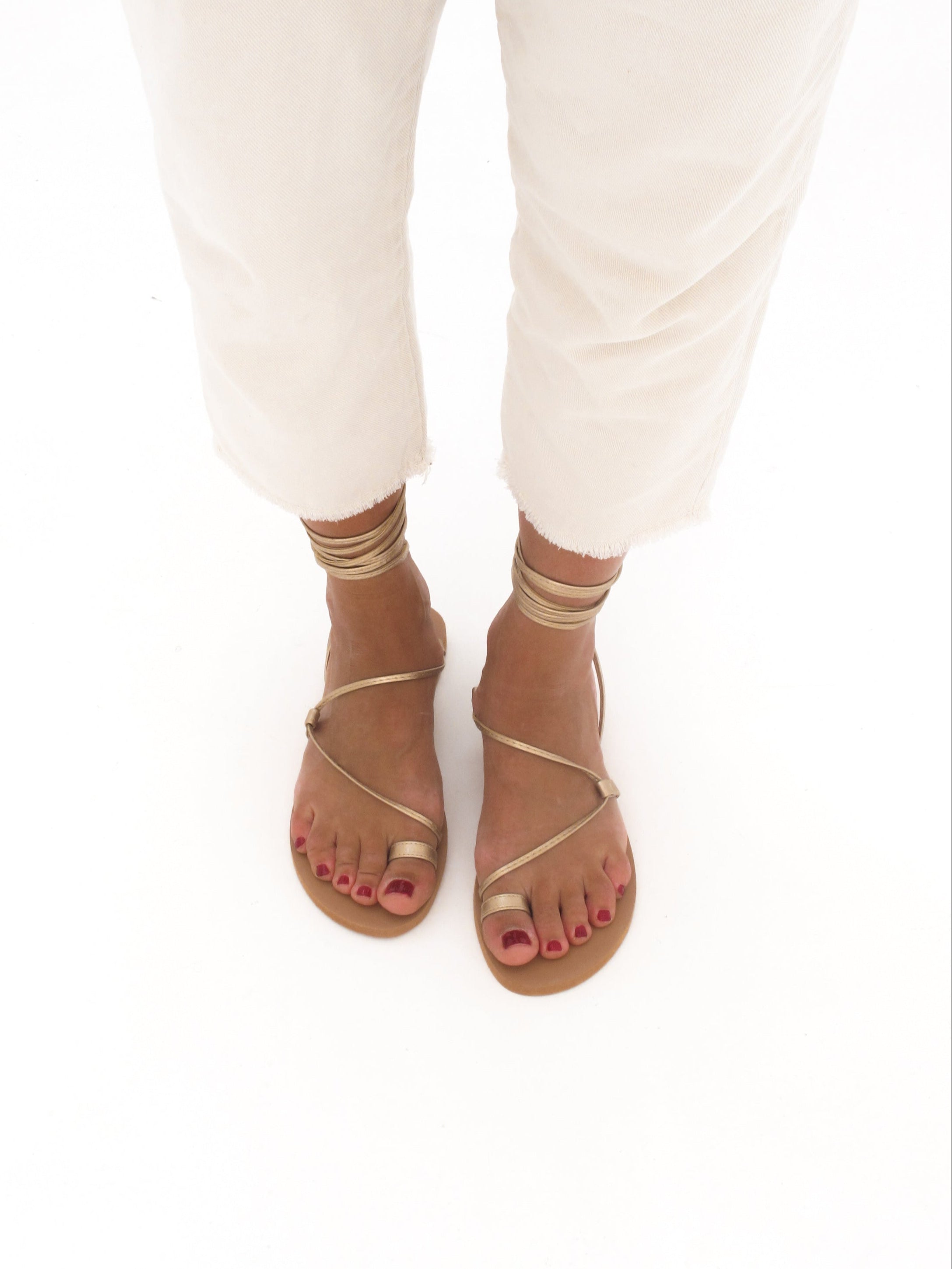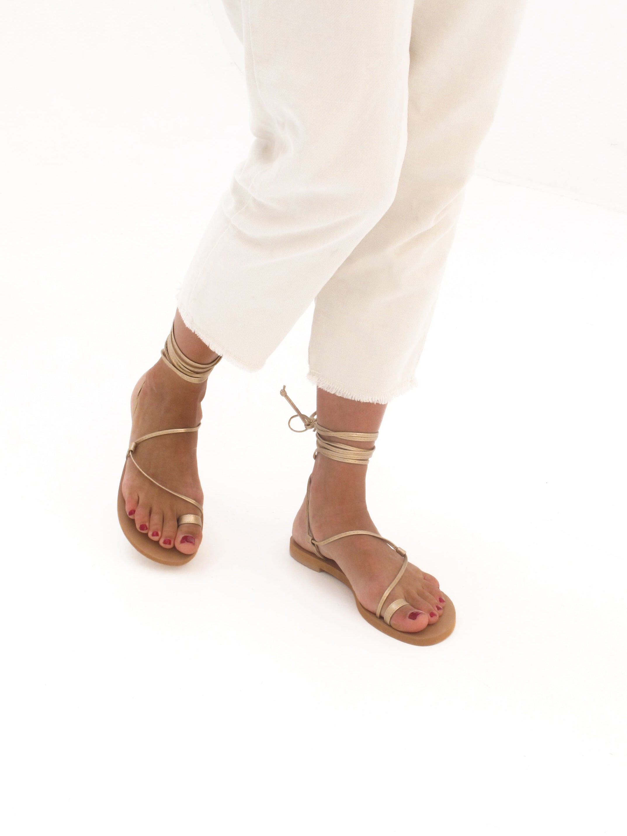 Flat sandal in gold vegan leather. It has a thumb strap and two thin, long straps for ankle support with several turns.