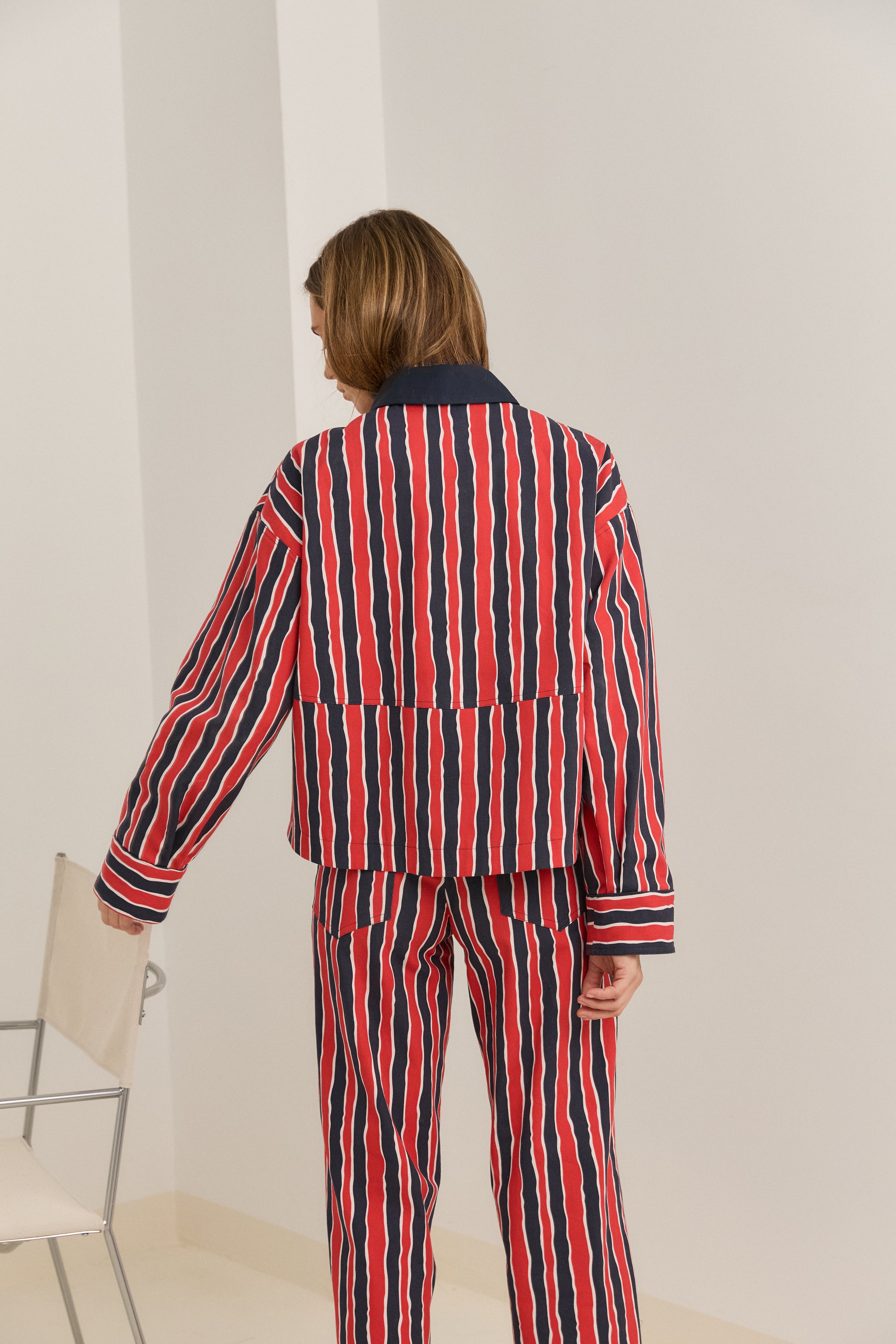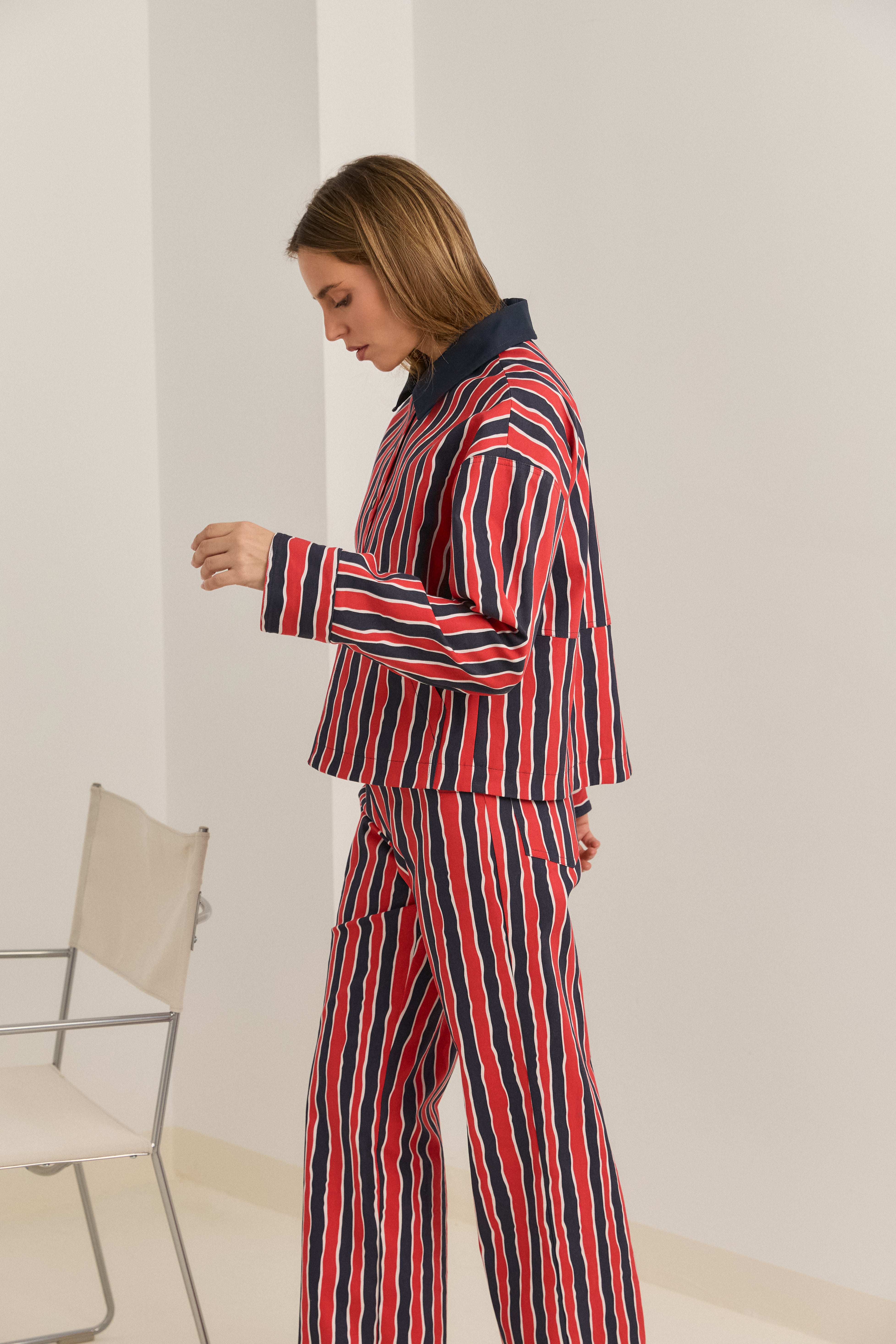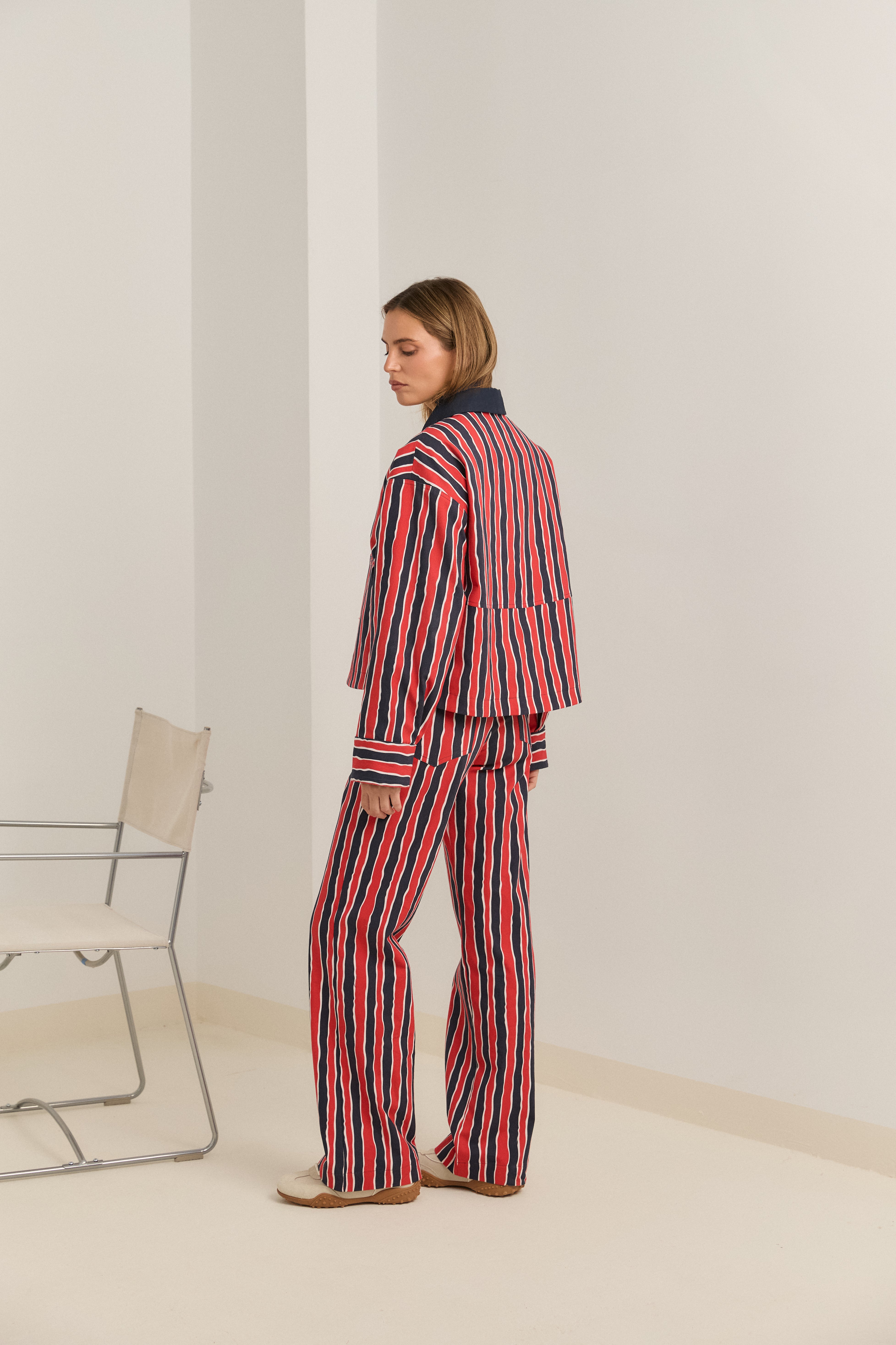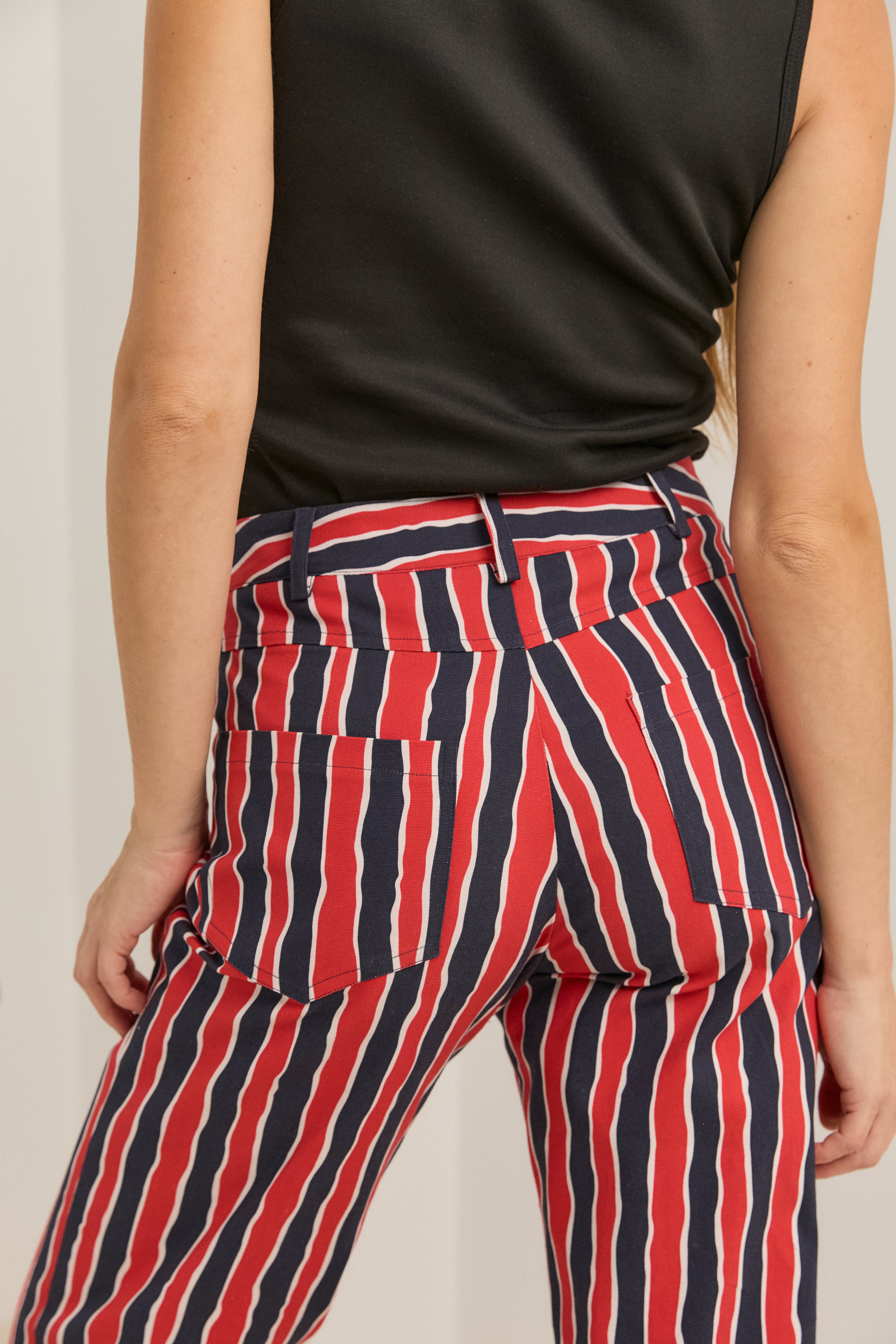 High-waisted trousers with a straight cut and two-tone stripes in navy blue and red. Front button with hook and zipper.