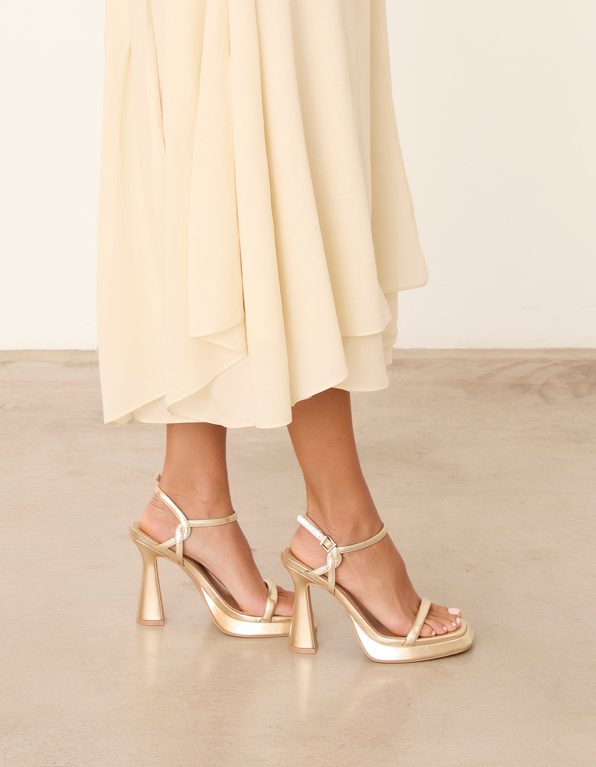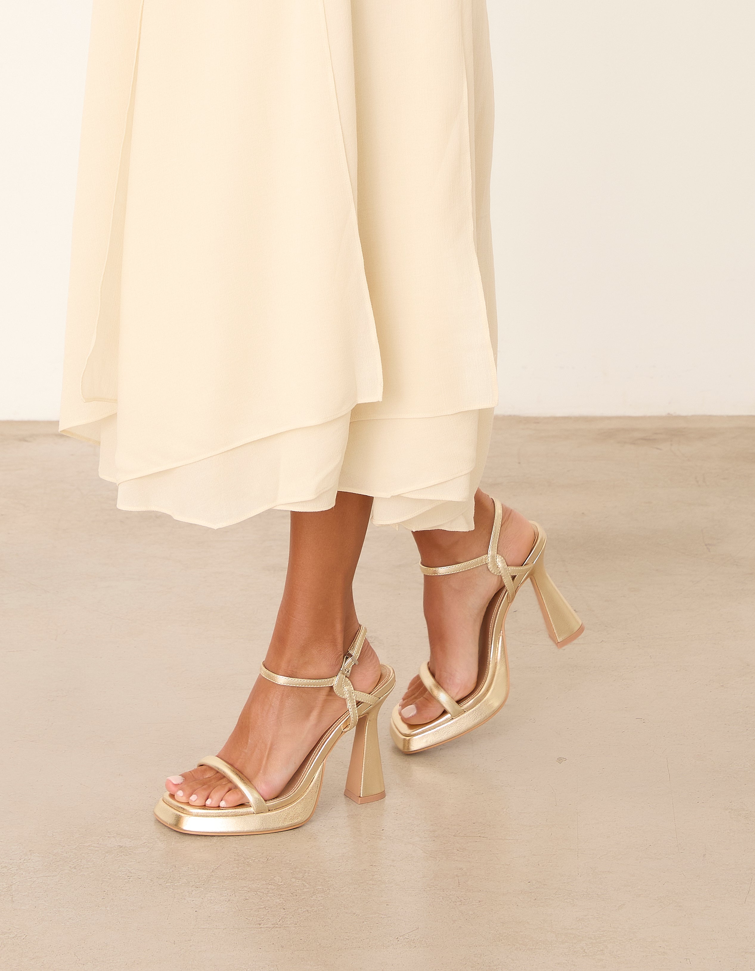 Heeled sandal with platform in gold color. Open front with a single strap and a thin heel with a square platform. Ankle strap closure with buckle.
