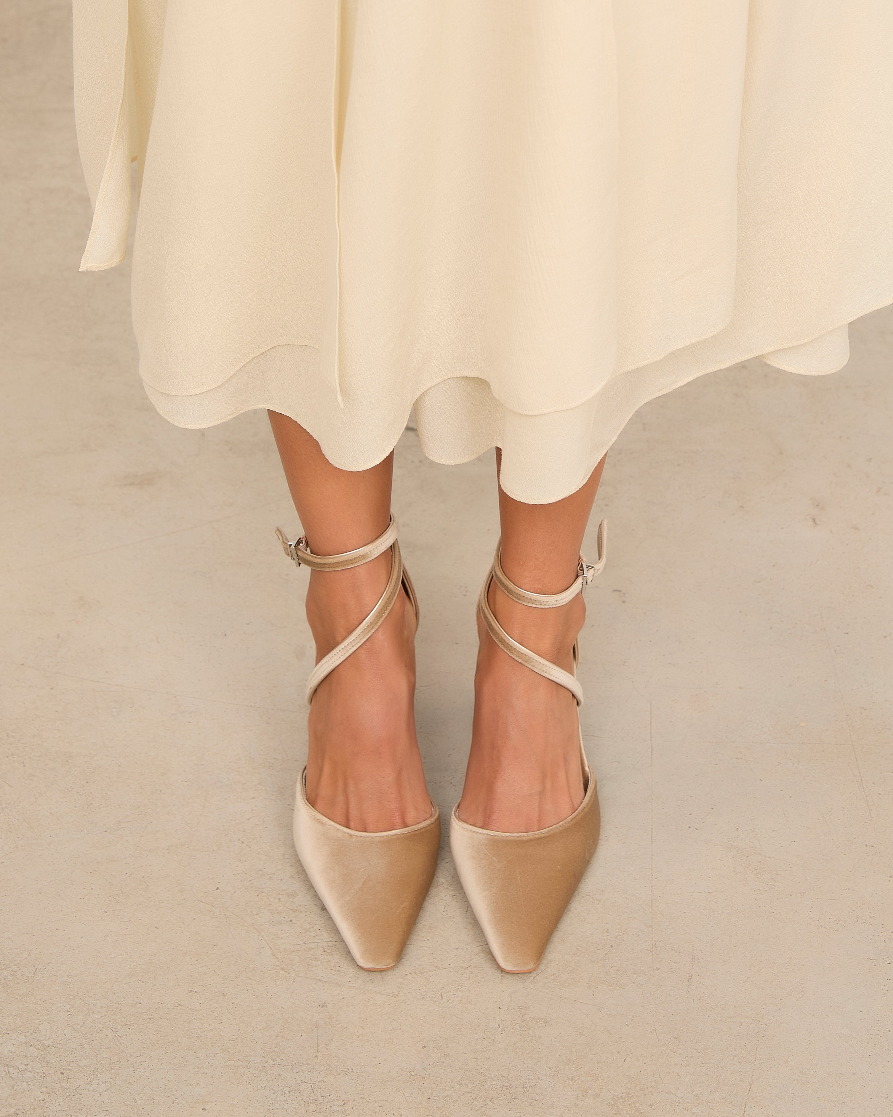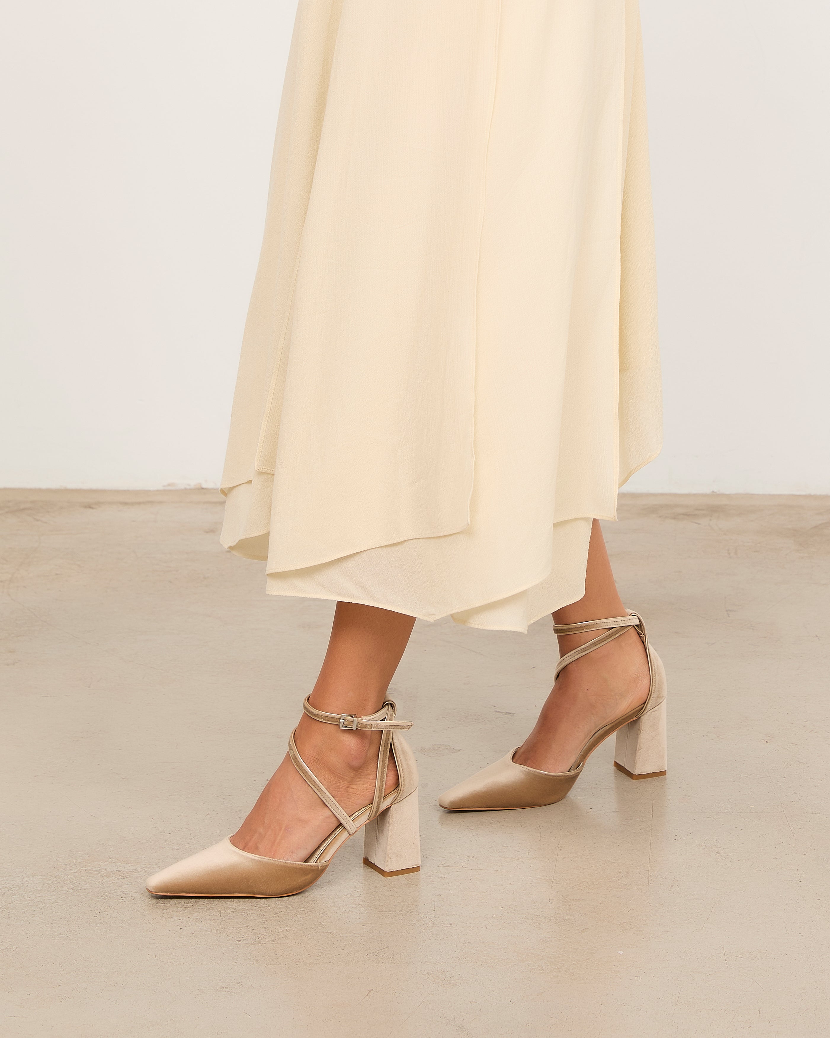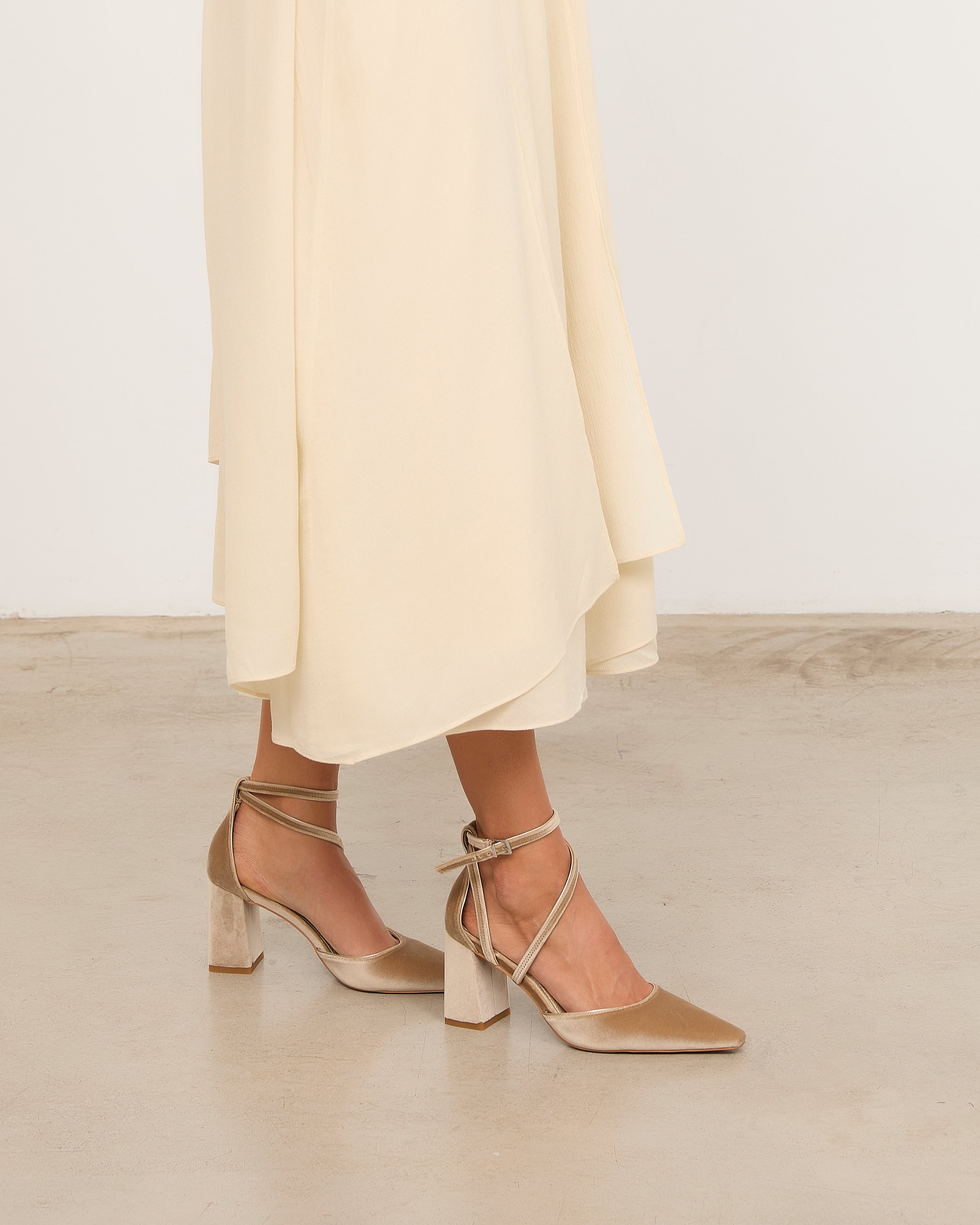 Pointed closed-toe high heel shoe in champagne-colored suede with metallic trim detail. Heel counter with ankle strap and crossed strap detail on the instep. Square heel.