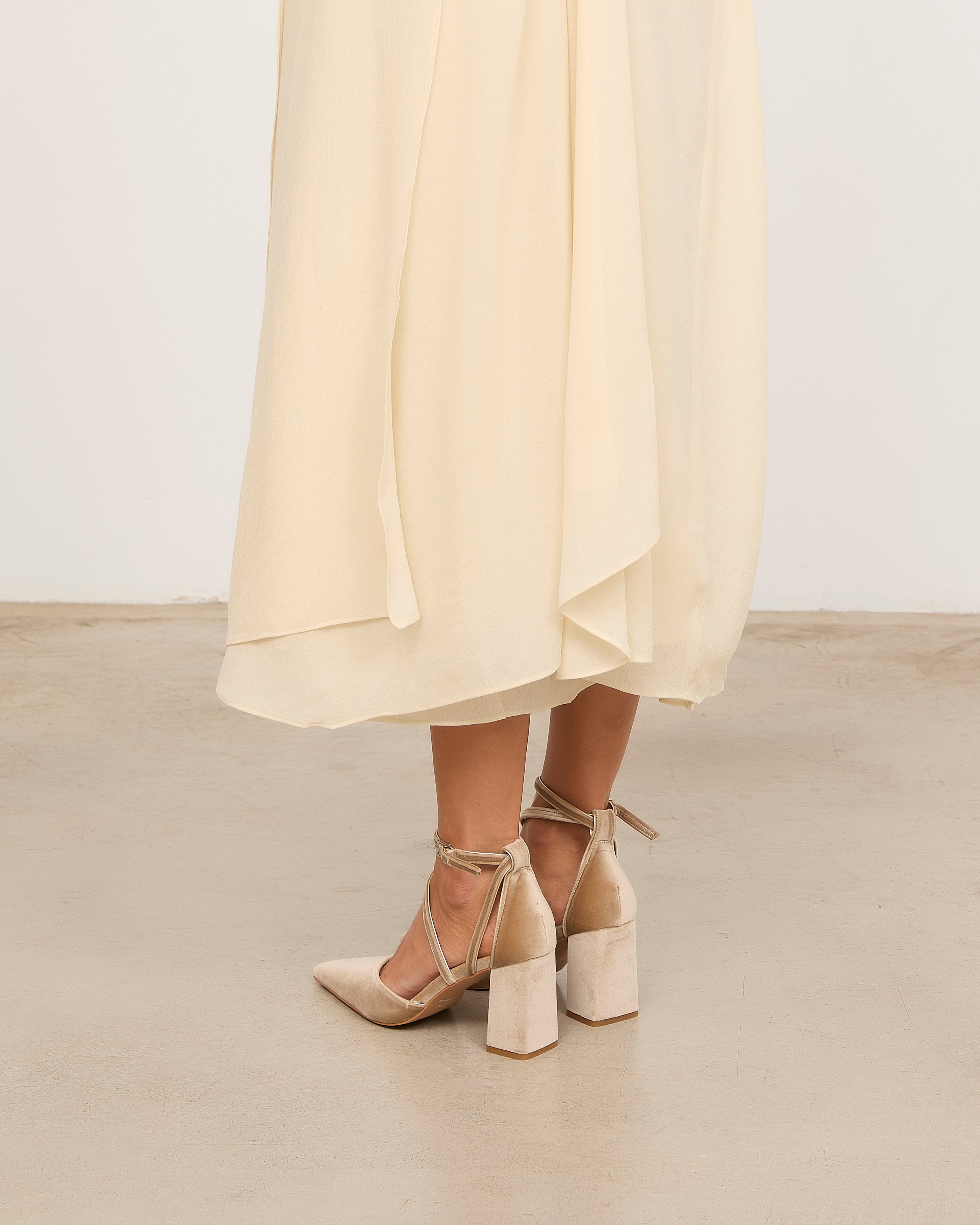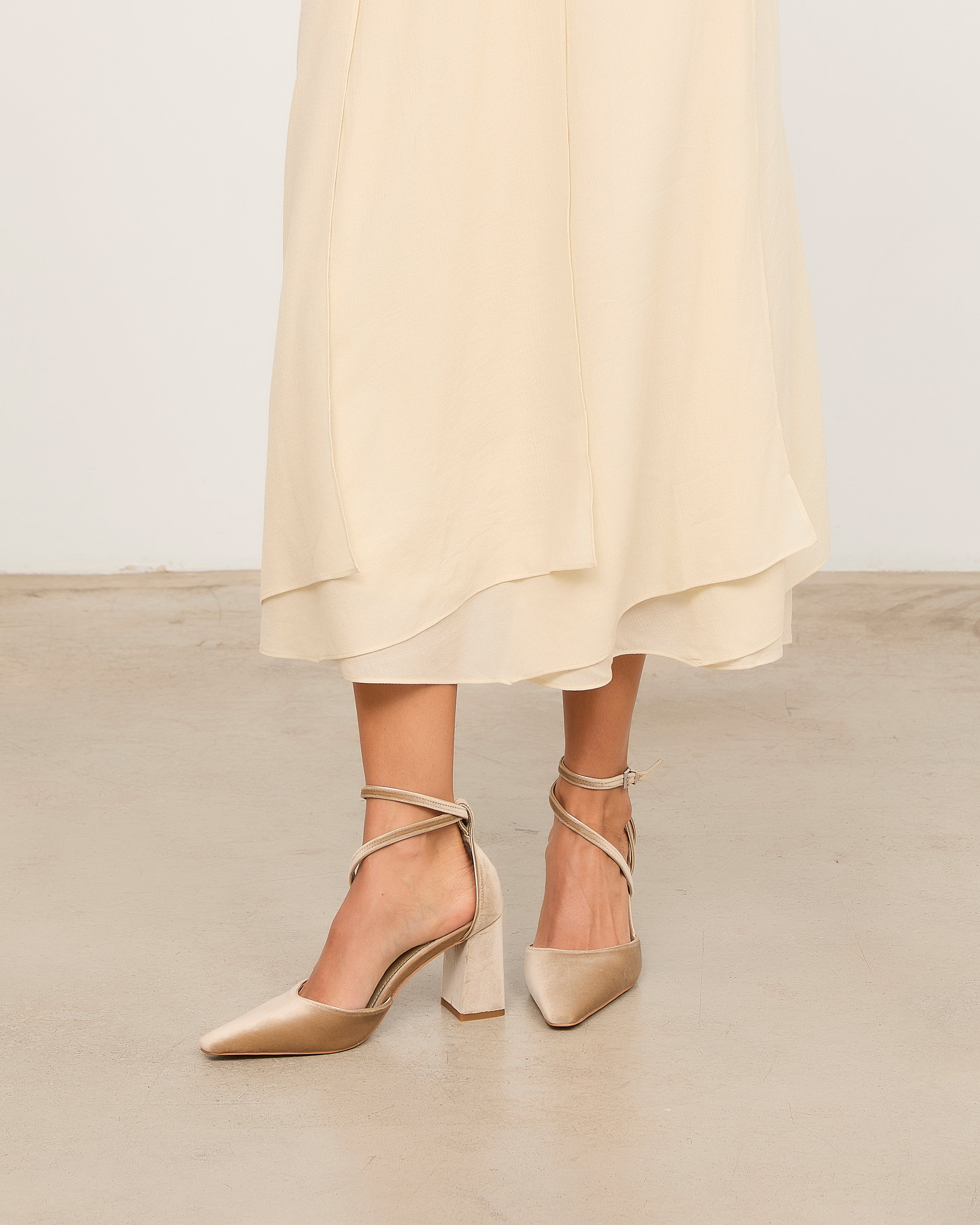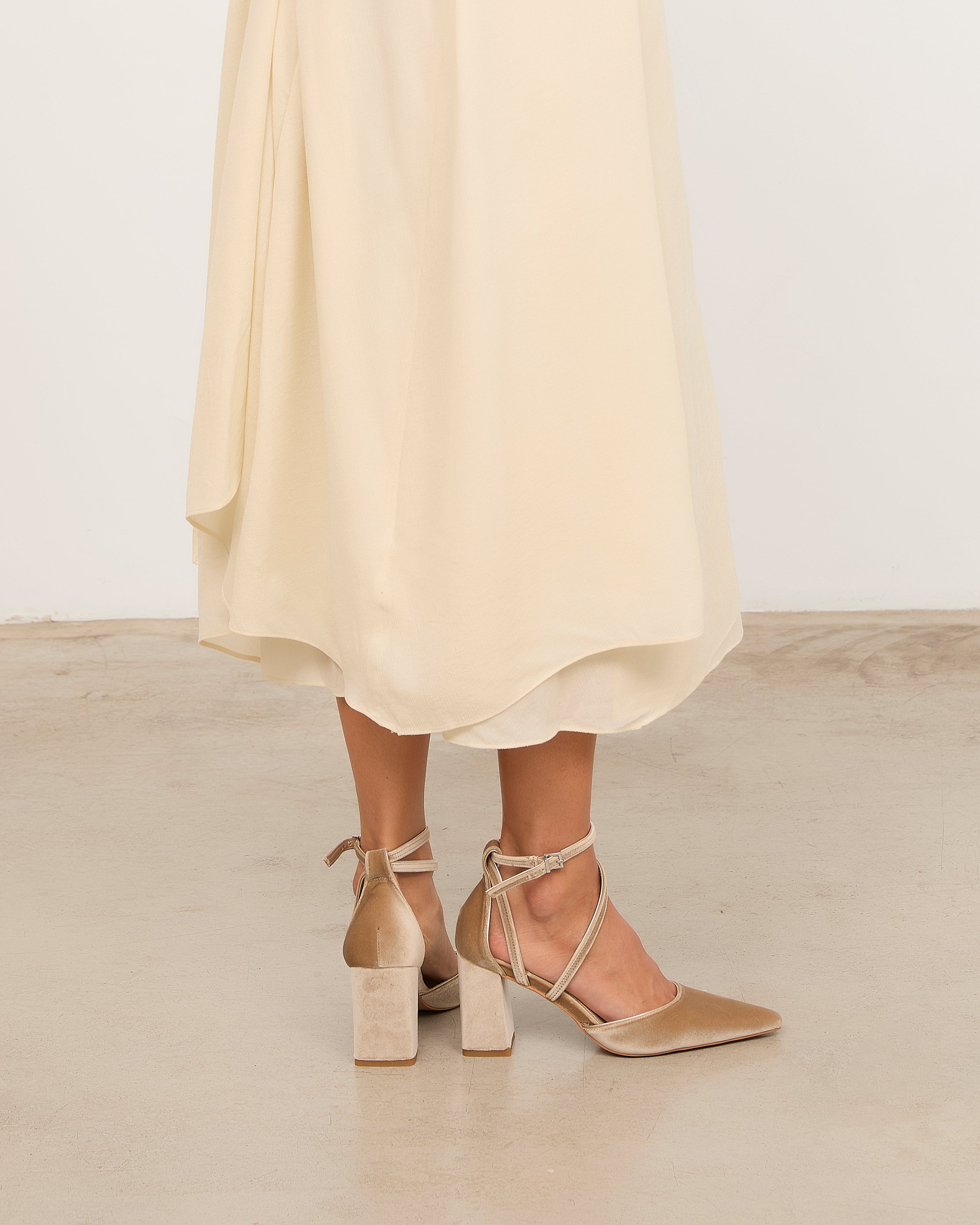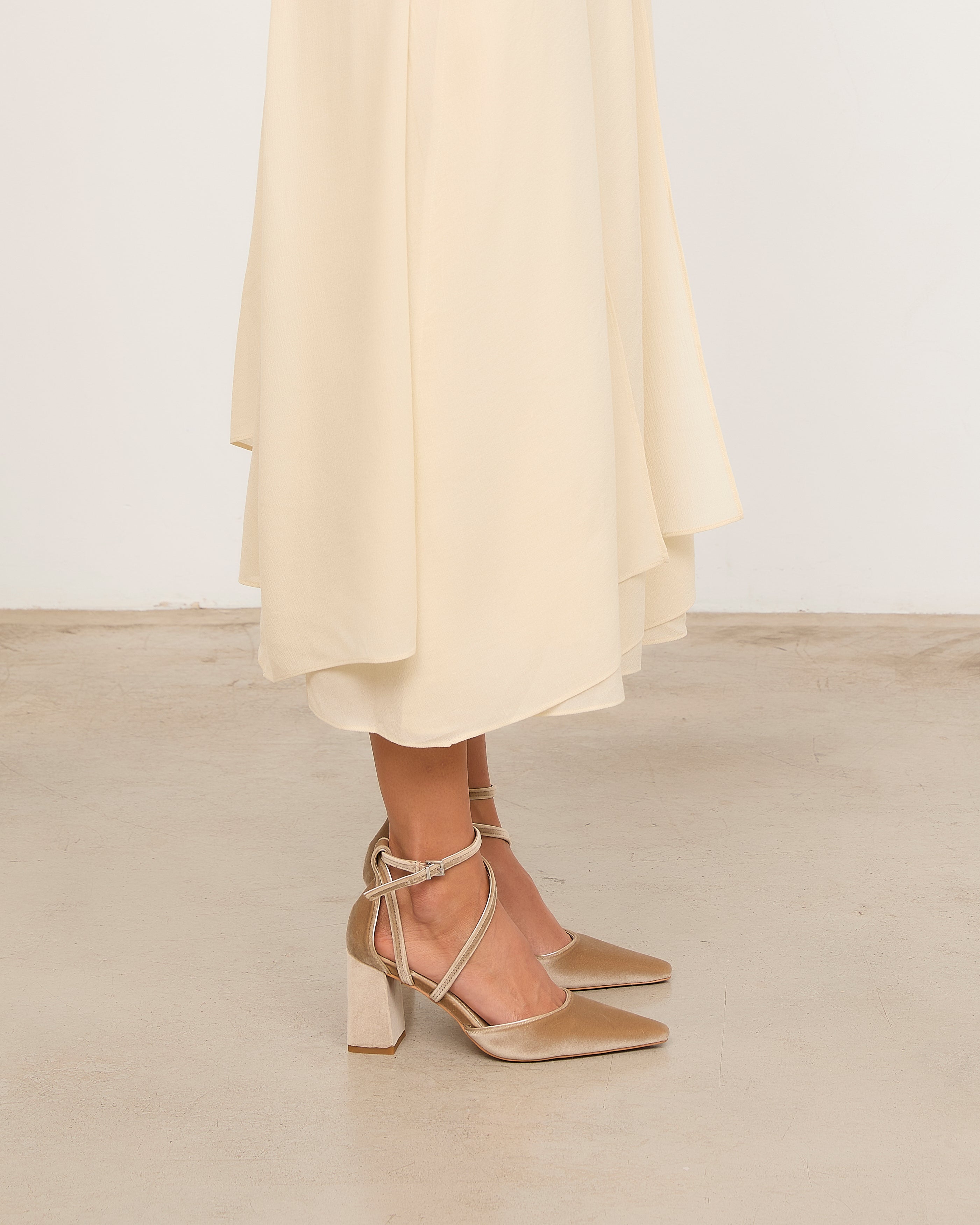 Pointed closed-toe high heel shoe in champagne-colored suede with metallic trim detail. Heel counter with ankle strap and crossed strap detail on the instep. Square heel.
