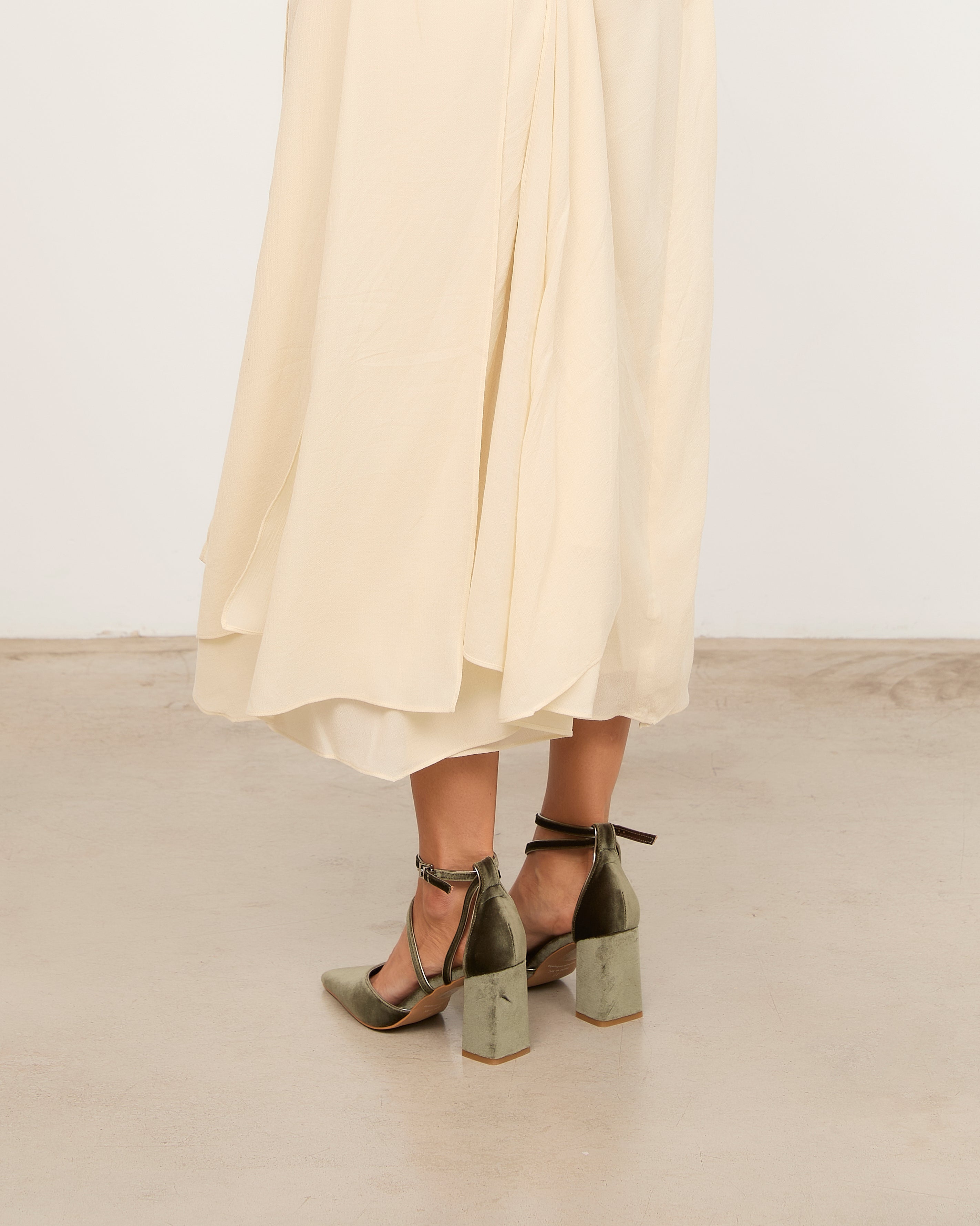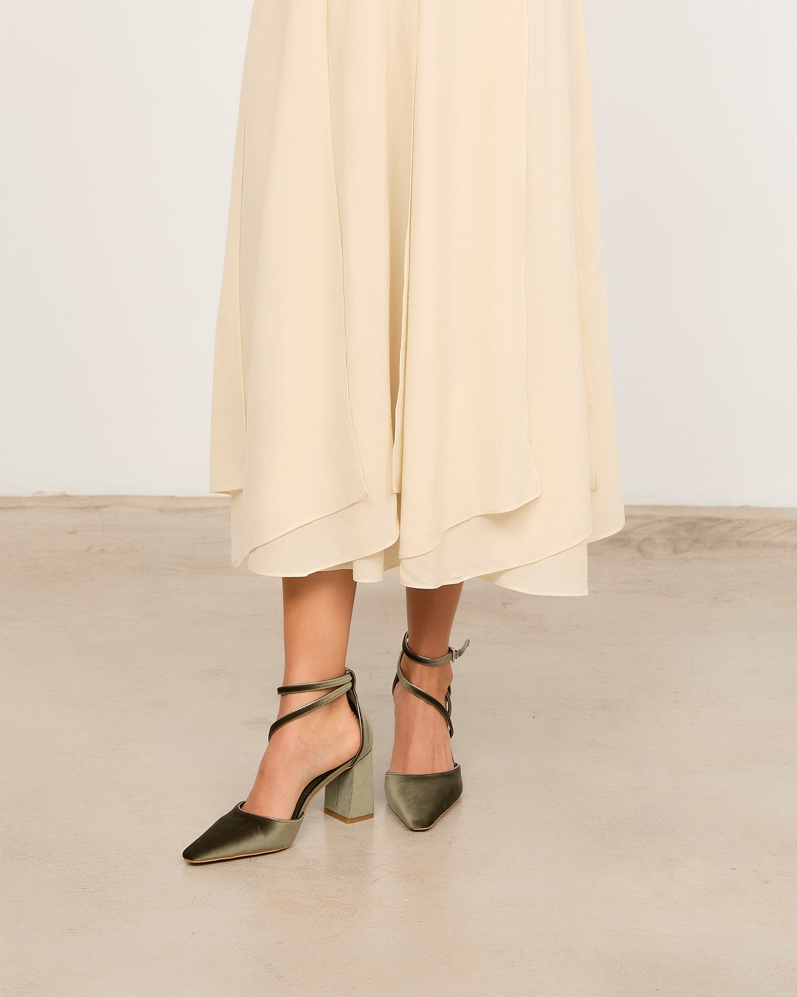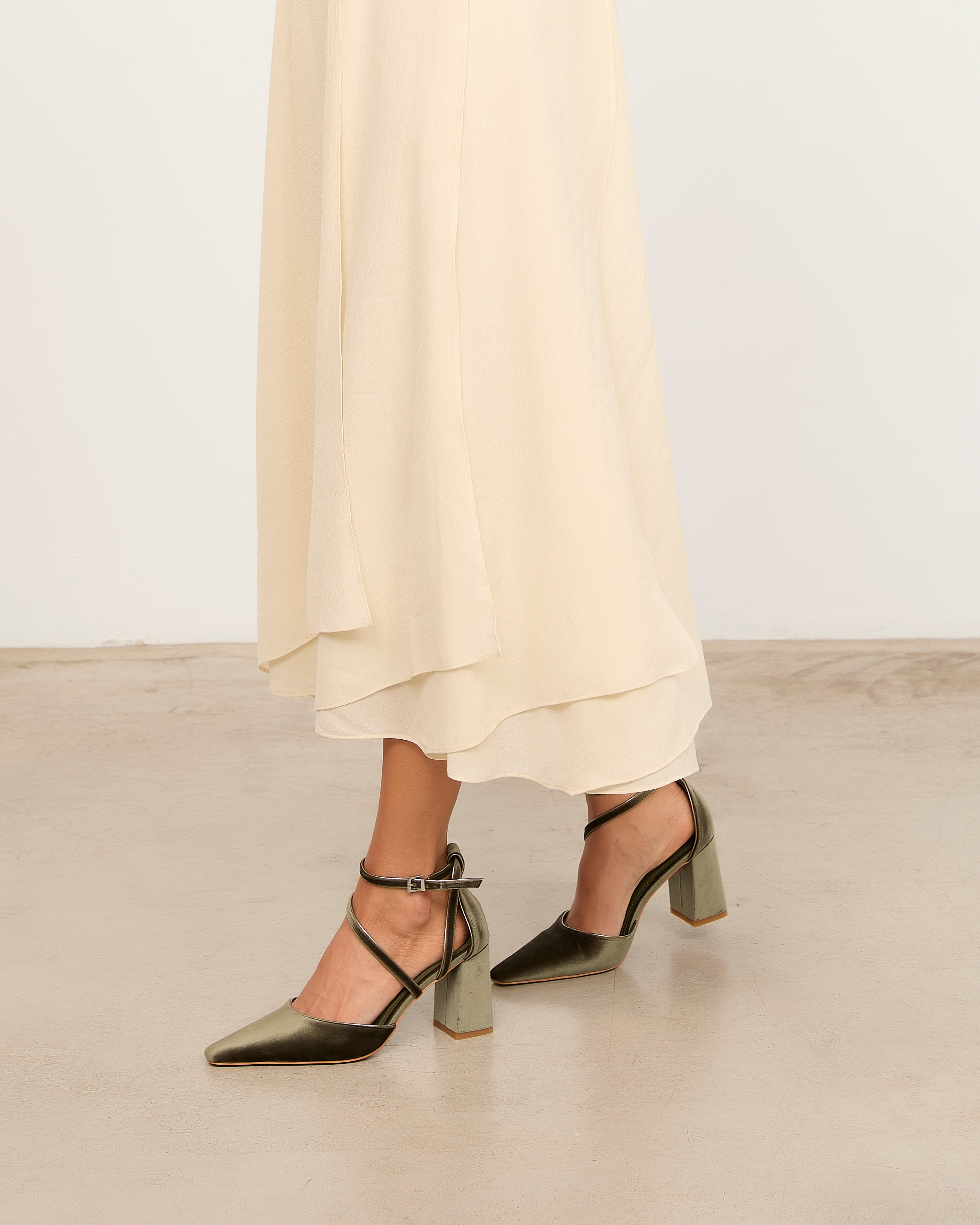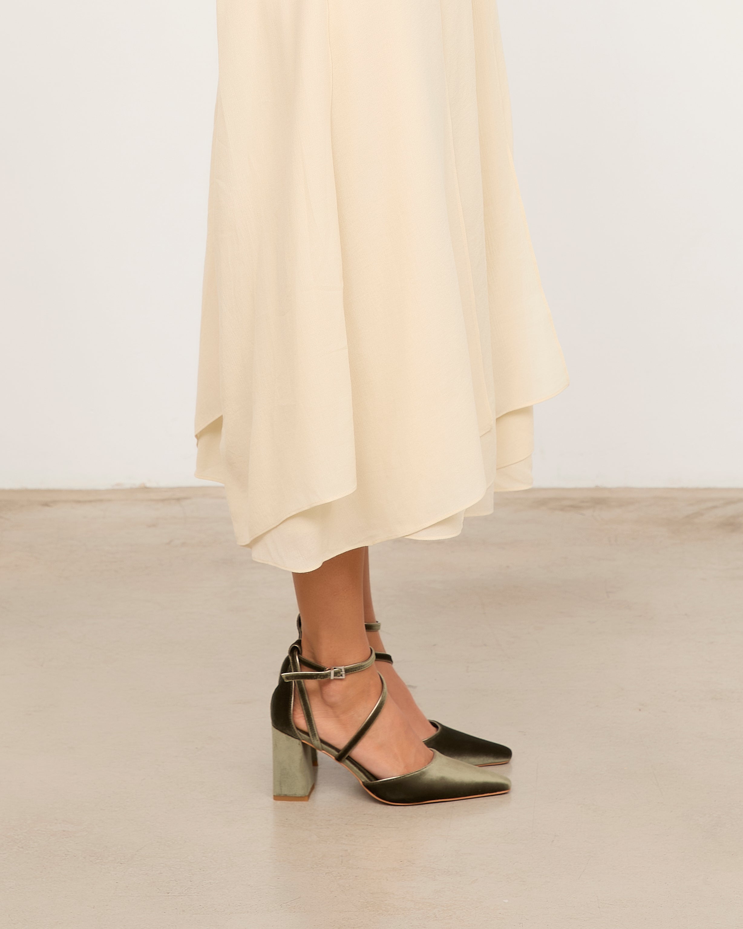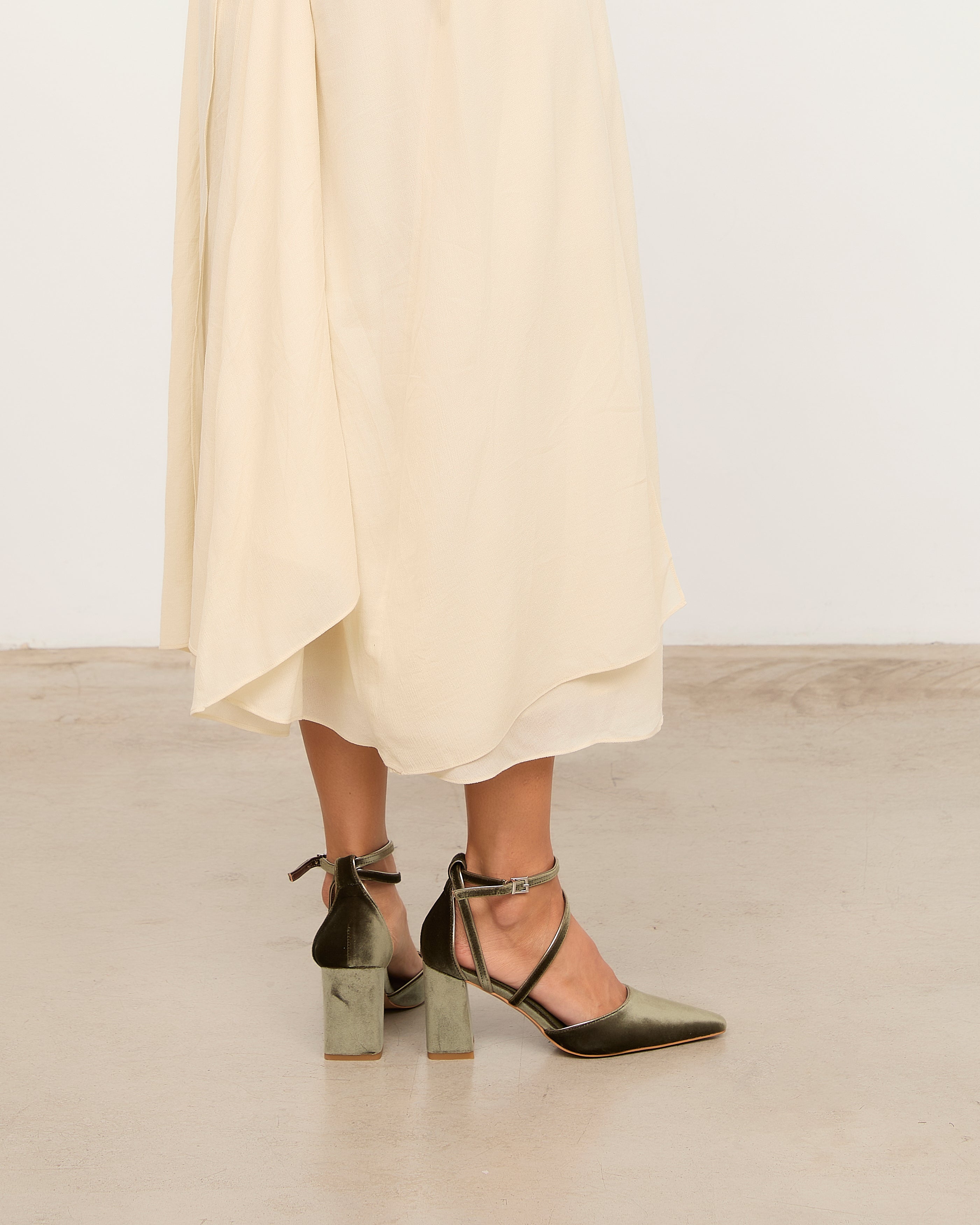 Pointed closed high heel shoe in green suede with metallic trim detail. Heel counter with ankle strap and crossed strap detail on the instep. Square heel.