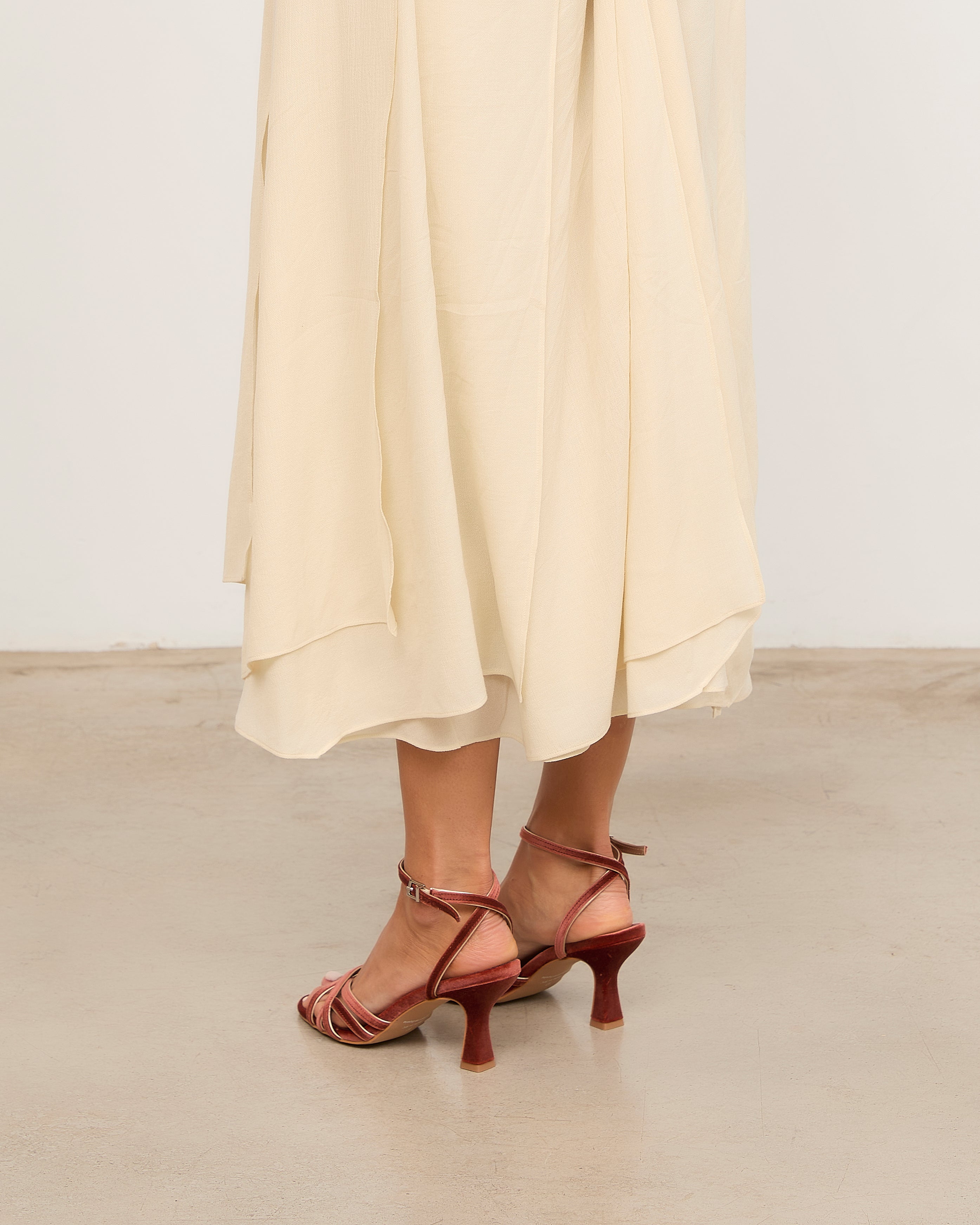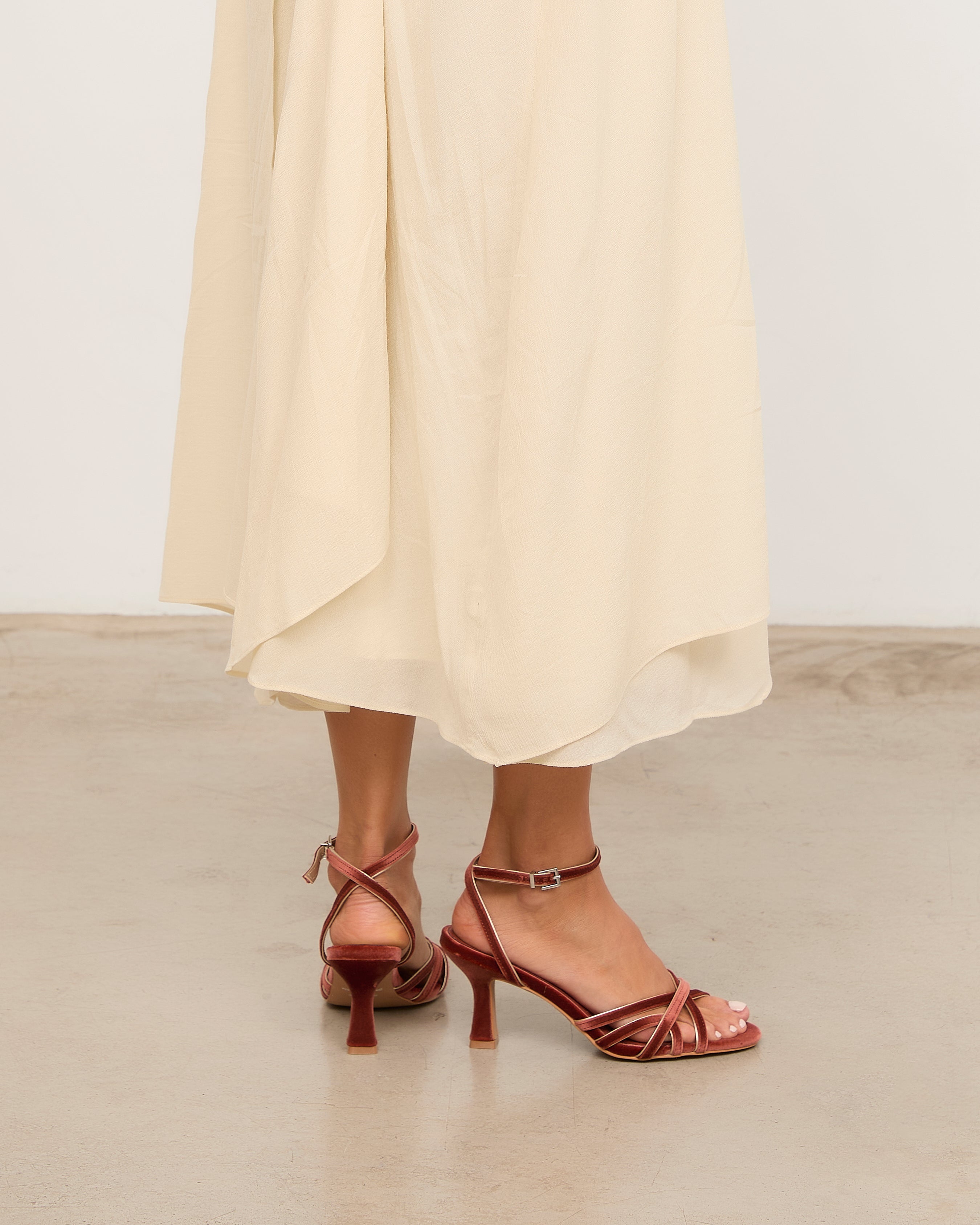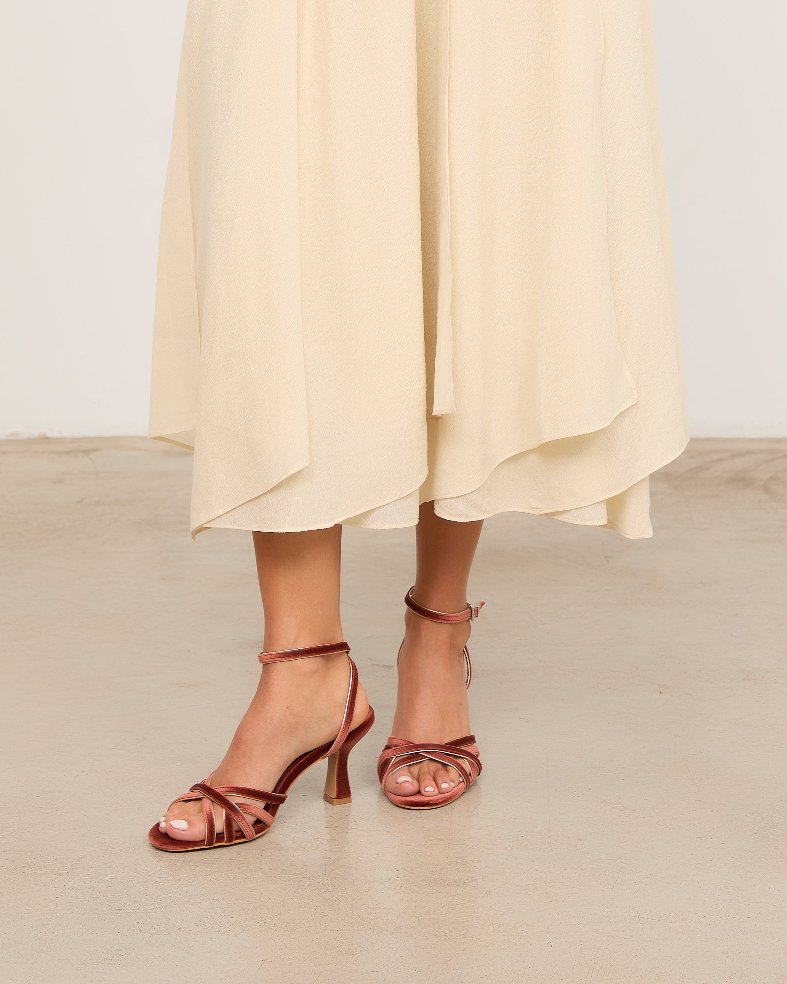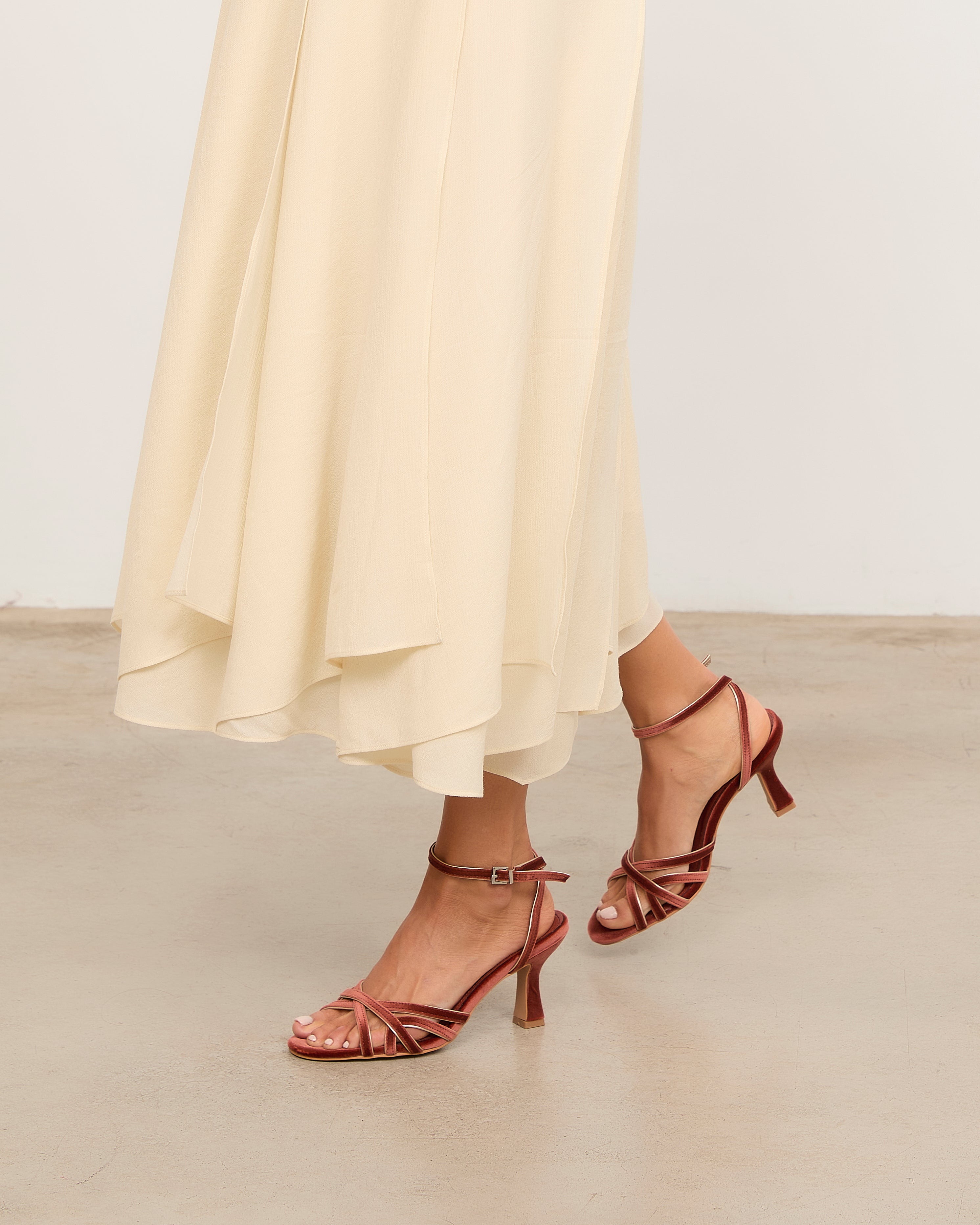 Heeled sandal with rounded toe in brick velvet with metallic trim detail. Front made up of multiple straps joined by a central strap. Back strap for ankle closure with buckle. Thin stiletto heel with wide base.