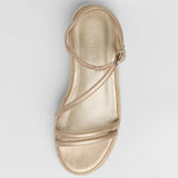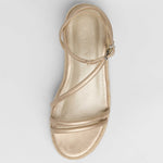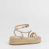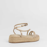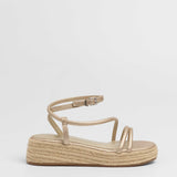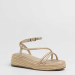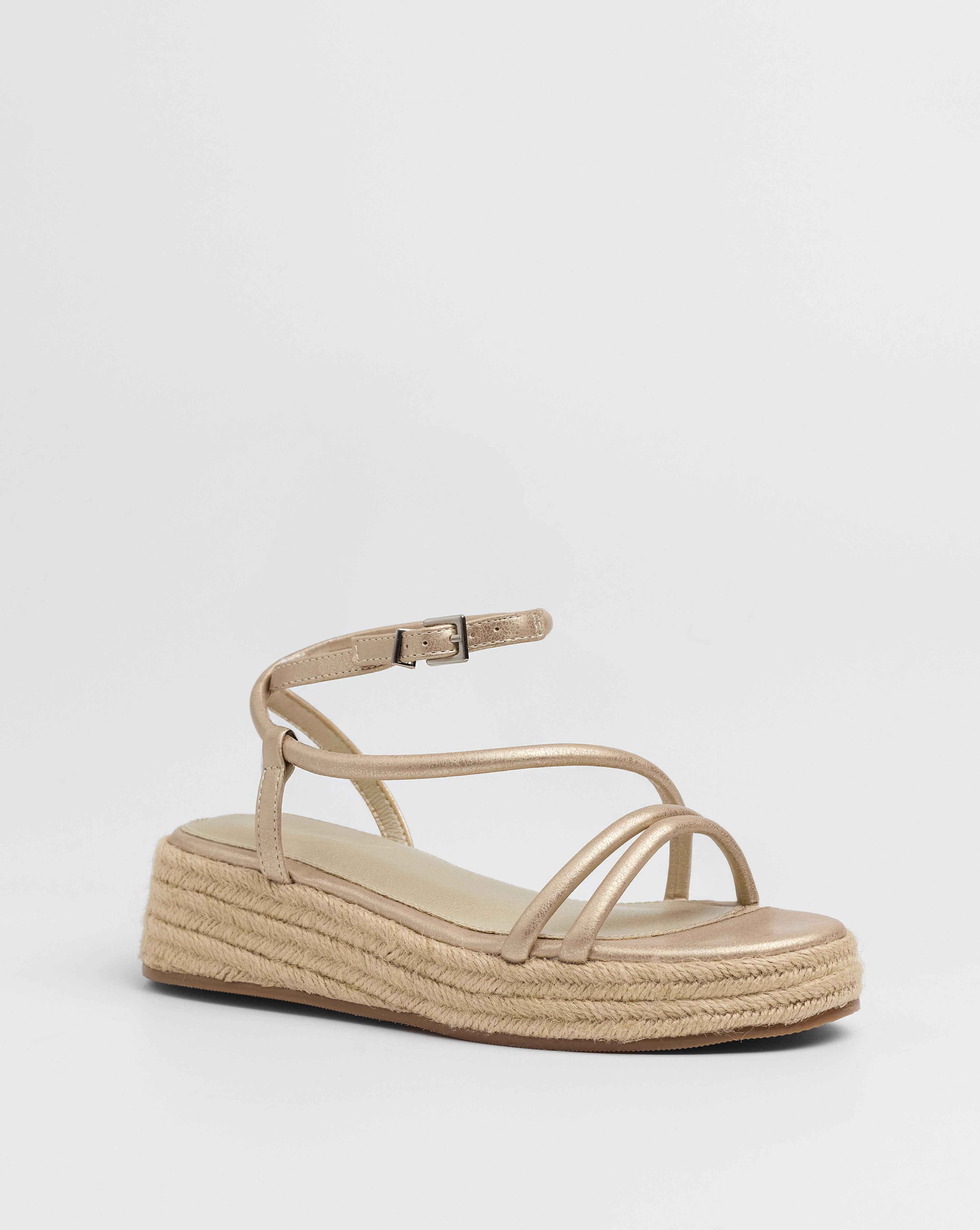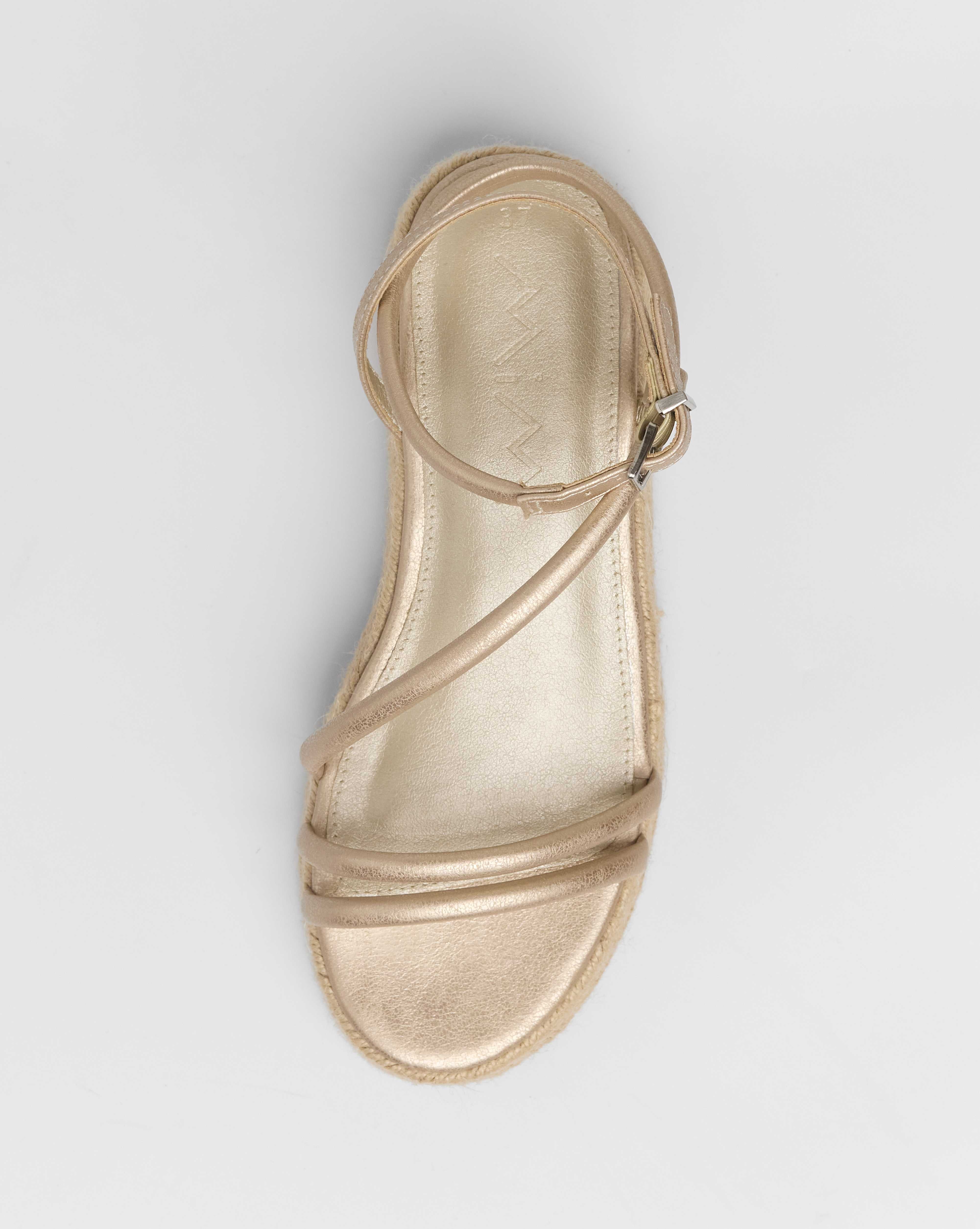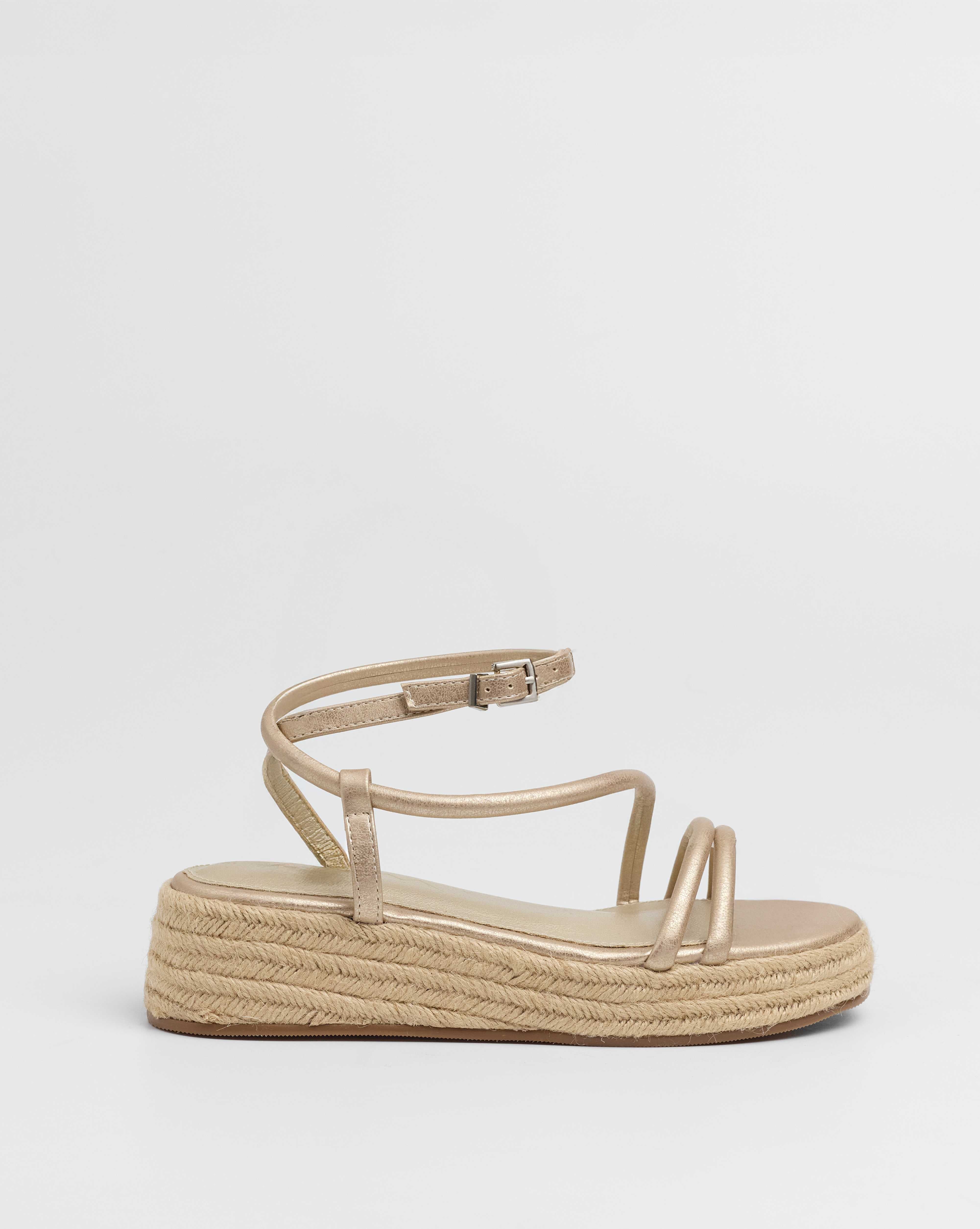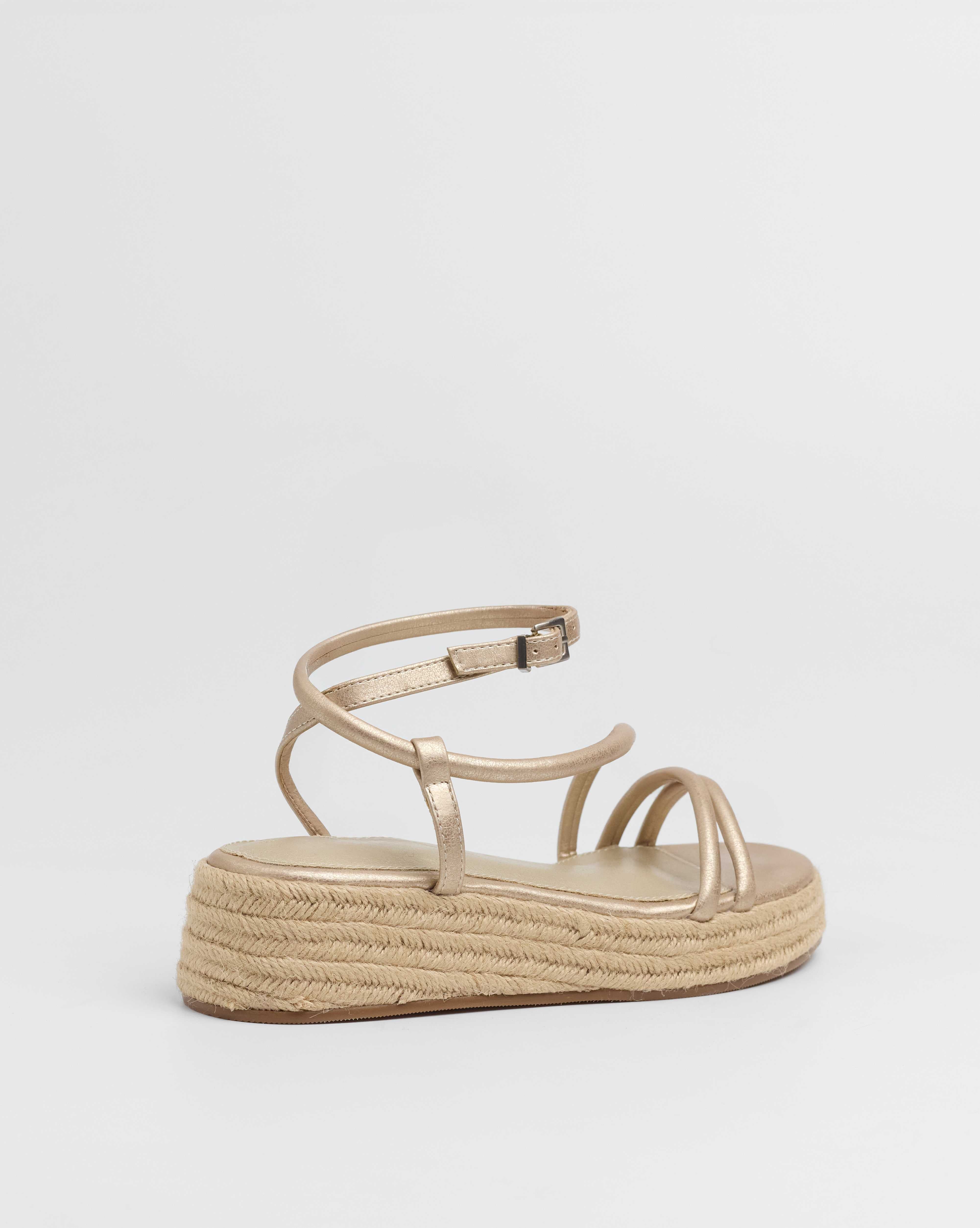 Low platform sandal in esparto grass. Two straps on the front and a thin strap around the ankle in gold vegan leather. Buckle closure.