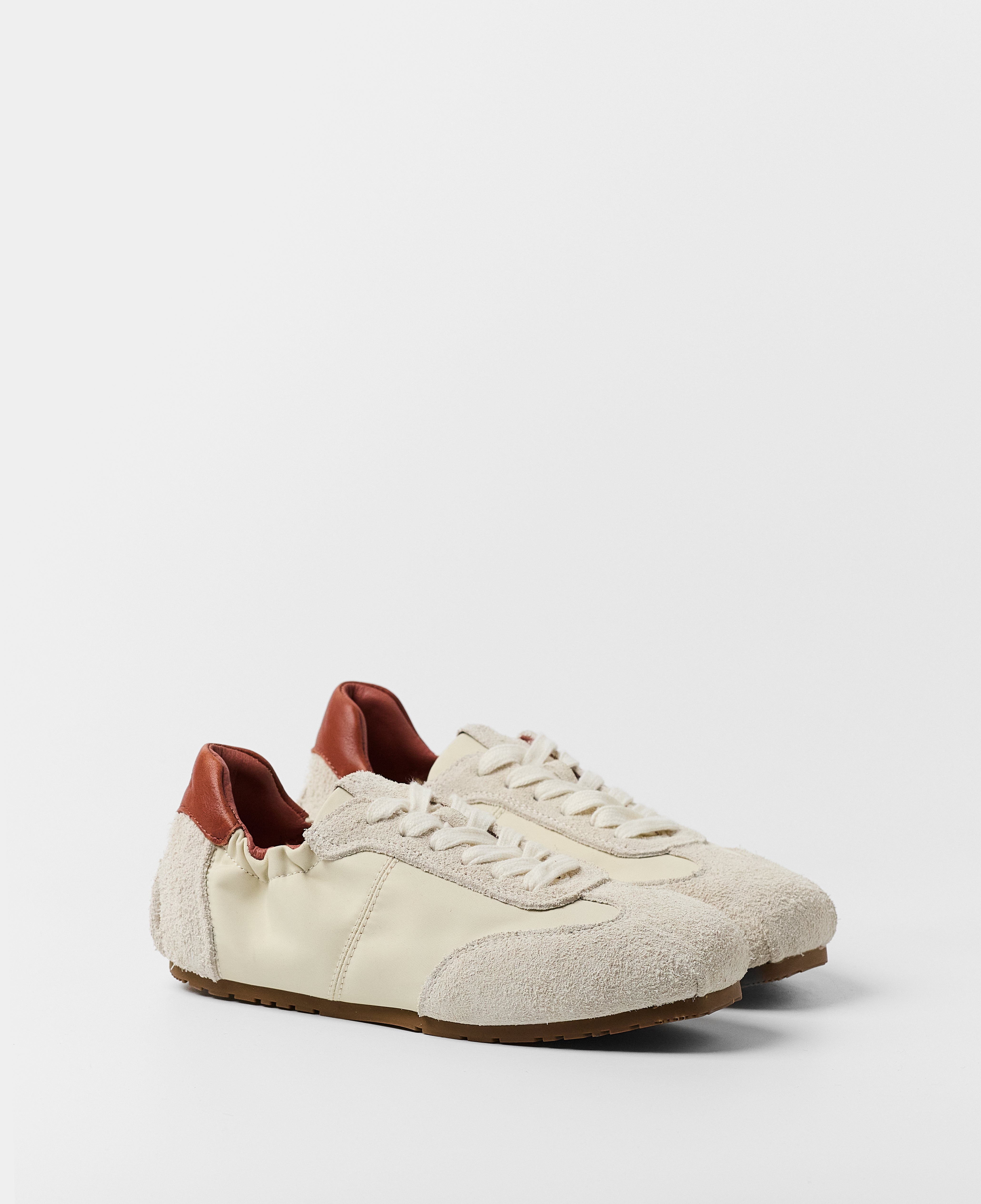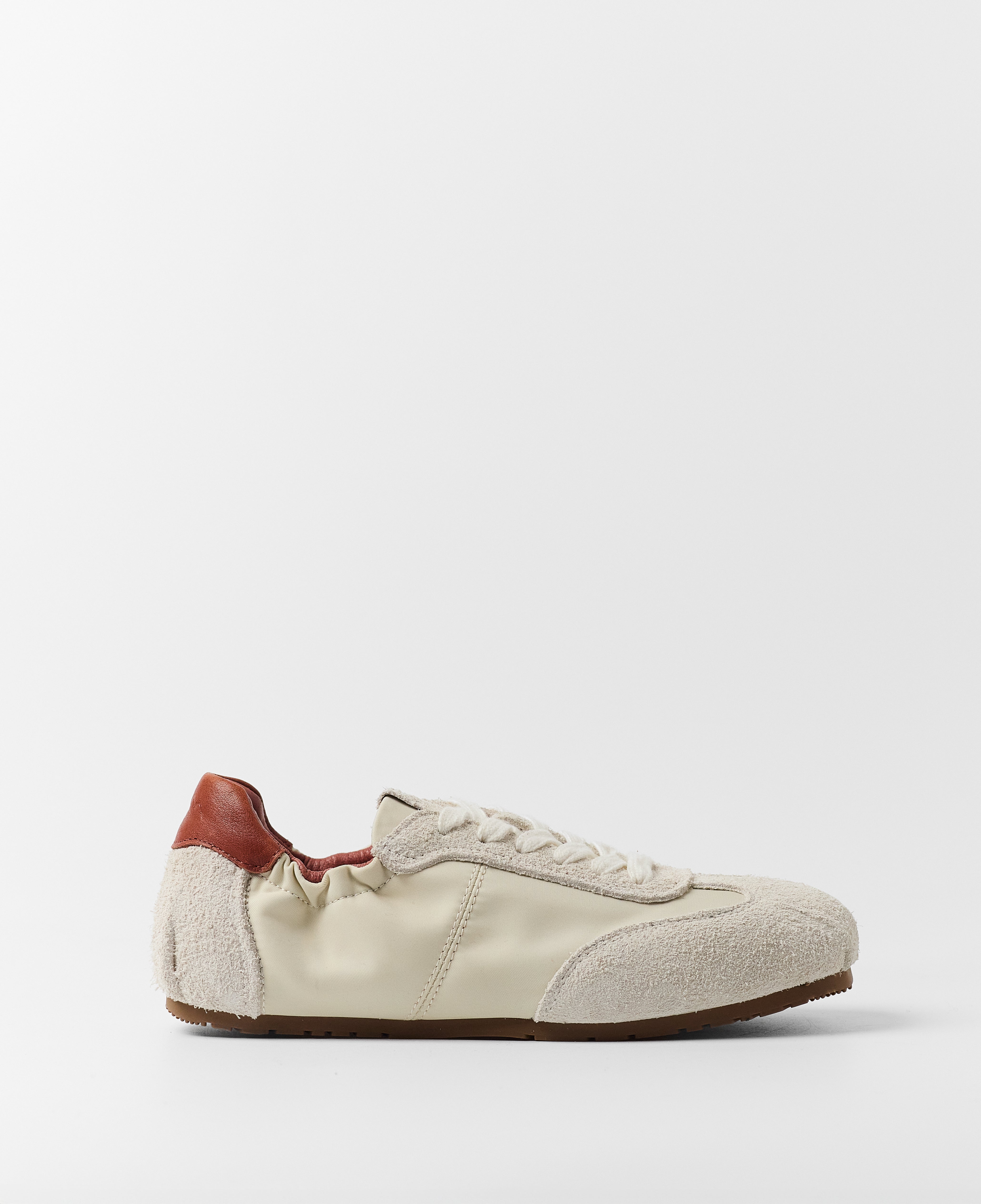 Lace-up shoe in off-white nylon with matching suede details and a contrasting back in tile color.