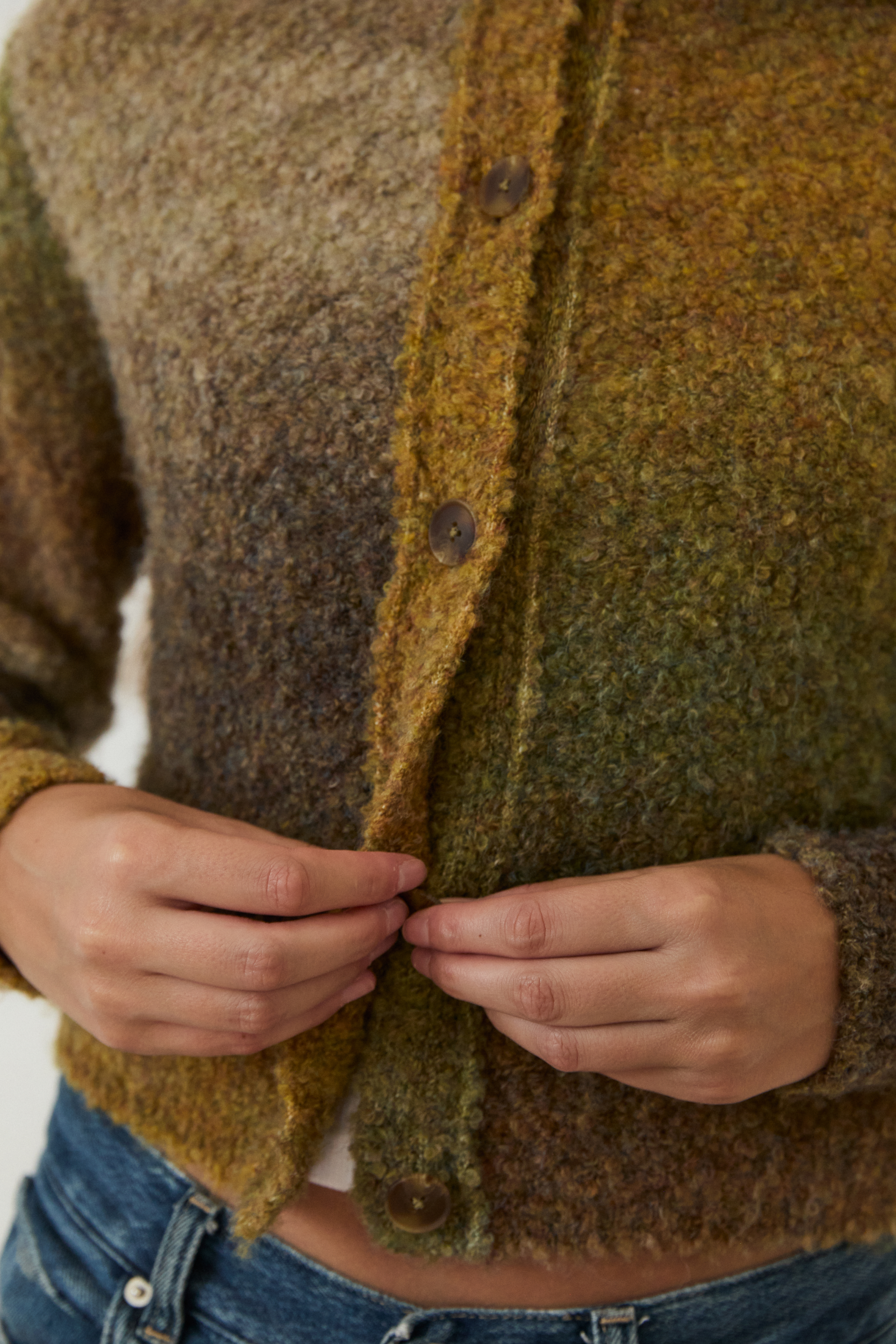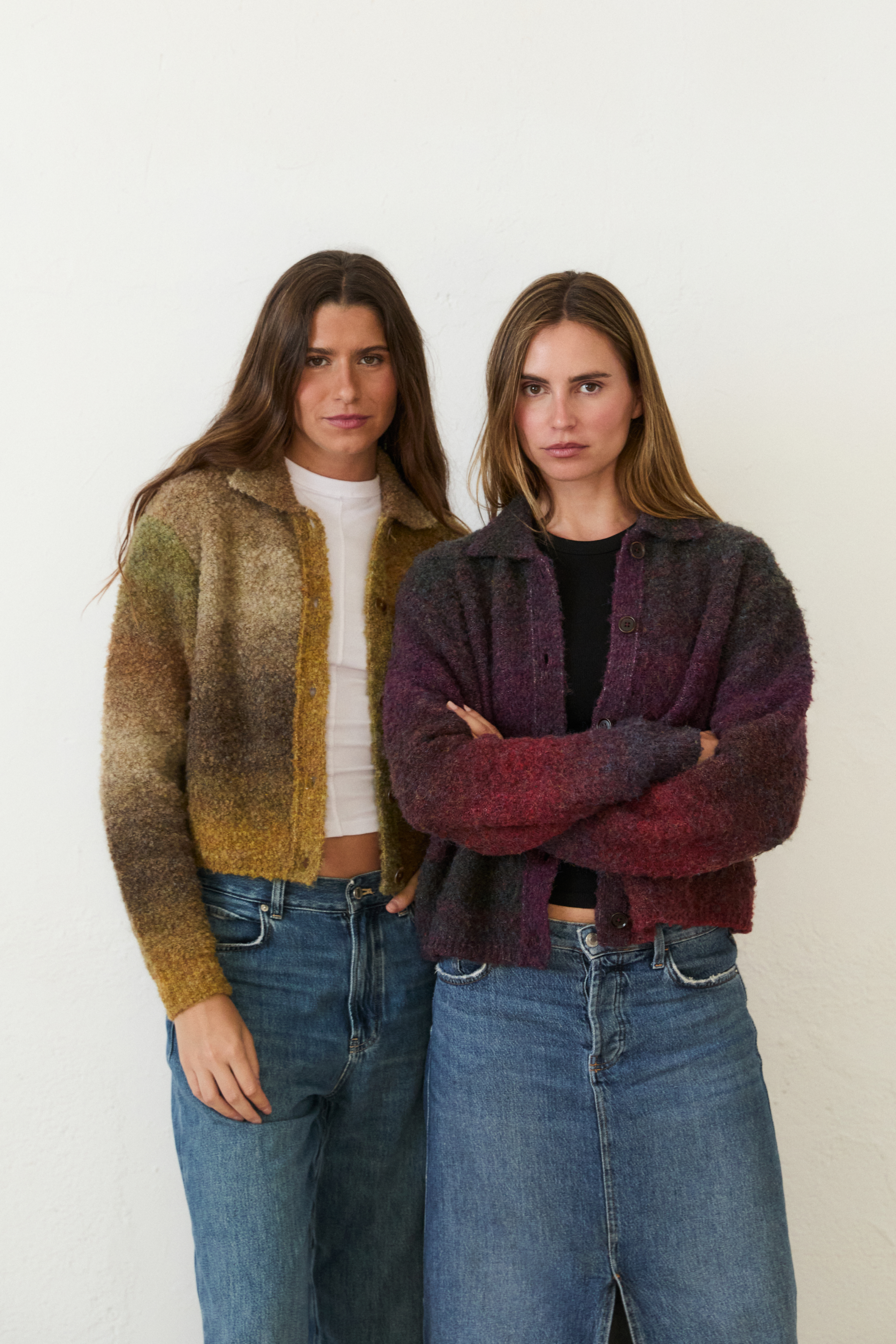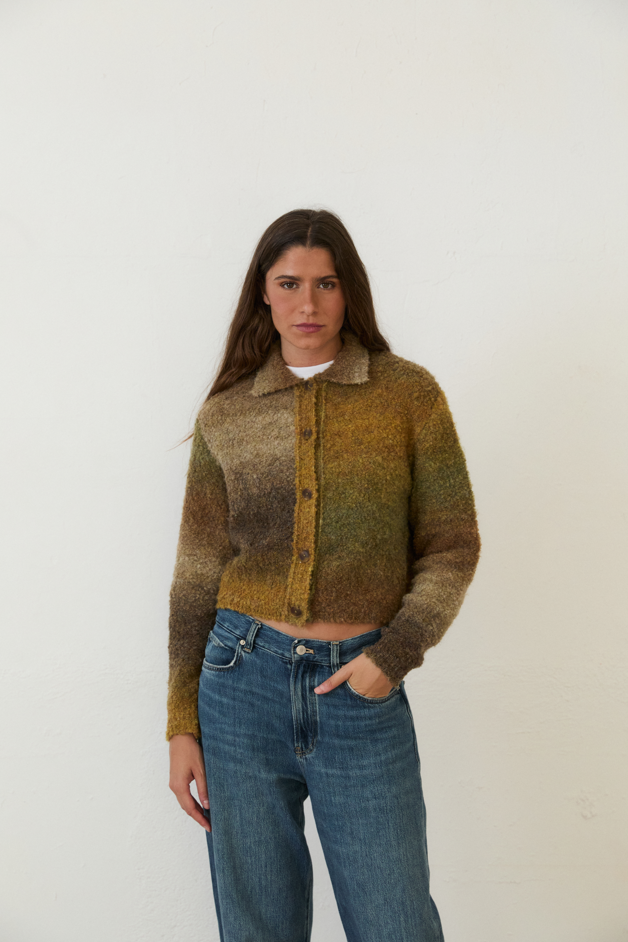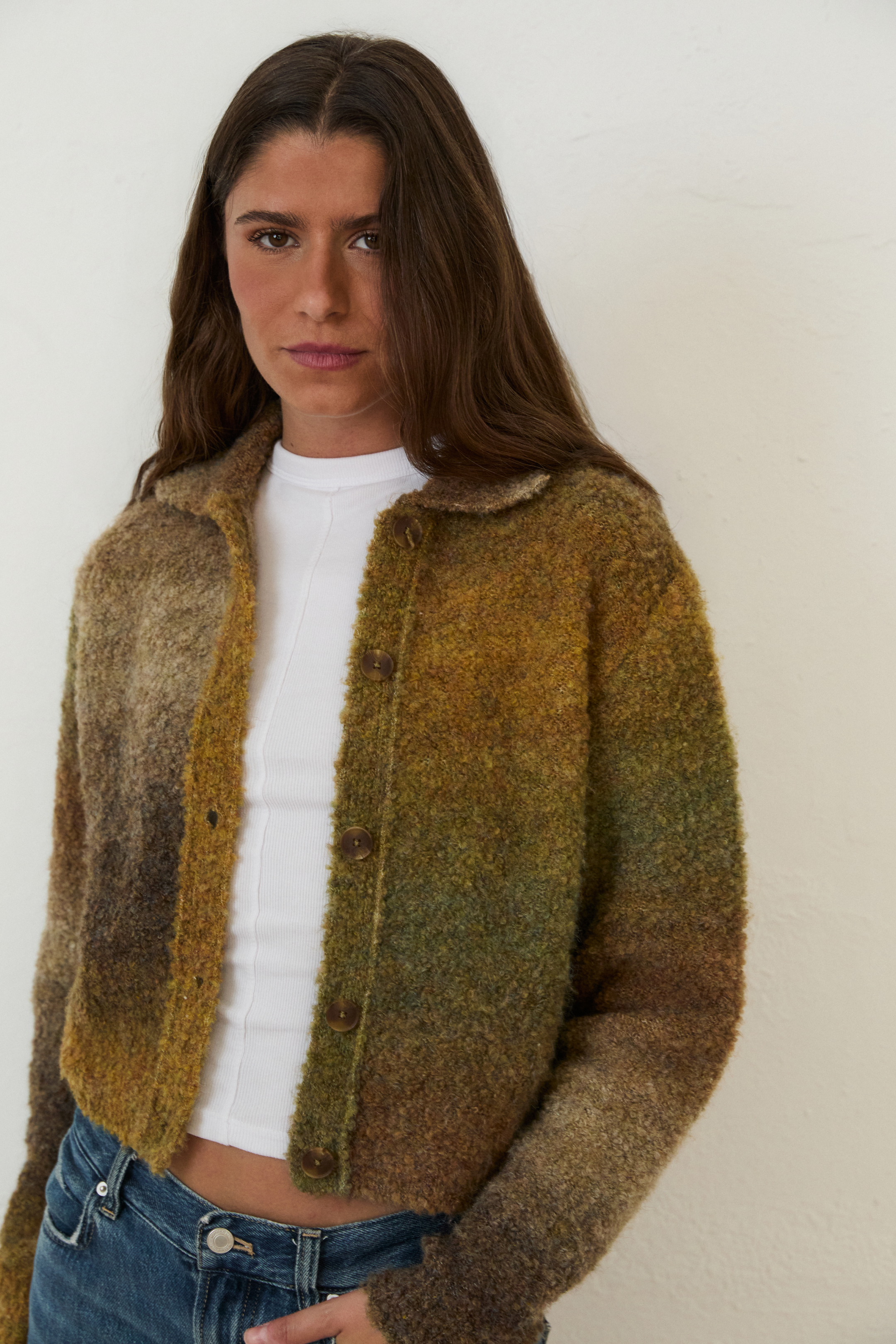 Jacket with a gradient knit collar in greens and yellows. Button closure. Each jacket is unique due to the uneven coloring of the thread used.
