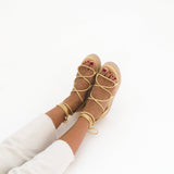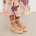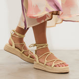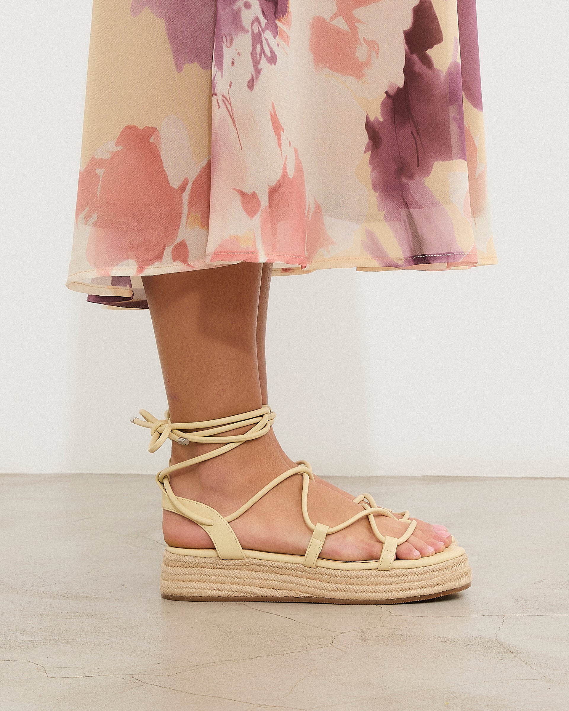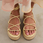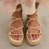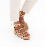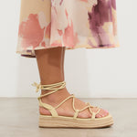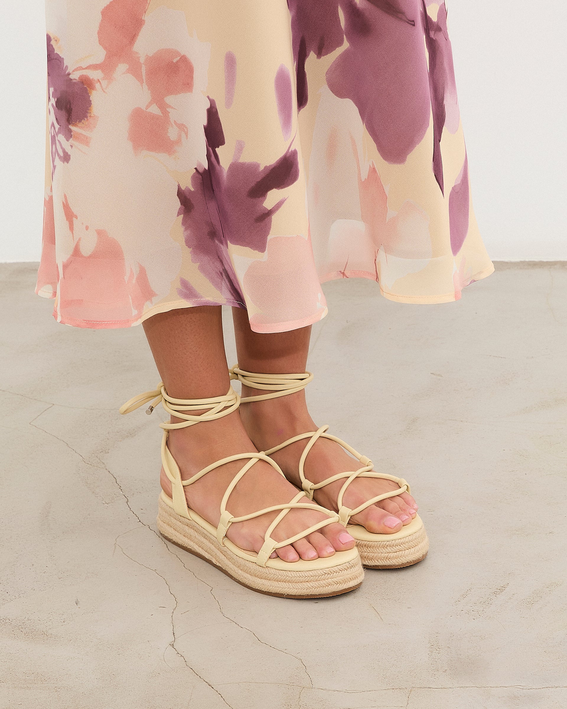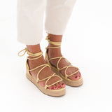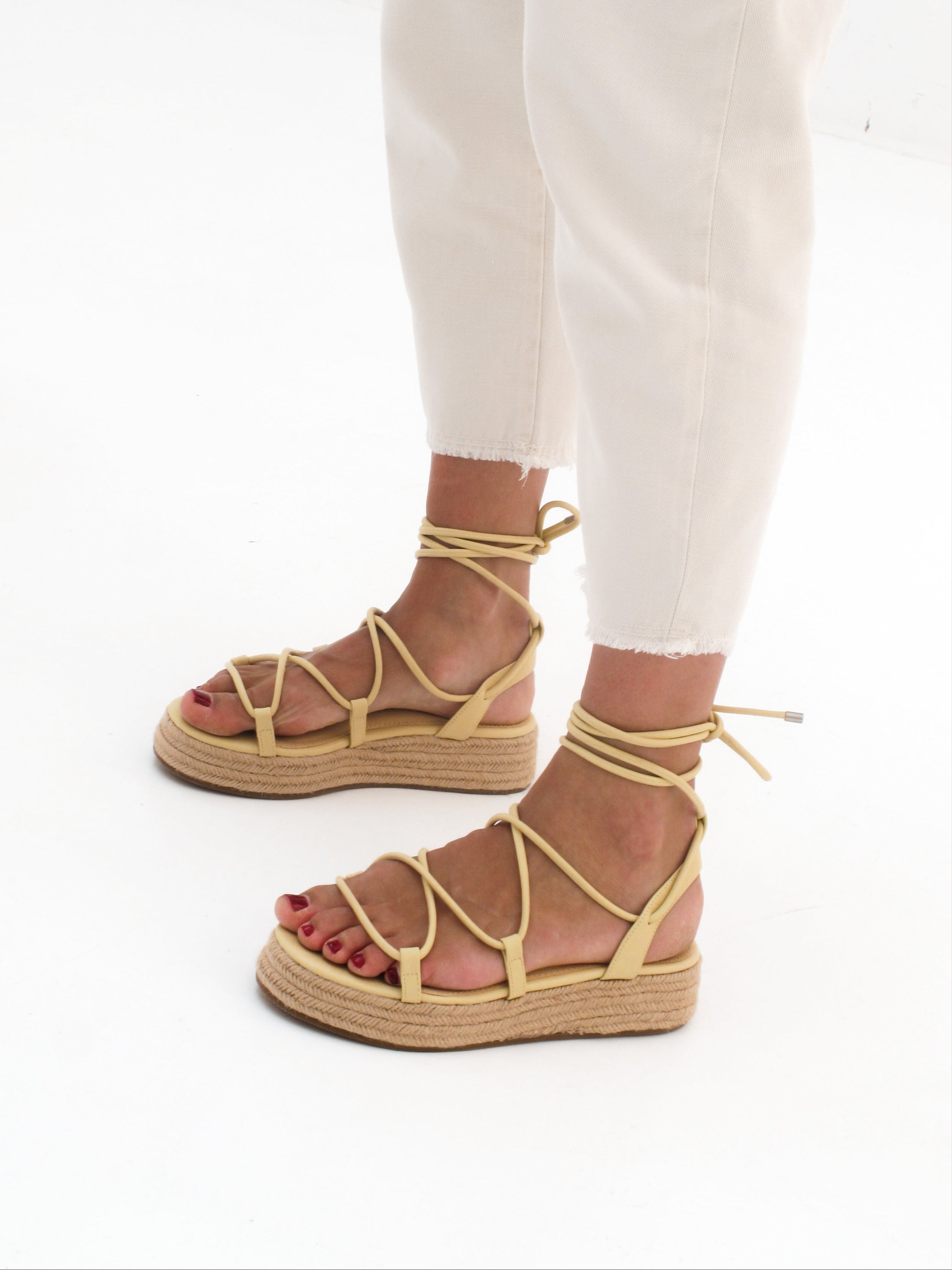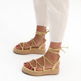 Esparto sandal with a yellow platform. Composed of several tubular straps and a closure with straps tied around the ankle.