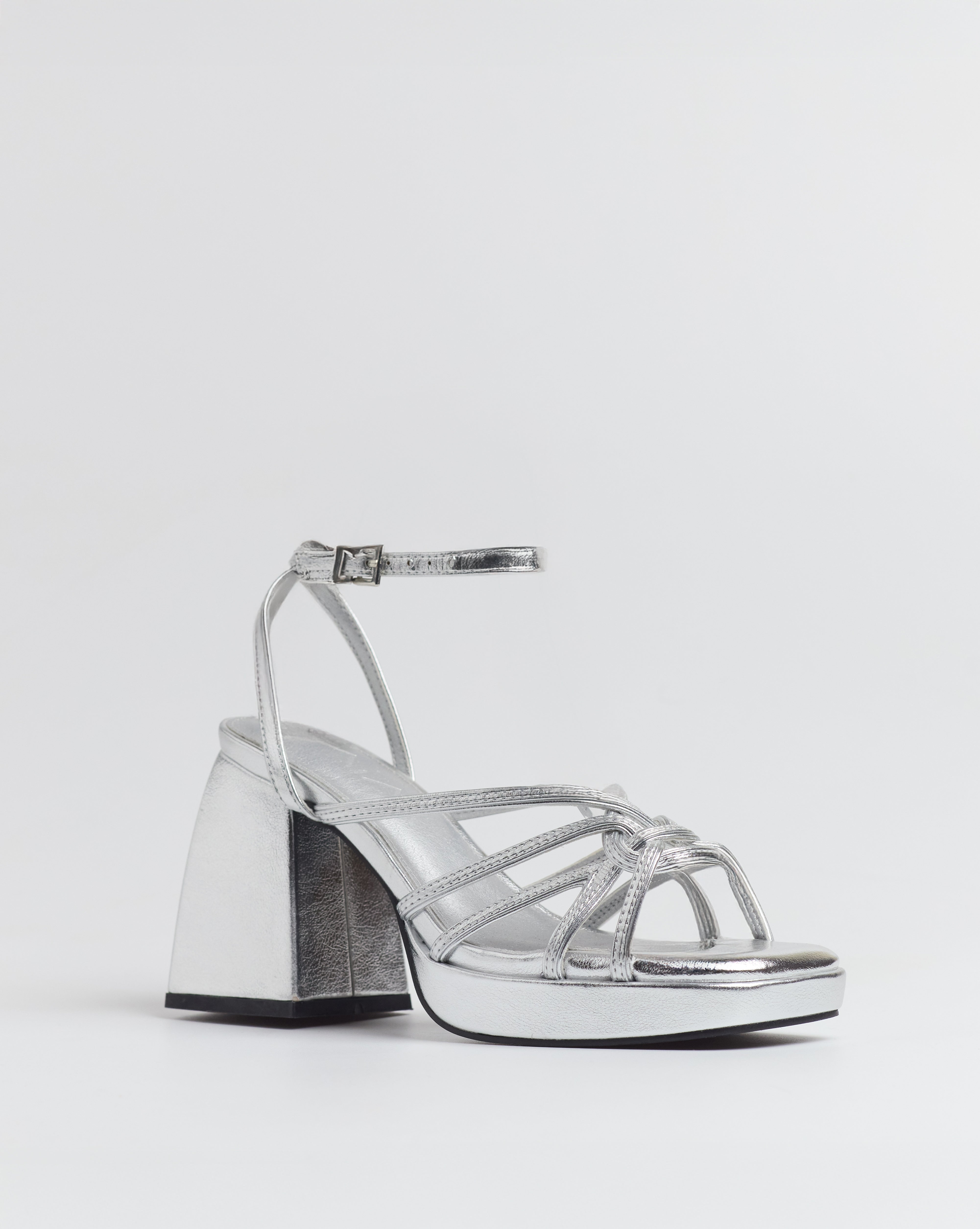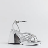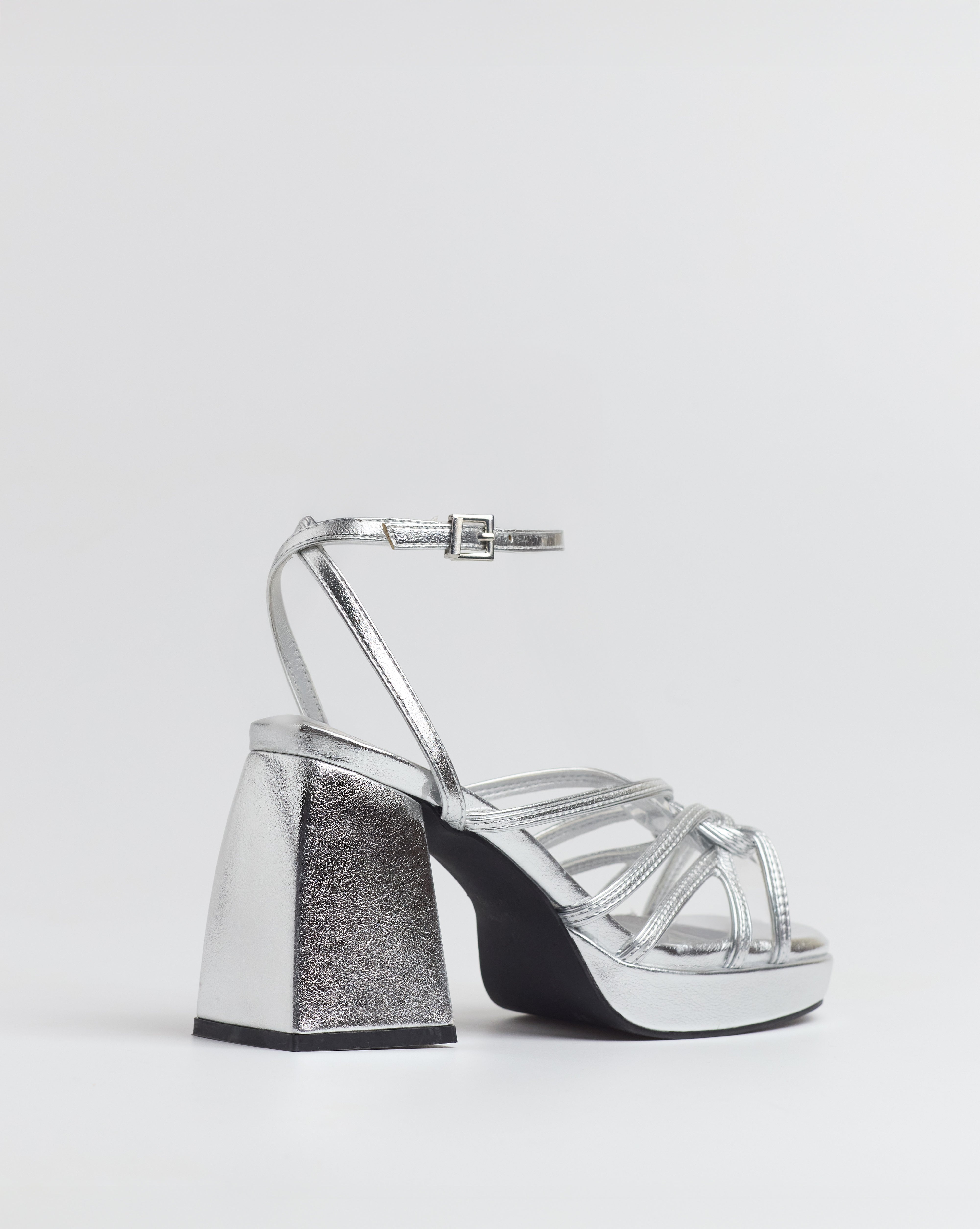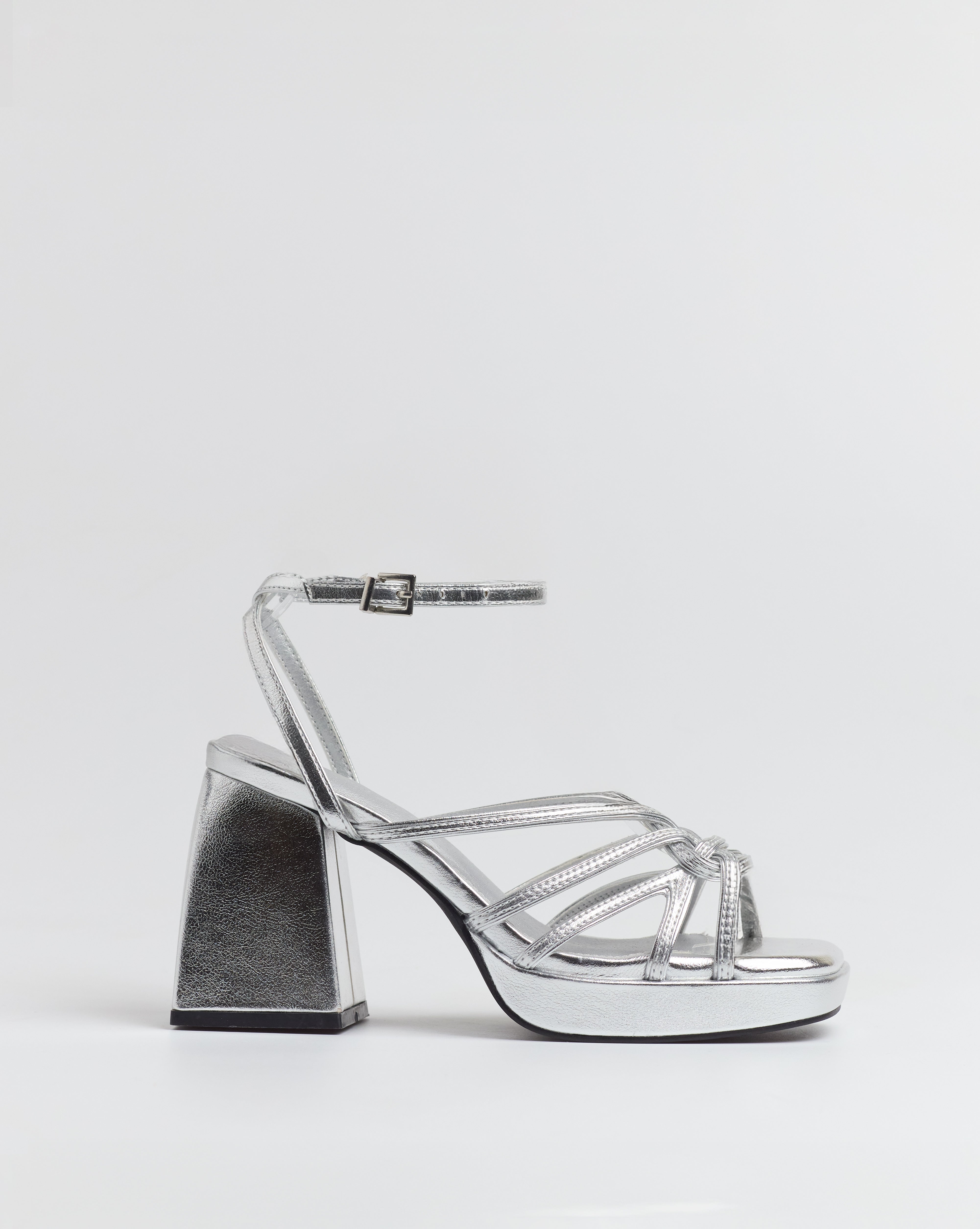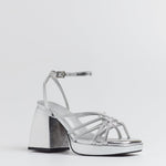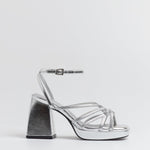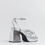 Silver heeled sandal. Square open front with platform and several front straps. Ankle bracelet closure with metal buckle.