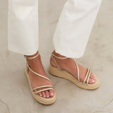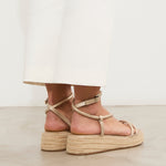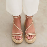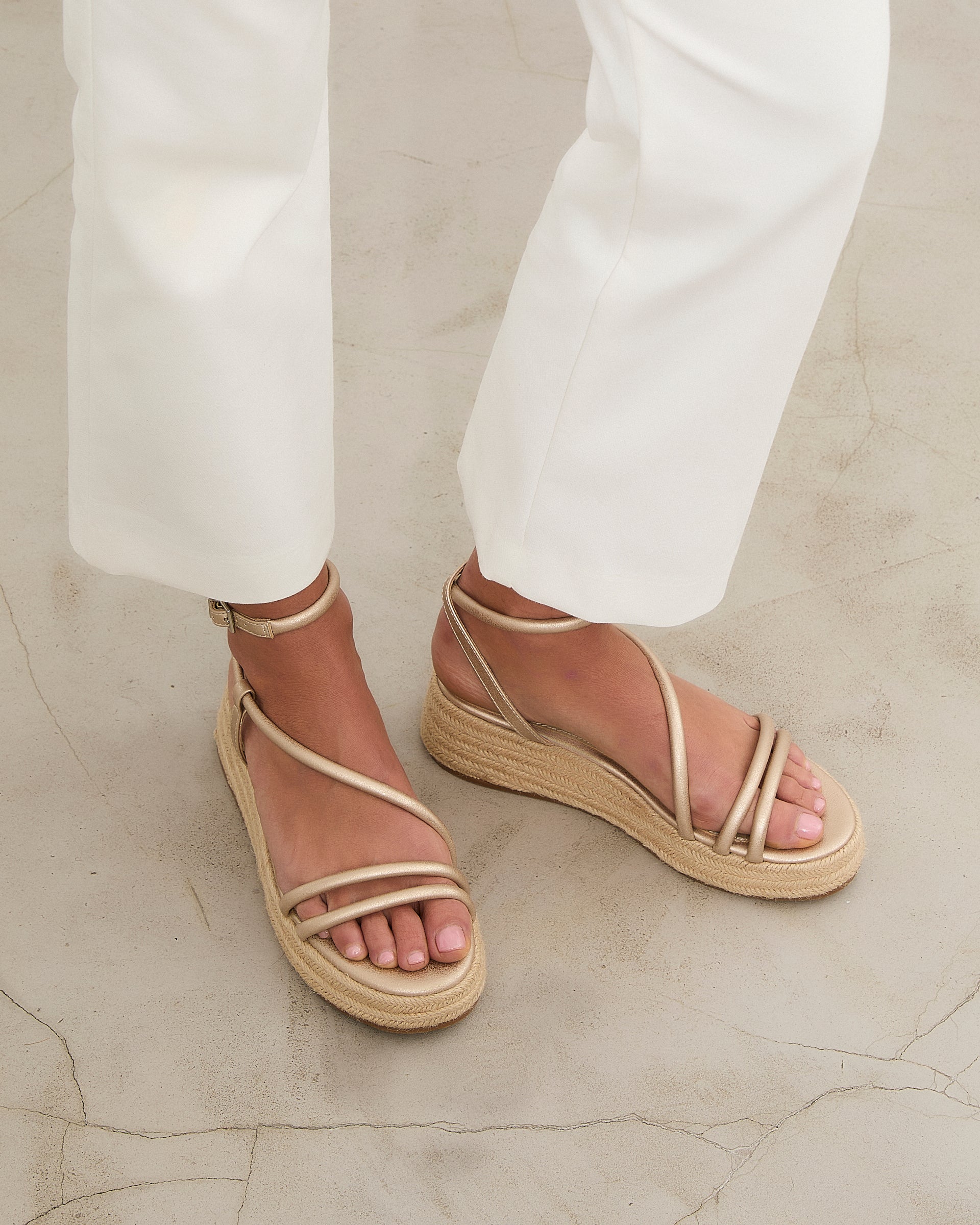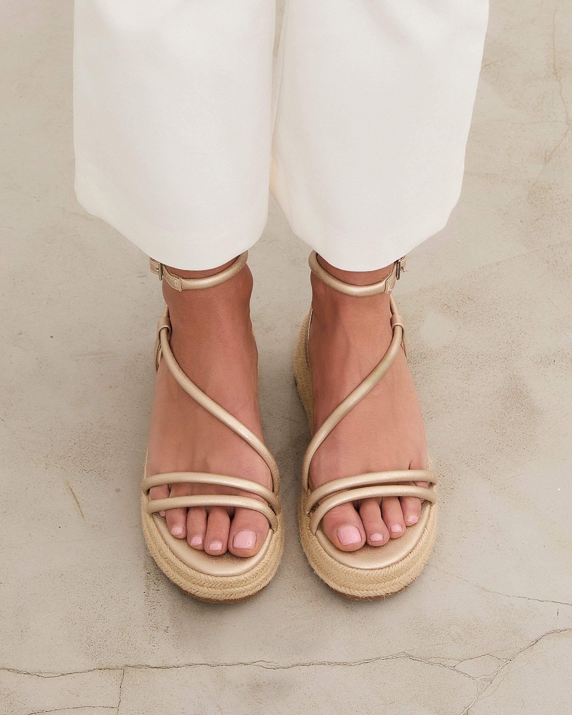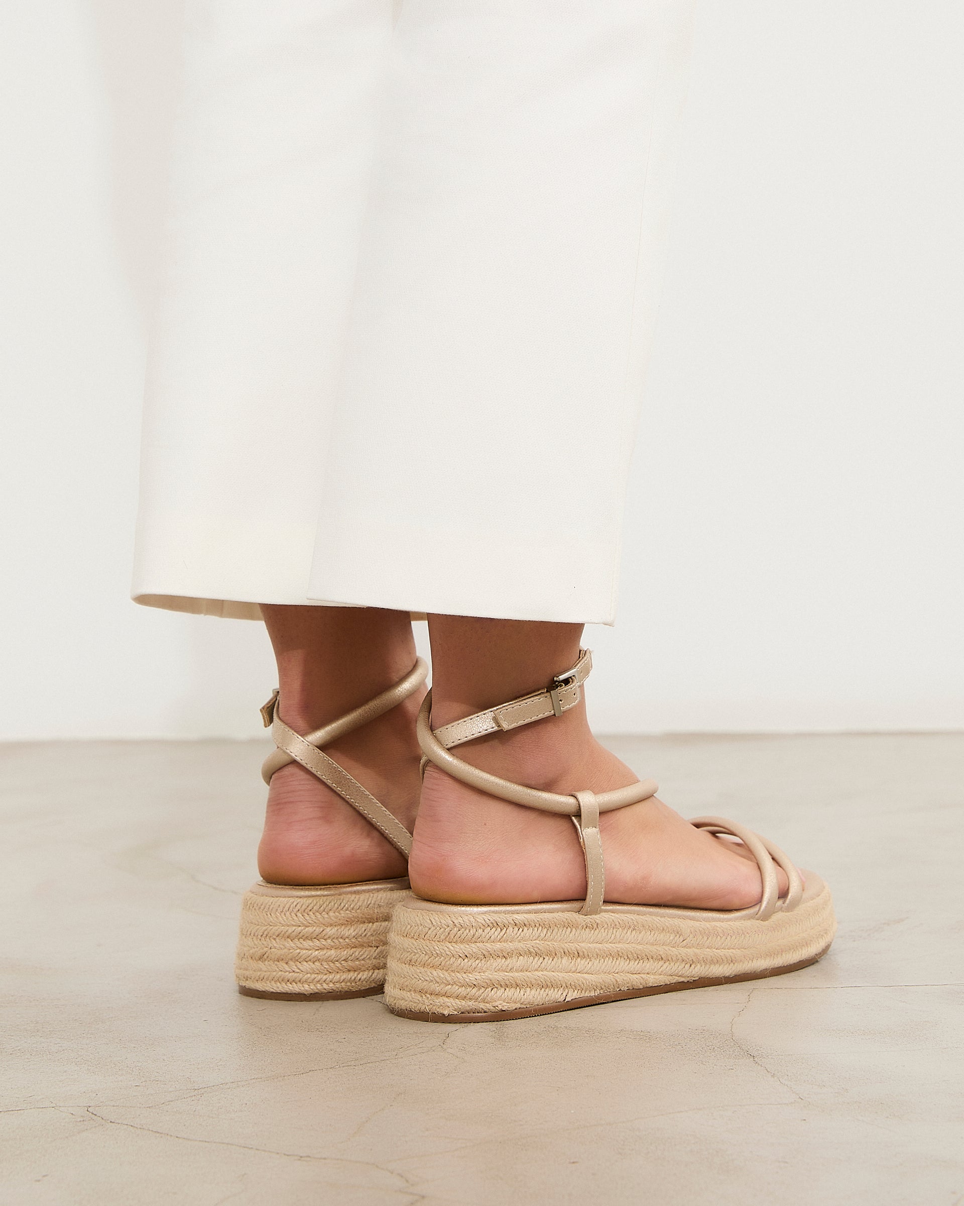 Low platform sandal in esparto grass. Two straps on the front and a thin strap around the ankle in gold vegan leather. Buckle closure.