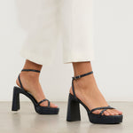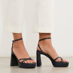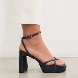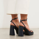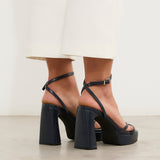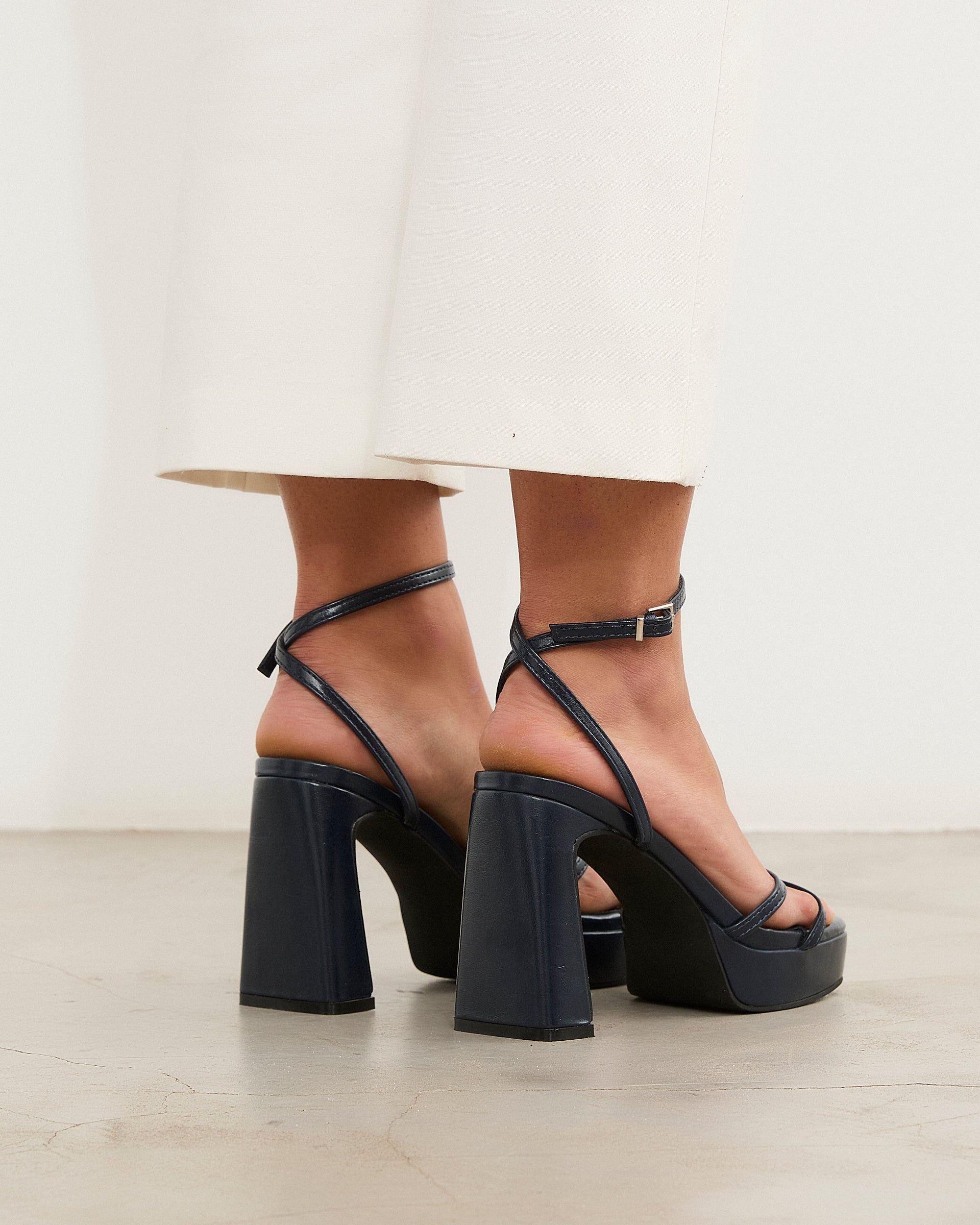 Navy blue heeled sandal with platform. Open front with straps and rectangular heel. Ankle strap closure with metal buckle.