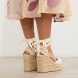High platform espadrille in beige canvas. Closed front and strap to tie around the ankle.