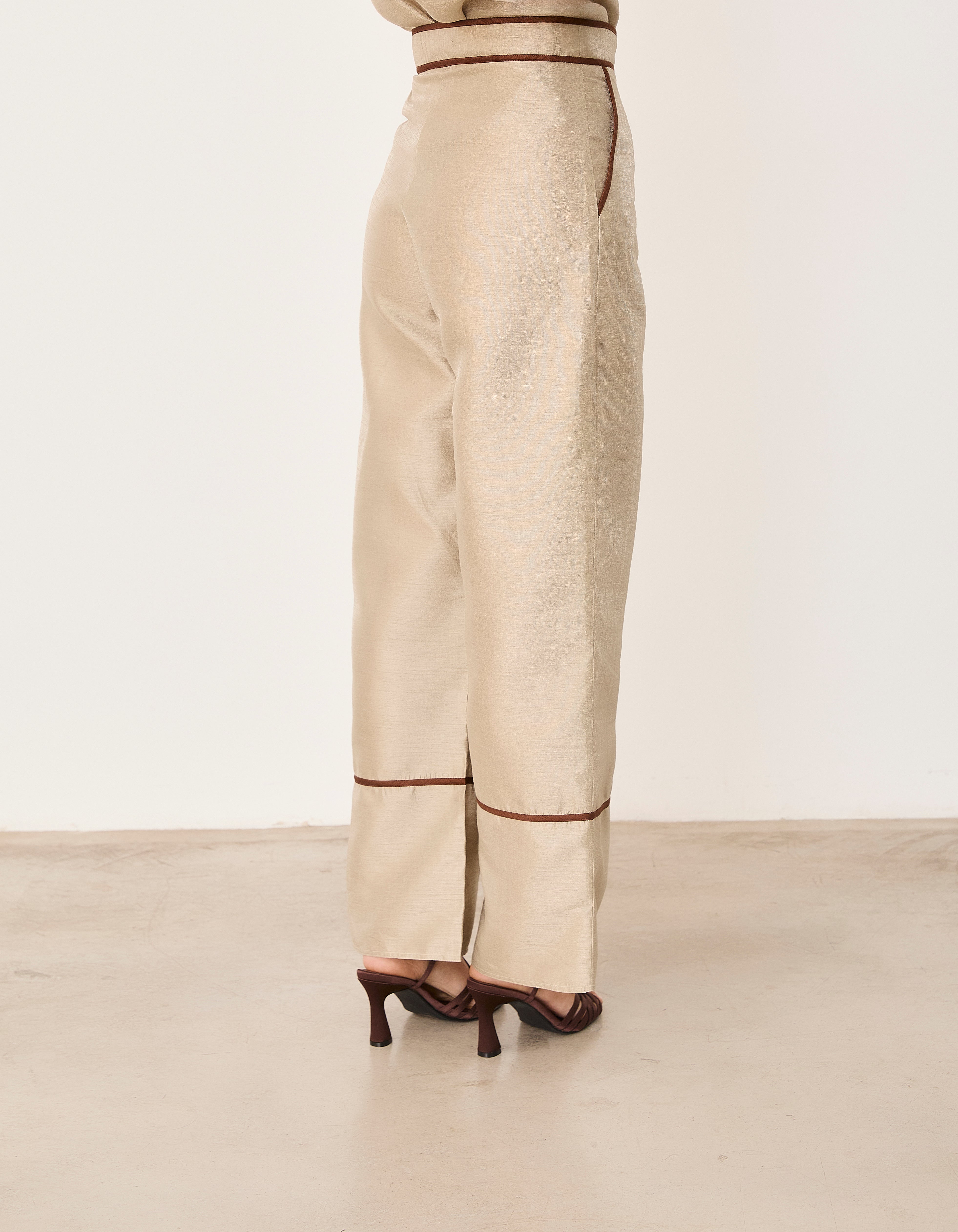 Button-up blouse, wild silk-effect fabric in aquamarine color with contrasting chocolate trim, puffed sleeves, and straight cut.