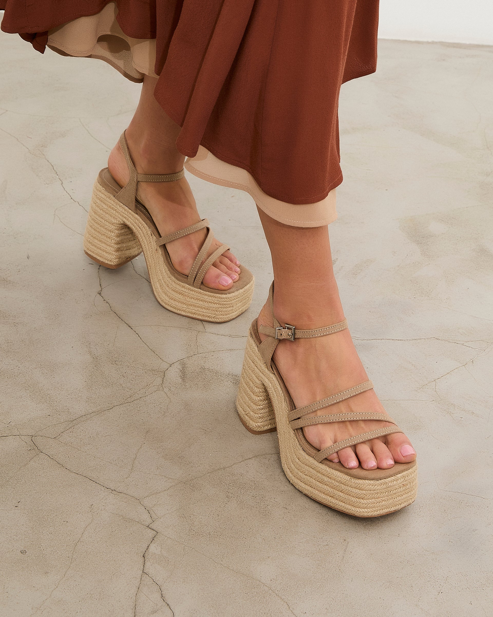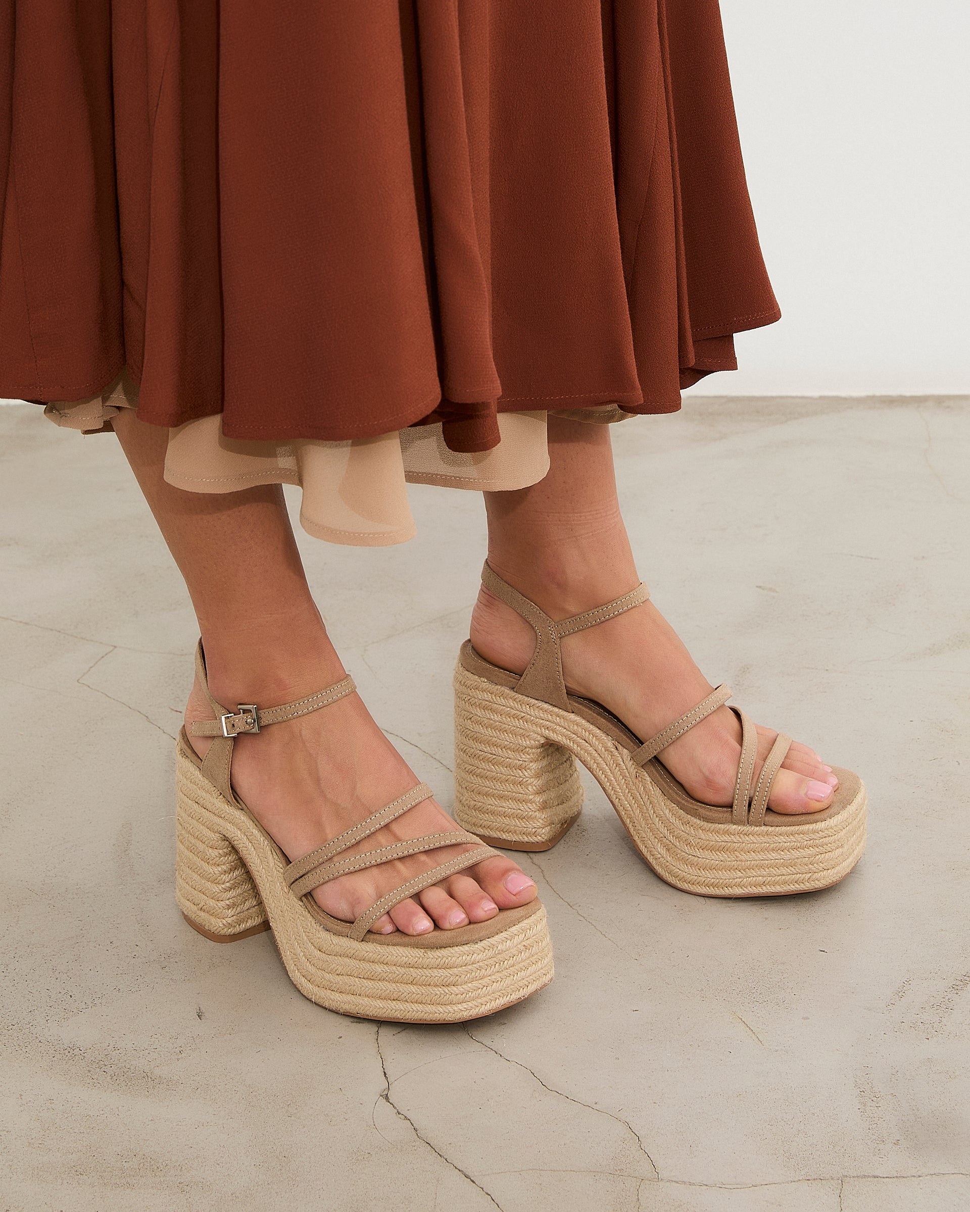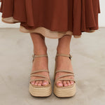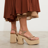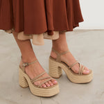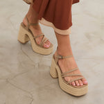 Ecru-colored heeled sandal with XL platform in esparto and rounded toe. Three front straps and ankle strap with buckle closure. Square heel.