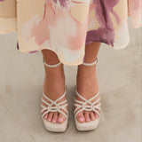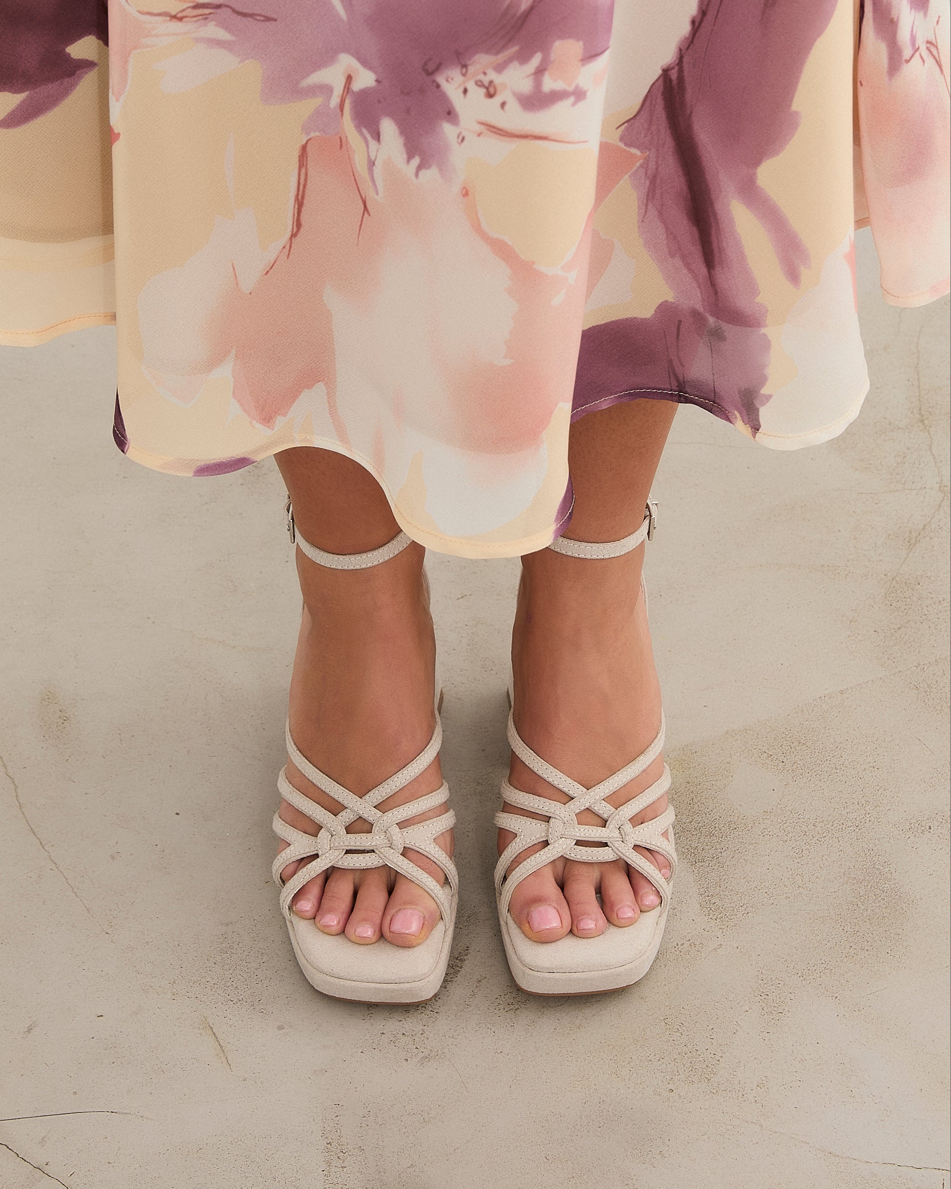 Sandalia de tacón con plataforma en color topo. Parte delantera con varias tiras delanteras entrecruzadas. Cierre de pulsera al tobillo con hebilla metálica.