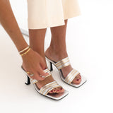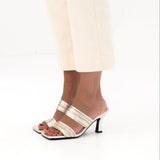 Sandalia de tacon fino geometrico en color plata y dorado. Compuesto por dos franjas de tiras finas en estos dos colores.