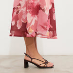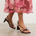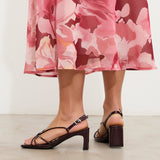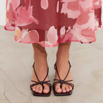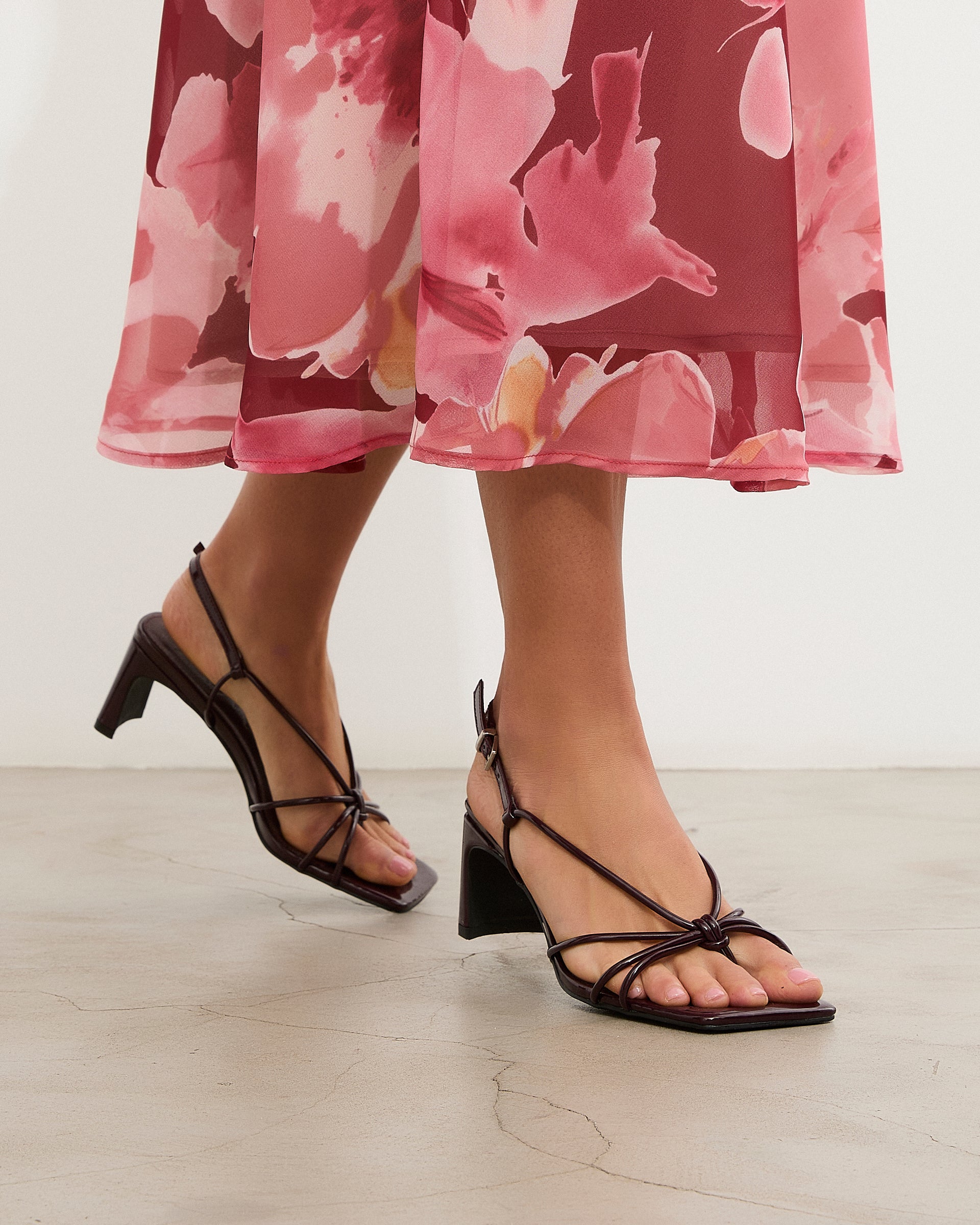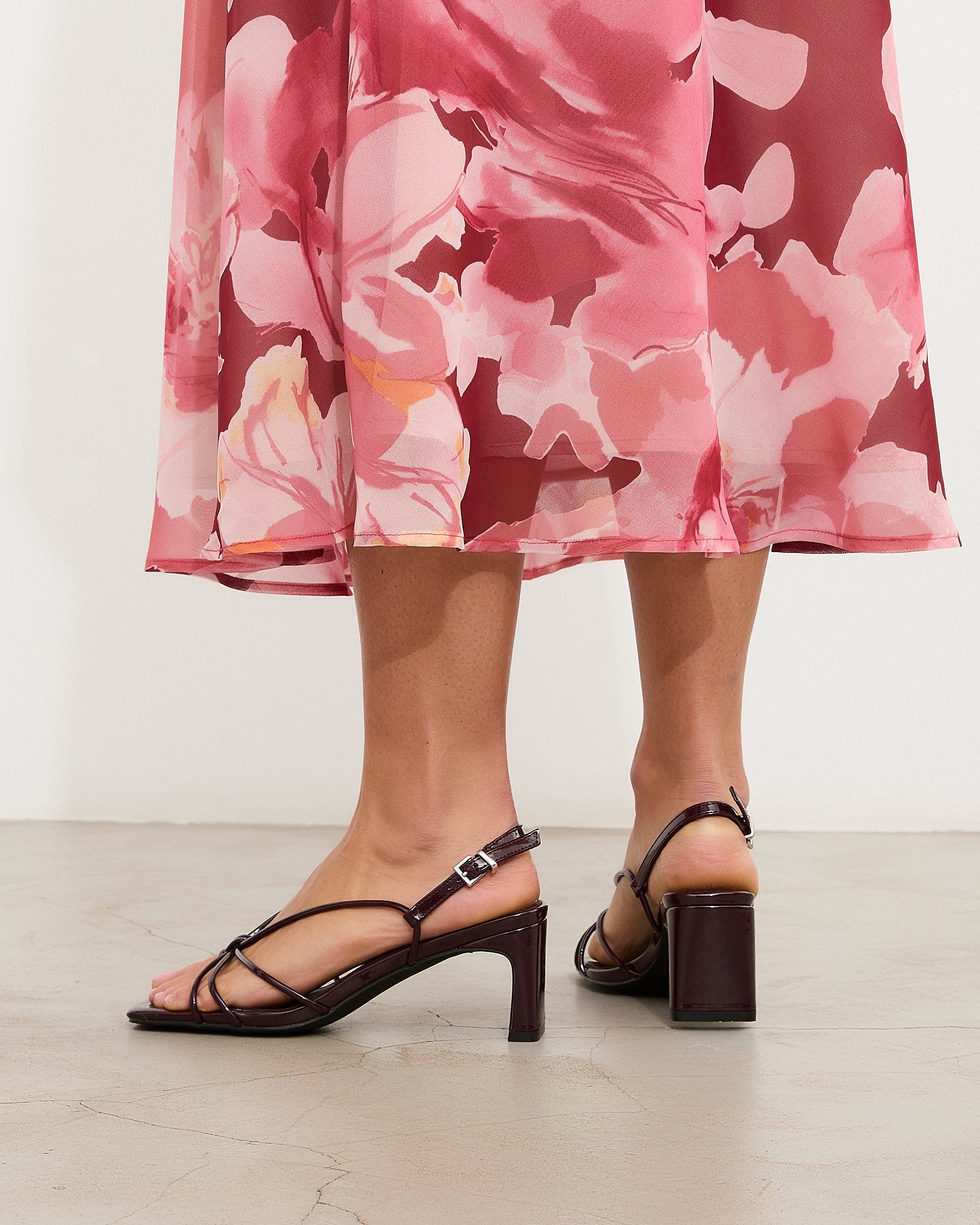Sandalia de tacón con puntera cuadrada en color burdeos. Multiples tiras en la parte delantera unidades con sujección en dedo. Cinta tarsera para sujección en talón con hebilla. Tacón geométrico bajo.