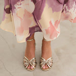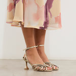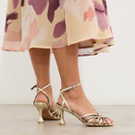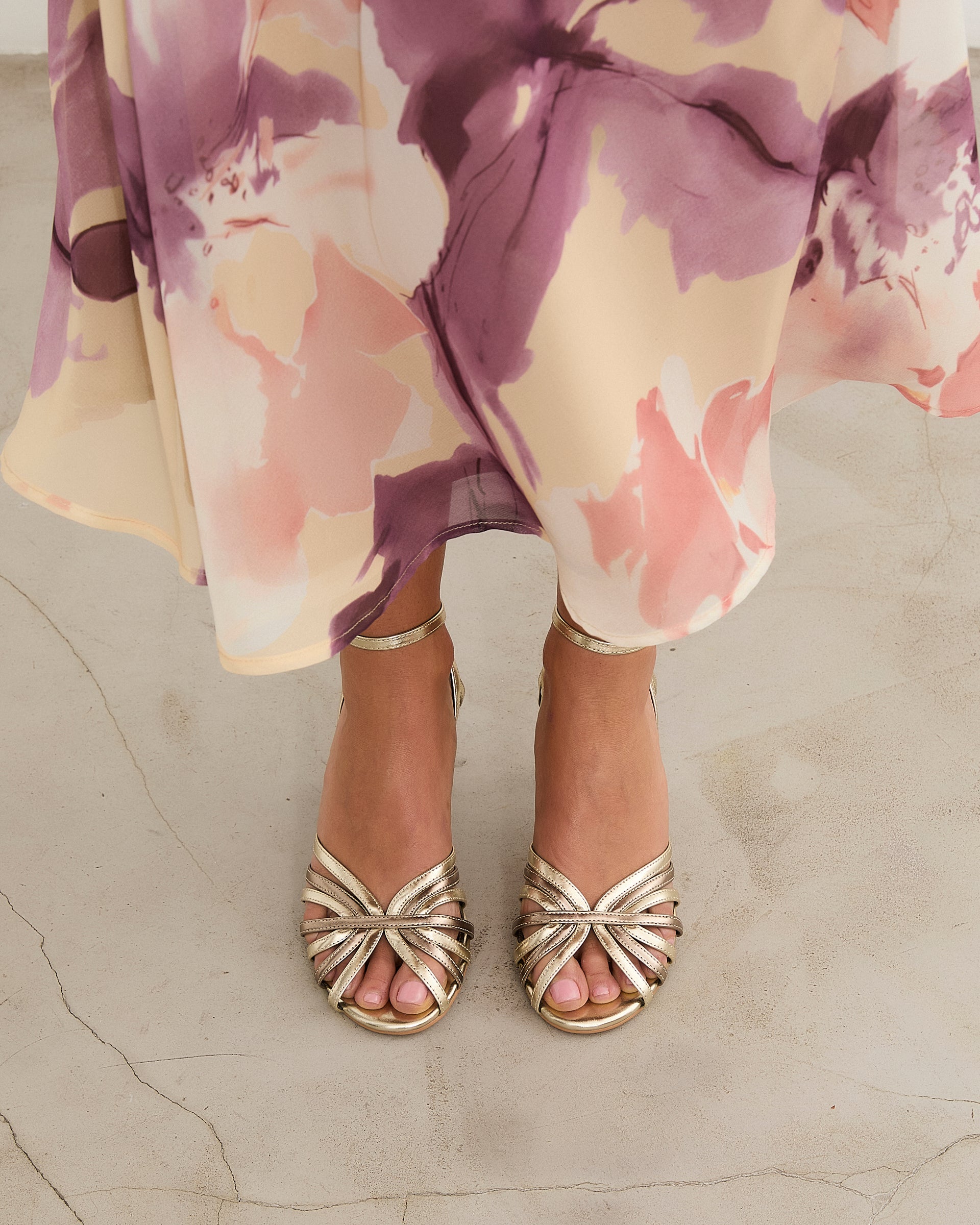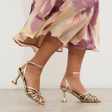 Sandalia de tacón con punta redondeada en color dorado. Parte delantera formada por multiples tiras unidadas por otra tira central. Tira trasera para cierre en tobillo con hebilla. Tacón de aguja fino con base ancha.